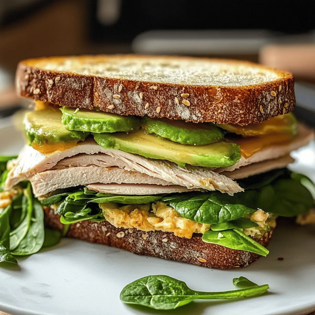 Schichte frische Spinatblätter auf die Avocado und füge nach Belieben weitere Zutaten wie Tomatenscheiben oder Gurkenscheiben hinzu. Die frischen und knackigen Elemente sorgen für eine köstliche Abwechslung in deinem Honig-Senf-Puten-Avocado-Sandwich und verleihen ihm mehr Nährstoffe.