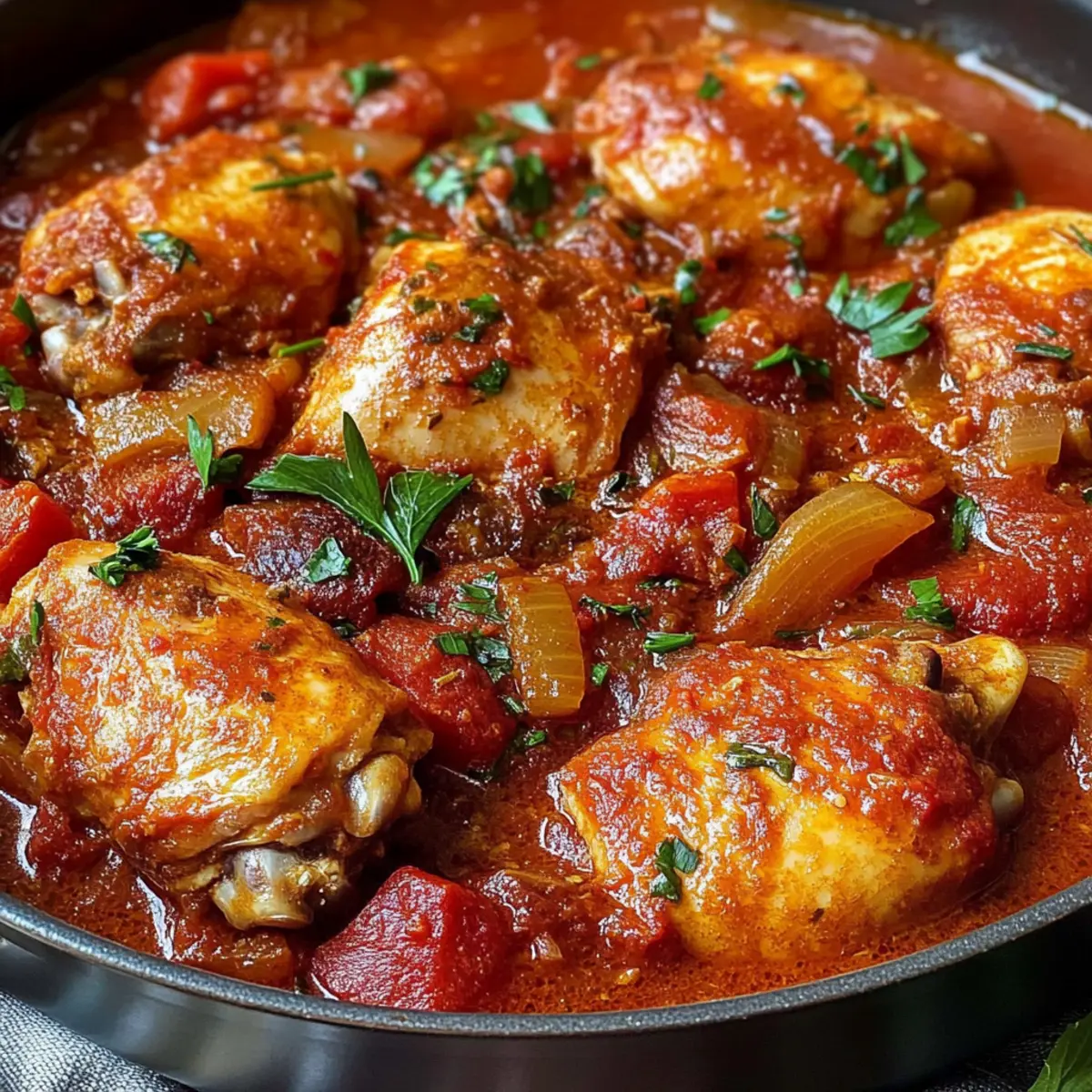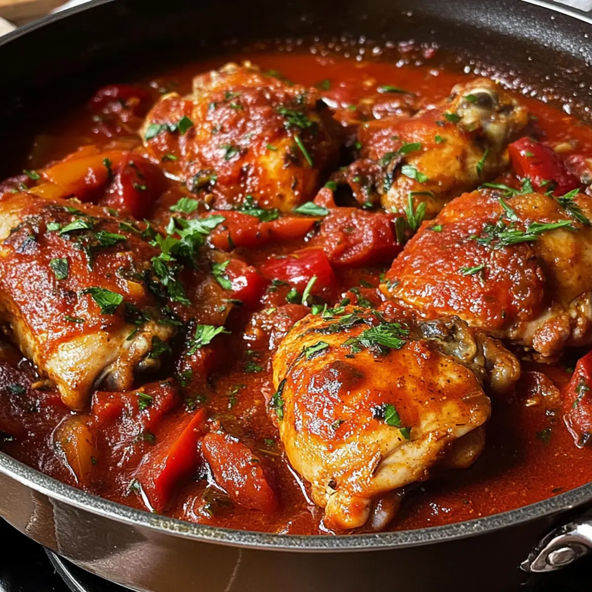Als ich letztens in meiner Küche stand, durchströmte der verführerische Duft von frisch gebratenem Hähnchen und würzigen Kräutern den Raum. Es war der perfekte Moment, um meine Familie mit einem klassischen Hühnchen Cacciatore zu verwöhnen – einem italienischen Eintopf, der nicht nur warm ums Herz ist, sondern auch richtig schnell zubereitet werden kann. In diesem Rezept vereinen sich saftige Hähnchenteile, aromatische Tomatensauce, und eine Prise Rotwein zu einem echten Comfort Food, das selbst den müdesten Wochentag in ein festliches Ereignis verwandelt. Egal, ob du ein leidenschaftlicher Koch bist oder einfach nur eine köstliche Mahlzeit suchst, dieses Gericht bietet dir eine gesunde und schmackhafte Alternative zu Fertiggerichten. Bereit für ein Geschmackserlebnis, das nostalgische Erinnerungen weckt? Lass uns zusammen die Küche betreten! Warum ist Hühnchen Cacciatore einzigartig? Herzhaft und köstlich: Dieses Rezept vereint klassische italienische Aromen in einer herzhaften Sauce, die jeden Bissen unvergesslich macht. Einfachheit in der Zubereitung: Die Schritte sind unkompliziert und erfordern keine speziellen Kochkünste – perfekt für jeden, der schnell ein schmackhaftes Gericht auf den Tisch bringen möchte. Vielseitige Variationen: Du kannst verschiedene Gemüsesorten oder sogar die Art des Hähnchens variieren, um das Rezept nach deinem Geschmack anzupassen. Treue zu Traditionen: Dieses Hühnchen Cacciatore bringt ein Stück Italien nach Hause und sorgt für ein echtes Familienessen. Gesund und nahrhaft: Mit frischen Zutaten ist es nicht nur lecker, sondern auch eine gesunde Alternative zu Fast Food. Probiere dazu auch unser Honig Feta Hühnchen für eine weitere köstliche Option! Hühnchen Cacciatore Zutaten • Für eine schmackhafte Basis: Hähnchenschenkel – Sie sind entscheidend für Saftigkeit und Geschmack; die Knochen sorgen für einen reichhaltigen Eintopf. Hähnchenkeulen – Sorgen für Tiefe und Reichtum im Gericht; können durch zusätzliche Schenkel ersetzt werden. • Für die Würze: Salz & Pfeffer – Verstärken den Geschmack des Hähnchens; verwende koscheres Salz für ein ausgewogenes Gewürz. Olivenöl – Ideal zum Anbraten des Hähnchens und Sautieren von Gemüse; alternativ kann auch Gemüseöl verwendet werden. • Für das Aroma: Zwiebel – Bildet die Geschmacksbasis des Eintopfs; gelbe oder braune Zwiebeln sind empfehlenswert. Frischer Rosmarin – Fügt aromatischen Geschmack hinzu; getrockneter kann (1 TL) verwendet werden. Lorbeerblätter – Sorgen für zusätzlichen Geschmack; frische sind vorzuziehen, getrocknete sind jedoch ebenfalls geeignet. Knoblauch – Unverzichtbar für das Würzen; verstärkt das gesamte Profil des Gerichts. Anchovis (optional) – Beigefügt für einen umami-reichen Geschmack ohne fischige Note; kann durch Fischsauce ersetzt oder weggelassen werden. • Für die herzhaften Geschmäcker: Champignons – Bringen Erdigkeit und Textur; es können verschiedene Sorten verwendet werden. Rote Paprika – Sorgt für eine angenehme Süße; kann durch Fenchel ersetzt werden. Tomatenmark – Verdickt die Sauce und bringt konzentrierten Tomatengeschmack. • Für die Flüssigkeit und den Körper: Trockener Rotwein (Pinot Noir) – Verleiht Säure und Tiefe; kann durch zusätzliche Hühnerbrühe für eine alkoholfreie Variante ersetzt werden. Hühnervorrat/-brühe – Bildet die Basis der Sauce; niedrig in Natrium für ein weniger salziges Ergebnis. Gehackte Tomaten aus der Dose – Fügt Körper und Würze zur Sauce hinzu. • Für den letzten Schliff: Kalamata-Oliven – Bringen einen salzigen Geschmack; ganze Oliven werden für die Textur bevorzugt. Getrockneter Oregano – Verleiht den klassischen italienischen Kräutergeschmack; frischer kann substituted werden, verändert jedoch das Profil. Erdäpfelbrei oder Polenta – Wird empfohlen, um eine cremige Basis für den reichhaltigen Eintopf zu schaffen. Frische Petersilie (optional) – Zum Garnieren, fügt eine frische Note und Farbe hinzu. Das Rezept für Hühnchen Cacciatore ist einfach zuzubereiten und ein wahrer Genuss! Schritt-für-Schritt-Anleitung für Hühnchen Cacciatore Step 1: Hähnchen würzen Bestreue die Hähnchenschenkel und -keulen großzügig mit Salz und Pfeffer. Stelle sicher, dass das Hähnchen gleichmäßig gewürzt ist, um den vollen Geschmack zu entfalten, und lasse es kurz ruhen, damit die Gewürze einziehen können. Step 2: Hähnchen anbraten Erhitze in einer großen Pfanne 2 Esslöffel Olivenöl bei mittlerer Hitze. Brate die Hähnchenschenkel zunächst mit der Hautseite nach unten für etwa 6 Minuten an, bis sie goldbraun sind. Wende sie dann und brate die Fleischseite für 1 Minute an. Füge die Hähnchenkeulen hinzu und brate sie insgesamt etwa 3 Minuten, bis sie leicht gebräunt sind. Step 3: Aromaten sautieren Gieße das überschüssige Fett aus der Pfanne ab und reduziere die Hitze auf mittel. Füge eine gewürfelte Zwiebel und frischen Rosmarin sowie Lorbeerblätter hinzu. Sauté die Mischung für etwa 3 Minuten, bis die Zwiebeln weich und durchscheinend sind und einen köstlichen Duft verströmen. Step 4: Knoblauch und Anchovis hinzufügen Schiebe die Zwiebeln zur Seite und füge einige fein gehackte Knoblauchzehen und die Anchovis in die Pfanne. Mische alles gut und zerdrücke die Anchovis mit einem Holzlöffel, bis der Knoblauch goldbraun ist, was etwa 1-2 Minuten dauert und die Aromen entfaltet. Step 5: Gemüse anbraten Gib die in Scheiben geschnittenen Champignons und die gewürfelte rote Paprika in die Pfanne. Brate das Gemüse für etwa 5 Minuten an, bis es weich und zart ist, während du regelmäßig umrührst, um eine gleichmäßige Garung zu gewährleisten. Step 6: Tomatenmark rösten Füge 2 Esslöffel Tomatenmark hinzu und rühre es gut unter. Lass es etwa 2 Minuten lang anbraten, bis es leicht angeröstet ist, um den Geschmack zu intensivieren und die Sauce reichhaltiger zu machen. Step 7: Sauce zubereiten Gie