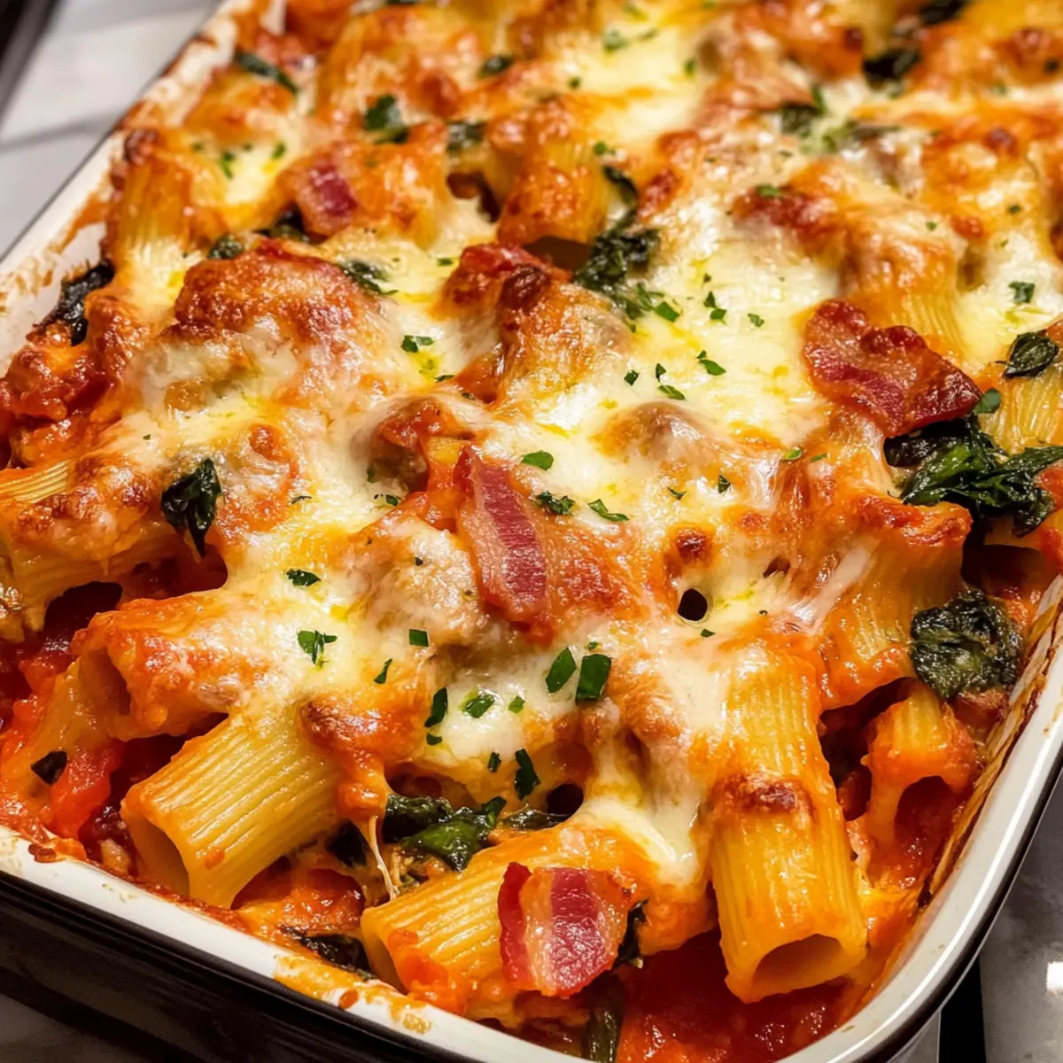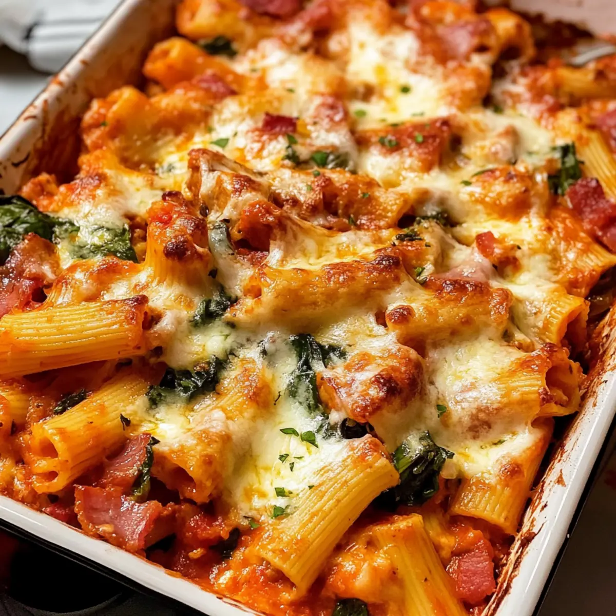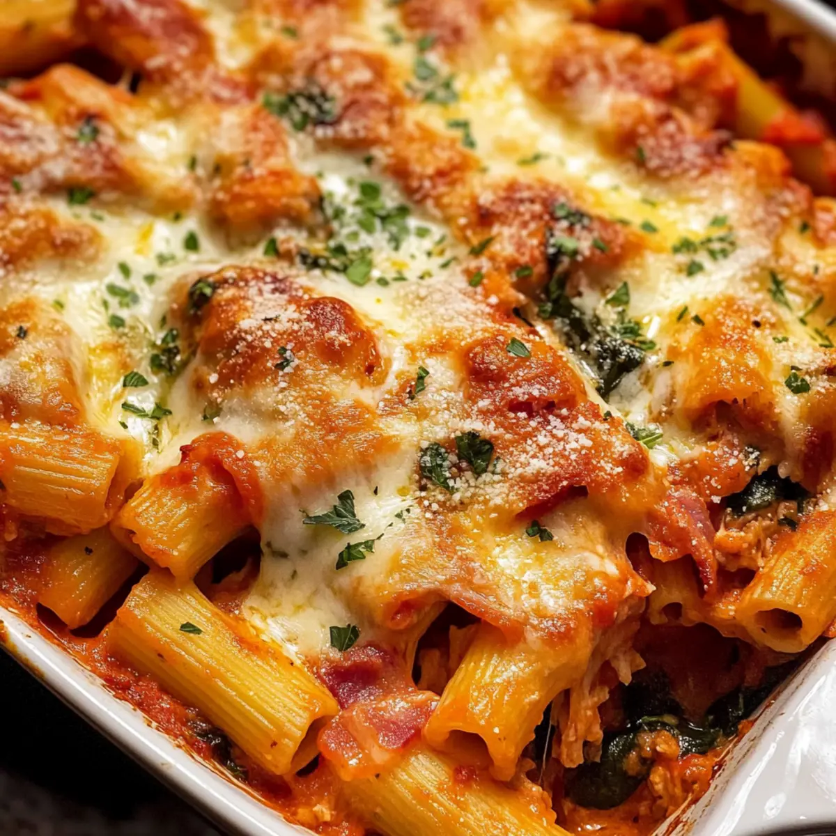 Während ich das dampfende Gericht aus dem Ofen ziehe, strömt der verlockende Duft von gebratenem Hähnchen und frischem Käse durch meine Küche. Mein Dufttraum wird mit dem Hühnchen Nudelauflauf zum Leben erweckt – einer köstlichen Kombination aus würziger Tomatensauce, saftigem Hähnchen und knusprigem Speck. Diese einfache und schmackhafte Mahlzeit ist nicht nur ein wahrer Gaumenschmaus, sondern auch ein perfekter Begleiter für hektische Wochentage. Du kannst den Auflauf bereits im Voraus zubereiten oder portionsweise einfrieren, was dir wertvolle Zeit spart. Wenn du ein Rezept suchst, das nicht nur sättigend ist, sondern auch Freude beim Teilen mit der Familie bringt, dann lass uns gemeinsam diesen köstlichen Hühnchen Nudelauflauf kreieren. Bist du bereit, die Geheimnisse eines herzhaften und einladenden Abendessens zu entdecken? Warum ist dieser Hühnchen Nudelauflauf besonders? Vielseitigkeit: Der Hühnchen Nudelauflauf lässt sich mühelos anpassen, je nach dem, was du im Kühlschrank hast. Einfache Zubereitung: Mit minimalem Aufwand zauberst du ein wohlschmeckendes Gericht, das jeden begeistert. Herzhafter Geschmack: Die Kombination aus Tomatensauce, Hähnchen und Speck sorgt für ein Aroma, das Erinnerungen weckt. Perfekt für Meal Prep: Ob du für die Woche vorkochen oder Reste einfrieren möchtest, dieser Auflauf macht es einfach! Familienfreundlich: Ein Gericht, das sich hervorragend zum Teilen eignet und für alle Altersgruppen geeignet ist. Lass uns gemeinsam in die Welt des geschmackvollen Kochens eintauchen! Hühnchen Nudelauflauf Zutaten • Entdecke die wichtigsten Zutaten für einen unvergleichlichen Hühnchen Nudelauflauf! Für die Sauce Hähnchenkeulen – Hauptproteinquelle; bleibt beim Kochen schön saftig und zart. Tomatenpassata – Sorgt für eine glatte Sauce, die reich an Tomatengeschmack ist; du kannst auch Tomatenmark verwenden. Chardonnay (oder Hühnerbrühe) – Verleiht der Sauce Tiefe und eine angenehme Säure. Für die Nudelbasis Rigatoni – Bietet eine robuste Grundlage für den Auflauf; andere kurze Pasta wie Penne sind ebenfalls geeignet. Speck – Sorgt für knusprige Textur und verführerischen Geschmack; kannst auch Schinken oder Pancetta verwenden. Für die Aromen Zwiebel und Knoblauch – Unverzichtbare Aromaten für zusätzlichen Geschmack; frisch gehackter Knoblauch schmeckt intensiver. Gewürzmischung – Italienische Kräuter sorgen für authentisches Aroma; fertige Mischungen sind praktisch. Chiliflocken – Fügen eine subtile Wärme hinzu, die das Gericht aufpeppt. Für die Füllung Babyspinat – Bringt versteckte Gemüse hinein; kann auch durch Grünkohl ersetzt werden. Mozzarella – Schmilzt schön und sorgt für eine leckere, ziehende Konsistenz; ergänzt mit reichhaltigem Parmesan. Parmesankäse – Verleiht dem Auflauf eine zusätzliche Geschmacksnote. Diese Zutaten machen deinen Hühnchen Nudelauflauf zu einem unvergesslichen Erlebnis! Schritt-für-Schritt-Anleitung für Hühnchen Nudelauflauf Step 1: Ofen vorheizen Heize deinen Ofen auf 180 °C vor. Dieser Schritt ist wichtig, um eine gleichmäßige Garung des Hühnchen Nudelauflaufs zu gewährleisten. Stelle sicher, dass du alle Zutaten bereit hast, bevor du mit dem Kochen beginnst, um einen reibungslosen Ablauf zu garantieren. Step 2: Pasta kochen Koche die Rigatoni gemäß den Anweisungen auf der Verpackung in gesalzenem Wasser. Achte darauf, die Pasta al dente zu garen, da sie im Ofen weitergaren wird. Nach dem Kochen, lasse die Pasta abtropfen und stelle sie beiseite, während du die Sauce vorbereitest. Step 3: Speck anbraten Erhitze eine große, antihaftbeschichtete Pfanne bei mittlerer bis hoher Hitze und brate den Speck an, bis er knusprig ist. Dies dauert etwa 5–7 Minuten. Lass den Speck auf einem Küchenpapier abtropfen, wobei du das Fett in der Pfanne belässt, um später das Hähnchen darin anzubraten. Step 4: Hähnchen anbraten In der gleichen Pfanne das gewürzte Hähnchen hinzufügen und bei mittlerer Hitze 5–6 Minuten anbraten, bis es goldbraun aussieht. Es ist wichtig, dass das Hähnchen in der Mitte noch nicht durchgegart ist, da es später im Hühnchen Nudelauflauf weitergaren wird. Nehme das Hähnchen aus der Pfanne und lege es beiseite. Step 5: Zwiebel und Knoblauch anbraten Füge die gehackten Zwiebeln und den Knoblauch in das verbleibende Fett in der Pfanne hinzu und brate sie 2–3 Minuten lang an, bis sie weich und duftend sind. Ergänze die Mischung mit Chiliflocken und der italienischen Gewürzmischung, um das Aroma zu intensivieren. Step 6: Mit Chardonnay ablöschen Gieße den Chardonnay oder die Hühnerbrühe in die Pfanne, um die Aromen zu deglazieren. Lasse die Mischung 3–5 Minuten köcheln, bis sie leicht reduziert ist. Dies verleiht deiner Tomatensauce eine wunderbare Tiefe und sorgt dafür, dass sie reichhaltig und geschmackvoll bleibt. Step 7: Tomaten hinzufügen Gib das Tomatenmark in die Pfanne, gefolgt von der Tomatenpassata. Rühre gut um und lasse die Mischung zusammen mit dem reservierten Hähnchen, Salz und Pfeffer 5 Minuten lang köcheln. Achte darauf, dass alles gut vermischt ist und die Sauce dick und aromatisch wird. Step 8: Spinat und Nudeln einarbeiten Füge den Babyspinat und die abgetropften Rigatoni in die Pfanne hinzu. Mische alles zusammen, bis der Spinat zusammengefallen und die Pasta gleichmäßig mit der Sauce bedeckt ist. Dies gibt deinem Hühnchen Nudelauflauf extra Nährstoffe und Farbe. Step 9: In die Auflaufform geben Übertrage die Mischung vorsichtig in eine große Auflaufform. Achte darauf, dass die Pasta und der Spinat gleichmäßig verteilt sind. Toppe alles großzügig mit dem geriebenen Mozzarella und Parmesan, um eine köstlich schmelzende Kruste zu garantieren. Step 10: Backen Schiebe die Auflaufform in den vorgeheizten Ofen und backe den Hühnchen Nudelauflauf 25 Minuten lang, bis der Käse goldbraun und sprudelnd ist. Dies ist der Moment, auf den du hinfieberst – das köstliche Aroma wird 
