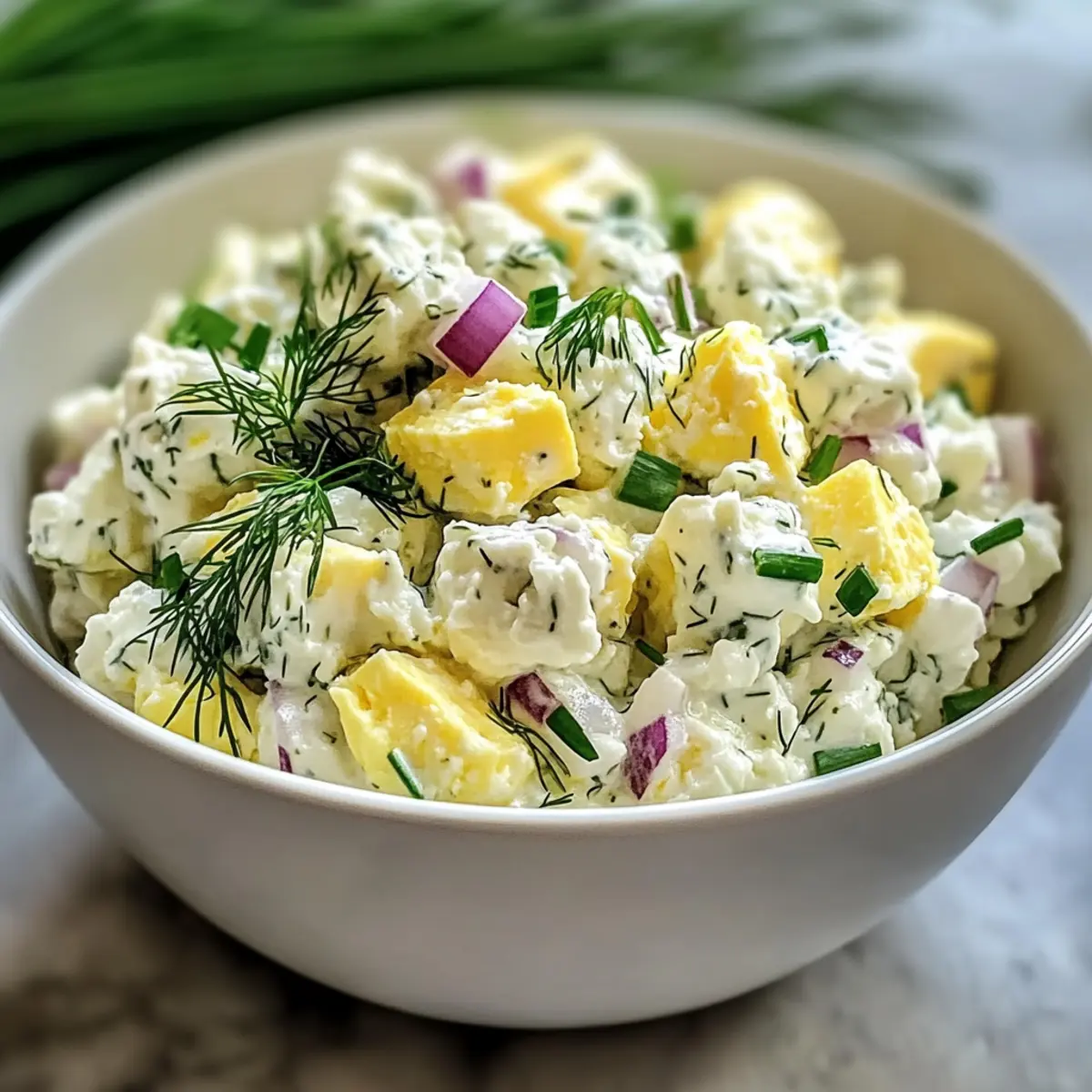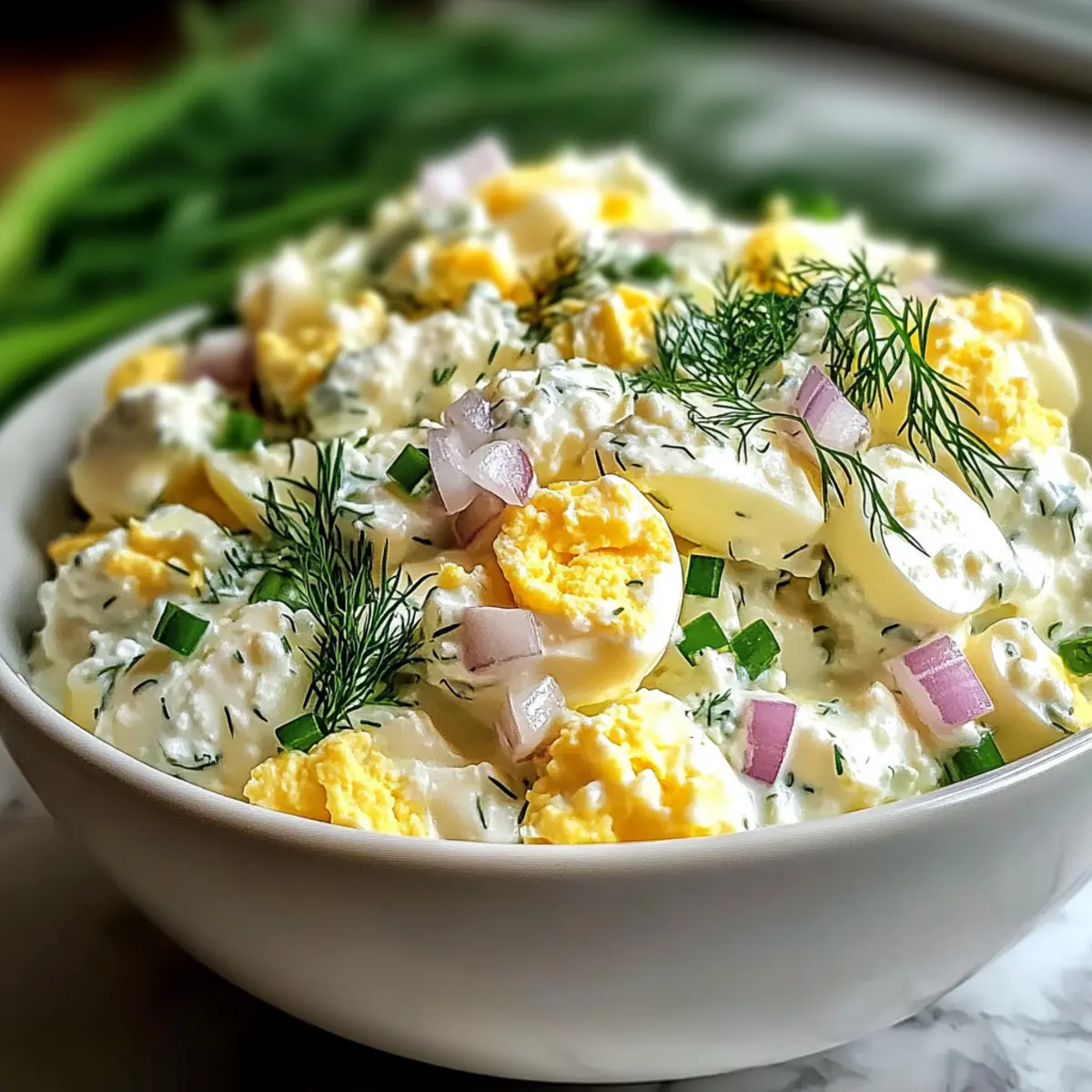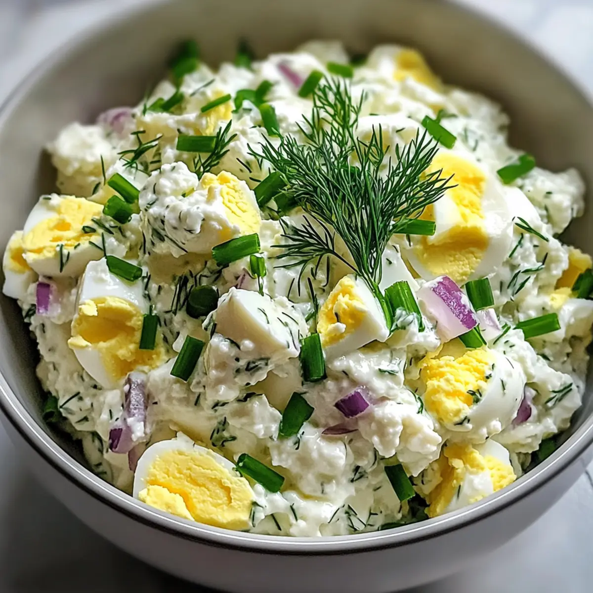 Der frischköstliche Duft von Kräutern weht durch meine Küche, während ich an meinem Hüttenkäse Eiersalat ohne Mayo arbeite. Dieses Rezept bringt eine gesunde, proteinreiche Note in das klassische Gericht und überzeugt mit einer leichten Frische, die Lust auf mehr macht. Die Kombination aus cremigem Hüttenkäse, saftigen Eiern und spritzigem Zitronensaft sorgt nicht nur für ein fantastisches Geschmackserlebnis, sondern ist auch ideal für schnelle Mittagessen oder Meal Preps. Perfekt für alle, die dem Fast Food entfliehen und sich mit einem gesunden, anpassungsfähigen Gericht verwöhnen möchten. Wer hätte gedacht, dass eine mayo-freie Variante so köstlich sein kann? Seid ihr bereit, diesen salzigen Genuss auszuprobieren und nach eurem eigenen Geschmack anzupassen? Warum wird dieser Hüttenkäse Eiersalat geliebt? Vielfalt: Dieser Hüttenkäse Eiersalat ohne Mayo ist nicht nur äußerst anpassbar, sondern ermöglicht es dir, kreativ zu sein! Füge frisches Gemüse hinzu oder verwende griechischen Joghurt für eine andere Geschmacksnote. Leicht und gesund: Mit etwa 200 Kalorien pro Portion ist dieser Salat perfekt für eine leichte Mahlzeit, die dir trotzdem genug Energie gibt. Einfach zu machen: Die Zubereitung ist flink und unkompliziert, ideal für geschäftige Tage oder Meal Prepping. Frische Aromen: Die Kombination aus saftigen Eiern und aromatischen Kräutern sorgt für einen köstlichen Genuss, der den Gaumen erfreut. Familienfreundlich: Ob zum Mittagessen oder als Snack, dieser Salat kommt bei Jung und Alt immer gut an! Probiere auch mal eine leckere Ribollita Italienische Bohnensuppe als passende Beilage aus. Hüttenkäse Eiersalat Zutaten • Entdecke die perfekten Zutaten für dein Gericht! Für die Basis Eier – Hartgekochte Eier sorgen für die nötige Textur und sind eine großartige Proteinquelle. Hüttenkäse – Dient als cremige Verbindung; verwende kleine Körner für eine glattere Konsistenz. Alternative: Griechischer Joghurt für eine fruchtige Note. Dijon-Senf – Verleiht eine würzige Schärfe; eine kräftige Marke intensiviert das Aroma. Zitronensaft – Frisch gepresster Saft hellt den Salat auf. Verwende mehr für zusätzliche Frische. Knoblauchpulver – Für einen subtilen Geschmack; frischer Knoblauch bietet mehr Intensität. Salz & schwarzer Pfeffer – Unverzichtbar für die Würze; nach Belieben anpassen. Cayennepfeffer – Optional für eine scharfe Note; nach persönlichem Geschmack hinzufügen. Für die Kräuter und Gemüse Frischer Dill & Schnittlauch – Schenken dem Salat frische Aromen; fein gehackt für gleichmäßige Verteilung. Rote Zwiebel – Bietet Knackigkeit und Süße; fein gewürfelt für eine gleichmäßige Textur. Dieser Hüttenkäse Eiersalat ohne Mayo zieht nicht nur durch seine gesunde, proteinreiche Zusammensetzung die Blicke auf sich, sondern begeistert auch mit seiner vielseitigen Anpassbarkeit. Jetzt liegt es an dir, kreativ zu werden und deinen eigenen Twist hinzuzufügen! Schritt-für-Schritt-Anleitung für Hüttenkäse Eiersalat ohne Mayo Step 1: Eier kochen Lege die Eier in einen Topf und bedecke sie mit kaltem Wasser. Bringe das Wasser zum Kochen und nimm den Topf dann vom Herd. Decke ihn ab und lasse die Eier 11-12 Minuten ruhen. Danach die Eier in ein Eisbad legen und 5 Minuten abkühlen lassen, damit sie sich leichter schälen lassen. Step 2: Hüttenkäse pürieren Gib den Hüttenkäse in eine Küchenmaschine und püriere ihn für etwa 30-45 Sekunden, bis er eine glatte Konsistenz erreicht. Das Pürieren sorgt dafür, dass der Hüttenkäse gut als cremiger Binder für den Eiersalat dient. Halte die Küchenmaschine bereit für die nächsten Schritte. Step 3: Basis mischen In einer großen Schüssel verrühre das pürierte Hüttenkäse mit Dijon-Senf, Zitronensaft, Knoblauchpulver, Salz, schwarzem Pfeffer und optional Cayennepfeffer. Rühre alles gut mit einem Schneebesen um, bis eine gleichmäßige Mischung entsteht. Diese Basis sorgt für den herzhaften Geschmack des Hüttenkäse Eiersalats ohne Mayo. Step 4: Gemüse vorbereiten Hacke den frischen Dill, Schnittlauch und die rote Zwiebel fein und lege sie beiseite. Diese Zutaten fügen dem Salat frische Aromen und zusätzlichen Crunch hinzu. Achte darauf, sie gleichmäßig klein zu schneiden, sodass sie gut in der Mischung verteilt werden können. Step 5: Eier würfeln Schäle die gekühlten Eier und schneide sie in etwa 1,5 cm große Stücke. Diese Stücke geben dem Hüttenkäse Eiersalat ohne Mayo die nötige Textur. Sei vorsichtig, damit die Eier nicht zerfallen, wenn du sie schneidest. Step 6: Zutaten kombinieren Füge die gewürfelten Eier und die vorbereiteten Kräuter und die Zwiebel zur Hüttenkäse-Mischung hinzu. Hebe alles vorsichtig mit einem Spatel unter, um die Zutaten gut zu vermengen, ohne die Eier zu zerdrücken. Dies hilft, die Frische und den Geschmack des Salats zu bewahren. Step 7: Würzen anpassen Schmecke den Hüttenkäse Eiersalat ohne Mayo ab und füge bei Bedarf mehr Salz, Pfeffer oder Cayennepfeffer hinzu. Dies ist der perfekte Moment, um die Aromen nach deinem Geschmack zu justieren und sicherzustellen, dass der Salat delikat und schmackhaft ist. Step 8: Servieren oder aufbewahren Serviere den Hüttenkäse Eiersalat sofort oder lasse ihn für mindestens 30 Minuten im Kühlschrank ziehen, um die Aromen zu intensivieren. Du kannst ihn in einem luftdichten Behälter bis zu 3 Tage aufbewahren. Genieße ihn auf Vollkornbrot, in Salatblättern oder als Dip mit frischem Gemüse. Expertentipps für Hüttenkäse Eiersalat Eier richtig kochen: Achte darauf, die Eier nach dem Kochen gut abzukühlen. Warme Eier können zusätzliches Wasser freisetzen und den Salat verwässern. Textur bewahren: Mische die gewürfelten Eier vorsichtig unter die Hüttenkäse-Mischung. Vermeide es, zu übermixen, damit die Stücke intakt bleiben und der Salat nicht matschig wird. Würze anpassen: Beginne mit weniger Salz und Pfeffer und taste dich schrittweise an de