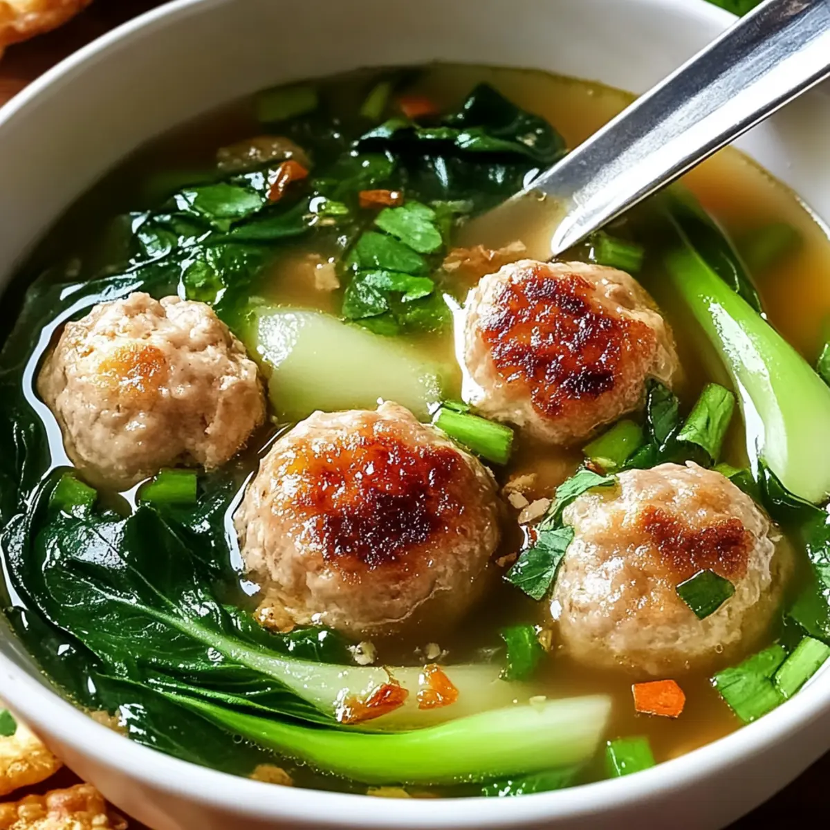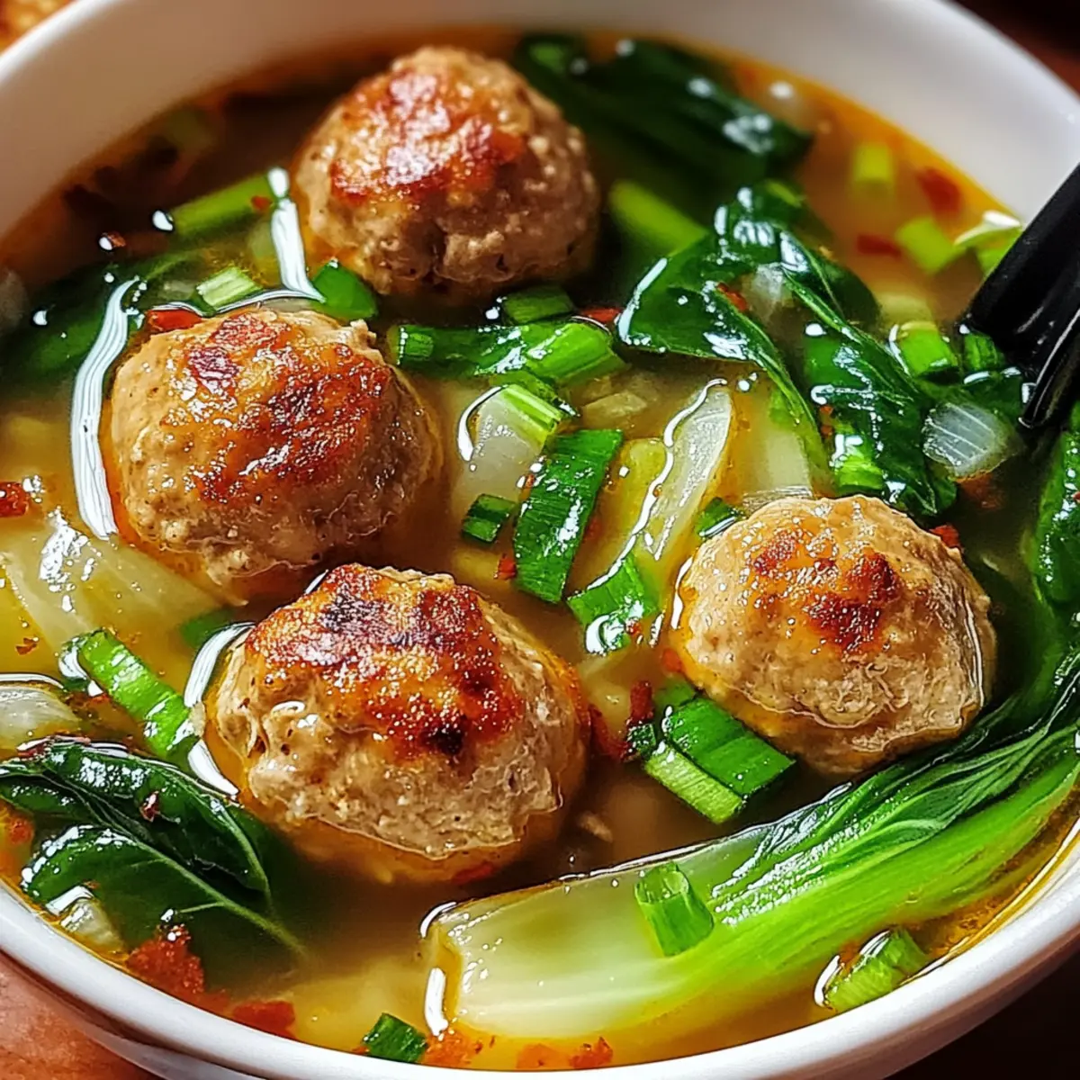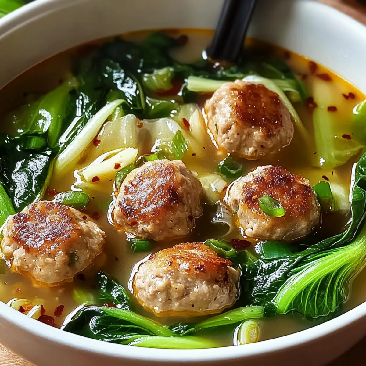 Während ich in der Küche stehe und den feinen Duft von frischem Ingwer einatme, wird mir sofort klar, dass ich die perfekte Lösung für unsere nächste Mahlzeit gefunden habe: die Ingwer-Hühnchen-Fleischbällchensuppe mit Baby-Bok-Choy. Diese asiatisch inspirierte, leichte Suppe verspricht nicht nur eine schnelle Zubereitung in nur 40 Minuten, sondern auch ein gesundes und geschmackvolles Abendessen, das die ganze Familie begeistern wird. Die zarten, im Ofen gebackenen Fleischbällchen schwimmen in einer aromatischen Brühe, die mit frischem Knoblauch und ingwer verfeinert wird, während knackiger Bok Choy und knusprige Wontons das Gericht perfekt abrunden. Bist du bereit, in die Welt der beruhigenden Aromen einzutauchen und dein eigenes kulinarisches Meisterwerk zu kreieren? Warum ist diese Suppe ein Muss? Einfachheit: Die Zubereitung dieser Ingwer-Hühnchen-Fleischbällchensuppe ist kinderleicht und gelingt auch Anfängern! In nur 40 Minuten kannst du ein köstliches Gericht zaubern. Wohltuender Geschmack: Frischer Ingwer und Knoblauch verleihen der Brühe ein unverwechselbares Aroma, das den Gaumen verwöhnt und für Wohlbefinden sorgt. Vielseitigkeit: Du kannst die Fleischbällchen mit verschiedenen Fleischsorten zubereiten, wie zum Beispiel Ground Turkey, oder sogar eine vegane Variante ausprobieren! Gesund und nahrhaft: Diese Suppe ist nicht nur leicht und nährstoffreich, sondern auch fettarm, sodass du sie ohne schlechtes Gewissen genießen kannst. Familienfreundlich: Egal ob groß oder klein, die Kombination aus zarten Fleischbällchen und knackigem Bok Choy wird garantiert alle begeistern. Wenn du auf der Suche nach weiteren köstlichen Rezepten bist, probiere auch unsere Kartoffel Zwiebel Suppe oder die Himmlische Thai Suppe! Ingwer-Hühnchen-Fleischbällchensuppe Zutaten • Entdecke die köstlichen Zutaten für die Ingwer-Hühnchen-Fleischbällchensuppe. Für die Fleischbällchen Gemahlenes Hühnchen – Bietet die Hauptproteinquelle; du kannst es auch durch Putenhack ersetzen für eine leichtere Variante. Frühlingszwiebeln – Fügen Frische und milden Zwiebelgeschmack hinzu; Chives sind eine gute Alternative, wenn du es bevorzugst. Frisch geriebener Ingwer (für die Fleischbällchen) – Verleiht den Fleischbällchen Wärme und Gewürz; frische Zutat ist ein Muss für den besten Geschmack. Knoblauch (gehackt) – Bringt Tiefe und herzhaften Geschmack; ersetze es im Notfall durch Knoblauchpulver. Für die Brühe Hühnerbrühe – Basis für die Suppe; hausgemachte Brühe oder natriumarme Varianten sind empfehlenswert. Frisch geriebener Ingwer (für die Brühe) – Verstärkt das Aroma der Brühe; wieder gilt, frische Zutat ist entscheidend. Sojasoße – Liefert Salzigkeit und Umami; verwende Tamari für glutenfreie Optionen. Sesamöl – Fügt einen nussigen Geschmack hinzu; kann durch Raps- oder Olivenöl im Notfall ersetzt werden. Zwiebel (klein, dünn geschnitten) – Bereichert die Brühe mit Süße und Komplexität; Schalotten können als Ersatz dienen. Für das Gemüse Baby Bok Choy – Fügt Farbe und knusprige Textur hinzu; bei Abwesenheit kannst du Spinat verwenden. Reisnudeln oder Eiernudeln (optional) – Sorgt für Herzhaftigkeit; Zucchini-Nudeln sind eine kohlenhydratarme Alternative. Für die Garnitur Wonton-Wrapper (in Streifen geschnitten) – Sorgt für knusprige Toppings; verwende Tortillastreifen oder lasse sie weg für eine leichtere Version. Öl zum Frittieren der Wonton-Streifen – Entscheidend für die Knusprigkeit; achte darauf, die Temperatur des Öls zu halten. Salz zur Würzung der Wonton-Streifen – Verstärkt den Geschmack nach dem Frittieren. Sonstiges Breadcrumbs – Bindet die Fleischbällchen für eine feste Textur; Panko eignet sich für leichtere Fleischbällchen. Großes Ei – Hilft, die Mischung der Fleischbällchen zu binden; für eine vegane Option kann Leinsamenmehl mit Wasser verwendet werden. Pflanzenöl – Zum Anbraten und Frittieren; jedes neutrale Öl funktioniert gut. Schwarzer Pfeffer – Für das Würzen; passe ihn nach deinem persönlichen Geschmack an. In dieser Ingwer-Hühnchen-Fleischbällchensuppe vereinen sich köstliche Zutaten, um ein Geschmackserlebnis zu schaffen, das nicht nur nährt, sondern auch begeistert! Schritt-für-Schritt-Anleitung für Ingwer-Hühnchen-Fleischbällchensuppe Step 1: Ofen vorheizen Heize deinen Ofen auf 200°C (400°F) vor und lege ein Backblech mit Backpapier aus. Dies sorgt dafür, dass die Ingwer-Hühnchen-Fleischbällchen gleichmäßig gebacken werden und nicht kleben bleiben. Während der Ofen aufheizt, kannst du bereits mit der Zubereitung der Fleischbällchen beginnen. Step 2: Fleischbällchen zubereiten Vermische in einer großen Schüssel das gemahlene Hühnchen, die gehackten Frühlingszwiebeln, den frisch geriebenen Ingwer für die Fleischbällchen, die Hälfte des gehackten Knoblauchs, Sojasoße, Sesamöl, Breadcrumbs, das Ei sowie Salz und Pfeffer. Mische alles gut, bis die Zutaten gerade so verbunden sind, und forme sie zu 2,5 cm großen Fleischbällchen. Step 3: Fleischbällchen backen Platziere die geformten Fleischbällchen auf dem vorbereiteten Backblech. Backe sie 15–18 Minuten lang, bis sie goldbraun und durchgegart sind. Die Fleischbällchen sollten eine angenehme Bräunung aufweisen und eine Kerntemperatur von mindestens 75°C (165°F) erreichen. Step 4: Aromaten anbraten Erhitze in einem großen Topf bei mittlerer Hitze etwas Pflanzenöl. Füge die dünn geschnittene Zwiebel hinzu und brate sie 5 Minuten lang, bis sie weich und leicht golden ist. Dann füge den restlichen Knoblauch und den frisch geriebenen Ingwer für die Brühe hinzu und koche alles für 30 Sekunden, bis die Aromen freigesetzt werden. Step 5: Brühe zubereiten Gieße die Hühnerbrühe in den Topf zu den angebratenen Aromaten und füge die restliche Sojasoße sowie optional Reisessig hinzu. Lasse die Brühe 5 Minuten lang köcheln, damit sich die Aromen gut verbinden und aufeinandertreffen.