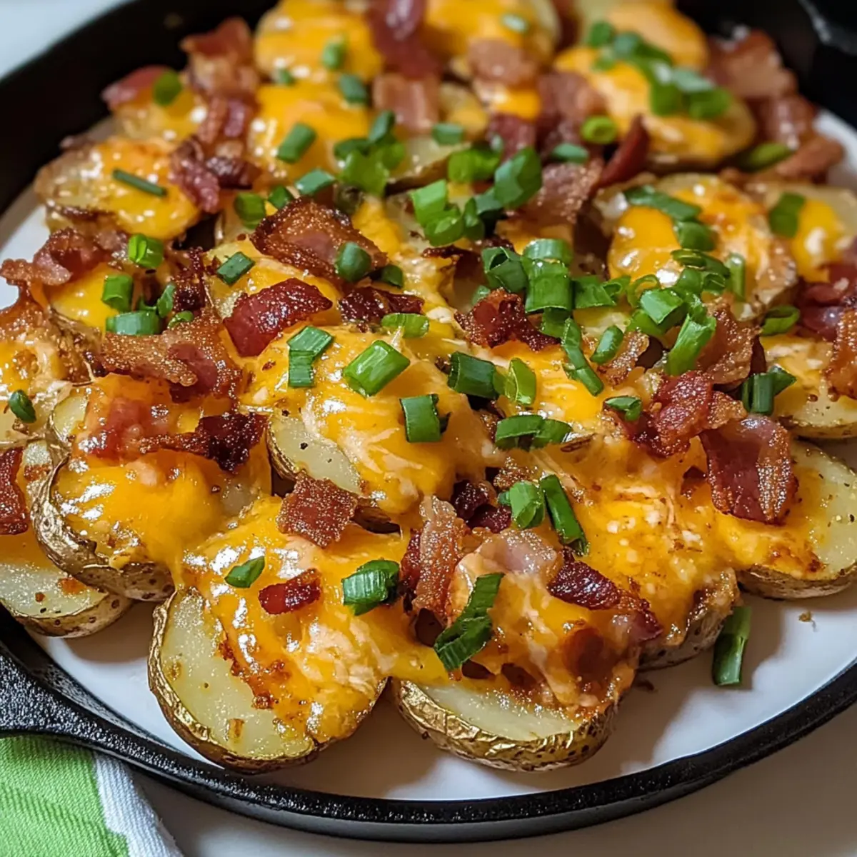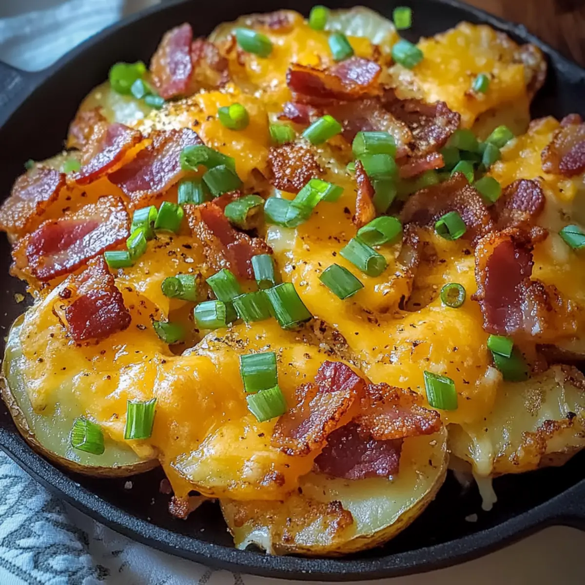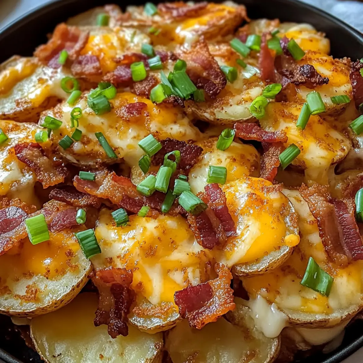 Es gibt Momente, in denen man einfach nach dem perfekten Snack verlangt, und die Irischen Kneipe Nacho Kartoffeln sind genau das! Diese knusprigen, gewürzten Kartoffelrunden sind nicht nur eine köstliche Möglichkeit, den Hunger zu stillen, sondern auch ein wahrer Hingucker bei jeder Party oder beim Spieltag. Mit ihren zart schmelzenden Cheddar-Jack-Käse, knusprigem Speck und frischen Frühlingszwiebeln sind diese Kartoffeln der Inbegriff von Comfort Food – und das Beste? Du kannst sie ganz nach deinem Geschmack anpassen! Egal, ob du es scharf mit Jalapeños magst oder die Frische von Guacamole hinzufügst, diese Rezeptur lässt sich leicht variieren. Bereit, dich in den Genuss dieser herzhaften Leckerei zu stürzen? Lass uns loslegen! Warum sind Nacho Kartoffeln so unwiderstehlich? Köstlicher Geschmack: Jede** Biss** ist ein Geschmackserlebnis mit einer perfekten Kombination aus schmelzendem Käse, crunchigem Speck und frischen Zwiebeln. Einfachheit: Die Zubereitung ist unkompliziert und erfordert nur wenige Handgriffe, ideal für Kochanfänger und Profis. Vielseitigkeit: Du kannst deine Nachos ganz einfach anpassen – von würzigen Jalapeños bis hin zu cremiger Guacamole, die Möglichkeiten sind endlos! Familienfreundlich: Diese Gericht spricht jeden an, ob zum Spieltag oder Familienabend – ein echter Publikumsmagnet! Schnell zubereitet: In weniger als 45 Minuten kannst du dieses Gericht servieren und deine Gäste begeistern. Irische Kneipe Nacho Kartoffeln Zutaten • Hier sind die Zutaten, die du benötigst, um die unwiderstehlichen irischen Kneipe Nacho Kartoffeln zuzubereiten: Für die Kartoffeln Russische Kartoffeln – Diese sorgen für die perfekte Basis mit knuspriger Textur. Wähle gleich große Kartoffeln für eine gleichmäßige Garzeit; Yukon Gold kann für eine cremigere Variante verwendet werden. Olivenöl – Verleiht den Kartoffeln Reichtum und hilft, die Knusprigkeit zu erreichen. Extra natives Olivenöl bietet den besten Geschmack. Zwiebelpulver – Sorgt für eine herzhaft-savory Tiefe. Kann durch Knoblauchpulver ersetzt werden für eine andere Geschmacksnote. Thymian – Fügt einen Hauch von Erdigkeit hinzu. Frisch oder getrocknet, beides kann verwendet werden; nach Geschmack anpassen. Cajun-Gewürz – Verleiht der Kartoffelkruste rauchige Schärfe. Für eine mildere Variante weniger verwenden oder durch gewöhnliches Gewürz ersetzen. Knoblauchpulver – Verbessert den Gesamtgeschmack. Frisch gehackter Knoblauch kann ebenfalls verwendet werden; die Menge anpassen. Für die Toppings Speck – Fügt die gewünschte Salzigkeit und Knusprigkeit hinzu. Für eine leichtere Option kann auch Truthahnspeck verwendet werden. Grüne Zwiebeln – Bringen Frische und Farbe ins Gericht. Chives sind eine tolle Garnierungsalternative. Cheddar-Jack-Käse – Schmilzt wunderbar und sorgt für eine cremige Oberseite. Wähle Marken wie Sargento für die beste Schmelze. Sahne – Verleiht eine cremige, leicht säuerliche Note als krönenden Abschluss. Griechischer Joghurt kann eine gesündere Alternative darstellen. Diese Zutaten bilden die Grundlage für deine leckeren irischen Kneipe Nacho Kartoffeln, die zwischendurch oder beim nächsten Spieltag herzhaft zufriedenstellen werden! Schritt-für-Schritt-Anleitung für Irische Kneipe Nacho Kartoffeln Step 1: Ofen vorheizen Heize deinen Ofen auf 200 °C (400 °F) vor und bereite ein Backblech vor, indem du es gleichmäßig mit Olivenöl bestreichst. Dies trägt dazu bei, dass die Irischen Kneipe Nacho Kartoffeln später schön knusprig werden. Achte darauf, dass das Öl gleichmäßig verteilt ist, um ein Ankleben der Kartoffeln zu verhindern. Step 2: Kartoffeln schneiden Schneide die russischen Kartoffeln in gleichmäßige Runden von etwa 0,6 cm (1/4 Zoll) Dicke. Indem du gleichmäßige Schnittstücke verwendest, sorgst du dafür, dass die Kartoffeln gleichmäßig garen. Lege die geschnittenen Kartoffeln in eine große Schüssel, damit sie bereit sind, gewürzt zu werden. Step 3: Gewürzmischung herstellen Vermische in einer separaten Schüssel das Olivenöl, Zwiebelpulver, Thymian, Cajun-Gewürz und Knoblauchpulver. Rühre alles gut um, bis die Gewürze gleichmäßig im Öl verteilt sind. Diese Mischung sorgt später dafür, dass deine Nacho Kartoffeln voller Geschmack sind und eine köstliche Kruste erhalten. Step 4: Kartoffeln würzen Gib die geschnittenen Kartoffeln in die Schüssel mit der Gewürzmischung und mische alles gründlich, sodass jede Kartoffelrunde gleichmäßig mit dem Öl und den Gewürzen bedeckt ist. Dies sorgt für einen intensiven Geschmack und eine schöne Farbe beim Backen. Step 5: Kartoffeln backen Verteile die gewürzten Kartoffeln gleichmäßig auf dem vorbereiteten Backblech in einer einzelnen Schicht. Backe sie etwa 20 Minuten lang im vorgeheizten Ofen. Nach dieser Zeit solltest du sie goldbraun und leicht knusprig sehen. Wende die Kartoffeln vorsichtig und backe sie weitere 15-20 Minuten, bis sie schön knusprig sind. Step 6: Speck zubereiten Während die Kartoffeln backen, brate den Speck in einer Pfanne bei mittlerer Hitze, bis er knusprig ist. Dies kann ca. 5-7 Minuten dauern. Lass den Speck kurz auf einem Blatt Küchenpapier abtropfen, bevor du ihn in kleine Stücke brichst. Der Speck wird später das köstliche Topping für die Irischen Kneipe Nacho Kartoffeln sein. Step 7: Grüne Zwiebeln vorbereiten Wasche die grünen Zwiebeln und schneide sie in zwei Teile. Die weißen und hellgrünen Teile werden später als Topping verwendet, während die dunklen, grünen Teile als Garnitur dienen. Diese frische Zutat verleiht dem Gericht nicht nur Geschmack, sondern macht es auch optisch ansprechend. Step 8: Kartoffeln schichten Nehme das Blech mit den gebackenen Kartoffeln aus dem Ofen und übertrage sie vorsichtig in eine ofenfeste Servierform. Beginne, die Kartoffeln mit den Speckstückchen, den weißen Teilen der grünen Zwiebeln und dem geriebenen Cheddar-Jack-Käse zu schichten. Achte darauf, di