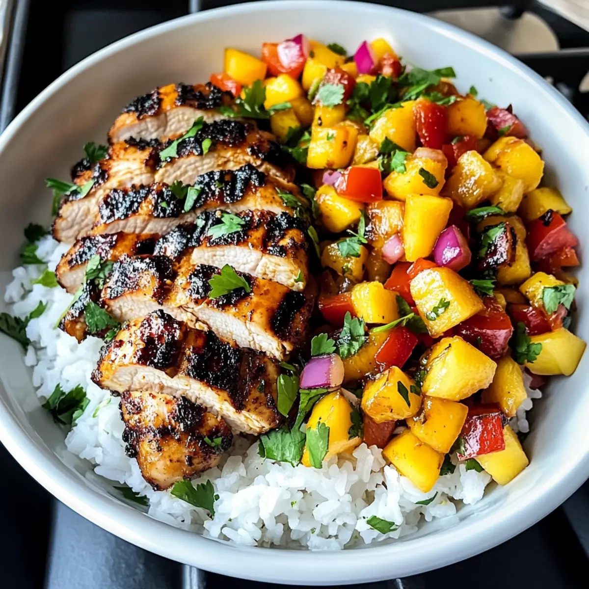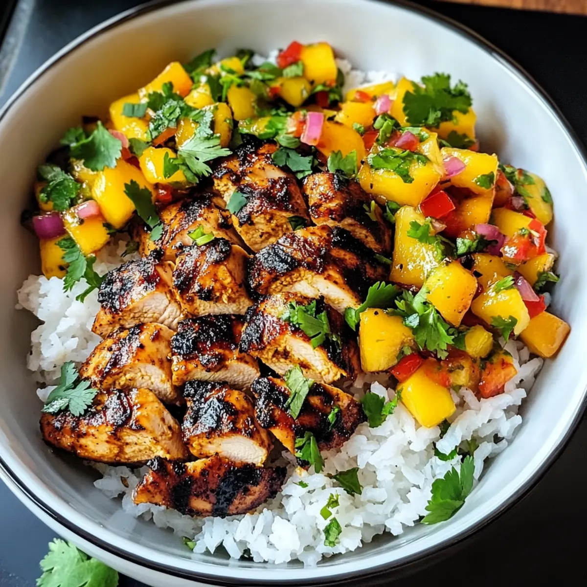 Hast du jemals das Gefühl gehabt, dass dein Abendessen eine kleine Reise wert ist? Diese Jerk-Hähnchen-Schalen mit Mango-Salsa und Kokosreis versetzen dich direkt in die tropische Atmosphäre der Karibik. Saftiges, würziges Hähnchen trifft auf eine erfrischende Mango-Salsa und cremigen Kokosreis – ein perfekter Zusammenschluss von Geschmäckern, der sowohl aufregend als auch behaglich ist. Die Zubereitung dieser Schalen ist unkompliziert und ideal für jeden Abend, an dem du etwas Besonderes genießen möchtest. Außerdem handelt es sich um ein Gericht, das sowohl Freunde als auch Familie begeistert und sicherlich nach mehr verlangen wird. Bist du bereit, deinen Gaumen auf eine tropische Entdeckungsreise zu schicken? Warum solltest du dieses Rezept probieren? Tropische Aromen: Die Kombination aus würzigem Jerk-Hähnchen und süßer Mango-Salsa bringt eine wahre Geschmacksexplosion auf deinen Teller. Einfache Zubereitung: Dieses Rezept erfordert nur grundlegende Kochkenntnisse und ist somit perfekt für jeden, der etwas Neues ausprobieren möchte. Vielfältig: Die Jerk-Hähnchen-Schalen sind anpassbar, sodass du leicht Zutaten hinzufügen oder ersetzen kannst, wie frische Avocado oder würzige Jalapeños. Familienfreundlich: Jeder wird diese leckeren Schalen lieben, sei es bei einem entspannten Abendessen oder einer kleinen Feier mit Freunden. Schnell und nährstoffreich: In nur rund 30 Minuten zauberst du ein köstliches Gericht, das zudem rund 550 Kalorien pro Portion hat. Lass dich auch von unseren anderen Rezepten wie Cremige Gnocchi Mit Spinat Und Parmesan inspirieren! Jerk-Hähnchen-Schalen Zutaten • Entdecke die köstlichen Zutaten für deine Jerk-Hähnchen-Schalen mit Mango-Salsa und Kokosreis. Für das Hähnchen Hähnchenbrustfilets ohne Knochen und Haut – Zarte Basis für das Gericht, die die Gewürze perfekt aufnimmt. Olivenöl – Sorgt dafür, dass das Hähnchen saftig bleibt und gut angebraten wird. Jerk-Gewürz – Das Schlüsselgewürz, eine Mischung aus Piment, Thymian und Scotch Bonnet-Pfeffer für Schärfe und Geschmack. Knoblauchpulver – Fügt subtile Würze hinzu, ohne zu intensiv zu sein. Zwiebelpulver – Bringt eine süße und herzhafte Geschmacksnote in die Gewürzmischung. Räucherpaprika – Verleiht dem Hähnchen eine rauchige Süße. Gemahlener Piment – Trägt Wärme und eine subtile Süße zur Gewürzmischung bei. Gemahlener Zimt – Balanciert die Gewürze mit einer warmen, süßen Note. Cayennepfeffer – Erhöht die Schärfe; je nach Vorliebe anpassen. Gemahlene Muskatnuss – Fügt harmonische untertöne hinzu. Salz & Pfeffer – Essentiell zur Geschmacksabstimmung. Für den Kokosreis Kokosmilch – Verleiht dem Reis Cremigkeit und eine süße Note. Jasminreis – Nimmt das Aroma der Kokosmilch auf und sorgt für die richtige Textur. Wasser – Unverzichtbar, um den Reis perfekt zu kochen. Kokosöl – Verstärkt den tropischen Geschmack des Reises. Für die Mango-Salsa Mango – Süß und saftig, balanciert das würzige Hähnchen perfekt. Rote Paprika – bringt Farbe und milden Geschmack in die Salsa. Rote Zwiebel – Verleiht der Salsa einen scharfen Akzent. Frischer Koriander – Bringt eine frische, zitrusartige Note ins Spiel. Limettensaft – Fügt eine spritzige Frische hinzu, die die Süße der Mango ergänzt. Honig – Süße, die hilft, die Aromen in der Salsa zu vereinen. Mit diesen Zutaten schaffst du eine unwiderstehliche Kombination, die nicht nur deine Geschmacksknospen verwöhnt, sondern auch Freunde und Familie begeistert! Schritt-für-Schritt-Anleitung für Jerk-Hähnchen-Schalen mit Mango-Salsa und Kokosreis Step 1: Ofen vorheizen Heize deinen Ofen auf 190°C (375°F) vor. Dies ist wichtig, um das Jerk-Hähnchen gleichmäßig zu garen. Halte ein Backblech bereit, auf dem das Hähnchen später Plazierung findet. Die vorbereitende Zeit sorgt dafür, dass die Aromen sich entfalten können, während du die restlichen Schritte durchführst. Step 2: Hähnchen vorbereiten Lege die Hähnchenbrustfilets ohne Knochen und Haut auf ein Schneidebrett. Beträufle sie großzügig mit Olivenöl, um einen leckeren Geschmack und zusätzliche Saftigkeit zu garantieren. Verwende deine Hände oder einen Pinsel, um das Öl gleichmäßig zu verteilen. Achte darauf, die Hähnchenstücke gut zu bedecken. Step 3: Hähnchen würzen Streue das Jerk-Gewürz, Knoblauchpulver, Zwiebelpulver und weitere Gewürze gleichmäßig über beide Seiten des Hähnchens. Reibe alles gründlich ein, sodass das Hähnchen von allen Seiten gut gewürzt ist. Diese Gewürze sorgen für den unverwechselbaren Geschmack der Jerk-Hähnchen-Schalen und verleihen dem Gericht ein tropisches Aroma. Step 4: Hähnchen anbraten Erhitze eine ofenfeste Pfanne auf mittelhoher Stufe und füge nochmals etwas Olivenöl hinzu. Wenn das Öl heiß ist, lege das gewürzte Hähnchen in die Pfanne und brate es etwa 2-3 Minuten pro Seite an, bis es goldbraun aussieht. Diese Technik sorgt dafür, dass das Hähnchen eine schöne Kruste erhält, während das Innere zart bleibt. Step 5: Hähnchen im Ofen garen Überführe die Pfanne mit dem angebratenen Hähnchen in den vorgeheizten Ofen. Röste das Hähnchen für 20-25 Minuten, bis die Innentemperatur 74°C (165°F) erreicht. Ein Fleischthermometer ist hier ein nützliches Werkzeug, um sicherzustellen, dass das Hähnchen perfekt gegart ist. Step 6: Kokosreis vorbereiten Während dein Hähnchen im Ofen brät, spüle den Jasminreis gründlich unter kaltem Wasser ab, bis das Wasser klar ist. Kombiniere den Reis in einem Topf mit der Kokosmilch und der notwendigen Menge Wasser. Bring die Mischung zum Kochen und achte darauf, regelmäßig umzurühren, um ein Anbrennen zu verhindern. Step 7: Reis kochen Sobald die Flüssigkeit kocht, reduziere die Hitze, decke den Topf ab und lasse den Reis 18-20 Minuten köcheln. Der Reis sollte das gesamte Kokoswasser absorbiert haben und eine fluffige Konsistenz erreichen. Nach dem Kochen, fluffe den Reis mit einer