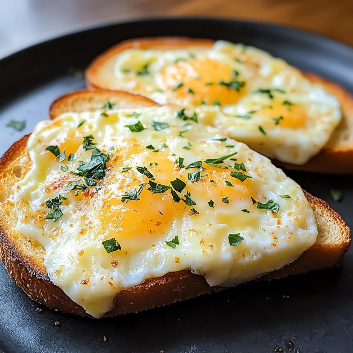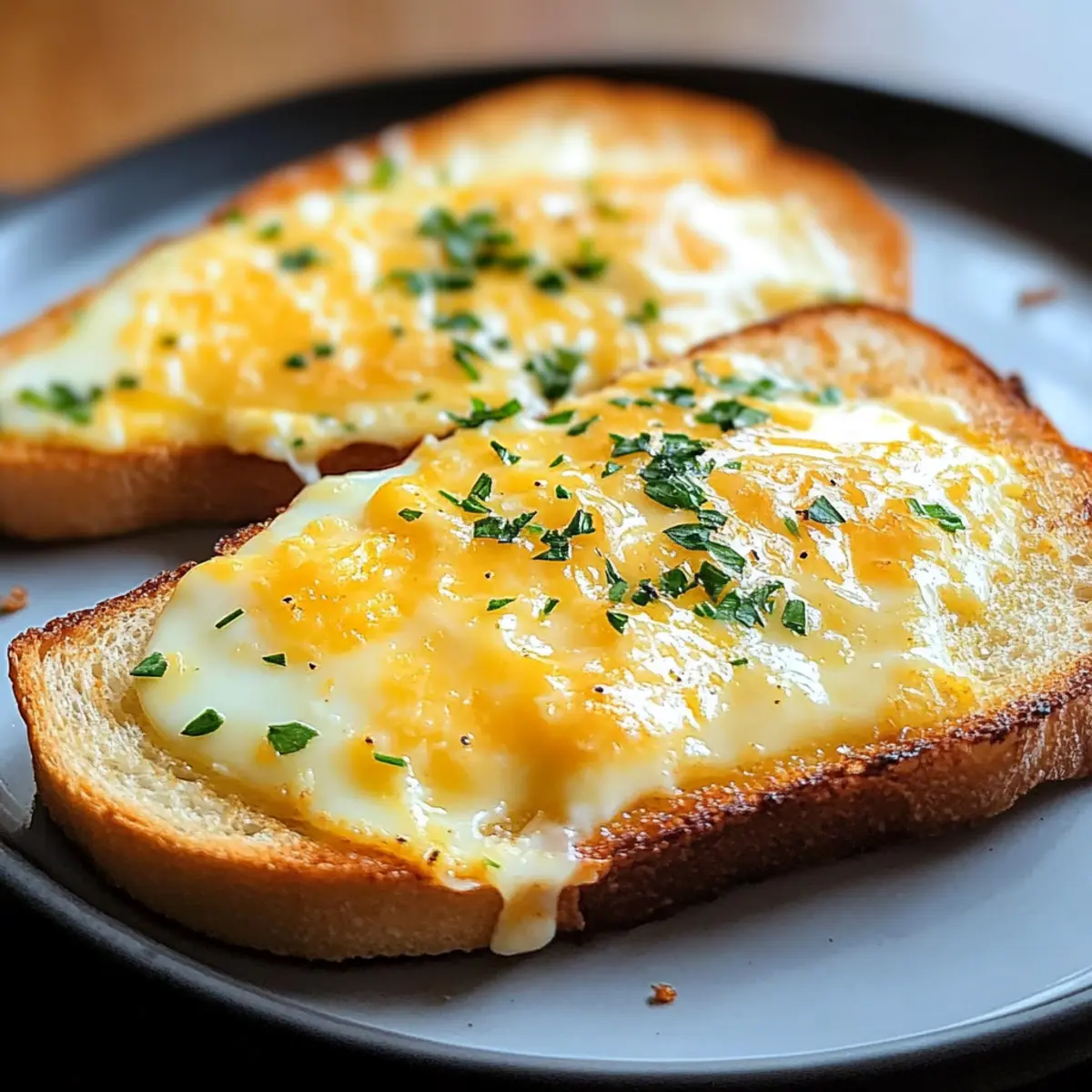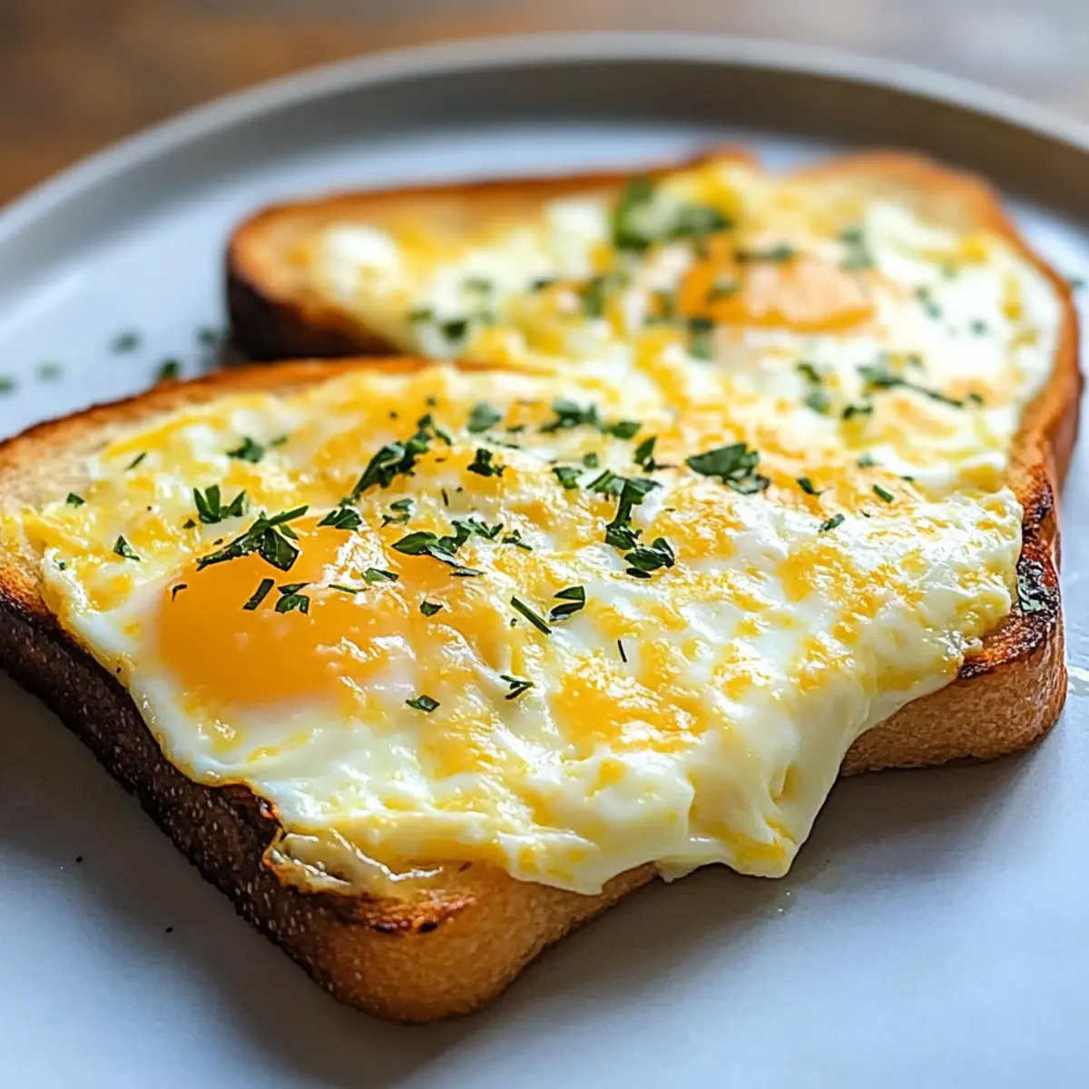 Wenn ich an einen perfekten Morgen denke, kommt mir sofort der köstliche Duft von frisch gebackenem Käse-Ei-Toast in den Sinn. Dieses einfache Frühstücksgericht vereint knuspriges Brot mit den besten Aromen von geschmolzenem Käse und fluffigen Eiern – ein wahrer Genuss, der auch an hektischen Tagen nicht fehlen darf. Der Käse-Ei-Toast lässt sich in wenigen Minuten zubereiten und ist vielseitig anpassbar – ob herzhaft mit frischen Kräutern oder süß mit Honig und Äpfeln. Diese köstliche Mahlzeit ist nicht nur schnell gemacht, sondern auch ein Hit bei der ganzen Familie, perfekt für Allesesser und Veggie-Fans gleichermaßen. Wer kann da widerstehen? Lass uns gemeinsam entdecken, wie man diesen Frühstückstraum zubereitet! Warum wirst du diesen Käse-Ei-Toast lieben? Einfachheit: Die Zubereitung ist kinderleicht und benötigt nur wenige Zutaten, perfekt für jede Kochstufe. Vielseitigkeit: Du kannst den Rezept ganz nach deinem Geschmack anpassen, sei es herzhaft oder süß, und dabei deiner Kreativität freien Lauf lassen. Zeitersparnis: In nur wenigen Minuten zauberst du einen köstlichen Frühstücksgenuss – ideal für hektische Morgen. Familienfreundlich: Dieser Toast zaubert ein Lächeln auf die Gesichter deiner Liebsten und macht das Frühstück zum gemeinsamen Erlebnis. Entdecke weitere Variation Ideen für deinen Käse-Ei-Toast und überrasche deinen Gaumen mit neuen Aromen! Käse-Ei-Toast Zutaten Für das Brot • Brot – Wähle dicke Scheiben, wie Sauerteig oder Vollkorn, für eine optimale Struktur und Textur. Für die Ei-Mischung • Eier – Sie liefern die nötige Proteine und machen das Gericht schön cremig; vegane Alternativen sind ebenfalls möglich. • Käse – Für den perfekten Geschmack; verwende Cheddar, Mozzarella oder pflanzliche Käsealternativen. • Frische Kräuter – Sie verleihen der Mischung eine frische Note und sind besonders empfehlenswert für die herzhafte Variante. • Salz & Pfeffer – Verfeinere den Geschmack nach Belieben, um ein harmonisches Aroma zu erreichen. • Cayennepfeffer – Eine optionale Zutat für alle, die es gerne würzig mögen; ein wenig Würze kann den Käse-Ei-Toast aufpeppen. Mach deinen Käse-Ei-Toast zu etwas ganz Besonderem, indem du die Zutaten nach deinem Geschmack kombinierst! Schritt-für-Schritt-Anleitung für Käse-Ei-Toast Step 1: Ofen oder Air Fryer vorbereiten Heize deinen Ofen auf 200°C vor oder stelle deinen Air Fryer auf 170°C ein. Diese Temperaturen sorgen dafür, dass der Käse-Ei-Toast gleichmäßig gart und schön knusprig wird. Während die Geräte vorheizen, hast du Zeit, die anderen Schritte vorzubereiten und sicherzustellen, dass dein Frühstücksgenuss blitzschnell zubereitet ist. Step 2: Brot leicht rösten Lege deine dicken Brotscheiben auf ein Backblech oder in den Air Fryer und röste sie für etwa 1-2 Minuten, bis sie leicht knusprig sind. Diese erste Röstung sorgt dafür, dass das Brot die köstliche Eier-Käse-Mischung gut aufnehmen kann, ohne durchzuweichen. Achte darauf, dass das Brot nur leicht geröstet wird, um eine perfekte Ausgangsbasis für deinen Käse-Ei-Toast zu schaffen. Step 3: Eier und Käse vermengen Schlage die Eier in einer Schüssel auf und füge deinen gewählten Käse, die frischen Kräuter sowie Salz und Pfeffer hinzu. Wenn du es würzig magst, kannst du auch eine Prise Cayennepfeffer hinzufügen. Verrühre alles gut, bis die Zutaten gleichmäßig verteilt sind. Die cremige Mischung ist die köstliche Füllung für deinen Käse-Ei-Toast. Step 4: Mischung auf dem Brot verteilen Verteile die Eier-Käse-Mischung gleichmäßig über die leicht gerösteten Brotscheiben. Achte darauf, dass die Mischung bis zu den Rändern reicht, damit jeder Bissen maximalen Geschmack bietet. Diese Schicht wird im Ofen oder Air Fryer goldbraun und köstlich aufgehen, daher ist eine gleichmäßige Verteilung entscheidend für ein perfektes Ergebnis. Step 5: Backen oder Frittieren Für den Ofen, backe die Brote auf dem Blech für etwa 10-12 Minuten, bis die Eier leicht aufgeplustert, der Käse geschmolzen und die Oberfläche goldbraun ist. Im Air Fryer benötigst du ca. 8-10 Minuten, um eine ähnliche knusprige Konsistenz zu erreichen. Halte ein Auge darauf, damit dein Käse-Ei-Toast nicht übergart wird – er sollte perfekt knusprig und köstlich duftend sein. Step 6: Servieren und genießen Sobald dein Käse-Ei-Toast fertig ist, nimm ihn heraus und lass ihn kurz abkühlen. Serviere ihn sofort, noch warm und frisch, als wunderbares Frühstück. Du kannst ihn alleine genießen oder mit Beilagen wie frischem Obst oder einer Tasse Kaffee kombinieren. Lass dir diesen köstlichen Start in den Tag nicht entgehen! Expertentipps für den besten Käse-Ei-Toast Die richtige Brotsorte: Verwende dickere Scheiben wie Sauerteig oder Vollkorn. Das sorgt für die nötige Stabilität und verhindert, dass der Toast matschig wird. Eier mischen: Achte darauf, die Eier mit dem Käse gut zu vermengen, damit der Käse gleichmäßig schmilzt. Ein kleiner Klumpen Käse kann zu einem ungleichmäßigen Schmelzen führen. Käse-Auswahl: Wähle deinen Käse je nach Vorliebe; Cheddar verleiht eine kräftige Note, während Mozzarella für einen milden Geschmack sorgt. Experimentiere auch mit pflanzlichen Alternativen. Würzen nicht vergessen: Salz und Pfeffer sind entscheidend für den Geschmack. Teste die Mischung vor dem Backen, um sicherzugehen, dass du den perfekten Geschmack erreichst. Backzeit im Auge behalten: Überwache den Käse-Ei-Toast während des Backens. Jeder Ofen und Air Fryer kann variieren, um ein Übergaren zu vermeiden – goldbraun ist der Schlüssel! Schnelle Vorbereitung: Du kannst die Eier-Käse-Mischung bereits im Voraus vorbereiten und im Kühlschrank aufbewahren. So hast du an hektischen Morgen in wenigen Minuten ein köstliches Frühstück! Aufbewahrungstipps für Käse-Ei-Toast Zimmertemperatur: Frischer Käse-Ei-Toast sollte idealerweise sofort verzehrt werden. Bei Zimmertemper