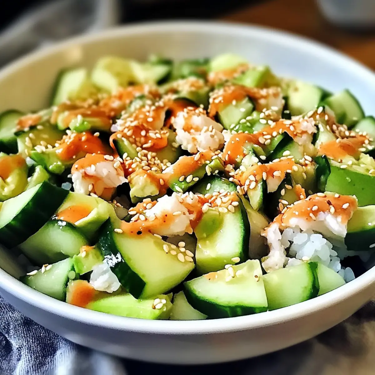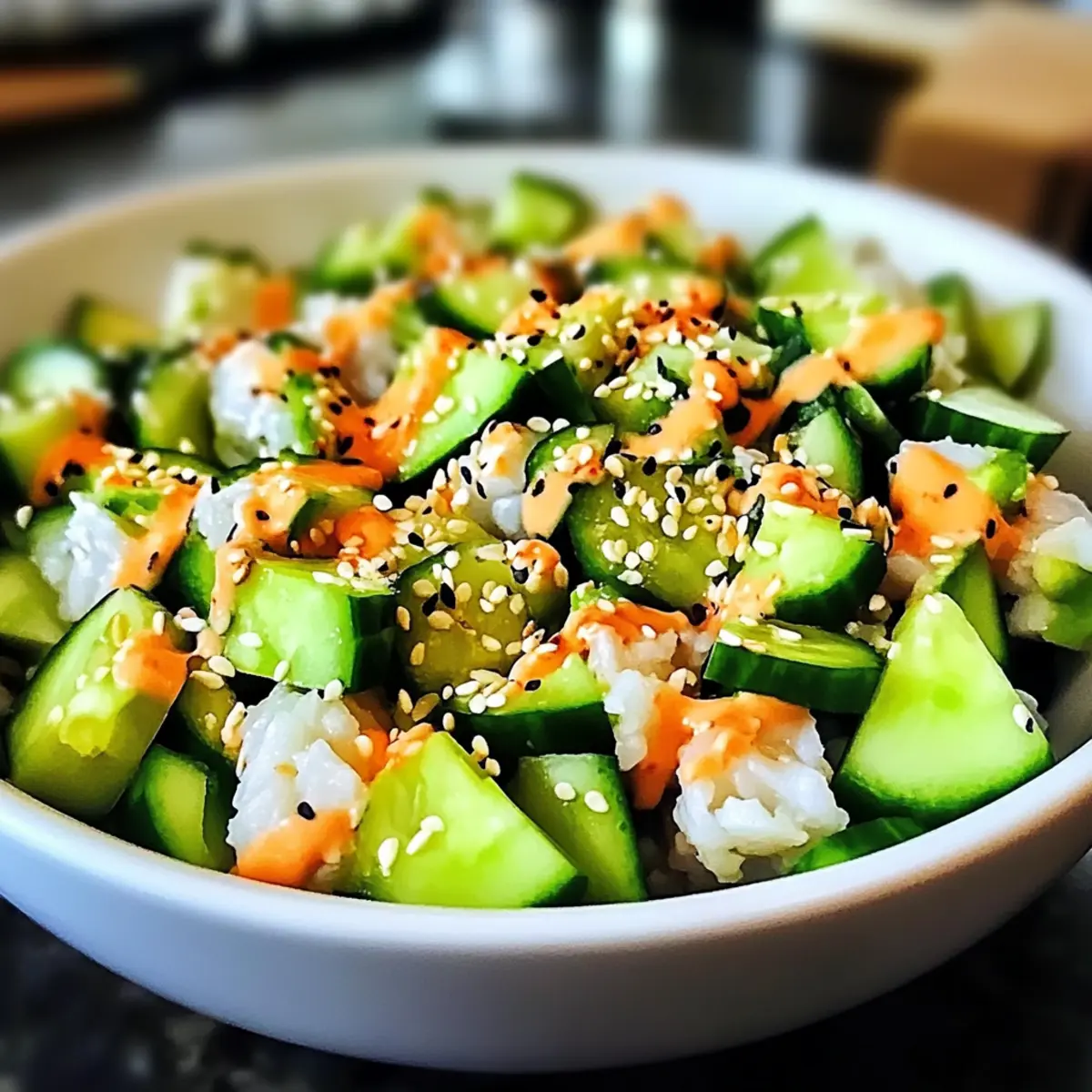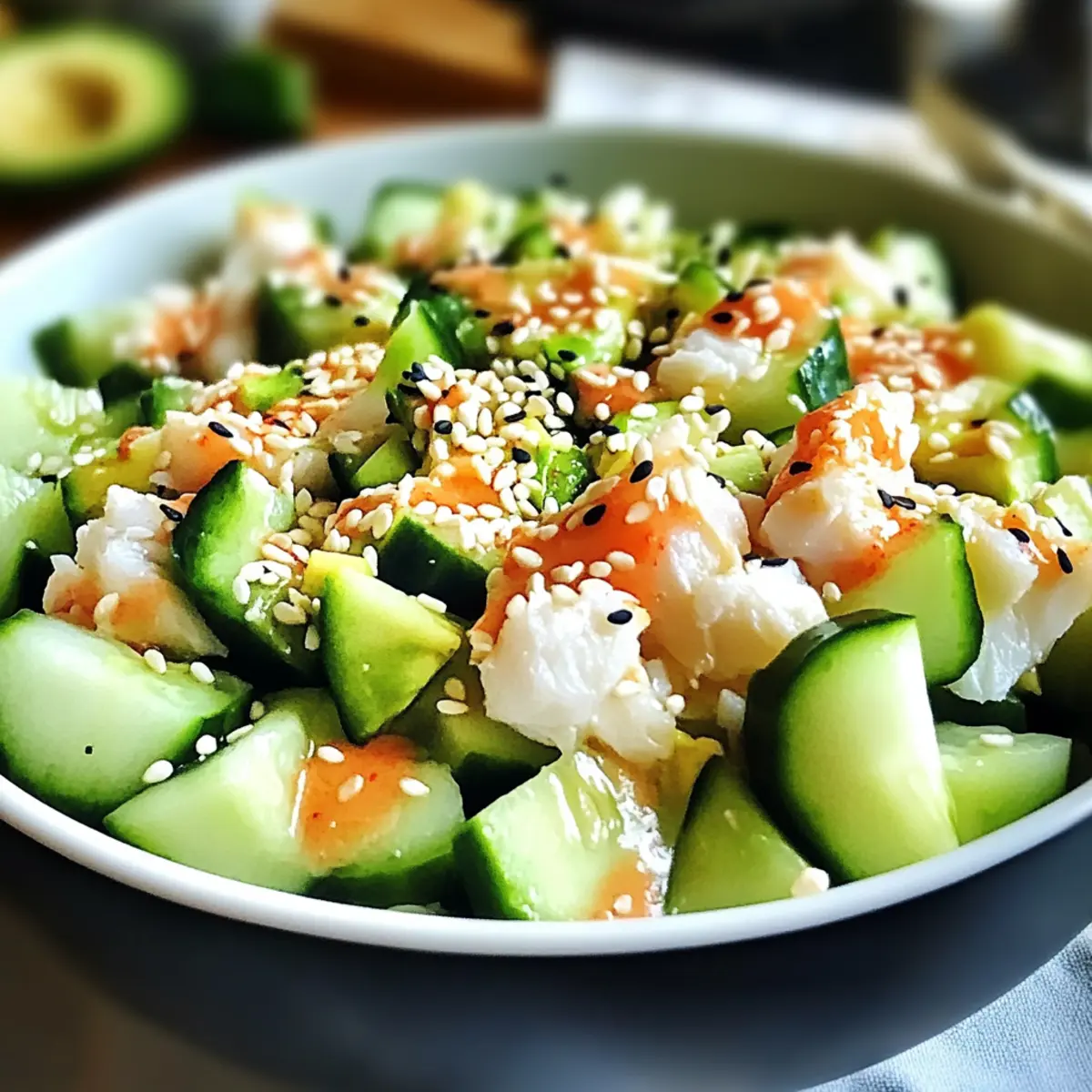 Als ich neulich nach einer erfrischenden Möglichkeit suchte, meine Liebe zu Sushi zu stillen, stieß ich auf eine wunderbare Idee: den kalifornischen Rolle Gurkensalat. Dieser leichte und gesunde Salat vereint die knackige Frische von Gurken, die Cremigkeit von Avocado und die zarten Aromen von Krabben – alles umhüllt von einem köstlichen, leicht würzigen Dressing. Das Beste daran? Er ist nicht nur glutenfrei und kohlenhydratarm, sondern auch schnell zubereitet, perfekt für heiße Sommertage oder stressige Abende. Diese Kombination lässt die Herzen von Sushi-Liebhabern höher schlagen und ist eine großartige Möglichkeit, frische Zutaten in Ihre Ernährung zu integrieren. Neugierig darauf, wie sich dieser Salat in Ihrer Küche verwandeln lässt? Lassen Sie uns gleich loslegen! Warum werden Sie diesen Gurkensalat lieben? Einfachheit pur: Die Zubereitung ist kinderleicht und erfordert nur einige grundlegende Kochkünste, sodass Sie im Handumdrehen eine köstliche Mahlzeit genießen können. Frisch und gesund: Dieser Kalifornische Roll Gurkensalat bringt frische, knackige Zutaten auf Ihren Teller, die nicht nur lecker, sondern auch nährstoffreich sind. Vielseitigkeit: Passen Sie das Rezept an Ihre Vorlieben an! Fügen Sie dünn geschnittene Radieschen oder frische Mango hinzu, um zusätzliche Aromen zu erleben. Kein Kochen erforderlich: Ideal für heiße Tage oder schnelle Abendessen! Genießen Sie das Geschmackserlebnis einer Sushi-Geschichte, ohne den Aufwand des Rollens. Zufriedenstellend: Die harmonische Mischung aus Texturen und Geschmäckern wird sowohl Sushi-Fans als auch Neulingen Freude bereiten! Kalifornische Rolle Gurkensalat Zutaten • Dieser frische, köstliche Salat begeistert mit einfachen, gesunden Zutaten. Für den Salat Gurke – sorgt für einen kühlen Crunch; eine große, dünn geschnittene Gurke ist optimal für die Textur. Imitation Krabbenfleisch – bringt herzhafte Tiefe ins Gericht; kann durch frisches Krabbenfleisch für authentischen Geschmack ersetzt werden. Avocado – bietet Cremigkeit und gesunde Fette; achten Sie auf reife Avocados, die vorsichtig gewürfelt werden sollten. Frühlingszwiebeln – geben eine frische Zwiebelnote; verwenden Sie sowohl grüne als auch weiße Teile für einen ausgewogenen Geschmack. Für das Dressing Reisessig – fügt dem Dressing die nötige Würze hinzu; unbedingt auf Reisessig für den originalen Geschmack achten. Sojasauce – verstärkt das Umami-Profil; verwenden Sie glutenfreie Sojasauce für eine glutenfreie Variante. Sesamöl – bringt ein nussiges Aroma; essenziell für den authentischen Geschmack, kann jedoch bei Bedarf ersetzt werden. Zucker – balanciert die Aromen im Dressing; nach Geschmack anpassen, oder einen Zuckersatz verwenden. Salz und Pfeffer – verstärken den Gesamtgeschmack; nach Belieben dosieren. Für die Garnitur Sesamkörner – sorgen für einen zusätzlichen Crunch und visuelle Attraktivität; können zum besten Schluss als Garnitur auf dem Salat verteilt werden. Genießen Sie diesen köstlichen Kalifornischen Rolle Gurkensalat, der sich perfekt für ein leichtes Gericht oder als Beilage geeignet ist! Schritt-für-Schritt-Anleitung für Kalifornische Rolle Gurkensalat Step 1: Gurke vorbereiten Schneiden Sie die Gurke mit einem scharfen Messer in dünne Runden. Achten Sie darauf, gleichmäßige Scheiben zu schneiden, um die Textur des Salats zu optimieren. Dies sollte etwa 5 Minuten dauern. Legen Sie die geschnittenen Gurken in eine große Schüssel und bewundern Sie die frische, grüne Farbe, die sie in Ihr Gericht bringen. Step 2: Avocado würfeln Nehmen Sie eine reife Avocado und schneiden Sie sie in der Mitte durch. Entfernen Sie den Kern vorsichtig und schneiden Sie das Fruchtfleisch in kleine Würfel. Seien Sie beim Würfeln achtsam, um das Fruchtfleisch nicht zu zerdrücken. Dies dauert etwa 3 bis 5 Minuten. Die cremigen Avocadostücke bieten eine perfekte Ergänzung zu Ihrem Kalifornischen Rolle Gurkensalat. Step 3: Frühlingszwiebeln schneiden Die weißen und grünen Teile der Frühlingszwiebeln fein hacken. Bereiten Sie ein scharfes Messer vor, um saubere Schnitte zu gewährleisten. Diese sollten in etwa 2 Minuten fertig sein. Fügen Sie die gehackten Frühlingszwiebeln zu den Gurken in der Schüssel hinzu, um eine frische Zwiebelnote zu erzielen. Step 4: Zutaten kombinieren Geben Sie die Imitation Krabbenfleischstücke zur Gurken- und Avocado-Mischung in die große Schüssel. Seien Sie vorsichtig beim Mischen, um die zarten Zutaten nicht zu zerdrücken. Diese eine Minute dauert weniger als fünf Minuten. Alles sollte gleichmäßig verteilt sein und eine bunte Mischung ergeben. Step 5: Dressing zubereiten In einer separaten Schüssel den Reisessig, die Sojasauce, das Sesamöl, den Zucker, das Salz und den Pfeffer gut vermengen. Verwenden Sie einen kleinen Schneebesen, um alles gut zu vermischen, bis sich der Zucker vollständig aufgelöst hat. Dies dauert etwa 2 Minuten. Das Dressing sollte eine glatte, leicht glänzende Konsistenz haben. Step 6: Salat anrichten Das Dressing über die Salatmischung gießen und vorsichtig vermengen, um eine gleichmäßige Beschichtung der Zutaten zu gewährleisten. Nehmen Sie sich etwa 2 Minuten Zeit für diesen Schritt. Sehen Sie, wie die bunten Zutaten in einer köstlichen, glänzenden Sauce vereint werden, die Ihren Kalifornischen Rolle Gurkensalat zum Leben erweckt. Step 7: Kühlen lassen Den fertigen Salat mindestens 15 Minuten im Kühlschrank kühlen lassen. Dies ermöglicht es den Aromen, sich zu verbinden und die Frische zu intensifizieren. Nach der Kühlzeit herausnehmen; der Salat sollte gut gekühlt und bereit zum Servieren sein. Step 8: Garnitur hinzufügen Vor dem Servieren die Sesamkörner gleichmäßig über die Oberseite des Salats streuen, um zusätzlichen Crunch und visuelle Attraktivität zu verleihen. Dies dauert nur eine Minute und wertet Ihren Kalifornischen Rolle Gurkensalat auf. Jetzt ist Ihr Salat bereit für den Tis