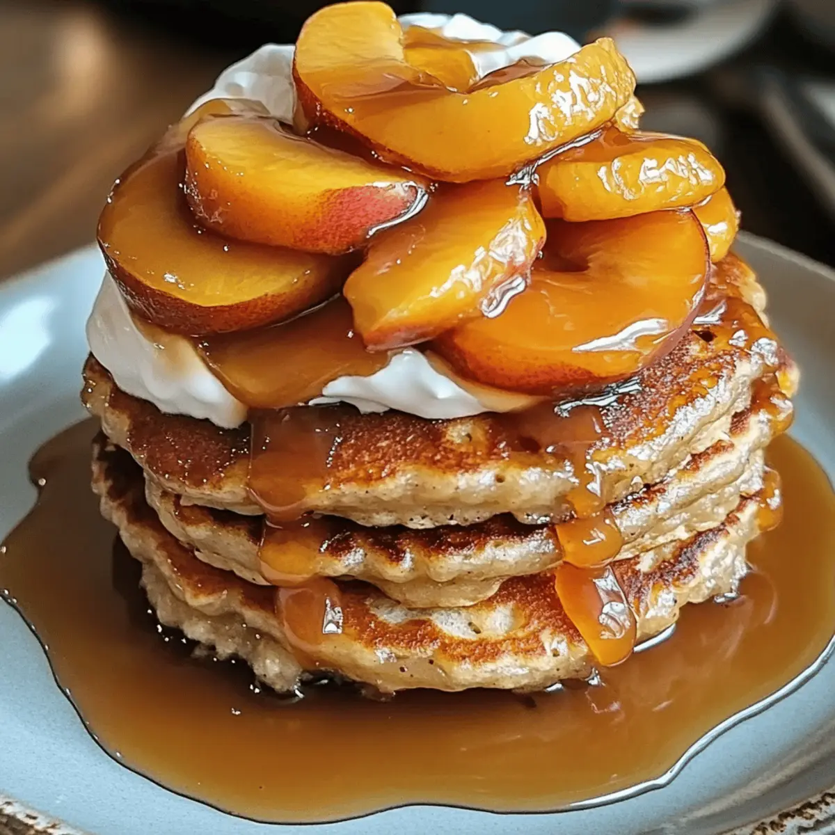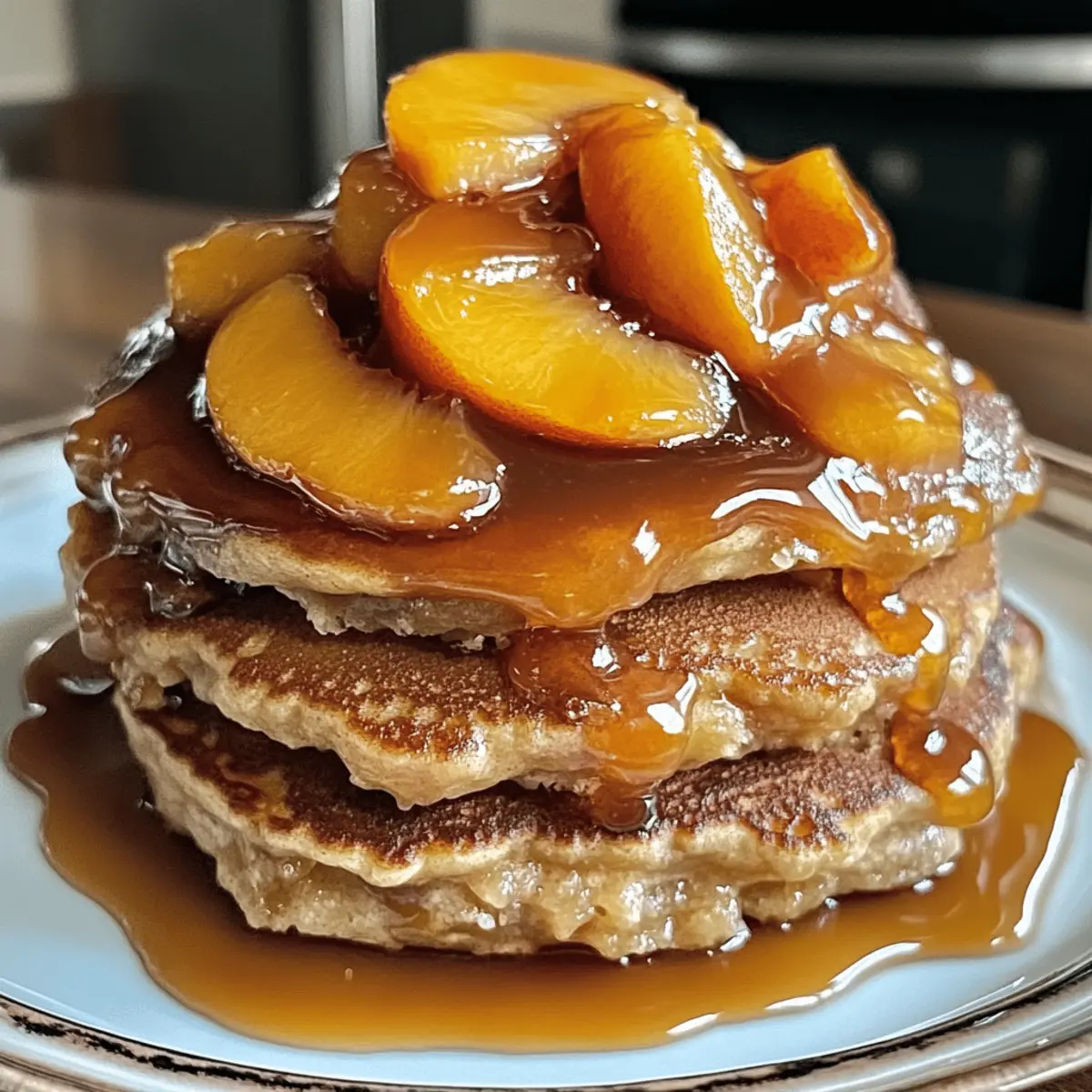 Genießen Sie diese Karamell-Pfirsich-Kuchen-Pfannkuchen – ein luxuriöses Frühstück mit fluffiger Textur und süß karamellisierten Pfirsichen.