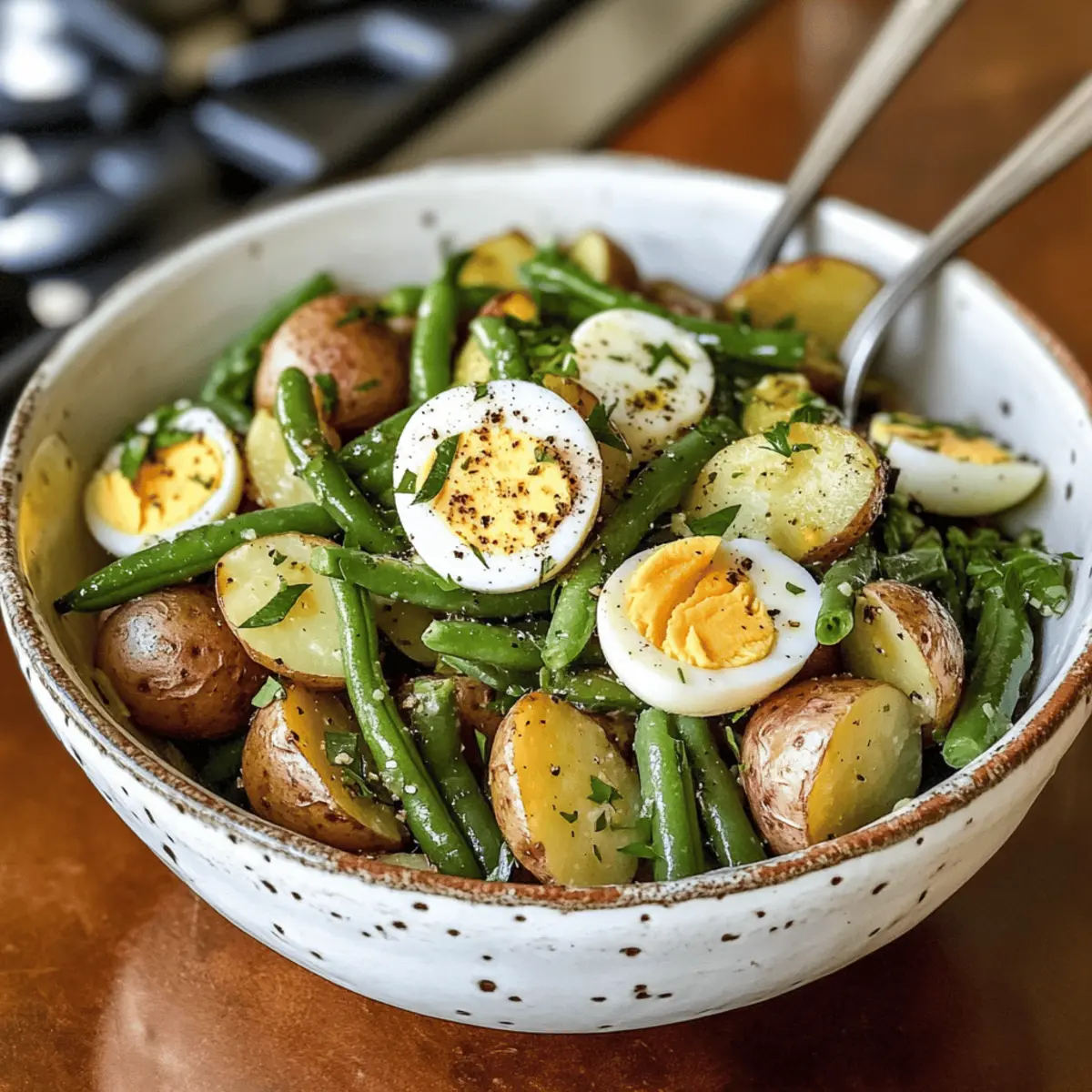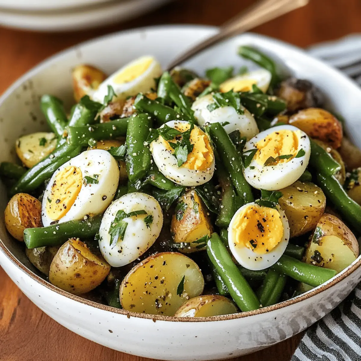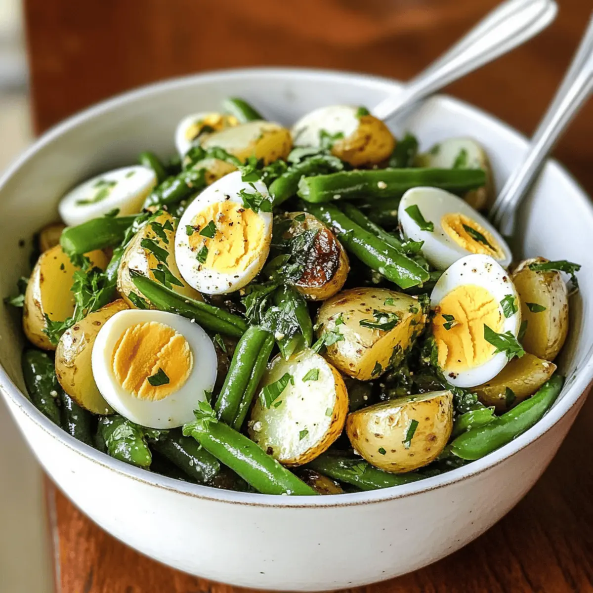 Die Sonne strahlt am Himmel und der Duft von frisch gekochten Kartoffeln und knackigen grünen Bohnen liegt in der Luft. Wenn ich an einen perfekten Sommertag denke, finde ich mich oft in der Küche wieder, wo ich einen köstlichen Kartoffel- und grünen Bohnensalat zubereite. Diese französische Delikatesse vereint die Leichtigkeit mediterraner Aromen und eignet sich wunderbar als erfrischende Beilage zu Grillabenden oder als leichtes Mittagessen. Der Salat, verfeinert mit einer spritzigen Vinaigrette, ist nicht nur glutenfrei, sondern kann auch im Voraus zubereitet werden – ideal, um Zeit zu sparen und den Geschmack für den nächsten Tag noch voller zu genießen. Neugierig auf das Rezept und die kleinen Geheimnisse, die es besonders machen? Lass uns gemeinsam in die Zubereitung eintauchen! Warum ist dieser Salat so unwiderstehlich? Vielseitigkeit: Dieser Kartoffel- und grüne Bohnensalat lässt sich wunderbar anpassen – füge deinem Lieblingsgemüse hinzu oder tausche die Oliven gegen Kapern aus. Frische Zutaten: Die Kombination aus zarten Kartoffeln und knackigen Bohnen bringt Sommer auf den Teller. Schnelle Zubereitung: Mit wenigen Schritten und einfachen Zutaten hast du im Handumdrehen ein köstliches Gericht. Vorbereitungsfreundlich: Ideal für Partys! Bereite ihn im Voraus zu und lass die Aromen über Nacht ziehen. Nahrhaft und leicht: Perfekt für warme Tage, da er leicht und sättigend ist. Entdecke auch unsere anderen leichten Salate für noch mehr Inspiration! Kartoffel- und grüne Bohnensalat Zutaten • Dieser köstliche Kartoffel- und grüne Bohnensalat ist nicht nur einfach zuzubereiten, sondern auch eine wahre Gaumenfreude! Für den Salat Neue Kartoffeln (900g) – sorgen für eine zufriedenstellende Konsistenz; du kannst auch Yukon Gold verwenden für eine andere Textur. Grüne Bohnen (450g) – verleihen Knackigkeit und Farbe; achte darauf, sie vor dem Kochen zu blanchieren. Hartgekochte Eier (2) – bringen Eiweiß und Cremigkeit; sie können im Voraus zubereitet werden und bleiben bis zu 7 Tage im Kühlschrank frisch. Schwarze Oliven (12, trocken eingelegt) – fügen Tiefe und Geschmack hinzu; ersetze sie durch mehr schwarze Oliven, wenn dir das lieber ist. Frische glatte Petersilie (4-5 Zweige) – bringt eine milde Kräuternote; frischer oder getrockneter Estragon kann eine gute Alternative sein. Schnittlauch (4-5 Zweige) – sorgt für einen milden Zwiebelgeschmack; kann weggelassen werden, wenn nicht verfügbar. Für die Vinaigrette Extra natives Olivenöl (75ml) – die Basis des Dressings, die für Reichhaltigkeit sorgt. Zitronensaft (30ml) – fügt Säure und Frische hinzu. Weißweinessig (30ml) – bietet einen angenehmen Biss; kannst ihn auch durch Reisessig ersetzen. Knoblauchzehen (2, gehackt) – verleihen ein würziges Aroma; optional je nach Geschmack. Dijon-Senf (2 TL) – wirkt als Emulgator und verstärkt die Geschmacksfülle. Kapern (1 EL, gehackt) – bringen eine salzige Note; sie können für einen milderen Geschmack weggelassen werden. Salz und Pfeffer (nach Geschmack) – heben das Gesamtaroma hervor. Schritt-für-Schritt-Anleitung für Kartoffel- und grüne Bohnensalat mit zesty Vinaigrette Step 1: Hartgekochte Eier zubereiten Lege die Eier in einen Topf, bedecke sie mit kaltem Wasser und bringe das Wasser zum Kochen. Lass sie nach dem Aufkochen für 1 Minute sprudelnd kochen. Decke den Topf ab und stelle ihn beiseite, während die Eier 10 Minuten ziehen. Danach spüle sie unter kaltem Wasser ab, schäle sie und schneide sie in Viertel. Step 2: Kartoffeln kochen Halbiere die neuen Kartoffeln und gib sie in einen großen Topf mit gesalzenem Wasser. Bringe das Wasser zum Kochen und lass die Kartoffeln etwa 12 Minuten köcheln, bis sie gerade zart, aber noch fest sind. Prüfe die Garheit mit einer Gabel – sie sollten nicht zerfallen. Step 3: Grüne Bohnen hinzufügen Füge die vorbereiteten, in Drittel geschnittenen grünen Bohnen in den Topf mit den Kartoffeln hinzu und koche alles zusammen für weitere 2-3 Minuten. Die Bohnen sollten knackig und hellgrün bleiben. Achte darauf, sie nicht zu lange zu garen, um die frische Farbe zu bewahren. Step 4: In Eiswasser abschrecken Gieße die Kartoffeln und Bohnen in ein Sieb ab und übertrage sie sofort in eine Schüssel mit Eiswasser. Dies stoppt den Garprozess und hilft, die leuchtende Farbe der Bohnen zu erhalten. Lass das Gemüse für mindestens 5 Minuten im Eiswasser ruhen, bevor du es abtropfen lässt. Step 5: Vinaigrette zubereiten In einem Einmachglas vermische das Olivenöl, den Zitronensaft, den Weißweinessig, den gehackten Knoblauch, den Dijon-Senf, die Kapern, die schwarzen Oliven sowie Salz und Pfeffer nach Geschmack. Schraube den Deckel auf und schüttle das Glas kräftig, bis die Vinaigrette schön emulgiert ist. Step 6: Salat zusammensetzen In einer großen Schüssel kombinierst du die frischen Kräuter mit der Hälfte der Vinaigrette. Füge die abgekühlten Kartoffeln und grünen Bohnen hinzu sowie die schwarzen Oliven. Mische alles vorsichtig, damit die Zutaten gleichmäßig verteilt sind, ohne die Kartoffeln zu zerdrücken. Step 7: Salat anrichten Garniere den Kartoffel- und grünen Bohnensalat mit den Vierteln der hartgekochten Eier und tröpfle die restliche Vinaigrette darüber. Lasse den Salat für mindestens 15 Minuten bei Zimmertemperatur oder im Kühlschrank ruhen, damit die Aromen sich gut entfalten können. Expert Tips für Kartoffel- und grüne Bohnensalat Perfekte Garzeit: Achte darauf, die Kartoffeln und grünen Bohnen nicht zu lange zu kochen; sie sollten zart, aber noch bissfest sein, um die ideale Textur zu erhalten. Eiswasser-Schock: Die Sofortübertragung in Eiswasser nach dem Kochen ist entscheidend. Dadurch bleibt die leuchtende Farbe der Bohnen erhalten und sie behalten ihren Biss. Vinaigrette-Zubereitung: Schau, dass du die Vinaigrette gut schüttelst, damit sich Öle und Essig perfekt vermischen. Dies sorgt für einen gleichmäßigen Geschmack im ganzen 