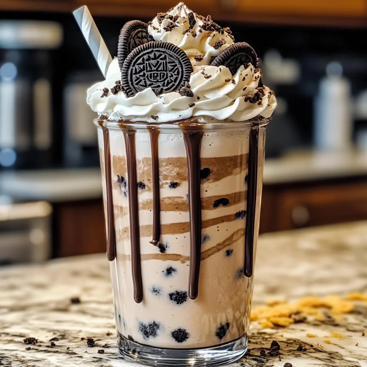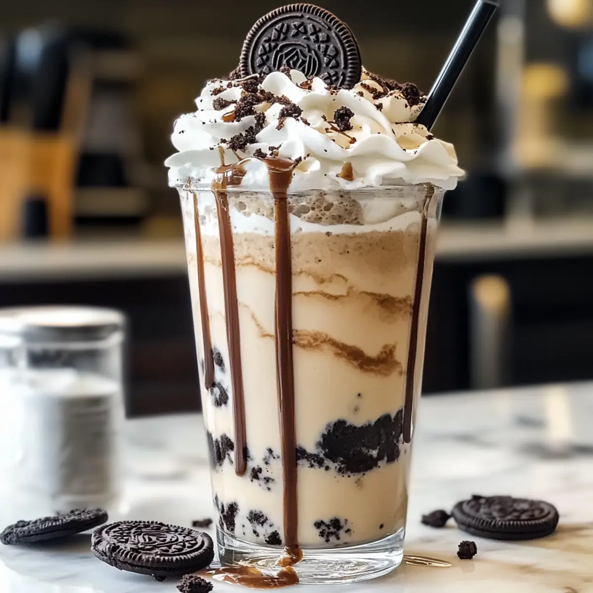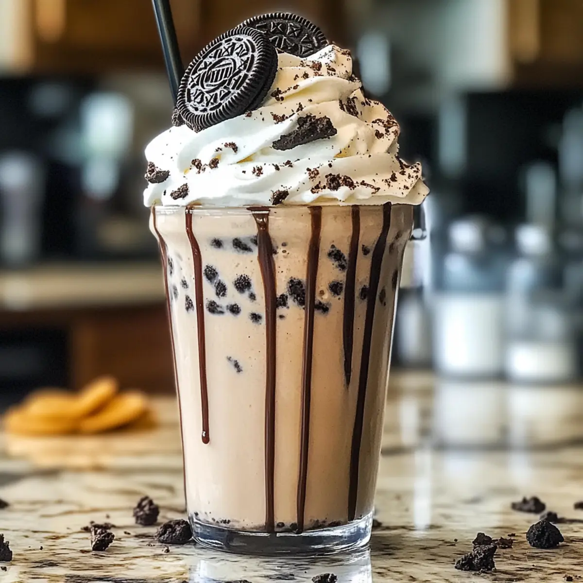 Wenn ich an warme Sommertage denke, kommen mir sofort die köstlichen Kombos von kühlen Getränken und süßen Leckereien in den Sinn. Und hier ist ein echter Favorit, den ich mit euch teilen möchte: den Kekse & Sahne Frappuccino. Dieses Rezept vereint die geschmacklichen Freuden von Oreo-Keksen mit einer sahnigen, erfrischenden Basis, die sich perfekt für eine kleine Auszeit eignet. In nur fünf Minuten zaubert ihr euch diese köstliche, cremige Leckerei, die nicht nur ein wahrer Hingucker ist, sondern auch problemlos mit euren Lieblingszutaten angepasst werden kann – sei es eine pflanzliche Milch für eine milchfreie Option oder noch mehr Kekse für den extra Crunch. Seid ihr bereit, einen Hauch von Café-Atmosphäre in euer Zuhause zu bringen? Lasst uns loslegen! Warum ist dieser Frappuccino ein Muss? Einfachheit: Die Zubereitung ist kinderleicht, und in nur fünf Minuten könnt ihr euch eine köstliche Erfrischung gönnen. Vielfalt: Die Möglichkeit, die pflanzliche Milch zu wählen, macht diesen Kekse & Sahne Frappuccino für alle geeignet – auch für diejenigen mit besonderen Ernährungsbedürfnissen. Köstlicher Geschmack: Die Kombination aus Oreo-Keksen und sahniger Textur sorgt für ein Geschmackserlebnis, das einfach unwiderstehlich ist! Perfekte Präsentation: Mit einem Schuss Schokoladensirup und einer großzügigen Portion Sahne ist er nicht nur lecker, sondern sieht auch super aus – ideal für Gäste oder besondere Anlässe. Individuelle Anpassung: Von zusätzlichen Toppings wie Erdnussbutter bis hin zu Flavors wie Minze – der Kreativität sind keine Grenzen gesetzt! Genießt auch unsere anderen leckeren Rezepte, wie Erdbeer Crunch Kekse oder Schokoladen Karamell Kekse für eine perfekte Begleitung! Kekse & Sahne Frappuccino Zutaten Für die Basis • Eiswürfel – Sorgt für die nötige Kühle und Textur; mehr Eis macht den Frappuccino dicker. • Milch – Verleiht die cremige Konsistenz; für eine milchfreie Version kann Mandel-, Hafer- oder Sojamilch verwendet werden. • Zucker – Süßt nach Belieben; passt die Menge an euer persönliches Geschmacksempfinden an. • Vanilleextrakt – Bringt zusätzliche Geschmacksnuancen; verwendet bestenfalls reinen Extrakt für das optimale Aroma. Für den Geschmack • Oreo-Kekse – Der Hauptgeschmacksträger, der Schokoladennote und Cremigkeit verleiht; auch andere Geschmacksrichtungen wie Minze oder Erdnussbutter können verwendet werden. • Schokoladensirup – Fügt zusätzliche Süße und Schokoladengeschmack hinzu; ideal für eine dekorative Drizzle. Für das Topping • Sahne – Sorgt für zusätzliche Reichhaltigkeit und Textur; kann durch eine milchfreie Schlagcreme ersetzt werden. Schritt-für-Schritt-Anleitung für Kekse & Sahne Frappuccino Step 1: Zutaten mixen Gibt in einen Mixer 2 Tassen Eiswürfel, 1 Tasse Milch, 2 Esslöffel Zucker, ½ Teelöffel Vanilleextrakt und 8 Oreo-Kekse. Mixe alles für etwa 30 bis 60 Sekunden auf hoher Stufe, bis die Mischung schön cremig und glatt ist. Achte darauf, die Seiten des Mixers gegebenenfalls abzukratzen, um sicherzustellen, dass alle Zutaten gut vermischt sind. Step 2: Glas vorbereiten Nehmt ein hohes Glas und träufelt 1-2 Esslöffel Schokoladensirup entlang der Innenseite des Glases, indem ihr eine kreative Schwungbewegung macht. Dies sorgt nicht nur für einen ansprechenden Look, sondern fügt auch einen zusätzlichen Hauch von Schokolade hinzu, der perfekt zu eurem Kekse & Sahne Frappuccino passt. Step 3: Frappuccino eingießen Gieße die cremige Mischung aus dem Mixer vorsichtig in das vorbereitete Glas. Achte darauf, dass das Glas dabei nicht überläuft, um ein ordentliches Erscheinungsbild zu gewährleisten. Die schönen Schokoladenspiralen sollten sichtbar bleiben, was dem Getränk eine einladende Optik verleiht. Step 4: Topping hinzufügen Vervollständige deinen Kekse & Sahne Frappuccino, indem du eine großzügige Portion Sahne auf die Oberfläche gießt. Für das perfekte Finish streue einige zerdrückte oder ganze Oreo-Kekse darüber, um einen zusätzlichen Crunch und ein weiteres stilvolles Element zu bieten. Step 5: Genießen Sofort servieren und den erfrischenden Kekse & Sahne Frappuccino genießen. Die Kombination aus cremiger Textur, schokoladigem Geschmack und knusprigen Keksstückchen ist ein Genuss, den du nicht verpassen solltest. Perfekt für heiße Tage oder als köstliches Dessert! Kekse & Sahne Frappuccino Variationen Eure Kreativität ist gefragt! Lasst uns gemeinsam diesen köstlichen Frappuccino anpassen, um neue Geschmackserlebnisse zu schaffen. Milchfrei: Ersetzt die normale Milch durch Mandel-, Hafer- oder Sojamilch für eine milchfreie Variante. So kann jeder genießen! Zusätzlicher Koffein-Kick: Gebt einen Shot Espresso oder etwas kalten Kaffee dazu, um dem Frappuccino einen belebenden Boost zu verleihen. Perfekt für Morgenmuffel! Flavor-Vielfalt: Tauscht die klassischen Oreo-Kekse gegen andere Geschmacksrichtungen wie Minze oder Erdnussbutter aus. So wird der Frappuccino spannend und abwechslungsreich! Gesunde Süße: Nutzt Honig oder Agavendicksaft anstelle von Zucker, um eine natürliche Süße zu erhalten, die ebenfalls vollmundig schmeckt. Crunchy Topping: Füge einige gehackte Nüsse oder Karamellstückchen als Topping hinzu, um einen interessanten Texturenmix zu erzielen. Ein wahrer Gaumenschmaus! Extra Schokoladig: Verfeinert euren Frappuccino mit einem Esslöffel Kakaopulver für einen intensiveren Schokoladengeschmack. Das macht schokoladige Herzen glücklich! Fruchtige Note: Probiert einen Schuss Erdbeer- oder Himbeersirup für eine fruchtige Variante aus. Diese frischen Aromen ergänzen die Schokolade wunderbar. Sahniger Genuss: Statt Sahne könnt ihr auch griechischen Joghurt verwenden, um dem Getränk eine cremige, proteinreiche Note zu verleihen. Ein echtes Power-Paket! Wenn euch unser Kekse & Sahne Frappuccino gefällt, dann schaut euch auch die Schokoladen Haferflocken Kekse oder die köstlichen Schokoladen 