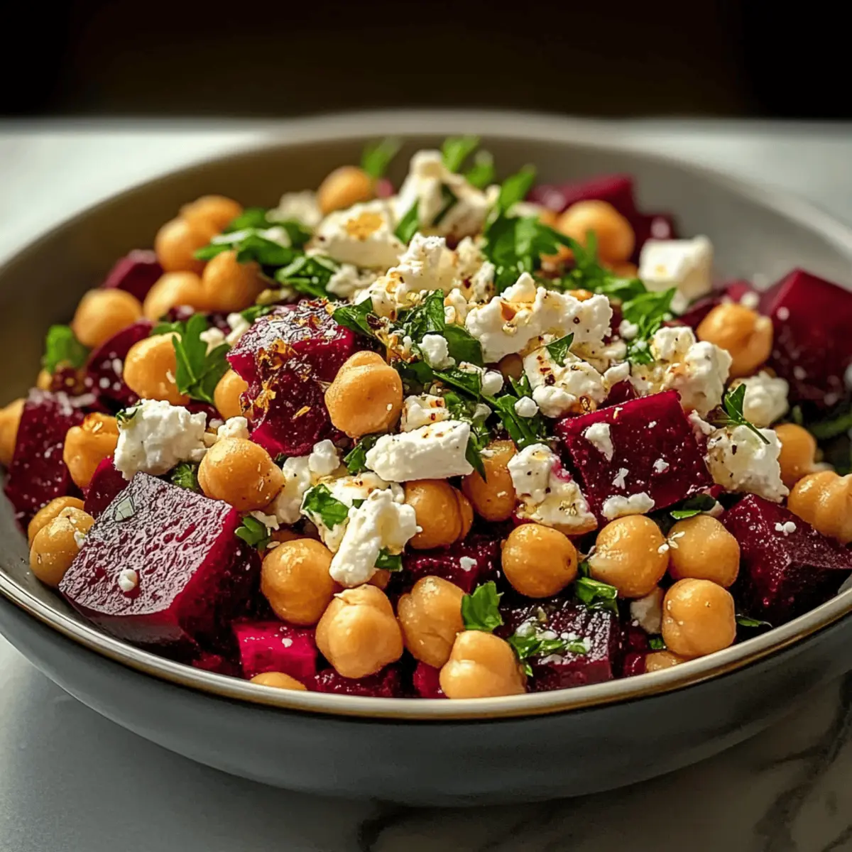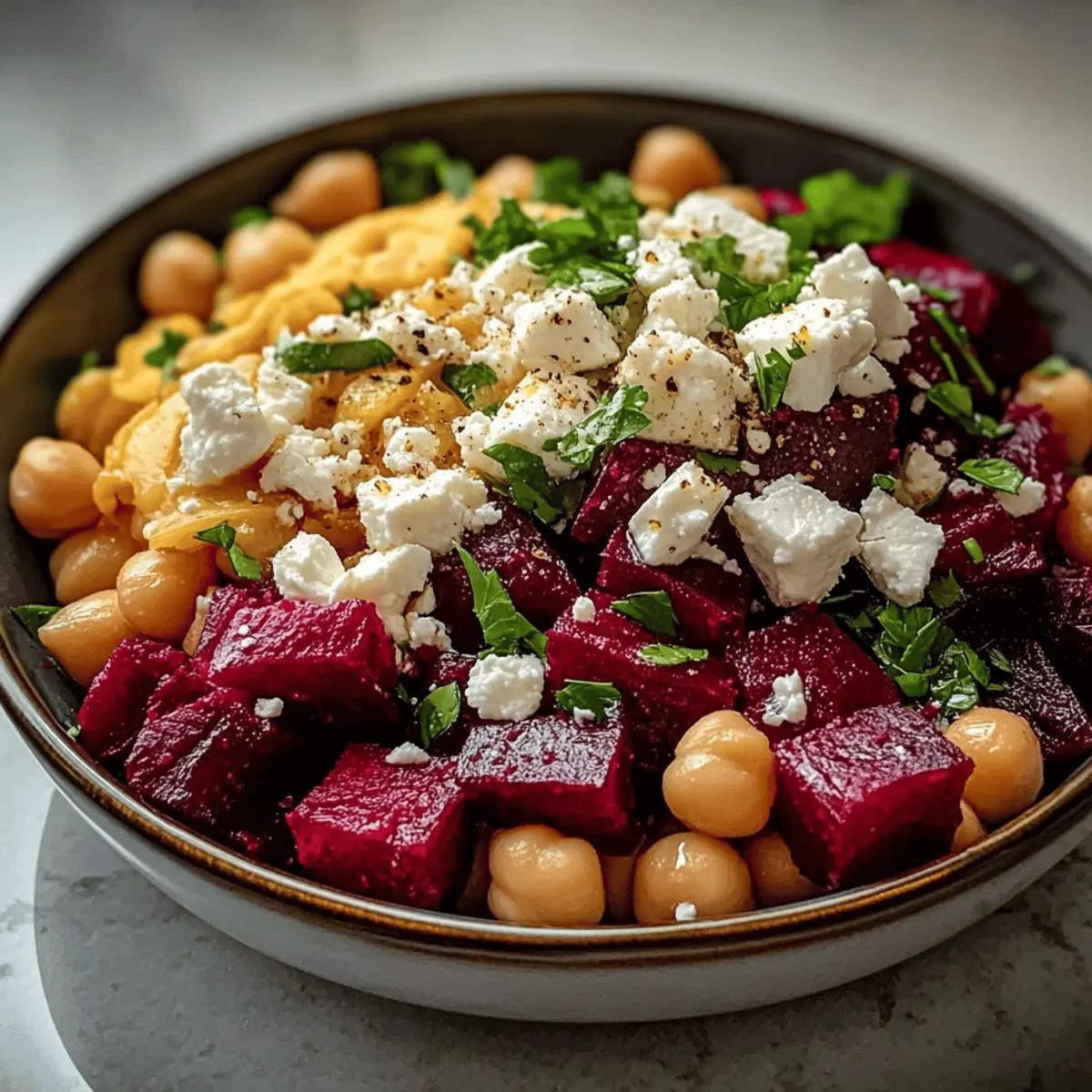 Dieser Kichererbsen-, Rüben- und Feta-Salat ist nicht nur ein Fest für die Augen, sondern verspricht auch, deine Ernährung zu bereichern!