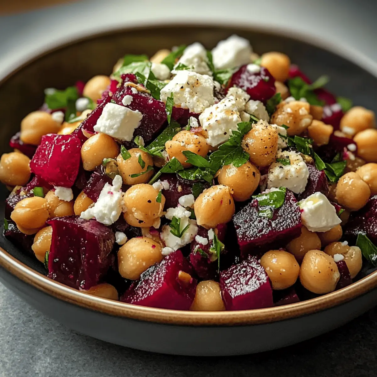 Ein köstlicher Kichererbsen-, Rüben- und Feta-Salat mit Zitronen-Knoblauch-Vinaigrette, ideal für eine gesunde Mahlzeit.