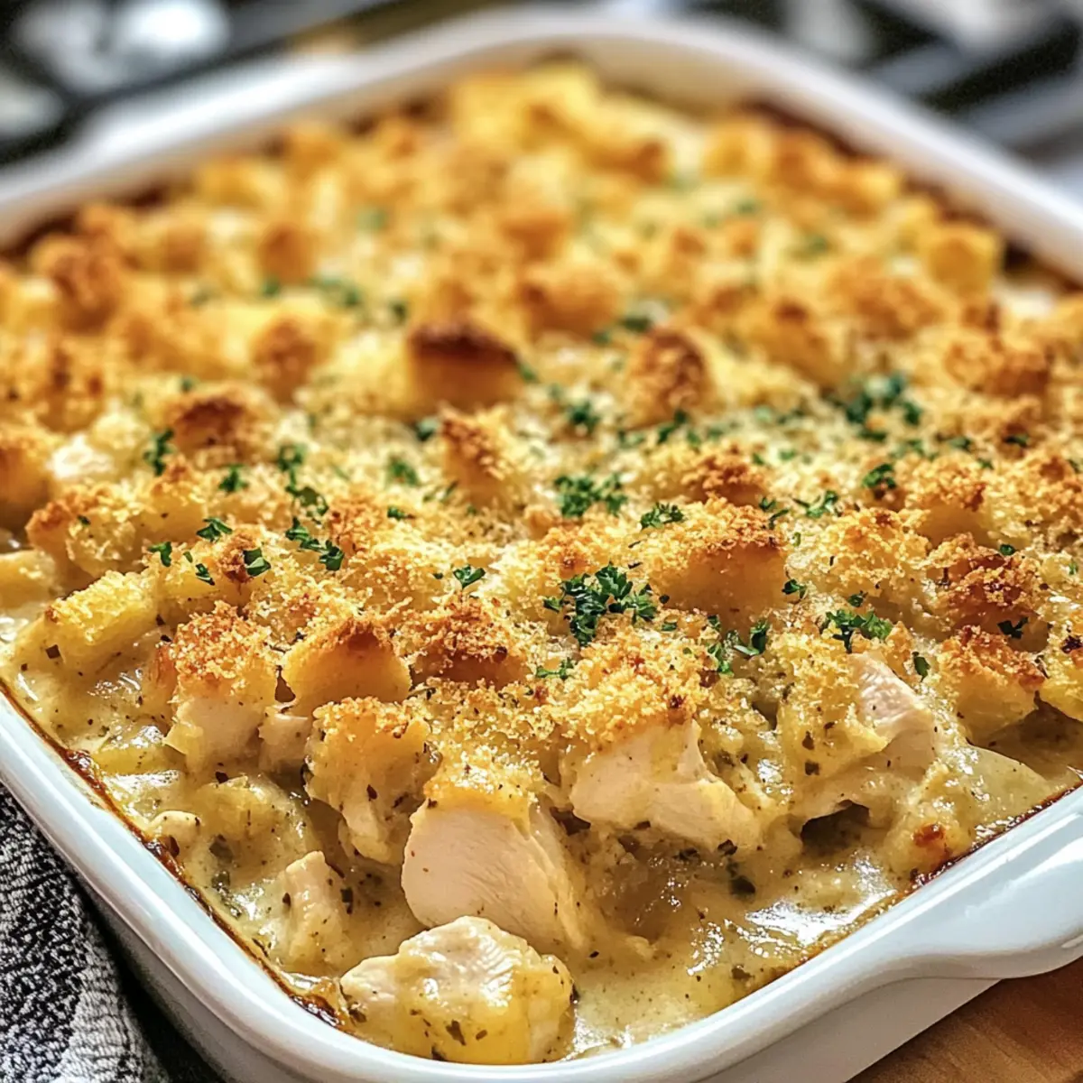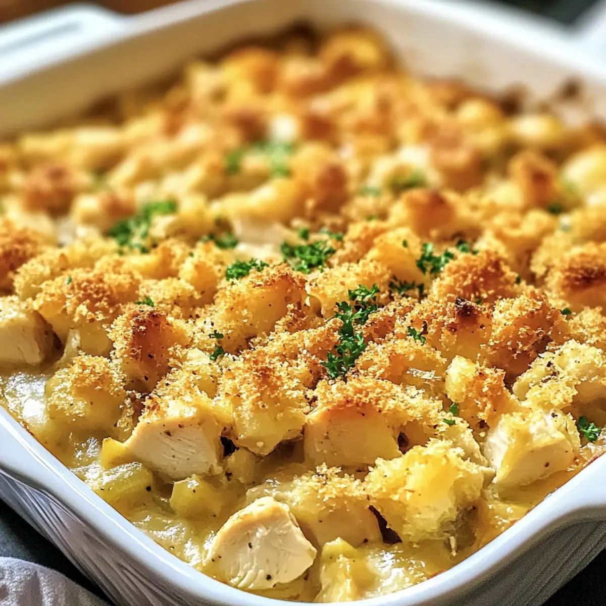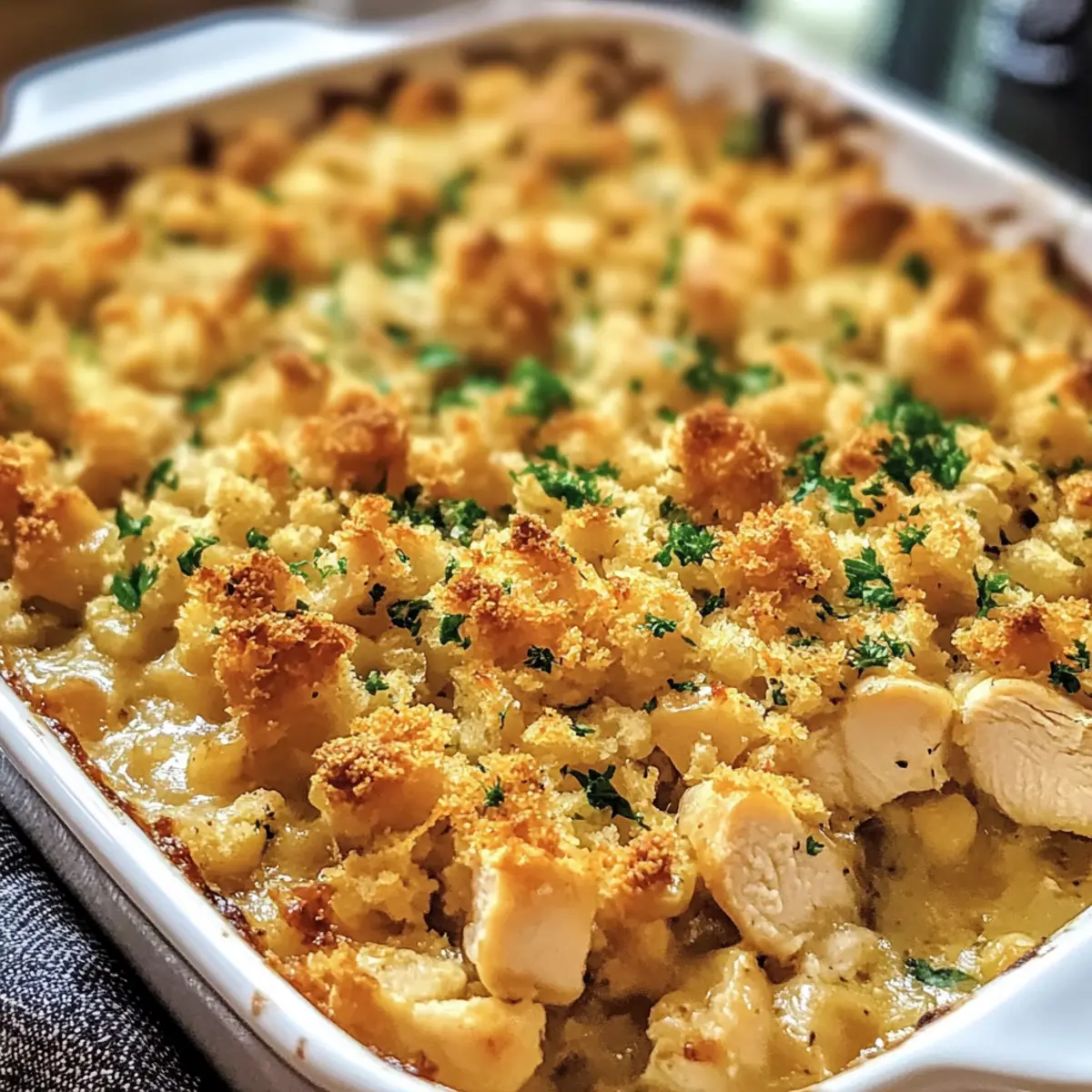 Während ich den Klassischen Hähnchen- und Stuffing-Auflauf zubereite, entfaltet sich ein köstlicher Duft in meiner Küche, der sofort Erinnerungen an warme Familienabende weckt. Mit seiner cremigen Füllung aus zartem Hähnchen und herzhafter Füllung ist dieses Gericht nicht nur im Handumdrehen in einer einzigen Pfanne zubereitet, sondern lässt sich auch perfekt einfrieren. So wird es zum idealen Begleiter für stressige Wochentage und sorgt dafür, dass du mit minimalem Aufwand ein Maximum an Geschmack und Gemütlichkeit genießen kannst. Hast du schon einmal darüber nachgedacht, wie viele kreative Variationen dieses Rezept bietet? Wie vielseitig kann dein Auflauf sein? Kreativität, dieses Rezept ermöglicht dir unzählige Variationen, sodass du immer etwas Neues entdecken kannst. Einfachheit, die Zubereitung ist so unkompliziert, dass auch Kochanfänger mit Leichtigkeit ein köstliches Ergebnis erzielen. Sättigung, der herzhaft-cremige Geschmack hält den Hunger lange in Schach und ist ideal für die ganze Familie. Zeitersparnis, da du alles in einer einzigen Pfanne zubereitest, bleibt mehr Zeit für dich und deine Lieben. Anpassungsfähigkeit, egal ob du Gemüse oder verschiedene Hähnchensorten hinzufügst, du kannst das Rezept nach deinem persönlichen Geschmack gestalten. Lass dich inspirieren und finde deine Lieblingsvariation! Klassischer Hähnchen- und Stuffing-Auflauf Zutaten • Entdecke die köstlichen Zutaten, die dieses Comfort Food zum Leben erwecken! Für das Hühnchen Hühnchenbrustfilets – Hauptproteinquelle; kann durch Hähnchenschenkel ersetzt werden für mehr Saftigkeit. Hühnerbrühe – Hält das Gericht saftig; kann durch Gemüsebrühe für eine leichtere Option ersetzt werden. Für die Soße Creme von Sellerie-Suppe – Basis für Cremigkeit und Geschmack; kann durch Creme von Champignons für einen anderen Geschmack ersetzt werden. Creme von Hühnersuppe – Sorgt für Feuchtigkeit und Geschmack; andere Cremesuppen können ebenfalls verwendet werden. Milch – Verdünnt die Soße für eine gleichmäßige Beschichtung; pflanzliche Alternativen wie Mandel- oder Hafermilch sind ebenfalls möglich. Knoblauchpulver – Verstärkt die Geschmacksfülle; frischer Knoblauch kann verwendet werden, je nach persönlichem Geschmack. Für das Füllmaterial Hähnchen-Füllungsmix – Sorgt für Textur und Fülligkeit; jede Art von Füllungsmix ist geeignet, besonders natriumarme Optionen. Salz – Verstärkt den Geschmack; keine Substitutionen, es sei denn, diätetische Einschränkungen fordern dies. Schwarzer Pfeffer – Fügt milde Schärfe hinzu; nach Vorliebe anpassen. Petersilie – Verleiht Frische als Garnitur; frische Kräuter wie Thymian können ebenfalls verwendet werden. Diese Zutaten bringen den Klassischen Hähnchen- und Stuffing-Auflauf zu einem neuen Level der Gemütlichkeit und machen ihn zum idealen Gericht für jede Gelegenheit! Schritt-für-Schritt-Anleitung für den Klassischen Hähnchen- und Stuffing-Auflauf Schritt 1: Ofen vorheizen Heize deinen Ofen auf 190°C vor und fette eine 9×13 Zoll große Auflaufform leicht ein. Dadurch stellt man sicher, dass der Klassische Hähnchen- und Stuffing-Auflauf später nicht anklebt und gleichmäßig gart. Diese Vorbereitungszeit ist wichtig, um einen optimalen Garprozess zu gewährleisten und das Aroma optimal zur Geltung zu bringen. Schritt 2: Hühnchen vorbereiten Schneide das Hühnchen in mundgerechte Stücke und würze es großzügig mit Salz und schwarzem Pfeffer direkt in der Auflaufform. Dies verleiht dem Fleisch mehr Geschmack und sorgt dafür, dass es beim Garen saftig bleibt. Verteile die Hähnchenstücke gleichmäßig, damit sie gleichmäßig durchgaren und eine köstliche Basis für deinen Auflauf bilden. Schritt 3: Soße zubereiten In einer separaten Schüssel vermische die Creme von Sellerie-Suppe, die Creme von Hühnersuppe, die Milch und das Knoblauchpulver zu einer glatten Masse. Diese cremige Mischung wird über das Hühnchen geschüttet und sorgt für die köstliche, würzige Grundlage des Klassischen Hähnchen- und Stuffing-Auflaufs. Achte darauf, dass alles gut vermischt ist, um die Aromen gleichmäßig zu verteilen. Schritt 4: Füllung hinzufügen Streue den Hähnchen-Füllungsmix gleichmäßig über die Soße, sodass die gesamte Oberfläche abgedeckt ist. Diese Füllung wird beim Backen knusprig und sorgt für eine schöne Textur. Die Aromen fusionieren beim Garen, also achte darauf, dass keine Stellen unbedeckt bleiben, damit jeder Bissen köstlich schmeckt. Schritt 5: Brühe eingießen Gieße die Hühnerbrühe vorsichtig über die Füllung, sodass sie gleichmäßig befeuchtet wird. Dies hilft, den Klassischen Hähnchen- und Stuffing-Auflauf feucht zu halten und verhindert, dass er austrocknet. Es ist wichtig, dass die Füllung gut durchtränkt ist, damit die Aromen wunderbar ziehen und alles beim Backen saftig bleibt. Schritt 6: Backen Decke die Auflaufform mit Alufolie ab und backe den Auflauf 40-45 Minuten lang im vorgeheizten Ofen. Der Auflauf sollte schön blubbern, und das Hühnchen sollte eine Kerntemperatur von 74°C erreicht haben. Diese Zeit sorgt dafür, dass das Hühnchen gar und zart wird, und das Aroma sich entfalten kann. Schritt 7: Knusprige Oberseite Nimm die Alufolie ab und backe den Auflauf weitere 5 Minuten, bis die Oberseite goldbraun und knusprig ist. Diese letzte Phase verleiht dem Gericht eine köstliche Textur und rundet den Klassischen Hähnchen- und Stuffing-Auflauf perfekt ab. Überwache den Auflauf während dieser Zeit, um sicherzustellen, dass er nicht verbrennt. Schritt 8: Servieren Lass den Auflauf 2-3 Minuten ruhen, bevor du ihn servierst. Dadurch können sich die Aromen setzen, und die Füllung bleibt beim Schneiden zusammen. Du kannst den Auflauf optional mit frischer Petersilie garnieren, um ihm einen frischen Akzent zu verleihen. Genieße diesen herzhaften Klassiker mit deiner Familie oder Freunden! Was passt gut zum Klassischen Hähnchen- und Stu