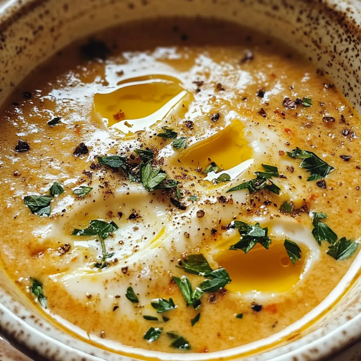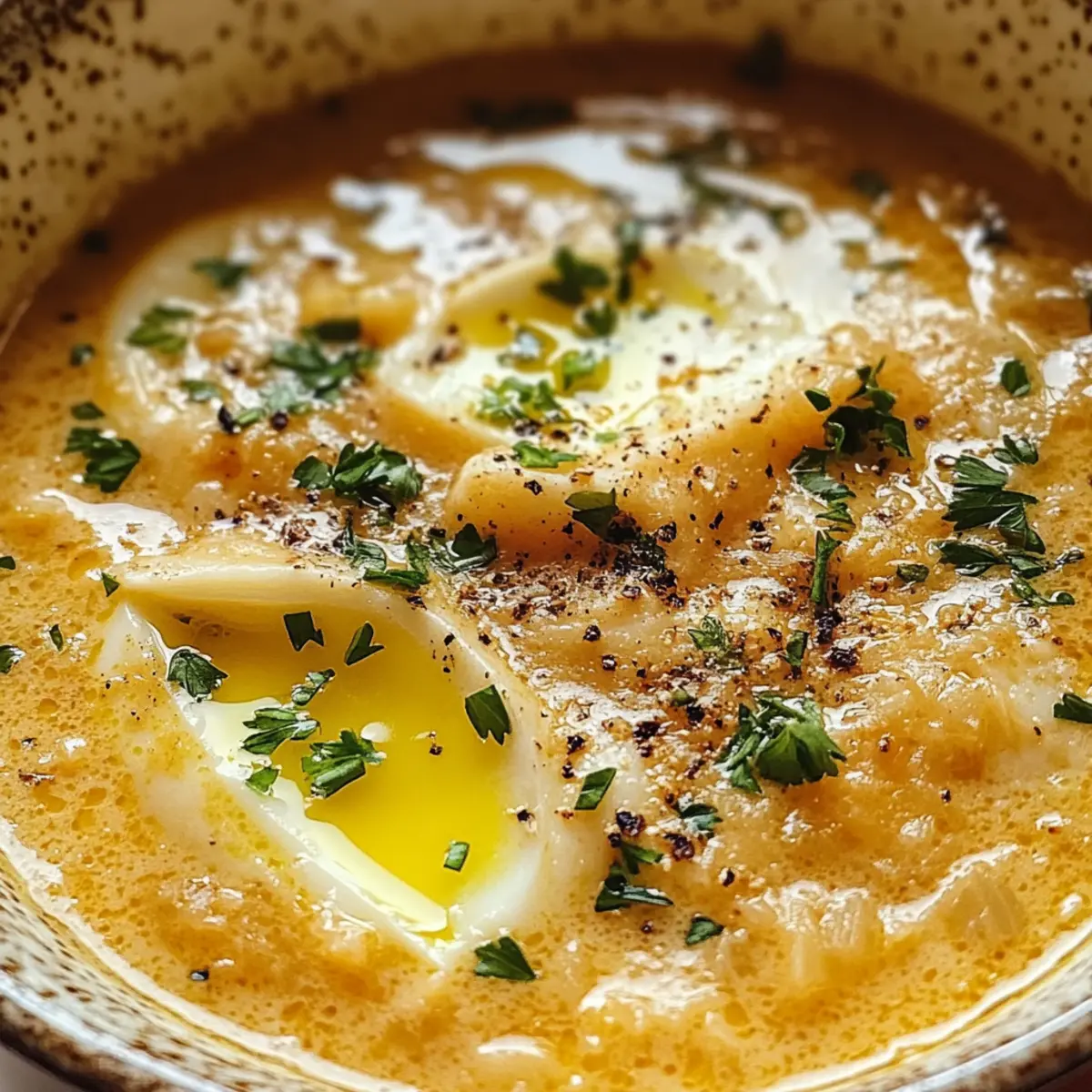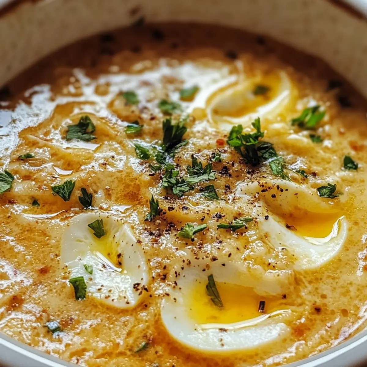Ich kann das Aroma von frisch angebratetem Knoblauch förmlich riechen, während ich mich in die Küche begebe. Diese simple, aber köstliche Knoblauchsuppe ist nicht nur eine wahre Umarmung für die Seele, sondern auch der perfekte Begleiter an einem kalten Abend. In nur wenigen Minuten zubereitet, vereint sie die herzhaften Aromen von Knoblauch, cremigen Eierschichten und knusprigem Brot, was sie zu einem zeitlosen Komfortessen macht. Was mir besonders gefällt, ist die Möglichkeit, sie glutenfrei zuzubereiten, indem ich einfach Gemüsebrühe verwende. So kann sich jeder, der müde von der alltäglichen Fastfood-Routine ist, in einen warmen Genuss zurückziehen. Bereit, den Kochlöffel zu schwingen und diese köstliche Suppe nachzukochen? Warum ist Knoblauchsuppe so beliebt? Einfachheit: Diese Knoblauchsuppe erfordert nur grundlegende Kochfähigkeiten und ist im Handumdrehen zubereitet. Wohltuender Geschmack: Der intensive Knoblauchgeschmack kombiniert mit der samtigen Konsistenz der Eierschichten schafft ein einzigartiges Geschmackserlebnis, das Komfort pur bietet. Vielseitigkeit: Sie ist nicht nur glutenfrei, sondern lässt sich auch nach Lust und Laune mit frischem Gemüse oder verschiedenen Brotsorten anpassen. Perfekte Portionsgröße: Mit nur wenigen Zutaten lässt sich die Suppe ganz einfach für eine kleine Runde oder eine größere Gesellschaft anpassen. Gesundheitlich wertvoll: Ideal für eine nahrhafte Mahlzeit, die den Körper wärmt und gleichzeitig vielseitig in der Zubereitung ist. Servieren Sie sie doch mit einem frischen Salat oder knusprigem Brot für das perfekte Abendessen. Knoblauchsuppe Zutaten • Hinweis: Diese Liste der Knoblauchsuppe Zutaten ist einfach und enthält alles, was Sie brauchen, um dieses wohltuende Gericht zuzubereiten. Für die Brühe Olivenöl – Basis für das Anbraten, kann durch Pflanzenöl oder Butter ersetzt werden. Hühnerbrühe oder Gemüsebrühe – Flüssigkeitsbasis der Suppe; wählen Sie Gemüsebrühe für eine glutenfreie Variante. Für die Suppe Knoblauch (8-10 Zehen) – Hauptgeschmacksträger; gerösteter Knoblauch mildert den Geschmack. Altes Brot (4 Unzen) – Fügt Textur und Dicke hinzu; frisches Brot kann geröstet werden, um die Qualität zu verbessern. Räucherpaprika (1 Esslöffel) – Verleiht der Suppe ein rauchiges Aroma; normale Paprika ist ebenfalls geeignet. Eier (4 große, verquirlt) – Schaffen weiche Eierschichten in der Suppe, die eine cremige Konsistenz bieten. Salz – Zum Würzen nach Geschmack. Schwarzer Pfeffer – Zum Würzen nach Geschmack. Schritt-für-Schritt-Anleitung für Knoblauchsuppe Step 1: Anbraten In einem großen Topf 2 Esslöffel Olivenöl bei mittlerer Hitze erhitzen. Fügen Sie 8-10 geschälte Knoblauchzehen hinzu und sautieren Sie diese 2-3 Minuten lang, bis sie leicht goldbraun und aromatisch sind. Achten Sie darauf, dass der Knoblauch nicht verbrennt, um den feinen Geschmack der Knoblauchsuppe zu bewahren. Step 2: Brot hinzufügen Jetzt 1 Esslöffel geräucherte Paprika und 4 Unzen gewürfeltes, altes Brot in den Topf geben. Braten Sie das Brot 3 Minuten lang an, bis es goldbraun und knusprig ist. Lassen Sie die Aromen der Paprika und des gerösteten Brotes in der Suppe verschmelzen, was ihr eine zusätzliche Tiefe verleiht. Step 3: Brühe zugeben Gießen Sie 6-7 Tassen Hühnerbrühe oder Gemüsebrühe in den Topf und zerdrücken Sie das Brot dabei leicht. Bringen Sie die Mischung zum Simmern und lassen Sie sie 10 Minuten lang leicht köcheln. Dieser Schritt sorgt dafür, dass die Suppe die Aromen aufnimmt und das Brot weich wird, wodurch die Grundlage für die cremige Konsistenz der Knoblauchsuppe geschaffen wird. Step 4: Eier einrühren Rühren Sie die Suppe in kreisenden Bewegungen, während Sie langsam 4 verquirlte Eier einfließen lassen. Lassen Sie die Suppe 1-2 Minuten weiter köcheln, bis die Eier gar sind und zarte Eierschichten bilden. Diese Eierschichten verleihen der Knoblauchsuppe eine reichhaltige, cremige Textur. Step 5: Würzen Schmecken Sie die Suppe mit Salz und frisch gemahlenem schwarzem Pfeffer ab. Probieren Sie die Knoblauchsuppe und passen Sie die Gewürze nach Ihrem persönlichen Geschmack an. Wenn die Suppe zu dick ist, können Sie auch noch etwas Brühe hinzufügen, um die gewünschte Konsistenz zu erreichen. Step 6: Servieren Füllen Sie die heiße Knoblauchsuppe in Schalen und garnieren Sie sie nach Wunsch mit einem Spritzer Olivenöl oder frischer Petersilie. Servieren Sie die Suppe sofort, um das vollmundige Aroma und die cremige Textur zu genießen. Diese Knoblauchsuppe ist das perfekte Gericht, um sich an kalten Tagen zu wärmen. Expert Tips für die perfekte Knoblauchsuppe Frischer Knoblauch: Verwenden Sie frische Knoblauchzehen, um den besten Geschmack und das intensivste Aroma für Ihre Knoblauchsuppe zu erzielen. Richtiges Anbraten: Achten Sie darauf, den Knoblauch nicht zu verbrennen, da dies einen bitteren Geschmack hinterlassen kann. Sautieren Sie ihn nur, bis er goldbraun ist. Brotvorbereitung: Rösten Sie die Brotwürfel leicht, bevor Sie sie zur Suppe geben. Das hilft, die Matschigkeit zu vermeiden und sorgt für eine schöne Textur. Eier langsam einrühren: Fügen Sie die verquirlten Eier langsam hinzu und rühren Sie in kreisenden Bewegungen, um zarte Eierschichten zu erzeugen, die in der Knoblauchsuppe angenehm schmelzen. Anpassen der Brühe: Passen Sie die Brühe an, um die gewünschte Konsistenz zu erreichen. Wenn die Suppe zu dick ist, fügen Sie einfach mehr Brühe hinzu, um sie aufzulockern. Was passt zur Knoblauchsuppe? Genießen Sie eine harmonische Kombination von Geschmäckern und Texturen, die dieses herzliche Gericht wunderbar ergänzt. Knuspriges Brot: Servieren Sie die Suppe mit knusprigen Brotscheiben, um einen leckeren Kontrast zur cremigen Konsistenz zu schaffen. Ideal zum Dippen und Aufnehmen der Aromen! Frischer Salat: Ein leichter, knackiger Salat mit Zitronen-Dressing bringt Frische auf den Tisch und ergänzt die herzhafte
