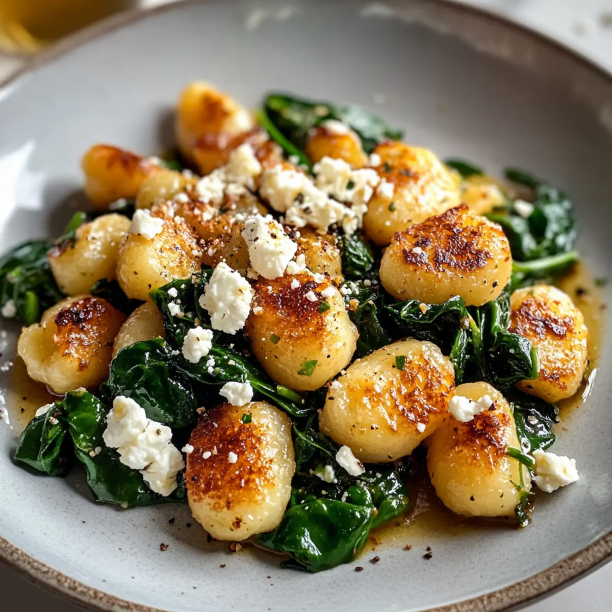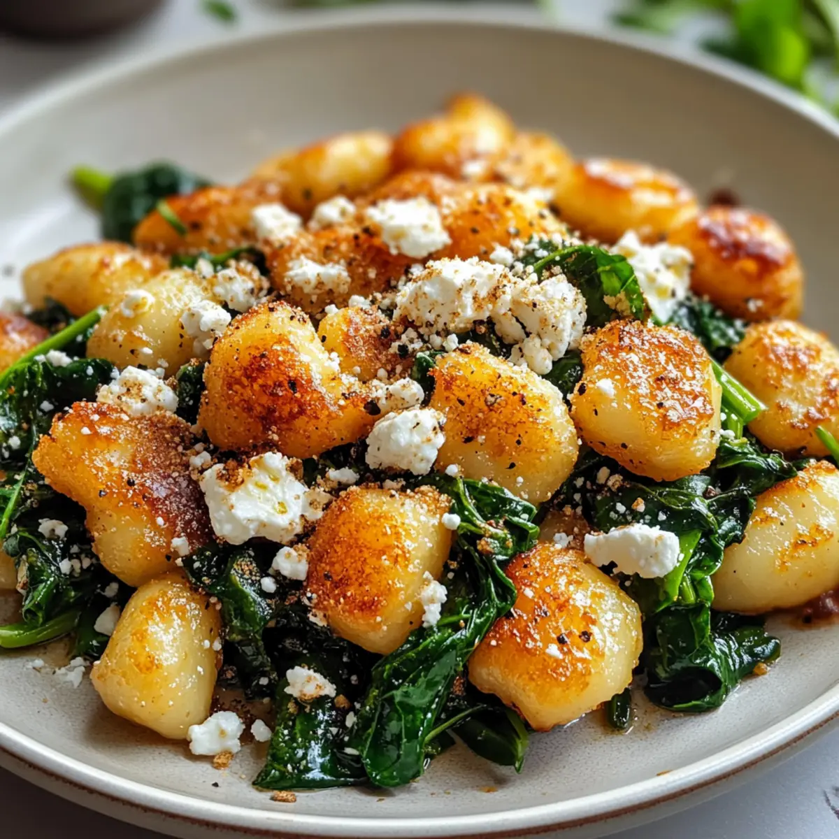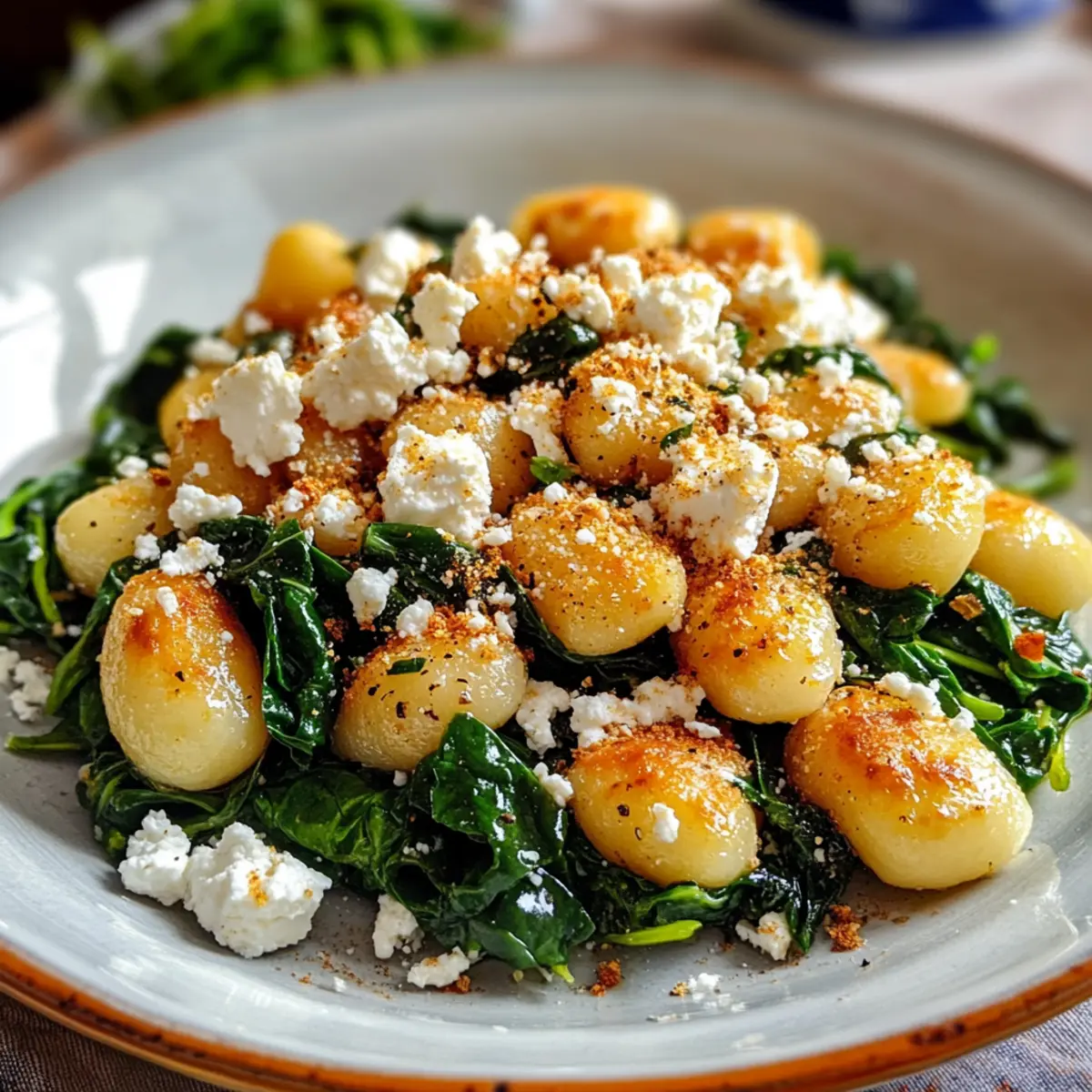 Die Küche erfüllt sich mit dem verlockenden Duft von Knoblauch und frischem Gemüse, während ich darüber nachdenke, was ich heute zaubern möchte. Wie wäre es mit knusprigen Gnocchi mit Spinat und Feta? Dieses Rezept ist nicht nur schnell zubereitet, sondern auch der perfekte Begleiter für entspannte Abende oder gesellige Treffen mit Freunden. Die Kombination von goldbraun gebratenen Gnocchi, leuchtendem Spinat und dem würzigen Geschmack von Feta verführt selbst die größten Fast-Food-Fans. Und das Beste daran: Es bietet unzählige Variationsmöglichkeiten, sodass du je nach Saison mit Kürbis, Spargel oder sogar Erbsen experimentieren kannst. Bist du bereit, deine Küche in einen Ort der herzlichen Genüsse zu verwandeln? Warum wirst du dieses Rezept lieben? Einfachheit: Die Zubereitung könnte einfacher nicht sein! Mit minimalem Aufwand zauberst du im Handumdrehen ein köstliches Gericht. Vielfältigkeit: Ob mit Kürbis im Herbst oder frischem Spargel im Frühling – die Variationen kennen keine Grenzen. Zufriedenheit: Die Kombination aus knusprigen Gnocchi und zartem Spinat sorgt für ein Geschmackserlebnis, das jeden begeistert. Gesundheitsbewusst: Als vegetarisches Gericht ist es nicht nur köstlich, sondern auch eine gesunde Wahl, die nährstoffreiche Inhaltsstoffe enthält. Schnelligkeit: Ideal für stressige Wochentage, da es in weniger als 30 Minuten zubereitet ist. Perfekt für jede Gelegenheit: Ob als Hauptgericht oder Beilage – diese knusprigen Gnocchi passen zu jedem Anlass! Willst du noch mehr mit frischen Zutaten experimentieren? Schau dir unsere Variationen an, um dir einen ganz neuen Twist auf dein Lieblingsrezept zu geben! Zutaten für knusprige Gnocchi mit Spinat und Feta Für die Gnocchi • Gnocchi – Wähle frische oder gefrorene Gnocchi für eine perfekte, zarte Textur. • Olivenöl – Ideal für das Braten, um eine knusprige Oberfläche zu erzielen; Butter kann für zusätzlichen Geschmack verwendet werden. Für das Gemüse • Frischer Spinat – Bringt nicht nur Farbe, sondern auch viele Nährstoffe; ersetze ihn durch Grünkohl oder Mangold für Abwechslung. • Knoblauch – Frisch gehackt sorgt für ein köstliches Aroma; bei Bedarf kann auch Knoblauchpulver verwendet werden. Für den Geschmack • Feta-Käse – Krümelig für eine cremige, salzige Note; probiere Ziegenkäse oder eine vegane Alternative für einen neuen Geschmack. • Salz und schwarzer Pfeffer – Nach Geschmack hinzufügen, um das Gericht perfekt zu würzen. • Rote Paprikaflocken – Optional für eine pikante Note; lasse sie weg oder ersetze sie durch frische Chilis, wenn es weniger scharf sein soll. Genieße die Zubereitung dieser knusprigen Gnocchi mit Spinat und Feta und entdecke die Vielfalt, die sich dir bietet! Schritt-für-Schritt-Anleitung für knusprige Gnocchi mit Spinat und Feta Step 1: Gnocchi kochen Bring einen großen Topf mit gesalzenem Wasser zum Kochen. Füge die Gnocchi hinzu und koche sie, bis sie an die Oberfläche steigen, was etwa 2–3 Minuten dauert. Verwende eine Schaumkelle, um die Gnocchi vorsichtig herauszunehmen und abtropfen zu lassen. So erhalten die knusprigen Gnocchi mit Spinat und Feta eine wunderbare Textur. Step 2: Öl erhitzen Erhitze in einer großen Pfanne bei mittlerer bis hoher Temperatur etwas Olivenöl, bis es schimmert. Achte darauf, die Pfanne gut vorzuwärmen, um sicherzustellen, dass die Gnocchi knusprig werden. Dies ist der erste Schritt, um die perfekte Grundlage für dein Gericht aus knusprigen Gnocchi mit Spinat und Feta zu schaffen. Step 3: Gnocchi braten Gib die abgetropften Gnocchi in die heiße Pfanne und brate sie, ohne sie zu rühren, bis sie goldbraun sind, etwa 2–3 Minuten. Wende die Gnocchi vorsichtig mit einem Spatel, um eine gleichmäßige Bräunung zu erzielen, und brate sie für weitere 2–3 Minuten. So entsteht ein köstlicher, knuspriger Außenrand. Step 4: Knoblauch hinzufügen Senk die Hitze leicht und fügen den gehackten Knoblauch zu den Gnocchi hinzu. Sauté den Knoblauch unter ständigem Rühren, bis er duftet und goldbraun ist, was zirka 1 Minute dauert. Dies gibt deinem Gericht mit knusprigen Gnocchi mit Spinat und Feta eine aromatische Tiefe. Step 5: Spinat einarbeiten Füge den frischen Spinat in die Pfanne hinzu und koche ihn, bis er zusammenfällt, etwa 2–3 Minuten. Rühre, bis der Spinat gleichmäßig verteilt ist und seine leuchtende Farbe behält. Diese frische Note hebt das Gericht angenehm hervor und bringt eine gesunde Komponente in die knusprigen Gnocchi mit Spinat und Feta. Step 6: Würzen Streue etwas Salz, frisch gemahlenen schwarzen Pfeffer und optional rote Paprikaflocken über die Mischung in der Pfanne. Mische alles gut, damit die Gewürze gleichmäßig verteilt sind. Diese würzige Note hebt den Geschmack der knusprigen Gnocchi mit Spinat und Feta auf ein neues Level. Step 7: Mit Feta vollenden Streue den zerbröckelten Feta kurz vor dem Servieren über die Gnocchi und rühre vorsichtig um, damit der Feta mit den warmen Zutaten verwoben wird. Lass es eine Minute ruhen, damit der Feta schmilzt und eine cremige Konsistenz erhält. Jetzt sind deine knusprigen Gnocchi mit Spinat und Feta bereit, serviert zu werden! Variationen und Alternativen Gestalte deine knusprigen Gnocchi mit Spinat und Feta noch individueller und finde deinen persönlichen Lieblingsgeschmack! Kürbis: Füge im Herbst gerösteten Kürbis hinzu für eine süße, herbstliche Note. Das sorgt für eine warme, cremige Konsistenz. Grünkohl: Tausche den Spinat gegen frischen Grünkohl aus und füge eine Prise Muskatnuss hinzu. Dies verleiht dem Gericht ein herzhaftes Aroma. Erbsen: Im Frühling, ergänze frische Erbsen für einen leichten, süßlichen Geschmack. Das hebt die Farbe und die Frische deiner Gnocchi hervor. Spargel: Verwende in den Sommermonaten zarte Spargelstückchen. Für extra Crunch solltest du sie kurz blanchieren, bevor du sie hinzufügst. Käsevariation: Ersetze Feta durch Ziegenkäse oder eine 