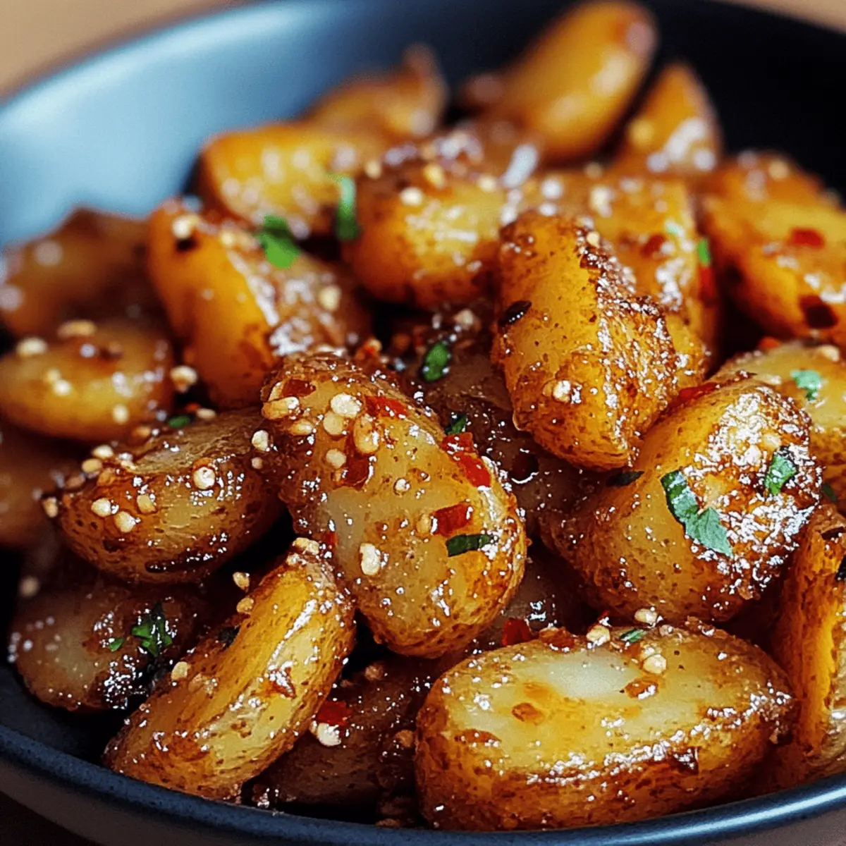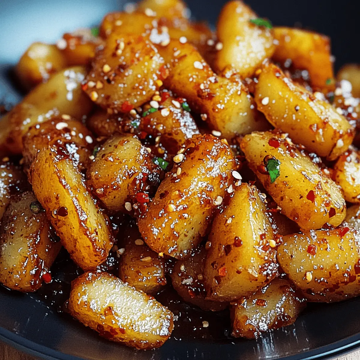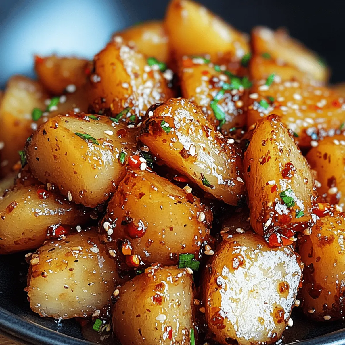Es war ein jener Abend, an dem ich nach einem langen Tag sehnsüchtig auf etwas Knuspriges und zugleich Süßes wartete. Als ich die Idee für Knusprige Honig-Chili-Kartoffeln hatte, war mir sofort klar: Das wird ein Hit! Diese Kartoffeln sind außen herrlich knusprig und innen schön zart, verfeinert mit einer unwiderstehlichen Mischung aus Honig und Chili. Ein raffiniertes Zusammenspiel von Süße und Schärfe, das nicht nur meine Gaumenfreuden weckt, sondern auch als perfekter Snack oder Beilage fungiert. Und das Beste? Die Zubereitung dieser Köstlichkeit ist kinderleicht und super schnell – ideal für jeden, der von Fast Food genug hat. Denkt ihr nicht auch, dass sich die ersten Bissen in geselligem Kreis einfach besser anfühlen? Warum sind Knusprige Honig-Chili-Kartoffeln ein Hit? Unwiderstehliche Kombination: Die perfekte Symbiose aus süß und scharf macht dieses Gericht zum idealen Snack oder zur Beilage. Einfach zuzubereiten: Selbst Küchenneulinge können hier punkten – dieser Genuss ist schnell gezaubert! Vielseitig einsetzbar: Ob zu einem Grillabend oder als Tapas, diese Kartoffeln passen einfach immer. Beeindruckende Optik: Das goldene, knusprige Finish zieht alle Blicke auf sich und sorgt für Gespräche am Tisch. Zum krönenden Abschluss passt dazu ein erfrischender Dip oder ein knackiger Salat wie unser Knuspriger Caesar Salat. Knusprige Honig-Chili-Kartoffeln Zutaten Für die Kartoffeln Kartoffeln – Sorgt für die perfekte Basis; wähle eine stärkehaltige Sorte wie Yukon Gold für die beste Knusprigkeit. Olivenöl – Hilft, eine goldene, knusprige Textur beim Rösten zu erreichen; kann bei Bedarf durch Pflanzenöl ersetzt werden. Salz – Wichtig für die Geschmacksverstärkung; verwende Meersalz oder koscheres Salz für eine gute Textur. Für die Marinade Honig – Fügt die süße Note hinzu, die die Schärfe des Chilis balanciert; Agavendicksaft ist eine köstliche vegane Alternative. Chili (Pulver oder Flocken) – Sorgt für die gewünschte Schärfe und Tiefe im Geschmack; passe die Menge deinem persönlichen Schärfeempfinden an. Die Knusprigen Honig-Chili-Kartoffeln sind mit ihren süßen und scharfen Aromen einfach unwiderstehlich! Schritt-für-Schritt-Anleitung für Knusprige Honig-Chili-Kartoffeln Schritt 1: Kartoffeln vorbereiten Wasche die Kartoffeln gründlich und schäle sie nach Belieben. Schneide die Kartoffeln in gleichmäßige, bite-sized Stücke, damit sie gleichmäßig garen. Lege die geschnittenen Kartoffeln in eine große Schüssel und stelle sicher, dass du genügend Platz hast, um später die Marinade gut zu vermischen. Schritt 2: Marinade anrühren In einer separaten Schüssel mische den Honig, das Chili-Pulver oder die Flakes und das Olivenöl. Rühre die Mischung gut um, bis sich alle Zutaten komplett miteinander verbunden haben. Die Marinade sollte eine homogene und leicht zähflüssige Konsistenz aufweisen, die bald den Kartoffeln einen köstlichen Geschmack verleiht. Schritt 3: Kartoffeln marinieren Gib die vorbereiteten Kartoffelstücke in die Schüssel mit der Marinade. Verwende einen Kochlöffel oder deine Hände, um die Kartoffeln gründlich mit der süß-scharfen Mischung zu bedecken. Achte darauf, dass jede Kartoffel gleichmäßig beschichtet ist, damit der Geschmack der Knusprigen Honig-Chili-Kartoffeln überall intensiv ist. Schritt 4: Rösten der Kartoffeln Heize deinen Ofen auf 200 °C vor. Verteile die marinierten Kartoffeln gleichmäßig auf einem mit Backpapier ausgelegten Backblech. Stelle sicher, dass die Kartoffeln nicht übereinanderliegen, damit sie schön knusprig werden. Röste die Kartoffeln für 30-35 Minuten im Ofen, bis sie goldbraun und knusprig sind; schüttle das Blech nach der Hälfte der Zeit vorsichtig, um ein gleichmäßiges Garen zu gewährleisten. Schritt 5: Servieren der Kartoffeln Nimm die Knusprigen Honig-Chili-Kartoffeln aus dem Ofen und lasse sie für ein paar Minuten abkühlen, bevor du sie servierst. Diese leckeren Kartoffeln sind perfekt, um sie warm und frisch anzubieten, vielleicht begleitet von einem erfrischenden Dip oder einem knackigen Salat für den perfekten Genuss! Zeit sparen mit Knusprigen Honig-Chili-Kartoffeln Die Knusprigen Honig-Chili-Kartoffeln sind ideal für die Vorbereitung im Voraus! Du kannst die Kartoffeln bis zu 24 Stunden vorher waschen, schälen und in Stücke schneiden; das hilft, Zeit am Kochabend zu sparen. Zudem kannst du die Marinade aus Honig, Chili und Olivenöl ebenfalls bis zu 3 Tage im Voraus zubereiten und im Kühlschrank aufbewahren – dies intensiviert die Aromen. Wenn du bereit bist zu servieren, mische einfach die marinierten Kartoffeln und röste sie etwa 30-35 Minuten in einem vorgeheizten Ofen bei 200 °C. Achte darauf, die Kartoffeln gleichmäßig zu verteilen, um sicherzustellen, dass sie gleichmäßig knusprig und köstlich bleiben! Was passt zu Knusprigen Honig-Chili-Kartoffeln? Die perfekte Kombination von süß und scharf verlangt nach der idealen Ergänzung für ein rundum gelungenes Gericht. Cremiger Dip: Ein Joghurt-Dip mit frischen Kräutern harmoniert wunderbar mit der Schärfe der Kartoffeln und sorgt für eine erfrischende Note. Knackiger Salat: Serviere einen knackigen Caesar-Salat als Beilage. Die frischen Aromen und der knusprige Crouton-Kick ergänzen die Kartoffeln perfekt. Gegrilltes Gemüse: Bunter, gegrillter Gemüse-Mix (Zucchini, Paprika) bietet einen satten Kontrast und erfrischende Aromen zu den erstklassigen Kartoffeln. Limonenwasser: Ein spritziges Limonenwasser ist der ideale Durstlöscher, der die süß-scharfen Geschmäcker der Knusprigen Honig-Chili-Kartoffeln ausbalanciert. Schokoladen-Mousse: Als süßer Abschluss sind kleine Portionen Schokoladen-Mousse ein himmlischer Genuss, der den süßen Aspekt der Kartoffeln wunderbar ergänzt. Knusprige Honig-Chili-Kartoffeln: Variationen und substitutionsmöglichkeiten Lass deiner Kreativität freien Lauf und passe die Knusprigen Honig-Chili-Kartoffeln nach deinem Geschmack