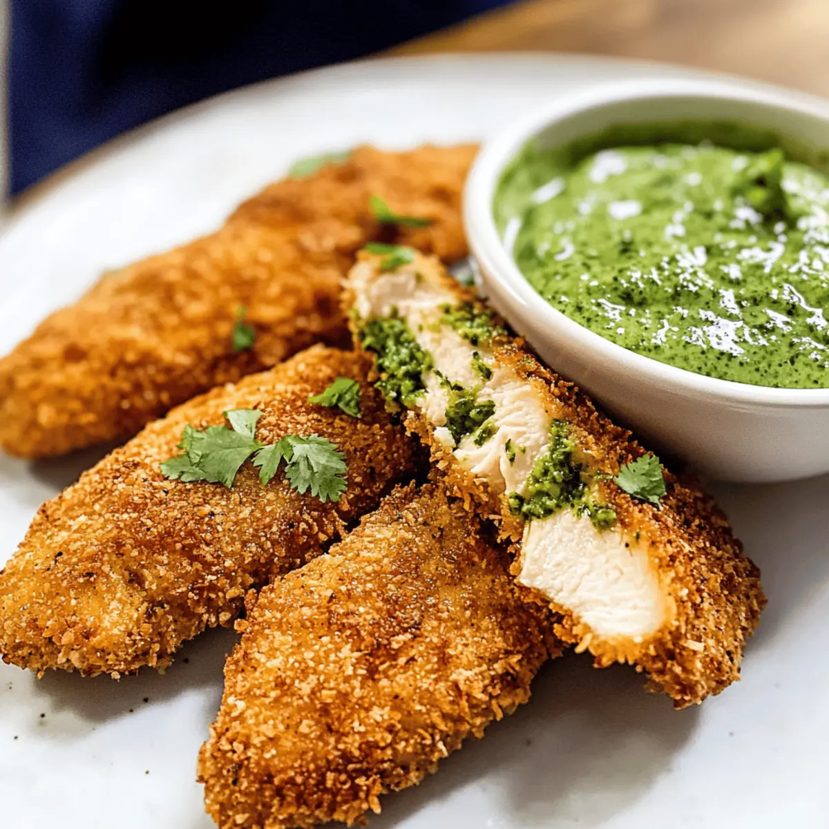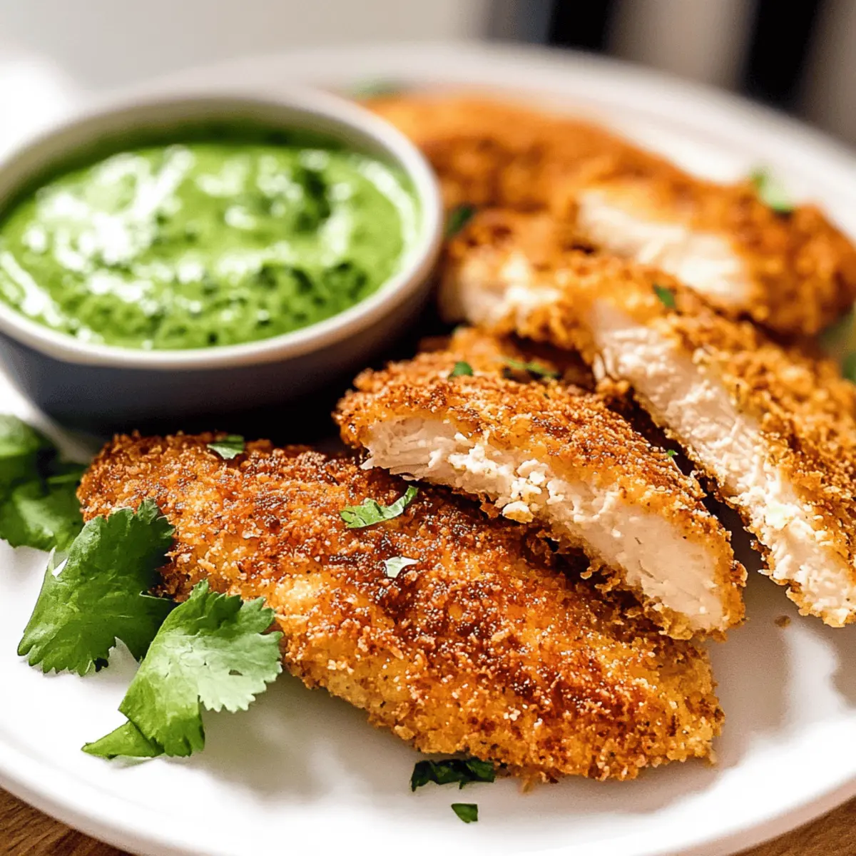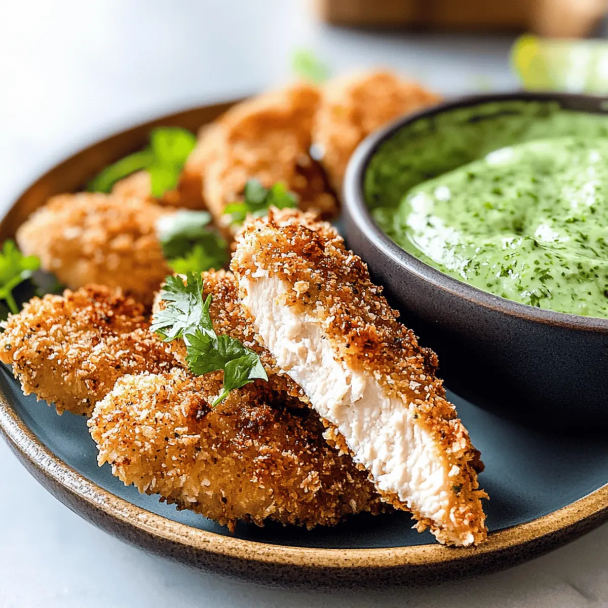 „Hast du schon mal von einem Gericht geträumt, das deinen Geschmackssinn auf eine tropische Reise mitnimmt?“ Heute lade ich dich ein, meine knusprigen Kokosnuss-Hühnchenstreifen zu entdecken – eine aufregende Mischung aus zarten Hühnchenstücken und einer goldbraunen, knusprigen Kokos-Panko-Kruste. Perfekt für ein schnelles Abendessen unter der Woche, lassen sie sich im Handumdrehen zubereiten und sind der Hit bei Groß und Klein. Und das Beste daran? Sie sind nicht nur familienfreundlich, sondern auch frei von Milchprodukten! Suchst du nach einer leckeren Abwechslung von der alltäglichen Fast-Food-Palette? Lass uns gemeinsam diesen köstlichen Genuss auf den Tisch bringen! Warum solltest du dieses Rezept lieben? Einzigartig, diese knusprigen Kokosnuss-Hühnchenstreifen vereinen tropische Aromen mit einem klassischen Favoriten, der sicher alle beeindrucken wird. Einfach zuzubereiten, die Schritte sind unkompliziert und benötigen minimalen Aufwand – perfekt für hektische Wochenabende. Vielseitig, serviere sie mit verschiedenen Dips oder als Teil einer bunten Salatplatte. Köstlicher Geschmack, die Kombination aus zartem Hühnchen und knuspriger Kruste wird deine Geschmacksknospen begeistern. Und wenn du nach weiteren fantastischen Rezepten suchst, warum probierst du nicht auch die Krosse Zaehe Kokosnussplaetzchen oder die Krosse Luftfritteuse Kartoffelscheiben? Knusprige Kokosnuss-Hühnchenstreifen Zutaten • Diese Zutaten sind perfekt für die Zubereitung von knusprigen Kokosnuss-Hühnchenstreifen! Für das Hühnchen Hühnchenbrust – Verwende am besten entbeinte, hautlose Stücke für einfaches Kochen. Kokosmehl – Bietet eine glutenfreie Panade und fügt Kokosgeschmack hinzu; andere Mehle könnten den Geschmack verändern. Panko-Brotkrumen – Sorgt für eine luftige und knusprige Kruste; du kannst auch normale Semmelbrösel verwenden, wenn du eine dichtere Textur bevorzugst. Ungesüßte Kokosraspeln – Verleiht den Hühnchenstreifen ein köstliches Kokosaroma ohne übermäßige Süße. Meide gesüßte Kokosraspeln, da diese das Gericht zu süß machen könnten. Kokosöl – Ideal zum Braten, verstärkt den Kokosgeschmack; kannst auch Pflanzenöl als Alternative verwenden. Für die Cashew-Crema Cashewkerne – Die Basis für eine cremige und nussige Sauce; sie sollten vorher eingeweicht werden für eine bessere Konsistenz. Limettensaft – Fügt eine erfrischende Säure hinzu, die perfekt zu den Hühnchenstreifen passt. Koriander – Bringt frische Aromen und einen zusätzlichen Geschmackskick; kann weggelassen werden, wenn du kein Korianderfan bist. Knoblauch – Gibt der Crema ein würziges Aroma; optional, aber sehr empfehlenswert. Mit diesen Zutaten zauberst du ein köstliches Gericht, das nicht nur einfach zuzubereiten ist, sondern auch die Sinne verführt – ideal für all jene, die knusprige Kokosnuss-Hühnchenstreifen lieben! Schritt-für-Schritt-Anleitung für Knusprige Kokosnuss-Hühnchenstreifen Step 1: Ofen vorheizen und Backblech vorbereiten Heize deinen Ofen auf 200 °C vor und bereite ein Backblech vor, indem du es mit Pergamentpapier auslegst. Dies sorgt dafür, dass die Knusprigen Kokosnuss-Hühnchenstreifen gleichmäßig garen und nicht ankleben. Stelle sicher, dass das Blech bereit ist, um die gebratenen Hühnchenstreifen direkt nach dem Anbraten darauf zu legen. Step 2: Hühnchenbrust in Streifen schneiden Nimm die entbeinten, hautlosen Hühnchenbrüste und schneide sie in gleichmäßige Streifen von etwa 2 cm. Achte darauf, dass alle Stücke ungefähr die gleiche Größe haben, damit sie gleichzeitig garen. Würze die Hühnchenstreifen großzügig mit Salz und Pfeffer, um den Geschmack zu intensivieren. Step 3: Paniermischung vorbereiten In einer flachen Schüssel kombiniere Kokosmehl, Panko-Brotkrumen und ungesüßte Kokosraspeln. Mische die Zutaten gut miteinander, bis eine gleichmäßige Mischung entsteht. Diese Panade wird die Knusprigkeit der Knusprigen Kokosnuss-Hühnchenstreifen gewährleisten. Step 4: Hühnchen in der Panade wälzen Nehme die gewürzten Hühnchenstreifen und tauche sie in die Paniermischung. Stelle sicher, dass alle Seiten gut bedeckt sind, indem du die Streifen sanft in der Mischung wendest und leicht andrückst. Dies sorgt für eine gleichmäßige und knusprige Kruste, die besonders lecker ist. Step 5: Hühnchen braten Erhitze in einer großen Pfanne etwas Kokosöl bei mittlerer Hitze. Sobald das Öl heiß ist (ca. 180 °C), füge die panierten Hühnchenstreifen hinzu und brate sie 3-4 Minuten pro Seite, bis sie goldbraun und knusprig sind. Achte darauf, sie nicht zu überladen, damit sie gleichmäßig bräunen. Step 6: Hühnchen im Ofen fertig garen Übertrage die goldbraunen Hühnchenstreifen auf das vorbereitete Backblech und backe sie im vorgeheizten Ofen für weitere 10 Minuten. Dadurch stellen wir sicher, dass das Hühnchen vollständig durchgegart ist und schön saftig bleibt, während die Kruste knusprig bleibt. Step 7: Cashew-Crema zubereiten Während die Hühnchenstreifen im Ofen sind, bereite die Cashew-Crema vor. Gib die eingeweichten Cashewkerne, Limettensaft, Koriander und Knoblauch in einen Mixer und püriere alles, bis die Mischung cremig und glatt ist. Taste die Crema ab und füge nach Belieben Salz hinzu. Step 8: Servieren Nimm die Knusprigen Kokosnuss-Hühnchenstreifen aus dem Ofen und lasse sie kurz abkühlen. Serviere die Streifen heiß, zusammen mit der Cashew-Crema in einer kleinen Schüssel zum Dippen. Diese Kombination ist perfekt als Snack oder schnelles Abendessen! Lagerungstipps für Knusprige Kokosnuss-Hühnchenstreifen Zimmertemperatur: Lagere die Hühnchenstreifen nicht bei Zimmertemperatur, da dies die Knusprigkeit beeinträchtigen kann. Kühlschrank: Bewahre die Reste in einem luftdichten Behälter im Kühlschrank für bis zu 2 Tage auf. Lege etwas Küchenpapier zwischen die Streifen, um überschüssige Feuchtigkeit zu absorbieren und die Kruste knusprig zu halten. Gefrierer: Knusprige 
