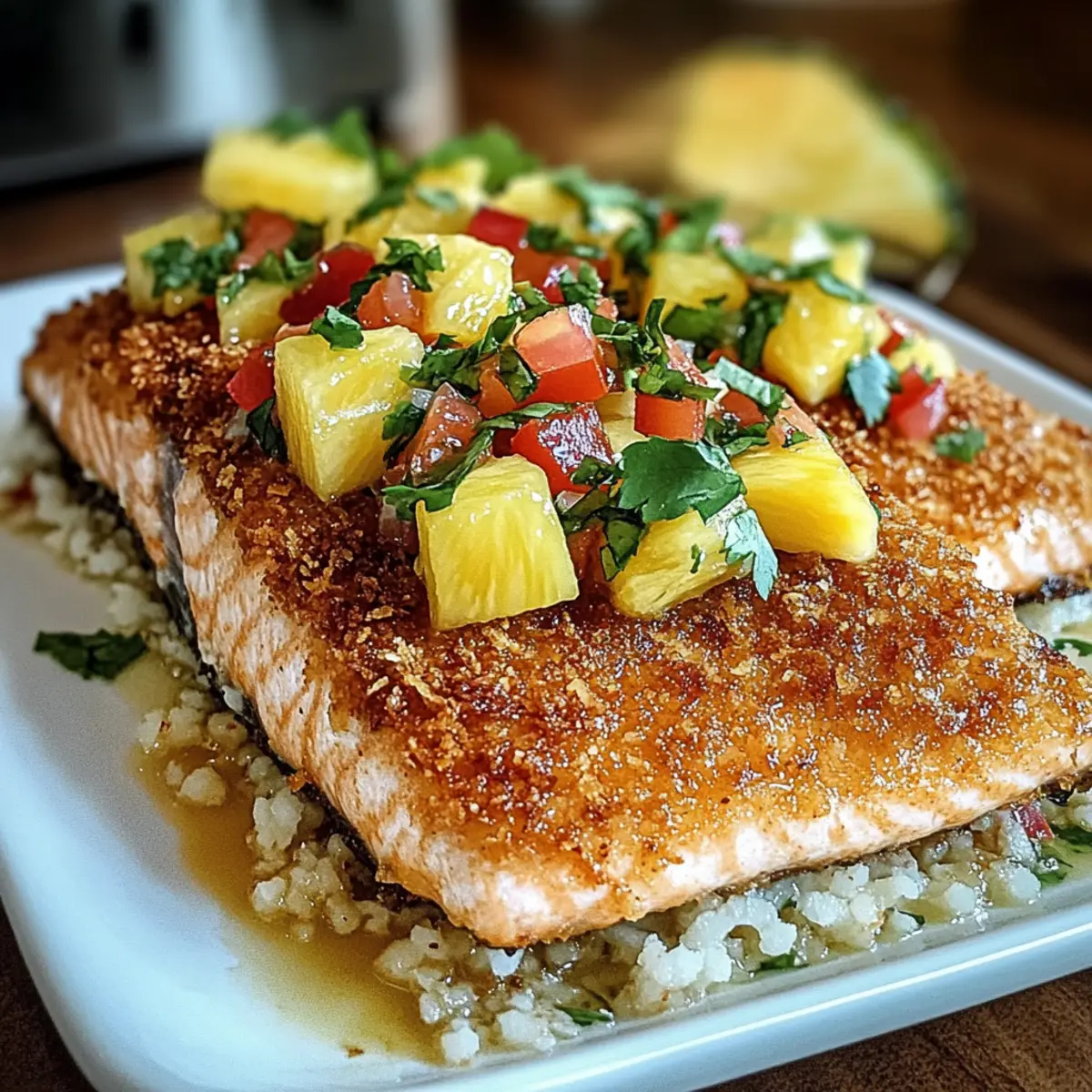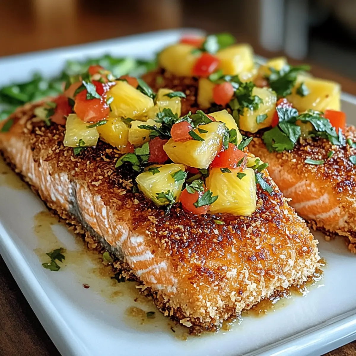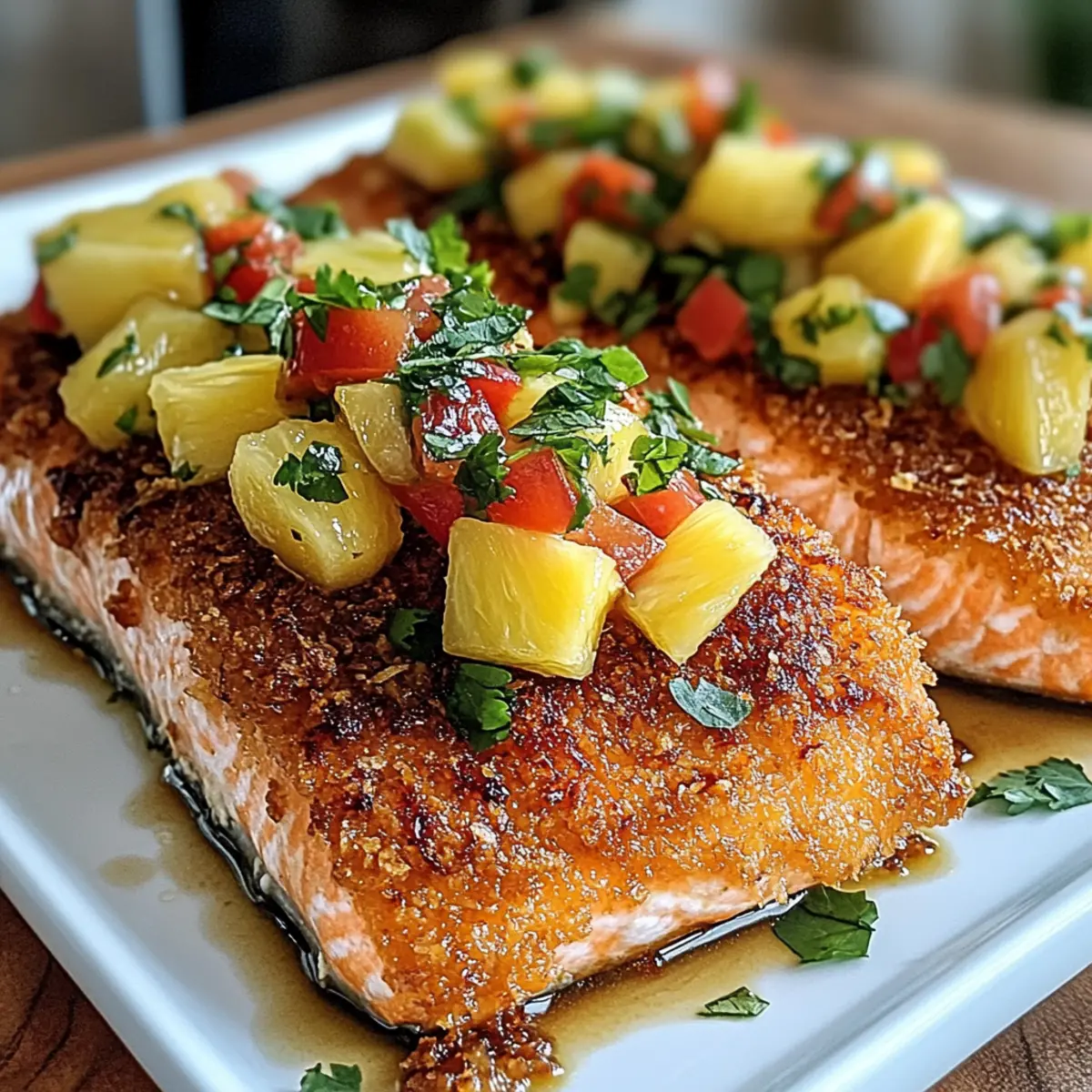 Wenn ich an Sommer denke, kommen mir sofort die strahlenden Farben und der erfrischende Duft tropischer Früchte in den Sinn. Einer meiner Lieblingsgerichte, das diese Gefühle perfekt einfängt, ist Kokosnusskruste Lachs mit Ananas Salsa. Dieses Gericht vereint saftigen, reichhaltigen Lachs, der von einer knusprigen Kokos- und Panko-Kruste umhüllt wird – ein wahrer Genuss für die Sinne. Egal, ob du dir ein schnelles Abendessen unter der Woche gönnen oder etwas Besonderes für Gäste zaubern möchtest, diese einfache Zubereitung bietet dir beide Möglichkeiten und bringt die Sonne auf den Teller. Zudem bietet es den zusätzlichen Vorteil, dass es glutenfrei und anpassbar für eine vegane Variation ist. Bist du bereit, mit mir in die Welt der tropischen Aromen einzutauchen? Warum ist dieses Rezept ein Muss? Einfachheit: Die Zubereitung erfordert keine Küchenzauberkräfte – sogar Anfänger können dieses Gericht meistern! Tropische Aromen: Die Kombination aus saftigem Lachs und erfrischender Ananas-Salsa ist ein wahrer Genuss für die Sinne und bringt das Urlaubsgefühl direkt auf deinen Teller. Vielseitigkeit: Ob gebacken oder frittiert, du kannst die Kochmethode wählen, die dir am besten gefällt – so bleibt das Rezept spannend. Gesundheit: Mit gesunden Fetten und einer nahrhaften Basis ist dieses Gericht nicht nur köstlich, sondern auch nährstoffreich. Kombiniere es mit Cremige Gnocchi Mit Spinat oder Baguettscheiben Mit Tomaten, um ein perfektes Menü zu kreieren! Crowd-Pleaser: Egal ob für ein schnelles Abendessen mit der Familie oder eine festliche Einladung, dieses Rezept wird sicher alle begeistern. Kokosnusskruste Lachs Zutaten Hinweis: Alle Zutaten für dieses tropische Genusserlebnis sind leicht verfügbar und bringen Aromen direkt auf deinen Teller. Salmonfillets – Reichhaltiger Geschmack und eine hervorragende Proteinquelle. Hinweis: Probiere die Variante mit Haut oder ohne, ganz nach deinem Geschmack. Ungesüßte Kokosraspel – Fügt Knusprigkeit und einen Hauch von Süße hinzu. Alternativ können fein gehackte Mandeln einen nussigen Twist geben. Panko-Brösel – Sorgt für eine leichtere, knusprigere Kruste im Vergleich zu normalen Bröseln. Verwende glutenfreies Panko, wenn du auf Gluten verzichten möchtest. Allzweckmehl – Hilft, das Eier-Waschmittel am Lachs haften zu lassen. Keine Substitution nötig, außer du benötigst eine glutenfreie Option. Große Eier – Binden die Panade am Lachs. Alternativ kannst du ein Leinsamen-Ei verwenden, um das Rezept vegan zu gestalten. Salz und Pfeffer – Verstärkt den Geschmack. Passen nach deinem persönlichen Geschmack an. Kokosöl (oder Olivenöl) – Fügt gesunde Fette hinzu und wird zum Frittieren verwendet. Für das Backen kann auch Olivenöl verwendet werden. Frische Ananas, gewürfelt – Bringt natürliche Süße und Frische. Stelle sicher, dass die Ananas reif ist, um den besten Geschmack zu erzielen. Rote Paprika – Sorgt für eine knackige Textur und Süße. Alternativ kann gewürfelte Mango für eine süßere Salsa verwendet werden. Rote Zwiebel – Führt zu einem scharfen Geschmack. Frühlingszwiebeln können als mildere Alternative genutzt werden. Jalapeño, entkernt und gehackt – Bietet einen scharfen Kick; halte ihn optional, je nach Vorliebe. Saft von 1 Limette – Balanciert die Süße mit Säure aus. Zitronensaft kann als Ersatz dienen. Frischer Koriander, gehackt – Sorgt für Frische; kann weggelassen werden, wenn du kein Koriander-Fan bist. Schritt-für-Schritt-Anleitung für Kokosnusskruste Lachs mit Ananas Salsa Step 1: Salsa vorbereiten Zuerst die gewürfelte Ananas, die rote Paprika, die rote Zwiebel, die gehackte Jalapeño, den Limettensaft und den frischen Koriander in einer Schüssel gut vermengen. Füge eine Prise Salz hinzu, um den Geschmack zu intensivieren. Lass die Salsa für etwa 15-20 Minuten stehen, damit sich die Aromen gut entfalten können. Step 2: Die Kochfläche vorheizen Heize für das Backen den Ofen auf 200°C (400°F) vor. Wenn du die Frittiermethode bevorzugst, erhitze in einer großen Pfanne ausreichend Kokosöl bei mittlerer Hitze. So bereitest du die perfekte Grundlage für den knusprigen Kokosnusskruste Lachs mit Ananas Salsa. Step 3: Panierstation einrichten Richte drei flache Schalen ein: Eine mit Allzweckmehl, die zweite mit den verquirlten Eiern und die dritte mit einer Mischung aus ungesüßten Kokosraspeln und Panko-Bröseln. Diese Vorbereitung macht das Panieren des Lachses einfach und ordentlich, sodass du bereit bist, zu starten! Step 4: Den Lachs panieren Nehme ein Lachsfilet und wende es zuerst im Mehl, sodass es gleichmäßig bedeckt ist. Dann tauche es in das verquirlte Ei, bevor du es in der Kokos-Panko-Mischung wälzt. Klopfe leicht an, damit die Panade gut haftet. Wiederhole diesen Vorgang für alle Lachsfilets, um eine großzügige Schicht der köstlichen Kokosnusskruste zu erstellen. Step 5: Den Lachs garen Für das Backen: Lege die panierten Lachsfilets auf ein gefettetes Backblech und backe sie 12-15 Minuten lang, bis die Oberfläche goldbraun und der Lachs durchgegart ist. Für das Frittieren: Brate die Filets 4-5 Minuten pro Seite in der Pfanne, bis sie knusprig und goldbraun sind. Achte darauf, den Lachs nicht zu überfüllen, damit er gleichmäßig gart. Step 6: Servieren Richte die gebratenen oder gebackenen Lachsfilets auf Tellern an und gib großzügig die vorbereitete Ananas Salsa obenauf. Du kannst das Gericht optional mit duftendem Jasminreis oder einem frischen Salat servieren, um eine geschmackvolle Kombination zu kreieren. Lagerungstipps für Kokosnusskruste Lachs mit Ananas Salsa Zimmertemperatur: Lasse den Kokosnusskruste Lachs nicht länger als 2 Stunden bei Zimmertemperatur stehen, um die Frische und Sicherheit zu gewährleisten. Kühlschrank: Gekochten Lachs kannst du in einem luftdichten Behälter bis zu 3 Tage im Kühlschrank aufbewahren. Ideal, um die Aromen frisch zu halten! Gefrierschrank: Um den Lachs für bis z