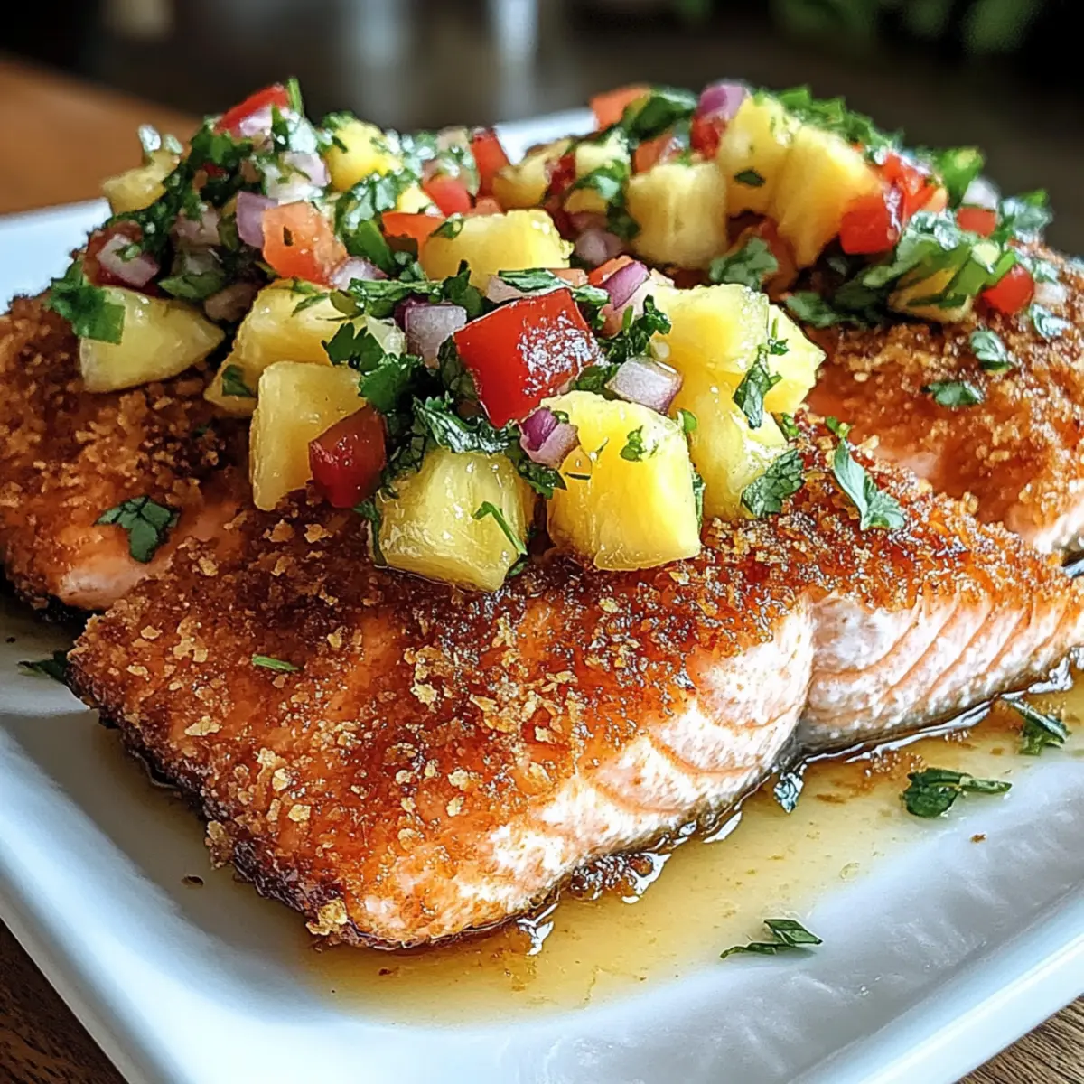 Kokosnusskrustierter Lachs mit Ananassalsa genießen