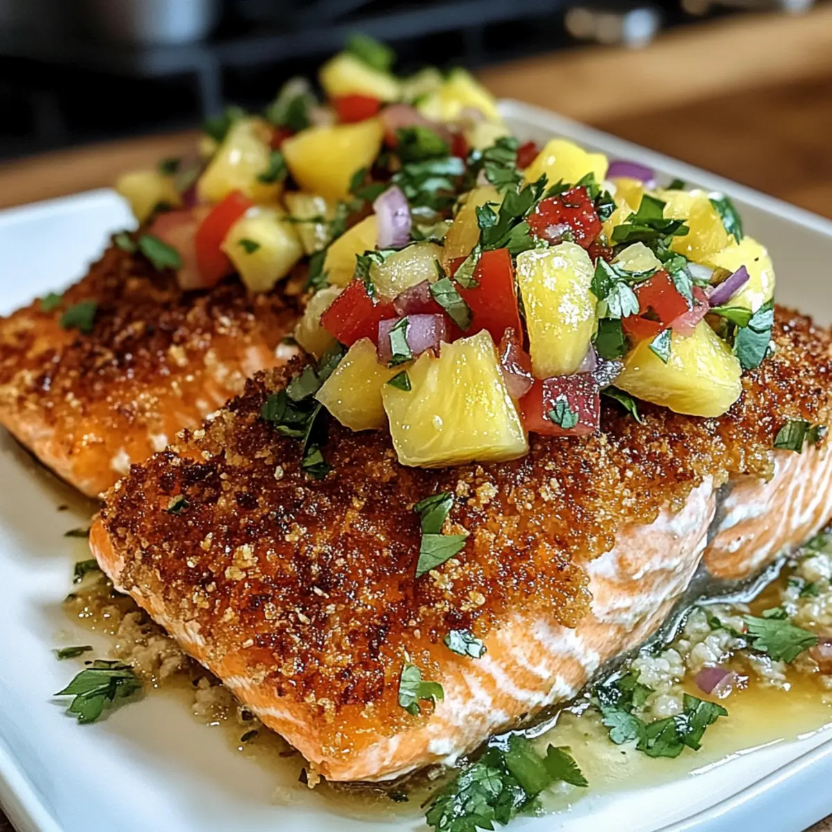Kokosnusskrustierter Lachs mit Ananassalsa