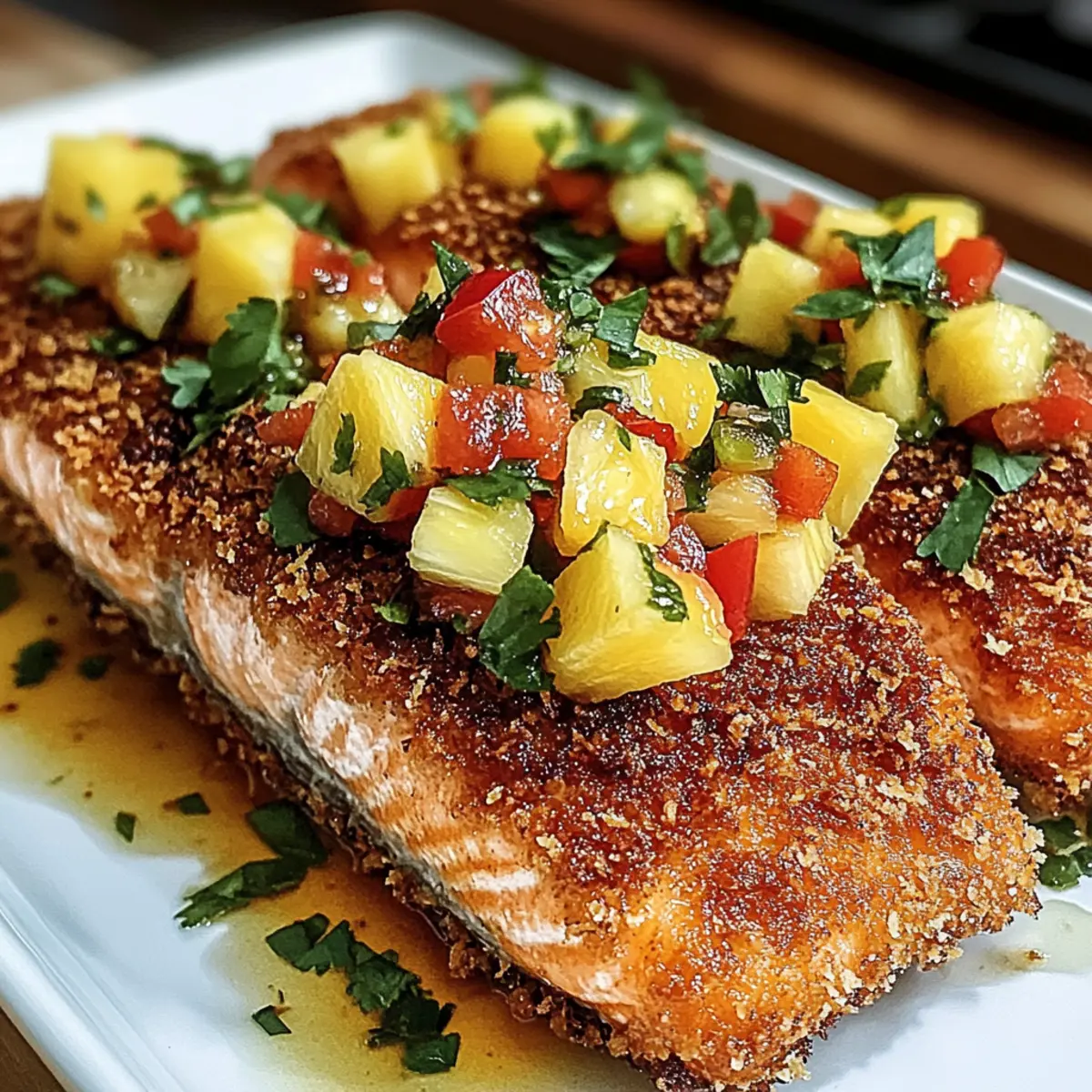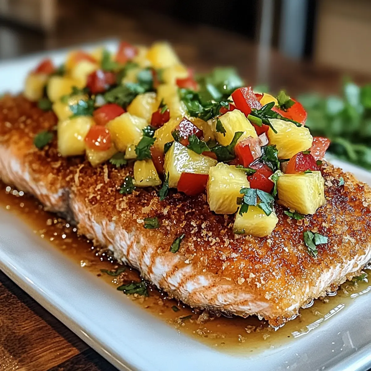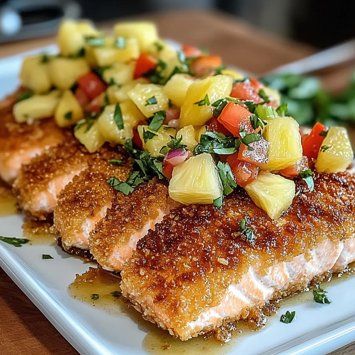 Beim Biss in diesen köstlichen kokosnusskrustierten Lachs mit Ananassalsa fühlte ich mich sofort an einen tropischen Strand versetzt. Dieser Gericht vereint zarte, reichhaltige Lachsfilets mit der süßen Frische von Ananas und verleiht jedem Bissen eine spannende Geschmacksexplosion. Einfach zuzubereiten, bietet dieses Rezept nicht nur eine gesunde Option für ein schnelles Abendessen, sondern ist auch ein echter Hingucker für besondere Anlässe. Egal, ob Sie sich für das Backen oder das Frittieren entscheiden, dieser Lachs wird garantiert zum Star auf Ihrem Tisch. Wer könnte da widerstehen? Lassen Sie uns zusammen in die bunte Welt der Aromen eintauchen – bereit für Ihren nächsten kulinarischen Triumph? Warum ist das Rezept so besonders? Einzigartiger Genuss: Kokosnusskrustierter Lachs mit Ananassalsa ist eine exotische Geschmackskombination, die Sie direkt an sonnige Strände entführt. Einfachheit: Dieses Rezept erfordert lediglich grundlegende Kochkenntnisse und ist schnell zubereitet. Gesund und lecker: Reich an Omega-3-Fettsäuren und frischen Zutaten, erfüllt es nicht nur den Gaumen, sondern auch Ihre Ernährungsbedürfnisse. Vielseitigkeit: Ob gebacken oder frittiert, jeder Biss ist knusprig und saftig. Perfekt als Hauptgericht oder für besondere Anlässe, wird dieser Lachs auf Ihrem Tisch sicher alle beeindrucken. Kombinieren Sie ihn mit einem frischen Salat oder Cremige Gnocchi mit Spinat für ein ausgewogenes Mahl! Kokosnusskrustierter Lachs mit Ananassalsa Zutaten Hinweis: Diese Zutatenliste hilft Ihnen, alle notwendigen Komponenten für Ihren köstlichen kokossnusskrustierten Lachs mit Ananassalsa zusammenzustellen. Für den Lachs Lachsfilets – Achten Sie auf frischen, wild gefangenen Lachs für den besten Geschmack und Nährstoffgehalt. Ungesüßte, geraspelte Kokosnuss – Sorgt für eine knusprige Textur und gesunde Fette; wählen Sie ungesüßte für ein besseres Geschmacksprofil. Panko- oder Semmelbrösel – Erzeugt eine leichte, knusprige Kruste; verwenden Sie Vollkorn-Panko für eine gesündere Variante. Allzweckmehl – Dient als Grundlage für die Panade, damit die Eierhaube besser haftet; alternativ mit glutenfreiem Mehl für eine glutenfreie Option. Große Eier – Helfen, die Kruste zu binden; für eine vegane Option kann ein Flachseig (1 EL gemahlene Leinsamen gemischt mit 2,5 EL Wasser) verwendet werden. Kokosöl (oder Olivenöl) – Zum Frittieren; bringt Geschmack und unterstützt die Knusprigkeit der Kruste; Sie können auch Pflanzenöl verwenden. Für die Ananassalsa Frische Ananas – In kleine Stücke geschnitten; sie bringt Süße und Säure ins Spiel; verwenden Sie gut abgetropfte, konservierte Ananas als Alternative. Rote Paprika – Fügt Crunch und Farbe hinzu. Rote Zwiebel – Sorgt für Schärfe und Süße. Jalapeño – Für einen würzigen Kick; kann für einen milderen Geschmack weggelassen werden. Limettensaft – Hellert die Salsa auf; frisch gepresster Saft sorgt für das beste Aroma. Frischer Koriander – Verleiht der Salsa frische, kräuterige Noten; kann weggelassen werden, wenn Sie kein Koriander-Fan sind. Schritt-für-Schritt-Anleitung für Kokosnusskrustierten Lachs mit Ananassalsa Step 1: Ananassalsa zubereiten Mischen Sie in einer Schüssel die gewürfelte frische Ananas, rote Paprika, rote Zwiebel, Jalapeño (wenn gewünscht), Limettensaft und frisch gehackten Koriander. Fügen Sie eine Prise Salz hinzu, um die Aromen zu intensivieren. Lassen Sie die Salsa mindestens 15-20 Minuten ruhen, damit die Aromen gut durchziehen und sich entfalten können. Step 2: Ofen oder Pfanne vorheizen Heizen Sie den Ofen auf 200°C (400°F) vor, wenn Sie den Lachs backen möchten. Alternativ erhitzen Sie Kokosöl oder Olivenöl in einer großen Pfanne bei mittlerer Hitze, falls Sie den Lachs frittieren möchten. Achten Sie darauf, dass das Öl heiß genug ist, bevor Sie den Lachs hineinlegen, um eine schöne Kruste zu erhalten. Step 3: Panierstation einrichten Bereiten Sie Ihre Panierstation vor, indem Sie drei Schalen anordnen: die erste mit Allzweckmehl, die zweite mit den geschlagenen Eiern und die dritte mit einer Mischung aus ungesüßter geraspelter Kokosnuss und Panko. Diese Anordnung erleichtert das Eintauchen der Lachsfilets und sorgt für eine gleichmäßige Panade. Step 4: Lachs panieren Nehmen Sie jedes Lachsfilet und wenden Sie es zuerst in der Mehl-Schale, sodass es rundum bedeckt ist. Tauchen Sie das Filet dann in die geschlagenen Eier, um die Kochschichten zu verbinden. Zum Schluss drücken Sie das Lachsfilet in die Mischung aus Kokosnuss und Panko, bis es gleichmäßig bedeckt ist. Achten Sie darauf, eine gute Schicht zu erhalten. Step 5: Lachs garen Wenn Sie sich für das Backen entschieden haben, legen Sie den panierten Lachs auf ein geöltes Backblech und backen Sie ihn 12-15 Minuten lang, bis die Kruste goldbraun und der Lachs leicht flockig ist. Für das Frittieren braten Sie die Filets in der Pfanne 4-5 Minuten pro Seite, bis sie goldbraun sind und innen durchgegart. Step 6: Servieren Richten Sie den kokosnusskrustierten Lachs auf einem Teller an und geben Sie die vorbereitete Ananassalsa großzügig darauf. Für ein rundum schönes Gericht können Sie den Lachs mit Beilagen wie gedämpftem Jasminreis oder einem frischen Salat servieren. Genießen Sie die tropischen Aromen, die jedem Bissen das Gefühl eines Strandausflugs verleihen! Tipps für den besten Kokosnusskrustierten Lachs Lachs richtig vorbereiten: Stellen Sie sicher, dass die Lachsfilets vor dem Panieren gut abgetrocknet sind, um eine bessere Haftung der Kruste zu gewährleisten. Salsa ziehen lassen: Lassen Sie die Ananassalsa mindestens 15-20 Minuten ruhen, damit sich die Aromen richtig entfalten und intensiv werden. Prüfen Sie die Kochzeit: Achten Sie genau auf die Garzeit, um ein Überkochen des Lachses zu vermeiden – dies kann ihn trocken machen. Mehl und Kokosnuss mischen: Experimentieren Sie mit einer Mischung aus ungesüßter Kokosnuss und Pank