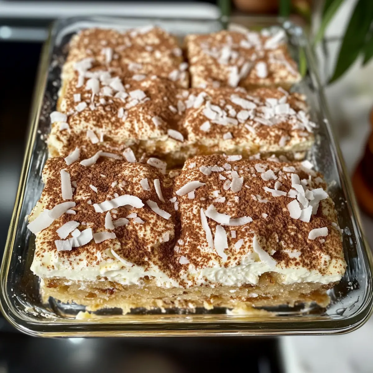 8. Tiramisu garnieren und kühlen: Zimt und Kokosraspel auf die oberste Schicht streuen und mindestens 12 Stunden im Kühlschrank ruhen lassen.