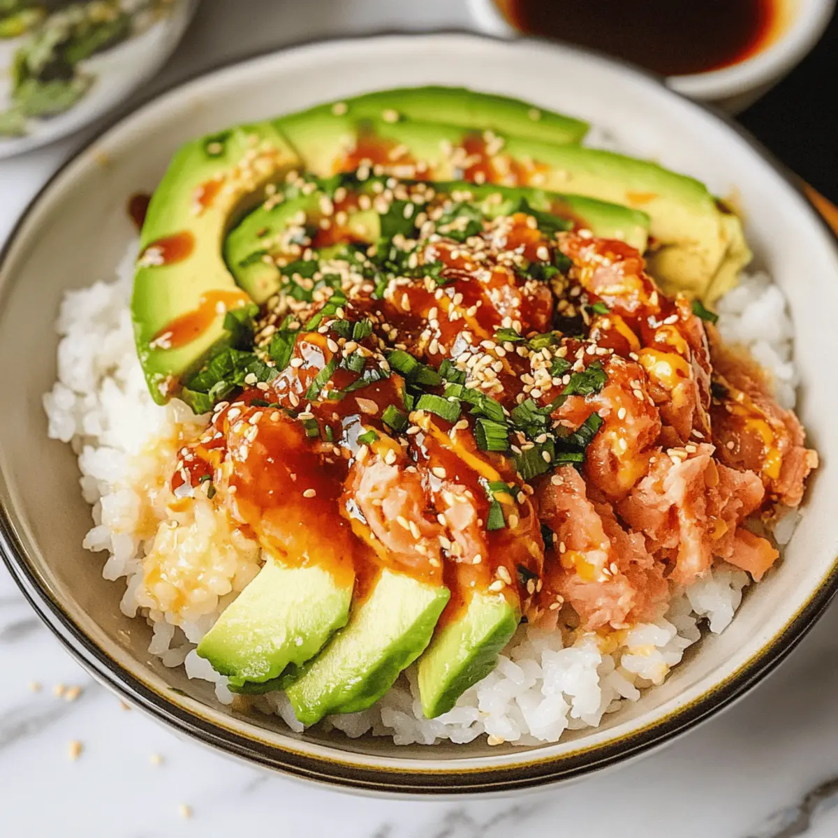 Die Konservierter Thunfisch Sushi-Schüssel ist jetzt bereit zur Fertigstellung. Gib den angebratenen Sushi-Reis in eine große Schüssel und toppe ihn großzügig mit der Thunfisch-Bang Bang-Mischung. Füge deine vorbereiteten Avocado-Scheiben, gehackte Frühlingszwiebeln und nach Belieben Furikake hinzu, um den Geschmack zu intensivieren.