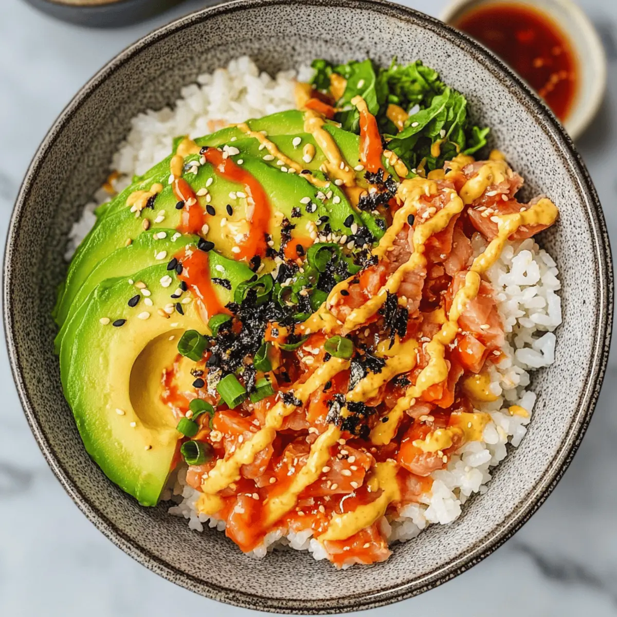 • Reisvariation: Verwende anstelle von Sushi-Reis gekochten Jasminreis für eine lockere Textur. Jasminreis hat ein leicht blumiges Aroma, das perfekt zu den würzigen Komponenten der Schüssel passt und ein Hauch von Exotik verleiht.