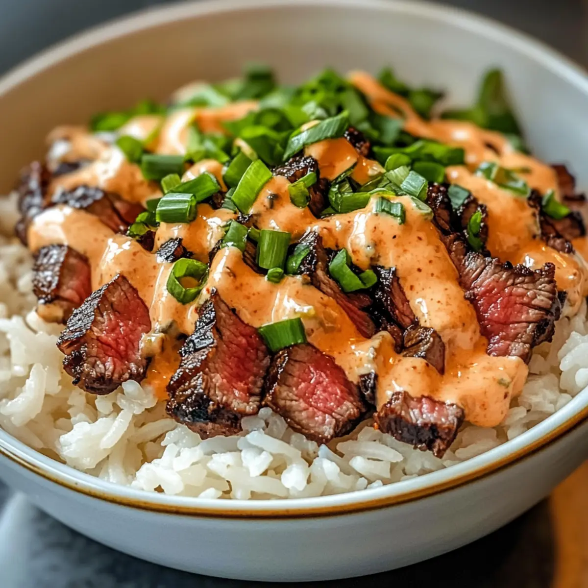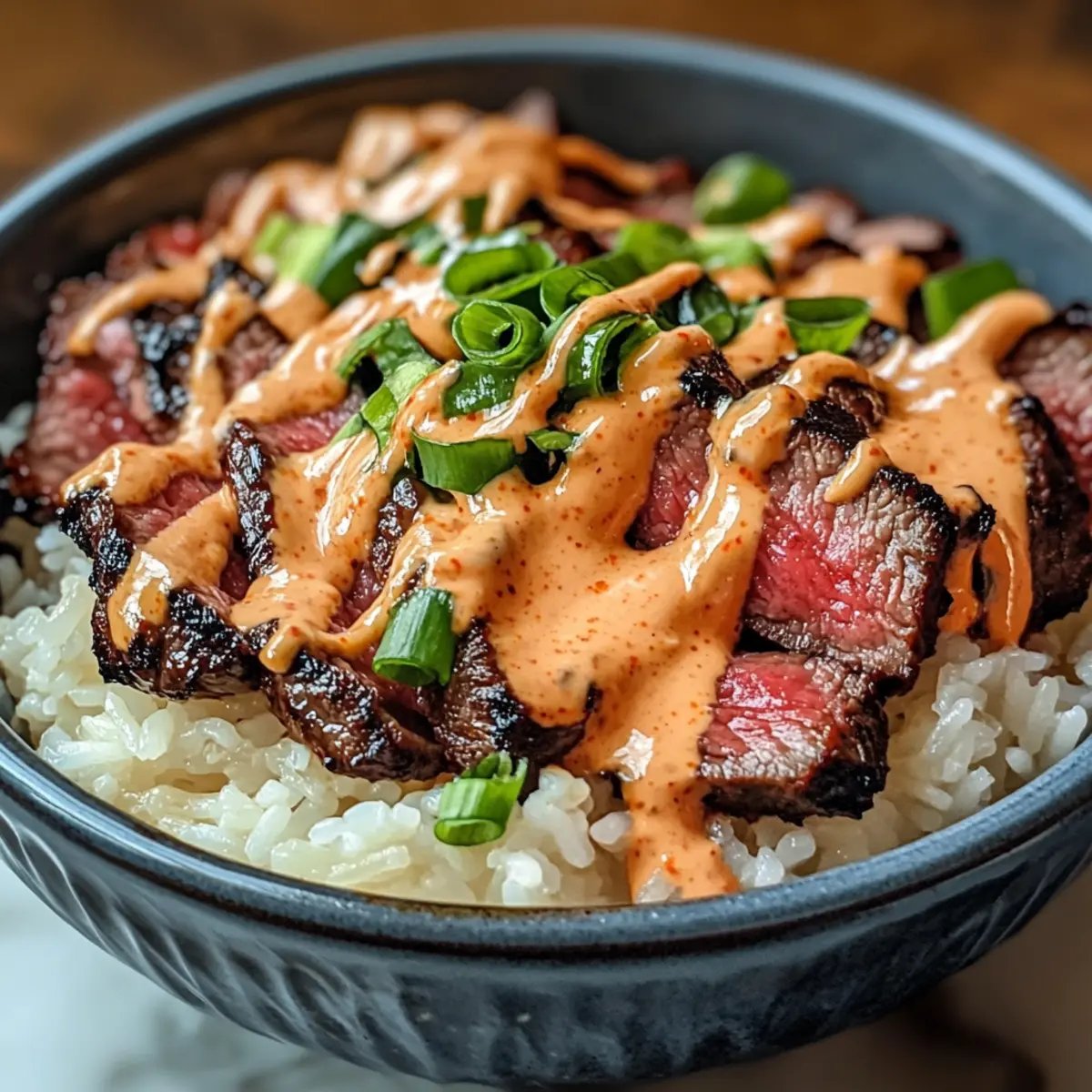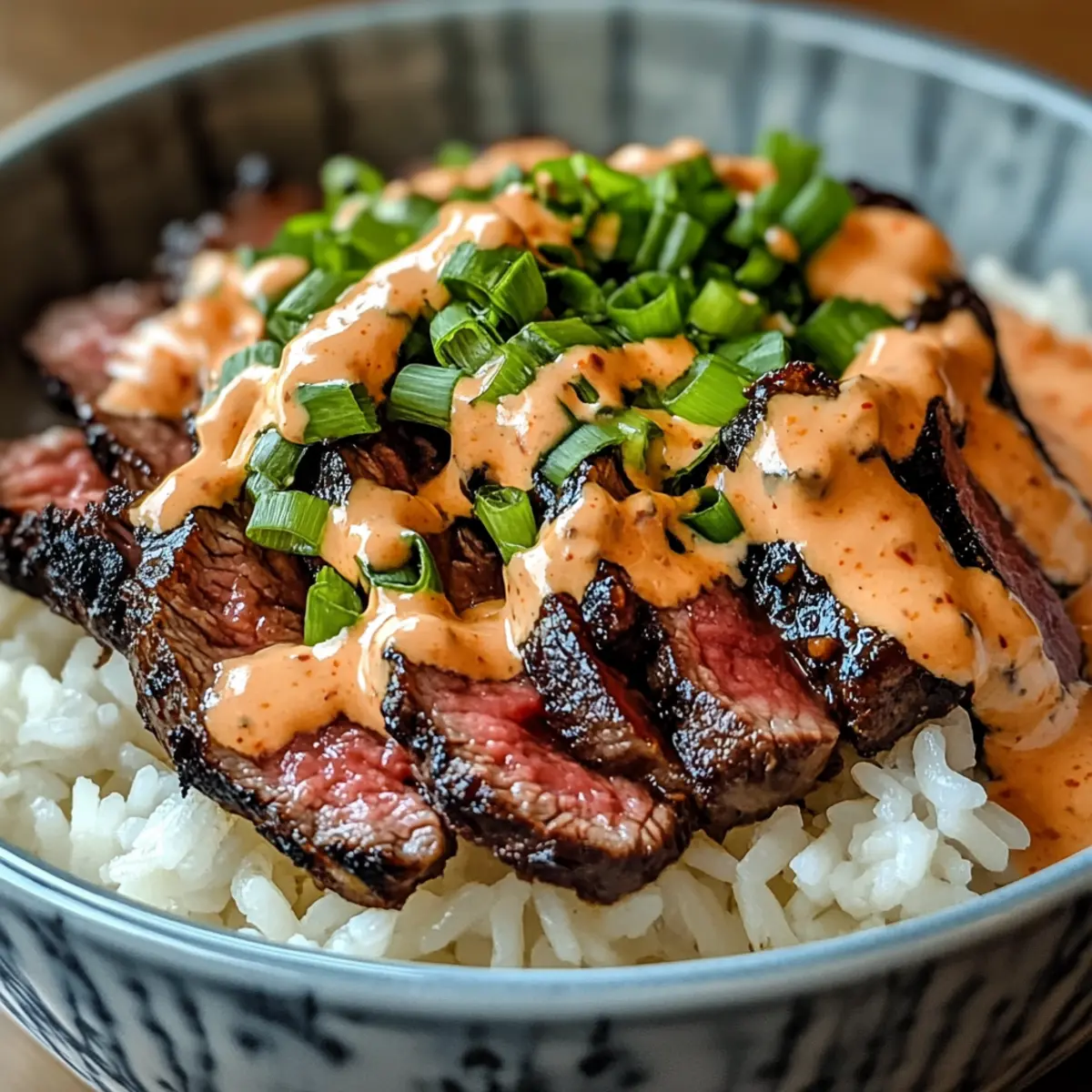 Die Liebe zu gutem Essen ist wie eine Reise in ferne Länder, die uns mit neuen Geschmäckern und Aromen verzaubert. Heute lade ich euch ein, mit mir in die Welt der koreanischen Aromen einzutauchen – denn diese Koreanischen BBQ Rindfleisch Reis Bowls mit würziger Sahnesauce sind der perfekte Weg, um eine köstliche Fusion auf euren Tisch zu bringen. In nur einer halben Stunde zaubert ihr euch ein Gericht, das nicht nur schnell zubereitet ist, sondern auch Freunde und Familie begeistert. Diese saftigen Steakstreifen harmonieren wunderbar mit fluffigem Reis und einer cremigen, scharfen Sauce, die einfach nach mehr verlangt. Neugierig, wie ihr dieses geschmackliche Meisterwerk nachkochen könnt? Lasst uns gemeinsam loslegen! Warum wirst du dieses Rezept lieben? Einfachheit in Perfektion: Die Zubereitung dieser koreanischen Rindfleisch Reis Bowls erfordert nur grundlegende Kochfähigkeiten, sodass jeder sie meisterhaft zubereiten kann. Reiche Aromen: Die Kombination aus aromatischen Marinaden und einer würzigen Sahnesauce sorgt für ein Geschmackserlebnis, das deine Geschmacksknospen tanzen lässt. Vielseitig und anpassbar: Du kannst die Zutaten nach Belieben variieren – egal, ob mit Hähnchen, Garnelen oder Tofu, jeder findet seinen Favoriten! Familienfreundlich: Dieses Rezept ist nicht nur schnell, sondern auch perfekt geeignet, um die gesamte Familie zu erfreuen. Ganz gleich, ob für ein schnelles Abendessen oder ein gemeinsames Festmahl! Einfache Vorbereitung: Mit einem cleveren Timing kannst du alles gleichzeitig zubereiten und so wertvolle Minuten sparen. Entdecke auch deine eigenen servierfreundlichen Vorschläge, um das Gericht zu vervollständigen! Koreanisches BBQ Rindfleisch Zutaten • Für das Steak Rindfleisch – Flank oder Sirloin bringt eine zarte Textur; Ribeye funktioniert ebenfalls prima. Sojasauce – Essentiell für den umami Geschmack der Marinade; verwenden Sie tamari für eine glutenfreie Option. Brauner Zucker – Fügt eine subtile Süße hinzu; Honig ist ein natürlicher Ersatz. Sesamöl – Verleiht dem Fleisch einen nussigen Geschmack. Knoblauch & Ingwer – Frisch gehackt geben eine aromatische Tiefe; pulverisierte Formen können den Geschmack verändern. • Für den Reis Reis – Jasmin- oder weißer Reis sorgt für eine fluffige Basis; brauner Reis ist gesünder, benötigt jedoch mehr Kochzeit. • Für die Garnitur Frühlingszwiebeln – Sorgt für Frische und Farbe; optional durch Schnittlauch ersetzen, wenn ein milderer Geschmack gewünscht ist. • Für die würzige Sahnesauce Mayonnaise – Grundlage der Sauce für eine cremige Struktur. Sriracha – Gibt der Sauce die gewünschte Schärfe; passe die Menge ganz nach deinen Vorlieben an. Limettensaft – Verleiht der Sauce eine zesty Note, die die Aromen gut ausbalanciert. Mit diesen köstlichen Zutaten bist du bestens ausgerüstet, um diese Koreanischen BBQ Rindfleisch Reis Bowls mit würziger Sahnesauce selbst zuzubereiten! Schritt-für-Schritt-Anleitung für Koreanisches BBQ Rindfleisch Reis Bowls mit würziger Sahnesauce Step 1: Steak marinieren Vermische in einer Schüssel die Sojasauce, den braunen Zucker, das Sesamöl, den gehackten Knoblauch und den Ingwer zu einer aromatischen Marinade. Lege das Rindfleisch in eine flache Schale und übergieße es mit der Marinade, sodass es gut bedeckt ist. Decke die Schüssel ab und lasse das Steak für 15-30 Minuten im Kühlschrank marinieren, damit die Aromen gut durchziehen können. Step 2: Reis kochen Während das Steak mariniert, koche den Reis gemäß den Anweisungen auf der Verpackung. Verwende am besten Jasmin- oder weißen Reis für die fluffige Konsistenz oder braunen Reis für eine gesündere Alternative. Nach dem Kochen den Reis mit einer Gabel auflockern und warmhalten, während du die restlichen Schritte für die Koreanischen BBQ Rindfleisch Reis Bowls vorbereitest. Step 3: Steak braten Erhitze eine Grillpfanne oder eine große Pfanne bei mittelhoher Temperatur. Sobald die Pfanne heiß ist, lege das marinierte Rindfleisch hinein und brate es für 4-5 Minuten auf jeder Seite, bis es eine schöne Bräunung hat und innen medium-rare ist. Nimm das Steak aus der Pfanne und lasse es für einige Minuten ruhen, bevor du es gegen die Faser in dünne Streifen schneidest. Step 4: Würzige Sahnesauce zubereiten In einer kleinen Schüssel vermischst du die Mayonnaise, die Sriracha und den Limettensaft, um eine cremige und scharfe Sauce zu kreieren. Taste die Sauce ab und passe die Menge an Sriracha nach deinem persönlichen Schärfewunsch an, sodass sie perfekt zu den Koreanischen BBQ Rindfleisch Reis Bowls passt. Step 5: Schüsseln anrichten Um die Reis Bowls zusammenzustellen, verteile den lockeren Reis gleichmäßig auf Schalen. Füge die geschnittenen Steakstücke hinzu und träufele großzügig die würzige Sahnesauce darüber. Garniere die Bowls mit frisch gehackten Frühlingszwiebeln, die für zusätzliche Frische und Farbe sorgen. Step 6: Sofort servieren Serviere die Koreanischen BBQ Rindfleisch Reis Bowls sofort, damit die Gäste die köstliche Kombination aus zartem Steak, fluffigem Reis und würziger Sahnesauce genießen können. Diese warmen Schüsseln sind eine wahre Geschmacksexplosion und ideal für ein schnelles und dennoch beeindruckendes Gericht! Vorbereitung für die Koreanischen BBQ Rindfleisch Reis Bowls Diese Koreanischen BBQ Rindfleisch Reis Bowls mit würziger Sahnesauce sind ideal für vielbeschäftigte Köche, die Zeit sparen möchten. Du kannst das Steak bis zu 24 Stunden im Voraus marinieren; dadurch ziehen die Aromen besonders gut ein und sorgen für ein zartes Ergebnis. Koche den Reis ebenfalls im Voraus und lagere ihn in einem luftdichten Behälter, wo er bis zu 3 Tage frisch bleibt. Wenn es Zeit ist zu servieren, erwärme den Reis und brate das marinierte Steak kurz an, um es auf den gewünschten Gargrad zu bringen. Vergiss nicht, die würzige Sahnesauce frisch zuzubereiten, um die Cremigkeit zu bewahren; die Kombinatio