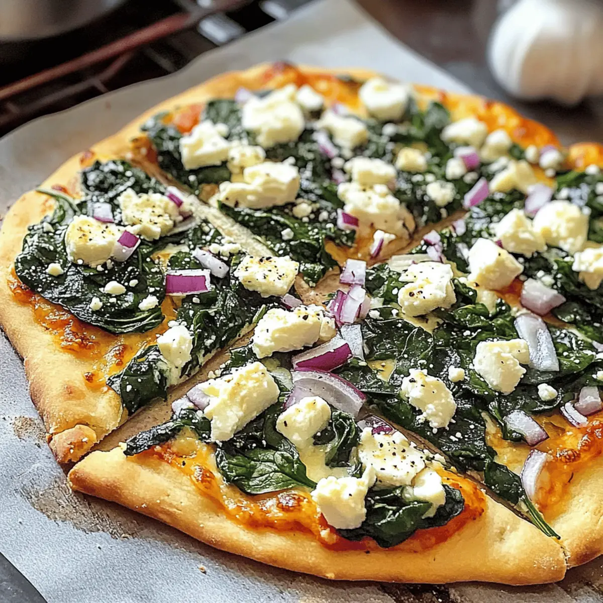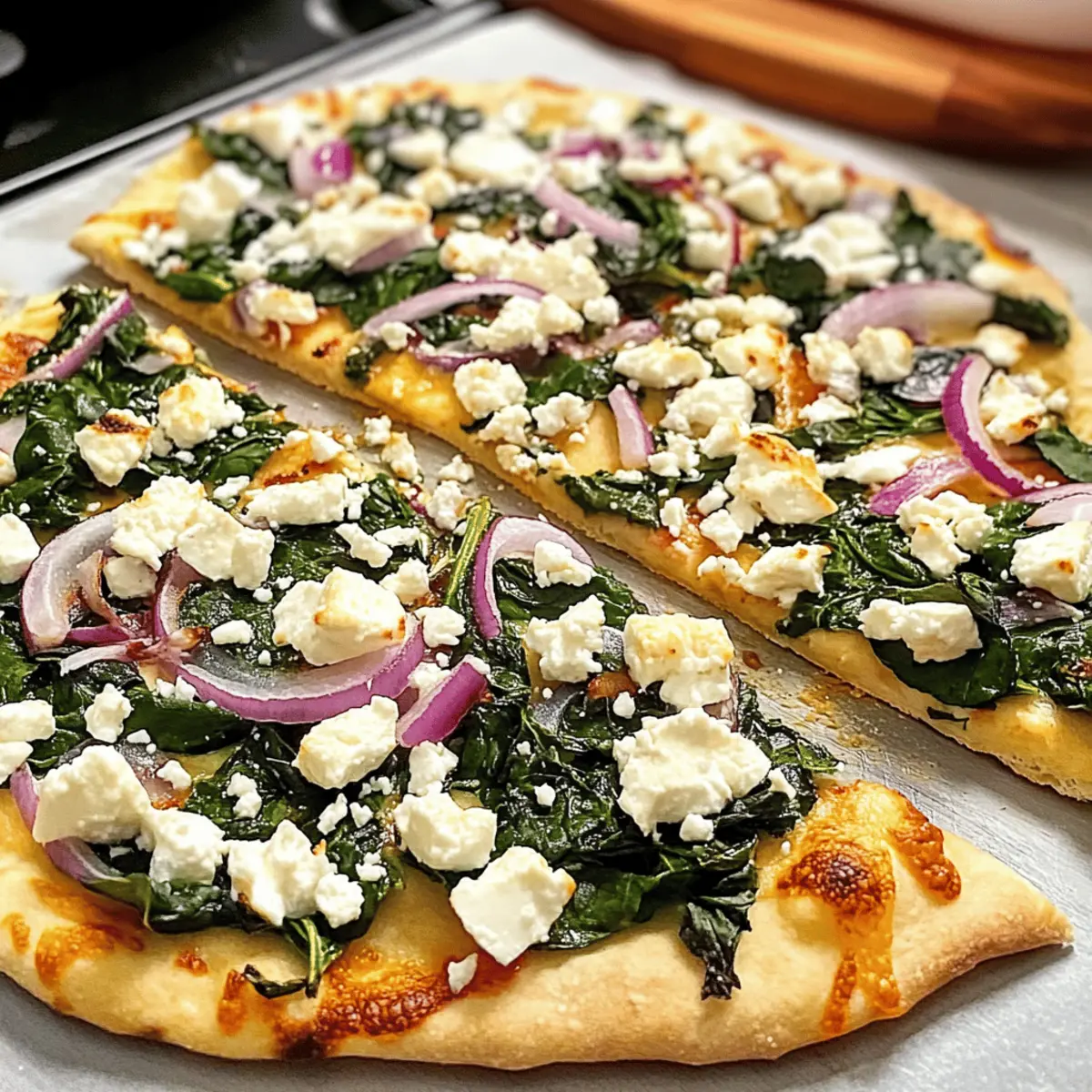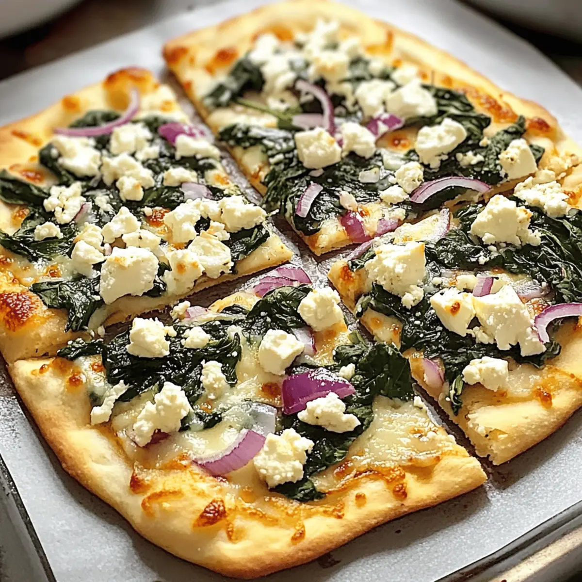 „Hast du schon einmal das Vergnügen gehabt, deine Küche mit einem köstlichen mediterranen Duft zu erfüllen?“ Wenn ich an ein schnelles, aber beeindruckendes Essen denke, kommt mir sofort die leckere Spinat- und Feta-Fladenbrot-Pizza in den Sinn. In weniger als 20 Minuten zauberst du mit wenigen frischen Zutaten ein Gericht, das nicht nur gesund, sondern auch familienfreundlich ist. Diese Pizza ist ein wahres Multitalent: ideal für hektische Wochentage, als Snack zum Teilen oder sogar als leichtes Mittagessen. Und weil man sie ganz nach Lust und Laune belegen kann, sind der Kreativität keine Grenzen gesetzt. Bist du bereit, deinen Geschmackshorizont zu erweitern und etwas Neues auszuprobieren? Warum wirst du dieses Rezept lieben? Schnelligkeit: In weniger als 20 Minuten zauberst du eine köstliche Pizza, perfekt für hektische Wochentage. Gesund und lecker: Frischer Spinat und cremiger Feta bieten eine gesunde Option, die auch die Kleinen begeistern wird. Flexibilität: Die Rezeptur lässt sich leicht anpassen; experimentiere mit deinen Lieblingszutaten oder verwandle sie in eine vegetarische Variante. Einfachheit: Mit nur wenigen Grundzutaten kannst du in kürzester Zeit ein beeindruckendes Gericht auf den Tisch bringen. Perfekte Textur: Der knusprige Boden, das geschmolzene Käse und die frischen Zutaten bieten ein unwiderstehliches Geschmackserlebnis, das du immer wieder genießen möchtest. Serviermöglichkeiten: Ergänze deine Pizza mit einem frischen Salat oder probiere sie als herzhafte Vorspeise, um deine Gäste zu beeindrucken. Leckere Spinat- und Feta-Fladenbrot-Pizza Zutaten Für den Belag Fladenbrot – bildet die perfekte Basis für deine Pizza; probiere auch Naan, Pita oder Lavash für Abwechslung. Mozzarella-Käse – schmilzt wunderbar und sorgt für eine cremige Textur; verwende Teilfettsorte für weniger Fett. Frischer Spinat – bringt eine nährstoffreiche Note und intensive Farbe; kann vor der Verwendung leicht sautiert werden, um die Feuchtigkeit zu reduzieren. Rote Zwiebeln – für Süße und Crunch sorgen; dünn schneiden für gleichmäßiges Garen. Gehackter Knoblauch – verstärkt das Geschmacksprofil; frischer Knoblauch ist am besten, Knoblauchpulver ist jedoch auch eine Option. Zerbröckelter Feta-Käse – bietet einen cremigen und salzigen Kontrast; kann durch Ziegenkäse ersetzt werden, wenn gewünscht. Olivenöl – verleiht Reichtum und hilft, das Fladenbrot knusprig zu machen; leicht vor dem Backen darüber träufeln. Meersalz & Pfeffer – verstärken alle Aromen; nach Geschmack anpassen. Egal, wie du deine leckere Spinat- und Feta-Fladenbrot-Pizza belegst, die Möglichkeiten sind schier endlos und werden deine Familie und Freunde begeistern! Schritt-für-Schritt Anleitungen für Leckere Spinat- und Feta-Fladenbrot-Pizza Step 1: Ofen vorheizen Heize den Ofen auf 230 °C (450 °F) vor oder verwende einen Airfryer und stelle ihn auf 200 °C (400 °F) ein. Diese Temperatur ist wichtig, um die Fladenbrot-Pizza knusprig zu bekommen. Ein vorgeheizter Ofen sorgt dafür, dass der Käse gleichmäßig schmilzt und der Boden goldbraun wird. Step 2: Fladenbrot vorbacken (optional) Lege das Fladenbrot auf ein Backblech und backe es optional für 3-4 Minuten vor. Dies verhindert, dass das Fladenbrot beim Belegen durchweicht. Achte darauf, dass es nur leicht erwärmt wird, sodass es nicht zu knusprig wird und die Pizza noch ein wenig aufgehen kann. Step 3: Käse verteilen Verteile den Mozzarella gleichmäßig über der vorgebackenen Fläche des Fladenbrotes. Diese Grundschicht bildet die perfekte Basis für deine leckere Spinat- und Feta-Fladenbrot-Pizza. Achte darauf, dass der Käse bis in die Ecken verteilt ist, damit jeder Biss köstlich schmeckt. Step 4: Gewürze hinzufügen Streue großzügig Pfeffer und Knoblauchpulver über den Käse. Die Gewürze sorgen für zusätzlichen Geschmack und heben die Aromen der frischen Zutaten hervor. Dies ist der perfekte Moment, um deiner Pizza eine persönliche Note zu geben, die deine Gäste überraschen wird. Step 5: Gemüse belegen Schichte die frischen Spinatblätter gleichmäßig auf die Pizza und füge die dünn geschnittenen roten Zwiebeln hinzu. Der Spinat wird beim Backen welken und köstlich werden, während die Zwiebeln für einen schönen Crunch sorgen. Das sieht nicht nur appetitlich aus, sondern sorgt auch für eine bunte und geschmackvolle Kombination. Step 6: Knoblauch und Feta hinzufügen Streue den gehackten Knoblauch gleichmäßig über den Belag und krümel dann den Feta-Käse darüber. Der Knoblauch wird beim Backen intensiv duften, während der Feta dem Ganzen einen cremigen Kontrast verleiht. Diese Kombination macht deine leckere Spinat- und Feta-Fladenbrot-Pizza besonders lecker. Step 7: Pizza backen Schiebe die belegte Pizza in den vorgeheizten Ofen und backe sie für etwa 10-12 Minuten. Wenn du einen Airfryer verwendest, backe sie 4-5 Minuten lang. Halte Ausschau nach dem Käse, der blubbert und die Ränder, die leicht goldbraun werden. Dies ist das Zeichen, dass deine Pizza fertig ist. Step 8: Fertigstellen und Servieren Nimm die Pizza aus dem Ofen und träufle etwas Olivenöl darüber. Streue eine Prise Meersalz darauf, um die Aromen zu intensivieren. Lasse die Pizza kurz abkühlen, schneide sie in Stücke und serviere sie warm. Diese leckere Spinat- und Feta-Fladenbrot-Pizza wird deine Familie und Freunde begeistern! Was passt gut zu Leckere Spinat- und Feta-Fladenbrot-Pizza? Diese köstliche Fladenbrot-Pizza lässt sich wunderbar mit verschiedenen Beilagen kombinieren, die das Geschmackserlebnis wunderbar abrunden. Frischer Rucola-Salat: Ein leichter, mit Zitronensaft angemachter Rucola-Salat bringt eine knackige Frische und ergänzt die Pizza perfekt. Knuspriges Baguette: Das knusprige Brot ist ideal, um die köstlichen Säfte und Käse der Pizza aufzutupfen und sorgt für zusätzliche Textur. Mediterraner Couscous-Salat: Mit Tomaten, Gurken und einem Hauch von Minze sorgt dieser Salat 
