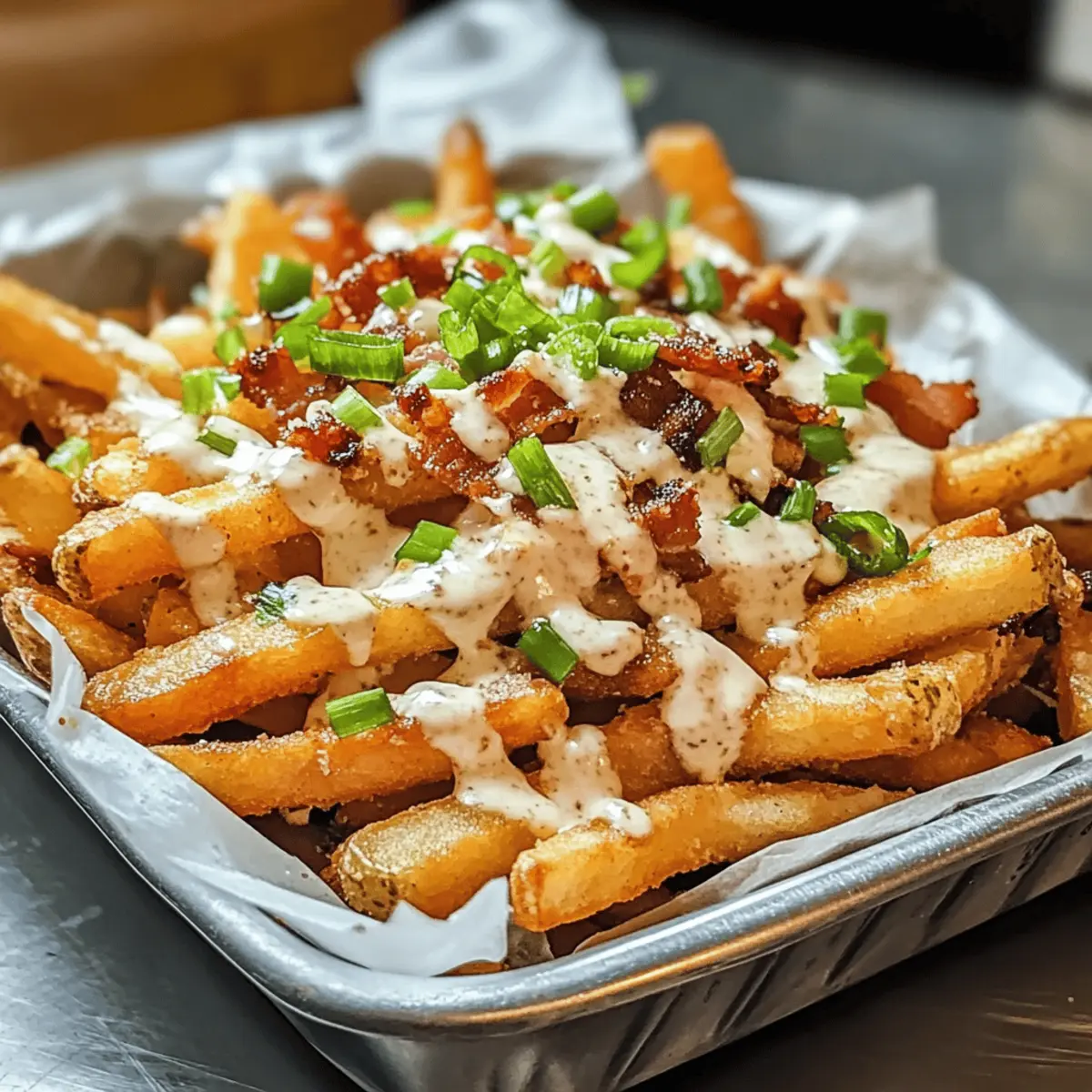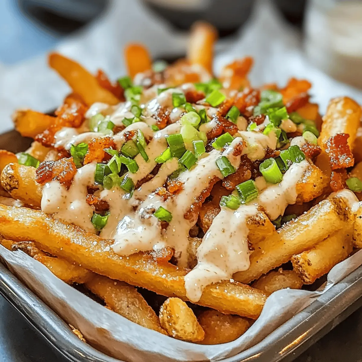 6. Servieren: Drizzeln Sie die würzige Soße über die Pommes und servieren Sie sie sofort.