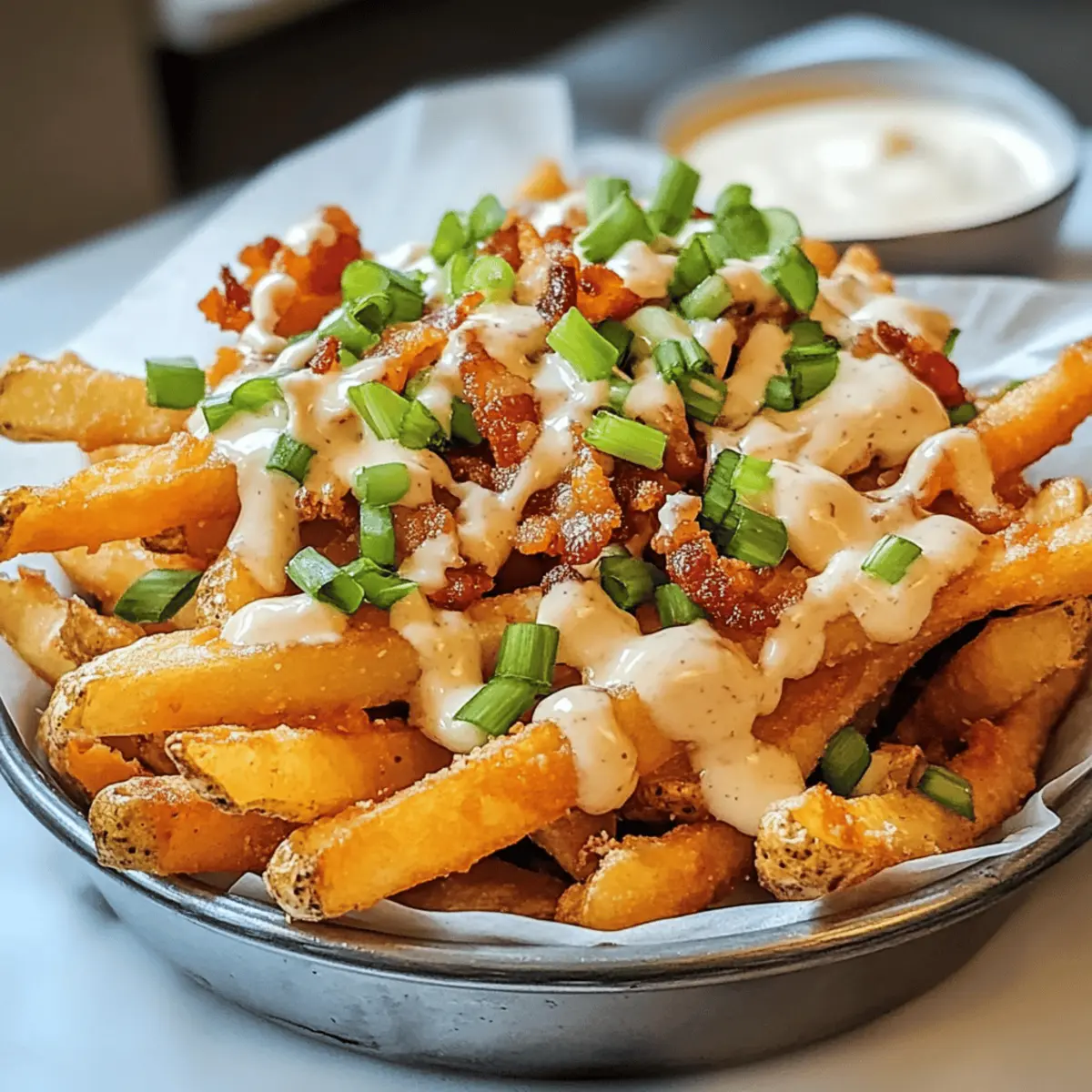Drizzeln Sie die cremige, würzige Soße großzügig über die geladenen Pommes und dekorieren Sie sie mit zusätzlichen Frühlingszwiebeln. Servieren Sie die Louisiana Voodoo Pommes sofort, während sie heiß und knusprig sind. Diese köstlichen Pommes sind ein Hit bei jedem Snack oder jeder Feier!