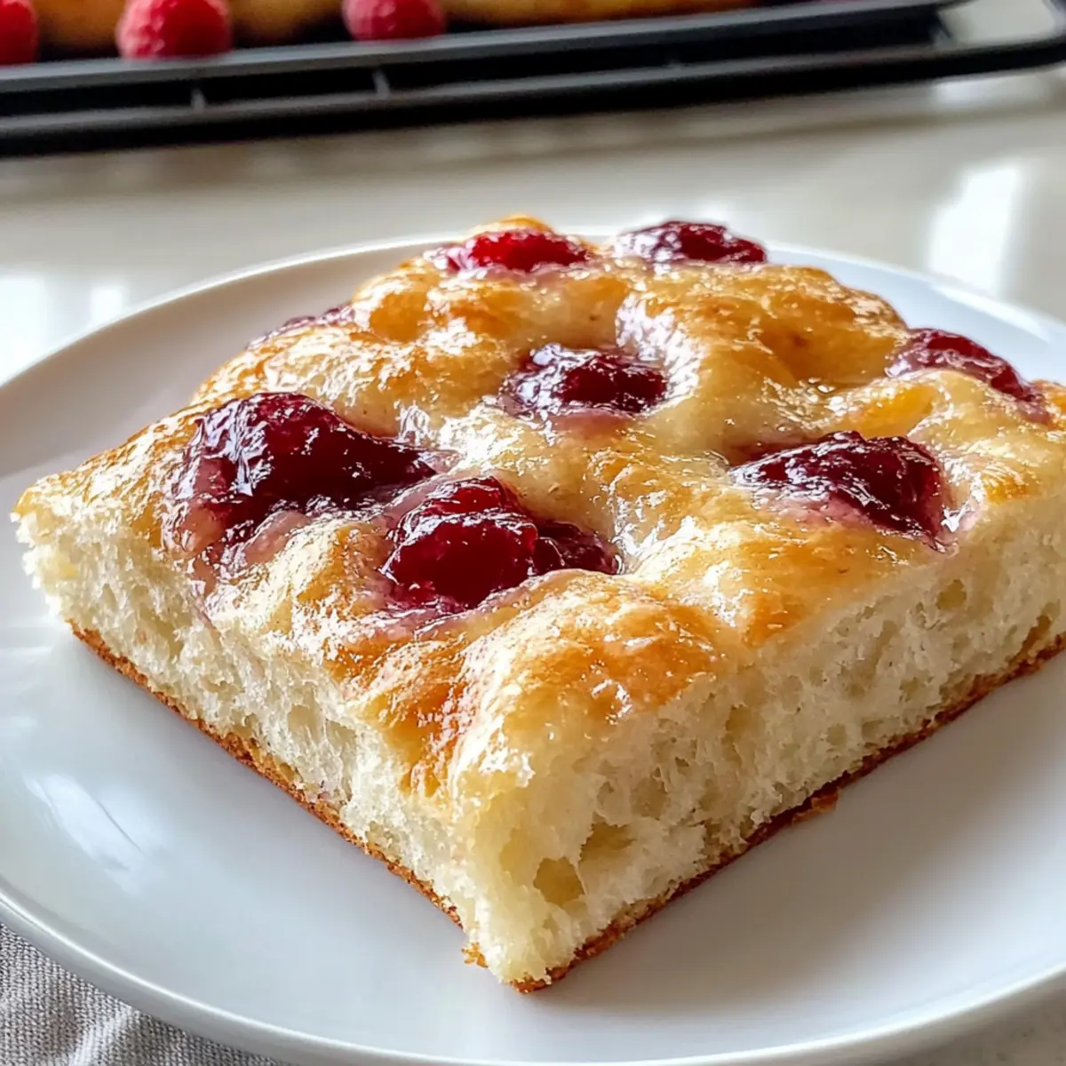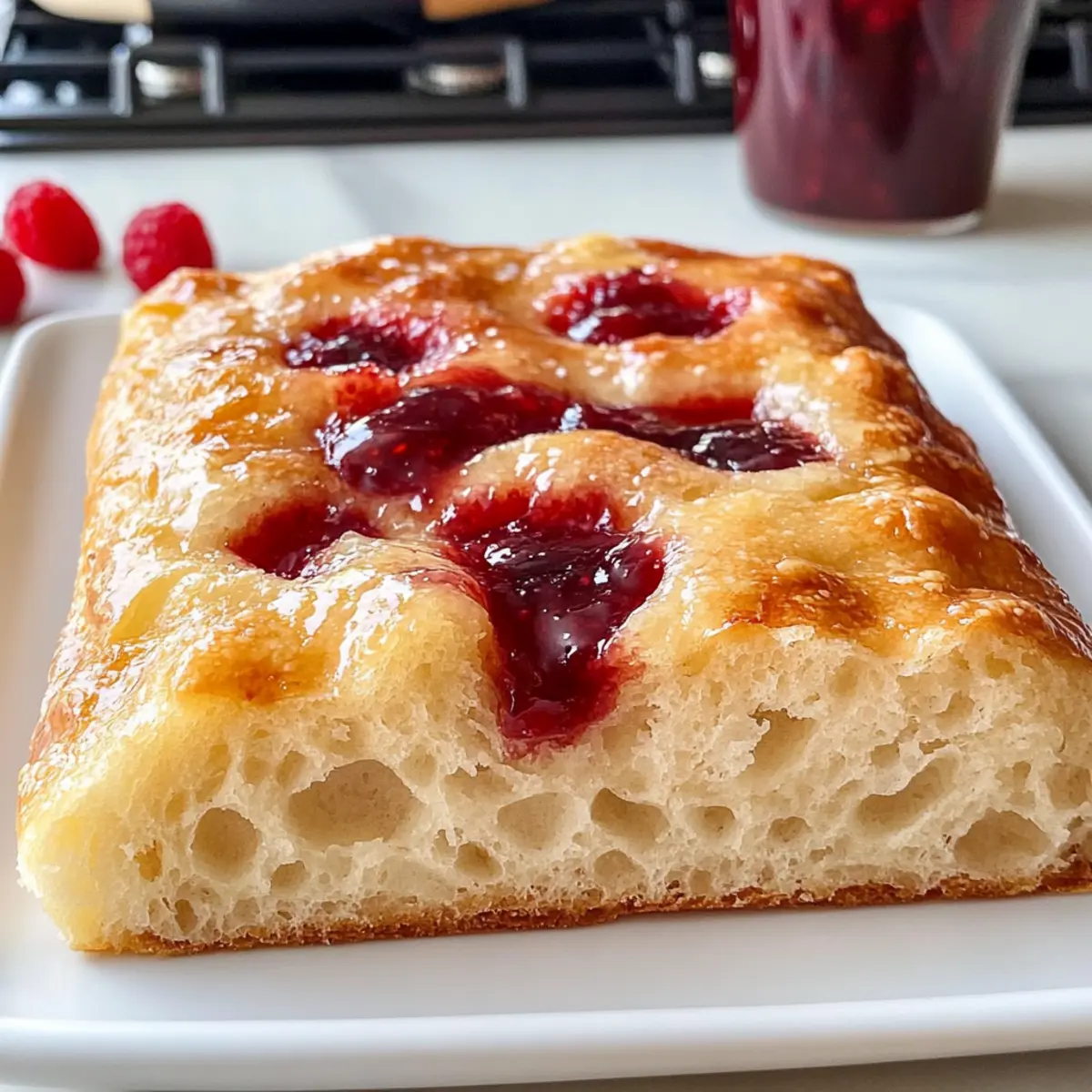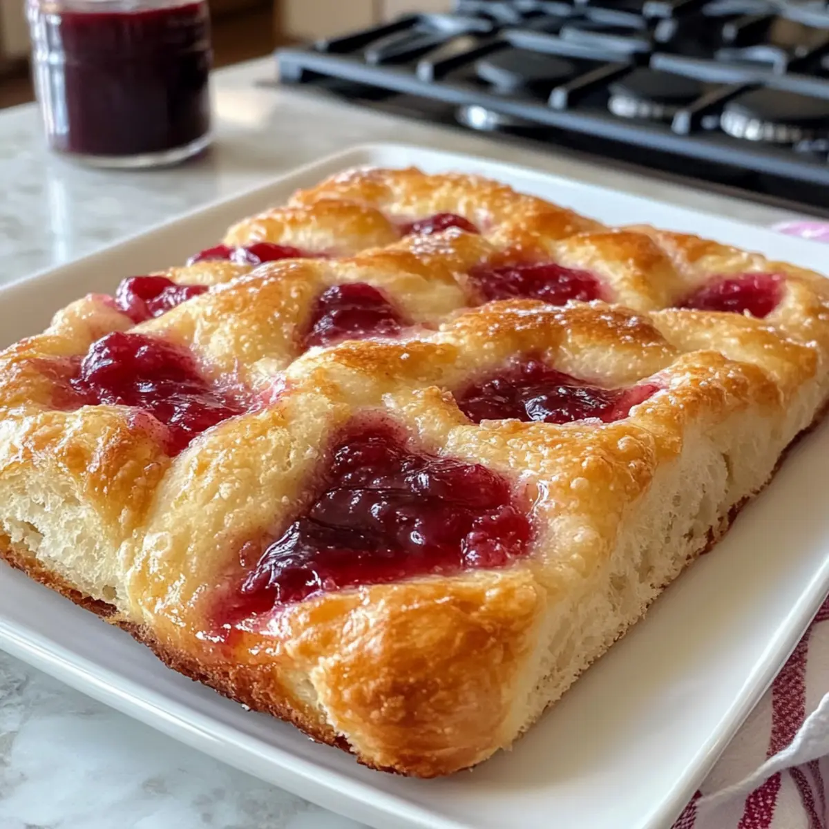 Der Duft frisch gebackenen Brotes, mischt sich mit der süßen Note von Fruchtkonfitüre, und schon ist meine Neugier geweckt! Heute zeige ich euch, wie ihr eine köstliche Marmeladenkrapfen-Focaccia zaubern könnt – eine perfekte Kombination aus dem luftigen Teig einer Focaccia und den unwiderstehlichen Aromen eurer liebsten Marmeladensorten. Dieses Rezept ist nicht nur einfach zuzubereiten, sondern eignet sich auch hervorragend als brunch-taugliches Comfort Food, das alle begeistert. Egal ob ihr nostalgische Kindheitserinnerungen aufleben lassen oder eine neue, süße Frühstücksüberraschung kreieren möchtet, diese Focaccia wird euch umhauen! Bist du bereit, dich dem unwiderstehlichen Aroma hinzugeben und mehr über diese köstliche Spezialität zu erfahren? Warum wirst du diese Focaccia lieben? Einzigartige Kombination: Diese Marmeladenkrapfen-Focaccia vereint das Beste aus beiden Welten – die luftige Textur von Focaccia und den süßen Geschmack von Marmeladenkrapfen. Einfache Zubereitung: Die Schritte sind unkompliziert, sodass auch Kochanfänger ihre Freude daran haben werden. Vielseitige Geschmäcker: Experimentiere mit verschiedenen Marmeladesorten, von Himbeere bis Aprikose, um deine persönliche Lieblingsversion zu kreieren. Perfekt für den Brunch: Diese Focaccia ist nicht nur köstlich, sondern sorgt auch für Staunen bei deinen Gästen und ist der ideale Begleiter zu Kaffee oder Tee. Wenn du noch mehr leckere Ideen suchst, schau dir auch unsere sonnigen Brunch-Rezepte an! Zeitsparend: Die Zubereitungszeit ist schnell, perfekt für träge Sonntage, an denen der Duft frisch gebackenen Brotes dein Zuhause erfüllt. Köstliches Erlebnis: Jedes Stück ist ein Genuss, der Erinnerungen weckt und gleichzeitig einen neuen Favoriten bietet! Marmeladenkrapfen-Focaccia Zutaten • Erlebe den süßen Genuss dieser Marmeladenkrapfen-Focaccia mit den folgenden Zutaten! Für den Teig Warmes Wasser (105-115°F) – Aktiviert die Hefe und sorgt dafür, dass der Teig schön aufgeht; achte darauf, dass es nicht zu heiß ist! Zucker – Nährt die Hefe und verleiht dem Teig eine süße Note. Aktive Trockenhefe – Das Geheimnis für die luftige Konsistenz der Focaccia; benutze instant Hefe, um sie direkt zu den trockenen Zutaten zu geben. Brotmehl – Sorgt für Struktur und die perfekte Kautschbarkeit; du kannst es durch Allzweckmehl ersetzen, wenn du eine zartere Textur möchtest. Allzweckmehl – Macht den Teig weich und fluffig; können bei Bedarf zusätzlich Brotmehl verwenden. Salz – Verbessert den Geschmack und stärkt das Gluten. Olivenöl – Verleiht dem Teig Feuchtigkeit und verhindert das Ankleben; nutze es auch zum Einölen der Schüssel und des Teigs. Für die Füllung und Glasur Himbeermarmelade – Sorgt für die süßen, fruchtigen Pockets in der Focaccia; kann durch andere Marmeladensorten nach Belieben ersetzt werden. Puderzucker – Für die süße Glasur, die dem Ganzen den letzten Schliff gibt; passe die Milch an, um die gewünschte Konsistenz zu erreichen. Vollmilch – Verleiht der Glasur die richtige Fließfähigkeit für ein gleichmäßiges Verteilen. Step-by-Step Instructions für Marmeladenkrapfen-Focaccia Step 1: Wasser und Zucker vermengen In einer Schüssel der Küchenmaschine warmes Wasser (105-115°F) und Zucker kombiniert, bis der Zucker vollständig aufgelöst ist. Die richtige Temperatur ist wichtig, damit die Hefe aktiviert wird. Anschließend die aktive Trockenhefe einrühren und 5 Minuten ruhen lassen, bis sich eine schaumige Schicht bildet. Step 2: Teig zubereiten Setze den Knethaken auf die Küchenmaschine und füge Brotmehl, Allzweckmehl und Salz hinzu. Mische alles, bis ein klebriger Teig entsteht, der sich von den Wänden der Schüssel löst. Dieser Teig wird die Basis für deine köstliche Marmeladenkrapfen-Focaccia sein. Step 3: Erste Gehzeit Übersetze den Teig in eine mit Olivenöl eingebannte Schüssel und decke ihn mit einem feuchten Tuch ab. Lass den Teig an einem warmen Ort für etwa 1 Stunde gehen, bis er sich verdoppelt hat. Achte darauf, dass die Umgebung warm und zugfrei ist, um optimale Ergebnisse zu erzielen. Step 4: Teig in die Form bringen Fette eine 9×13 Zoll große Backform leicht mit Öl ein. Bewege den aufgegangenen Teig vorsichtig in die Form und falte ihn dabei mehrmals. Lass ihn erneut für ca. 1 Stunde steigen, bis er sich wieder deutlich vergrößert hat. Dies ist der Schlüssel zu einer luftigen Focaccia. Step 5: Ofen vorheizen und Dellen machen Heize den Backofen auf 425°F (220°C) vor. Gib etwas Olivenöl auf die Oberfläche des Teigs und forme mit deinen Fingern tiefe Dellen, die später die Marmelade halten werden. Diese Dellen sind wichtig für die optimale Jam-Füllung in deiner Marmeladenkrapfen-Focaccia. Step 6: Marmelade auftragen und backen Verteile die Himbeermarmelade gleichmäßig auf dem Teig, sodass die Dellen gefüllt sind. Backe die Focaccia für 18-22 Minuten, bis sie goldbraun und leicht knusprig ist. Achte darauf, dass die Oberseite schön braun wird, während der Teig innen weich bleibt. Step 7: Marmelade nachfüllen und glasieren Sobald die Focaccia aus dem Ofen kommt, steche sofort mit einem Holzlöffel zusätzliche Löcher hinein, um mehr Marmelade einzufüllen. Lass die Focaccia etwas abkühlen und bereite währenddessen die Glasur vor. Step 8: Glasur zubereiten Mische Puderzucker mit etwas Vollmilch, bis eine glatte, streichfähige Glasur entsteht. Gib die Glasur über die noch warmen Focaccia und achte darauf, dass sie gleichmäßig verteilt ist. So erhält die Marmeladenkrapfen-Focaccia eine süße und ansprechende Oberfläche. Vorbereitung der Marmeladenkrapfen-Focaccia für stressfreie Tage Diese Marmeladenkrapfen-Focaccia ist ideal für die Vorbereitung, sodass du wertvolle Zeit sparen kannst! Du kannst den Teig bis zu 24 Stunden im Voraus zubereiten und nach der ersten Gehzeit im Kühlschrank aufbewahren. Einfach den gegangenen Teig in die Form bringen und abdecken, bevor du ihn in de