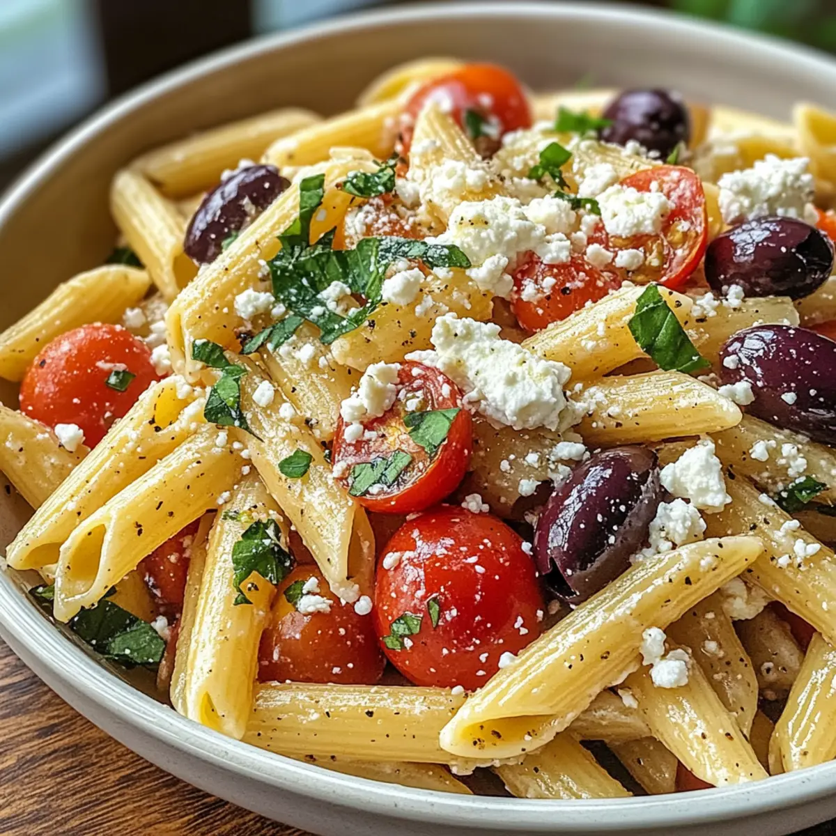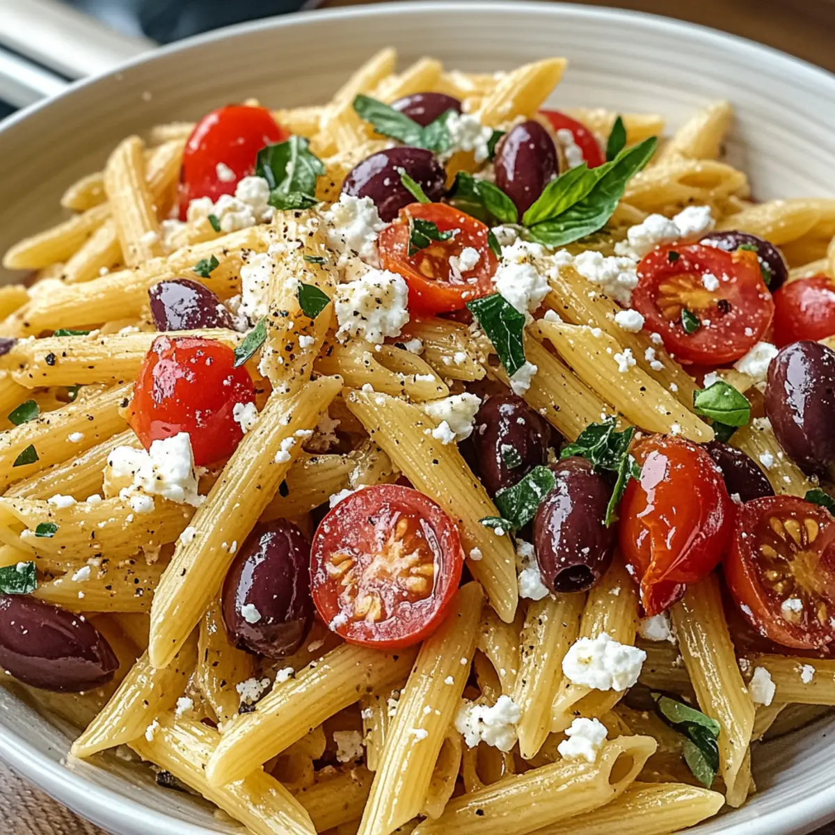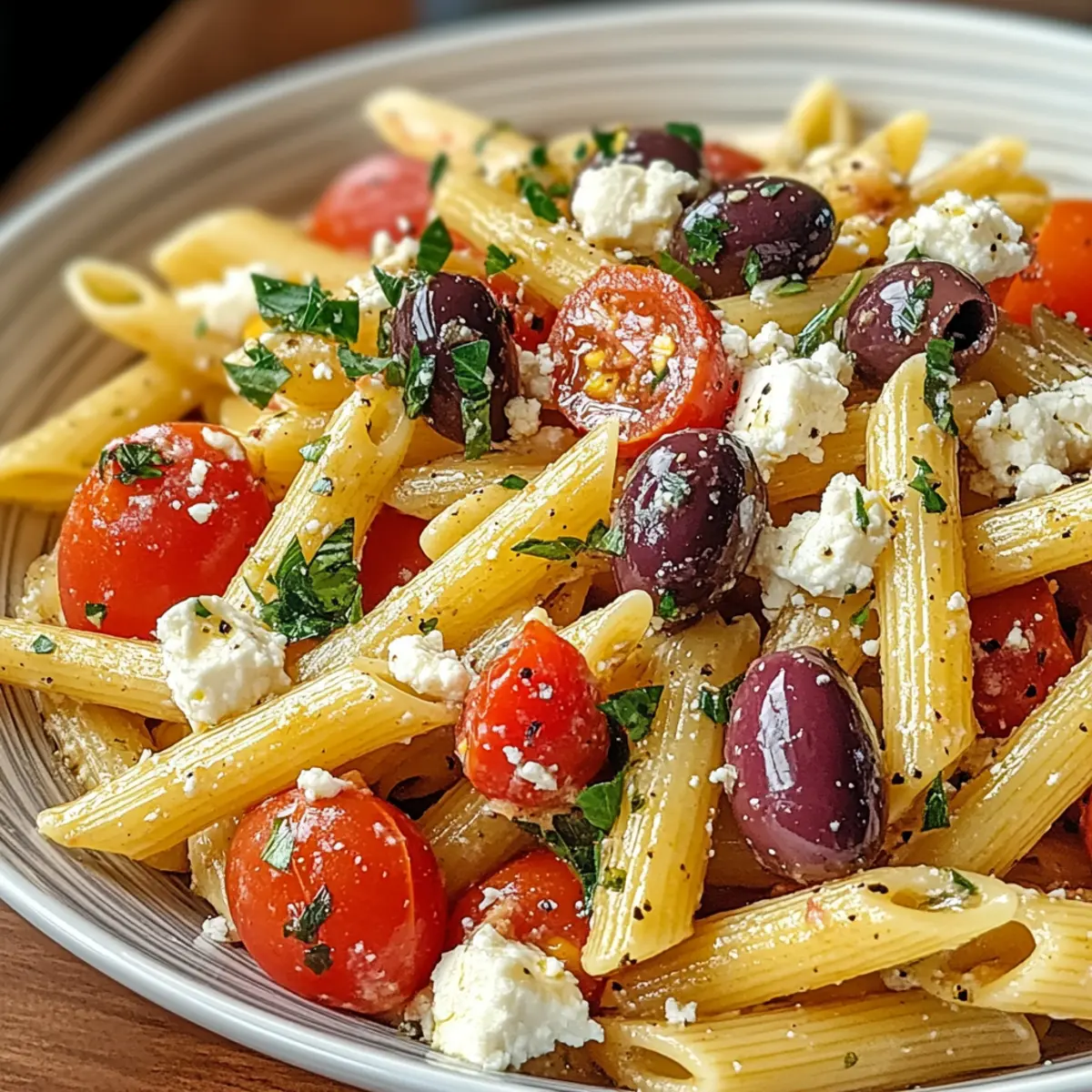 Entdecke die frischen und köstlichen Zutaten für deine Mediterrane griechische Pasta mit Feta!