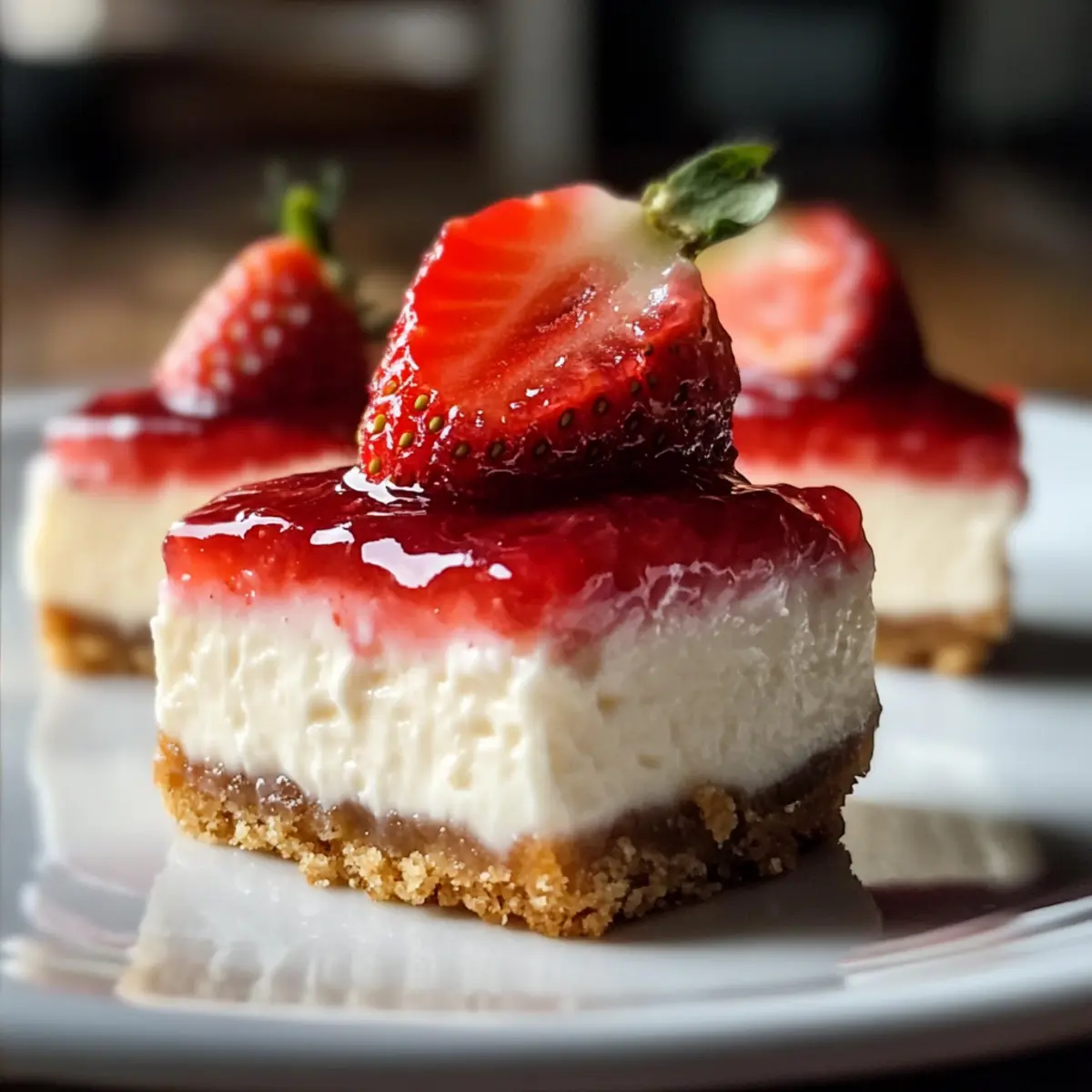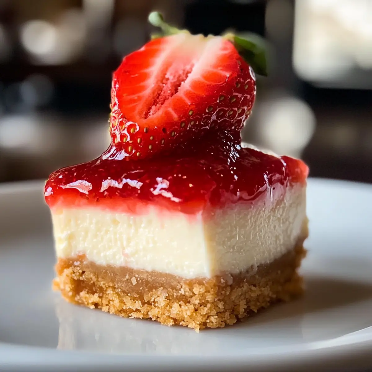 Vor dem Servieren jeden Käsekuchen-Biss mit einem Klecks Erdbeermarmelade und einer frischen Erdbeerscheibe dekorieren. Das sieht nicht nur hübsch aus, sondern verstärkt auch den fruchtigen Geschmack – bereit für ein süßes Valentinstags-Vergnügen!