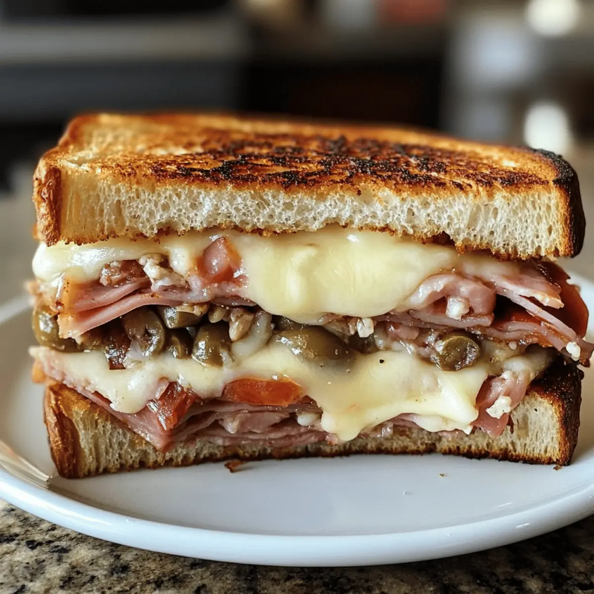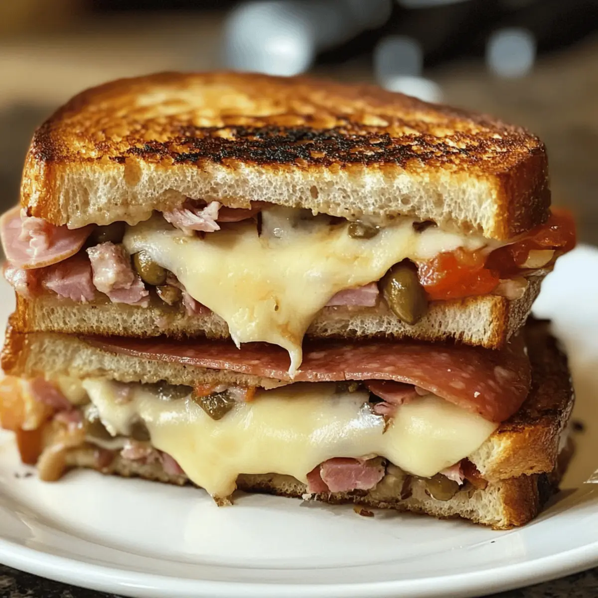 Muffuletta Gegrillter Käse ist ein köstliches Sandwich mit geschmolzenem Käse und mediterranem Flair, ideal für gesellige Abende.