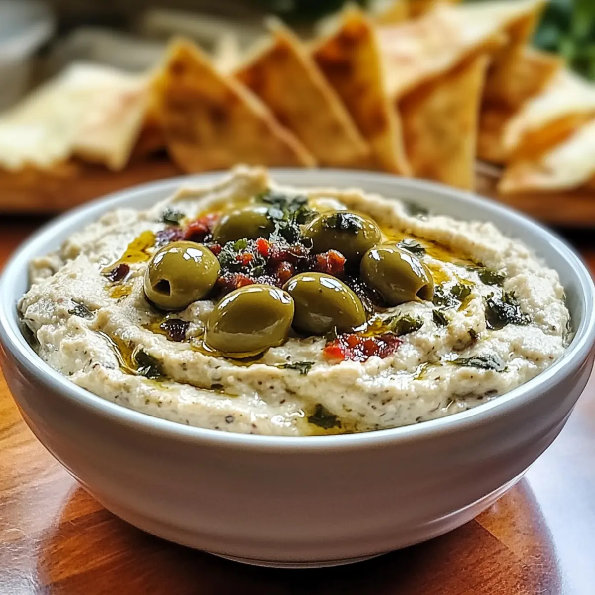 Übertrage den Dip in eine ansprechende Servierschüssel. Erhöhe die Mitte leicht für eine optisch ansprechende Präsentation, während du mit etwas Olivenöl drüber träufelst. Garniere den Dip mit einigen ganzen grünen Oliven, um sowohl Geschmack als auch visuelle Attraktivität zu erhöhen.