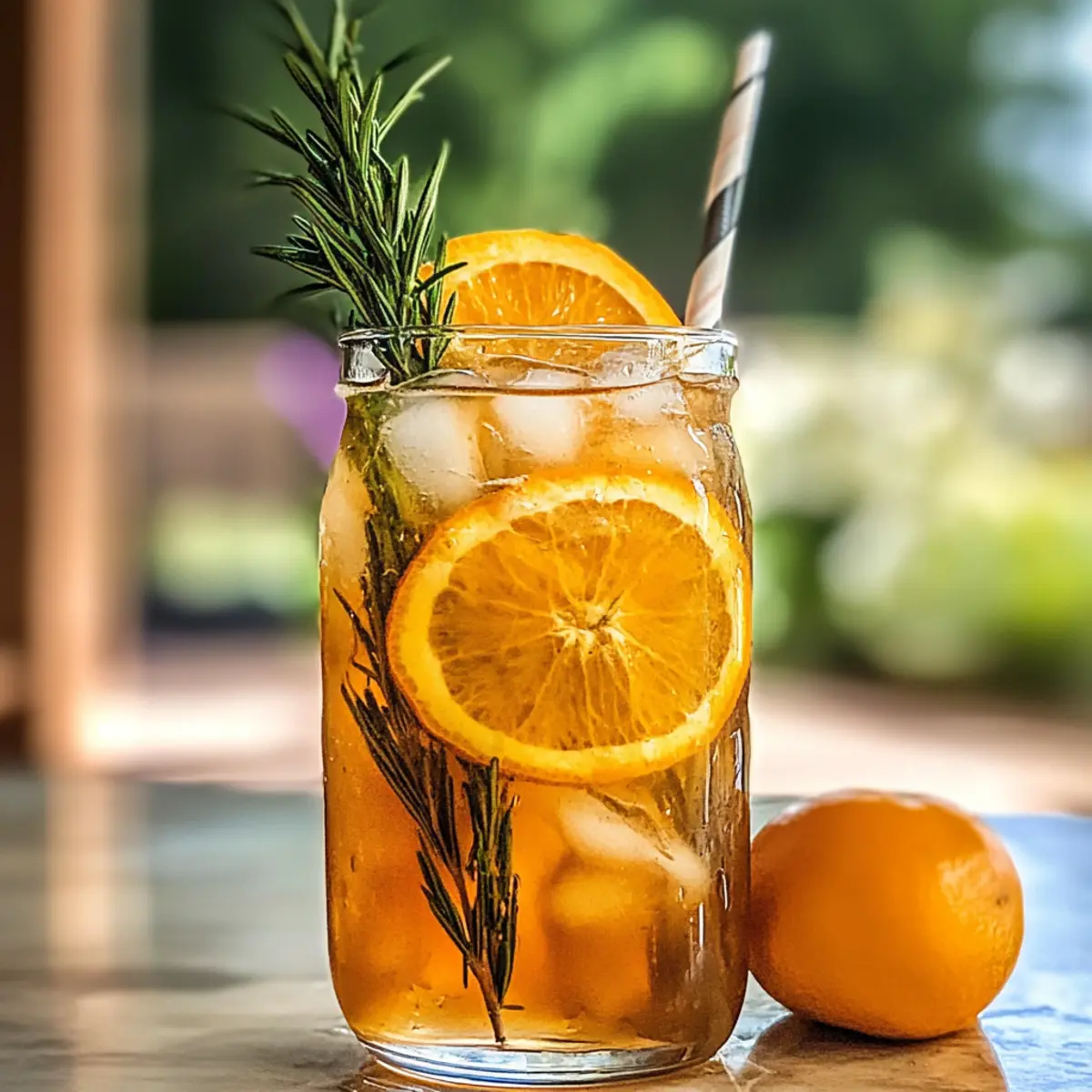 An einem sonnigen Nachmittag, an dem die Luft nach frischen Zitrusfrüchten riecht, stand ich vor der Herausforderung, mein Durstgefühl zu stillen. Warum nicht etwas erfrischendes, das Sommer und Gemütlichkeit vereint? Das Ergebnis war mein erfrischender Orange Rosmarin Eistee – eine köstliche Mischung aus frisch gepresstem Orangensaft, aromatischer Rosmarin und einem Hauch Ingwer. Diese Kombination ist nicht nur schnell zubereitet, sondern bringt auch eine gesunde Alternative zu zuckerhaltigen Getränken auf den Tisch. Perfekt für gesellige Treffen oder entspannte Momente allein, dieser Eistee verspricht Erfrischung und Genuss in jedem Schluck. Bereit, das Sommergefühl in dein Glas zu zaubern? Warum wirst du diesen Eistee lieben? Einzigartiger Geschmack: Die Kombination aus frischem Orangensaft und aromatischem Rosmarin verleiht diesem Eistee einen unvergleichlichen Geschmack, der den Sommer perfekt einfängt. Einfach zuzubereiten: Mit minimale Zutaten und einem einfachen Rezept ist dieser Eistee in kürzester Zeit fertig und sorgt für spontane Erfrischung. Vielfältig unkomplizierbar: Du kannst ihn ganz nach deinem Geschmack anpassen, sei es durch die Wahl von Teesorten oder das Hinzufügen von weiteren Kräutern wie frischer Minze. Ideal für jeden Anlass: Ob bei einer Grillparty, einem Picknick im Park oder einfach zum Entspannen nach einem langen Tag, dieser Eistee bringt Freude und Erfrischung in jede Situation. Gesunde Wahl: Mit wenig Zucker und voller Vitamine ist er eine großartige Alternative zu gesüßten Limonaden und sorgt dafür, dass du gut hydriert bleibst. Orange Rosmarin Eistee Zutaten • Für den perfekten Mix: Wasser – Basisflüssigkeit zum Aufbrühen; verwende gefiltertes Wasser für den besten Geschmack. • Für die Teebasis: Schwarztee-Beutel – sorgt für den kräftigen Geschmack; du kannst jede Art von schwarzem Tee (z.B. Assam, Ceylon oder Lipton) benutzen. • Für die Frische: Große Orange (ausgepresst und abgerieben) – Quelle des Zitrusgeschmacks und der Süße; wähle frische, biologische Orangen für mehr Aroma. Frischer Rosmarin (3 Zweige, dünn geschnitten) – gibt eine erdige, nussige Note; achte auf lebendige, aromatische Zweige. Frischer Ingwer (1 EL) – bringt eine subtile scharfe Note; verwende festen, aromatischen Ingwer und schneide ihn dünn für besseren Geschmack. • Für die Süße: Zucker (2-3 EL, nach Geschmack anpassen) – balanciert die Aromen; optional, kann durch Stevia ersetzt oder weggelassen werden. Achte darauf, ihn hinzuzufügen, während der Tee warm ist, damit er sich vollständig auflöst. • Zum Servieren: Eiswürfel – kühlen den Tee beim Servieren. Garnitur (optional) – Orangenscheiben und Rosmarinzweige verbessern die Präsentation. Dieser Orange Rosmarin Eistee wird zum echten Highlight an heißen Tagen! Schritt-für-Schritt-Anleitung für den Erfrischenden Orange Rosmarin Eistee Step 1: Wasser aufkochen Bringe in einem mittelgroßen Topf 4 Tassen gefiltertes Wasser zum Kochen. Achte darauf, dass das Wasser sprudelnd kocht, um die perfekte Basis für deinen Orange Rosmarin Eistee zu schaffen. Dies dauert in der Regel etwa 5 bis 7 Minuten, abhängig von deiner Herdplatte. Step 2: Teesorten und Zutaten hinzufügen Nehme den Topf vom Herd und füge 3 Schwarztee-Beutel, dünn geschnittenen frischen Rosmarin, die abgeriebene Schale der großen Orange und die Ingwerscheiben hinzu. Lass die Mischung für 5 bis 7 Minuten ziehen, um die Aromen freizusetzen. Du wirst merken, dass sich die Farbe des Wassers intensiviert, was auf die Extraktion der Teearomen hinweist. Step 3: Teebeutel entfernen Entferne nach der Ziehzeit die Teebeutel vorsichtig. Du wirst das kräftige Aroma deines Orange Rosmarin Eistees wahrnehmen können. Achte darauf, nicht zu lange zu ziehen, da der Tee sonst bitter werden kann. Rühre die Mischung sanft um, um sicherzustellen, dass alles gut verteilt ist. Step 4: Zucker einrühren Streue 2 bis 3 Esslöffel Zucker (je nach Geschmack) in die noch warme Teemischung und rühre, bis sich der Zucker vollständig aufgelöst hat. Diese Wärme hilft dabei, die Süße gleichmäßig zu verteilen. Der Orange Rosmarin Eistee sollte jetzt süß und aromatisch duften. Step 5: Zutaten abseihen Seihe die Mischung durch ein feinmaschiges Sieb, um die Rosmarinzweige, die Schale und die Ingwerscheiben zu entfernen. Sobald das abgeschöpfte Getränk klar und rein ist, gib den frisch gepressten Orangensaft dazu. Dieser Schritt bringt eine frische und lebendige Zitrusnote in deinen Eistee. Step 6: Abkühlen lassen Lass den Orange Rosmarin Eistee auf Raumtemperatur abkühlen. Du kannst eine Karaffe benutzen, um den Prozess zu erleichtern. Während der Tee abkühlt, werden sich die Aromen weiter entfalten. Es ist wichtig, ihn nicht zu lange warm zu lassen, um die optimale Erfrischung zu gewährleisten. Step 7: Kühlen im Kühlschrank Stelle den Eistee in den Kühlschrank und lasse ihn mindestens 2 bis 3 Stunden kalt werden. Dies ist entscheidend, um den perfekten Erfrischungsgrad zu erreichen. Du kannst auch über Nacht kühlen, wenn du ihn am nächsten Tag servieren möchtest. Step 8: Servieren Fülle Gläser mit Eiswürfeln und gieße den kühlen Orange Rosmarin Eistee darüber. Du kannst nach Belieben mit Orangenscheiben und frischen Rosmarinzweigen garnieren, um eine ansprechende Präsentation zu erzielen. Der Eistee sollte kühl und erfrischend sein, perfekt für einen heißen Sommertag! Tipps für den besten Orange Rosmarin Eistee Frische Zutaten: Verwende nur frische Orangen und aromatischen Rosmarin. Sie sorgen für den intensiven Geschmack deines Orange Rosmarin Eistees. Ziehen lassen: Lass den Tee nicht zu lange ziehen, um Bitterkeit zu vermeiden. 5-7 Minuten sind optimal für eine harmonische Aromenentfaltung. Zucker richtig einrühren: Füge den Zucker hinzu, während der Tee noch warm ist. So löst er sich vollständig auf und balanciert die Aromen perfekt. Variationen ausprobieren: Experimentiere mi