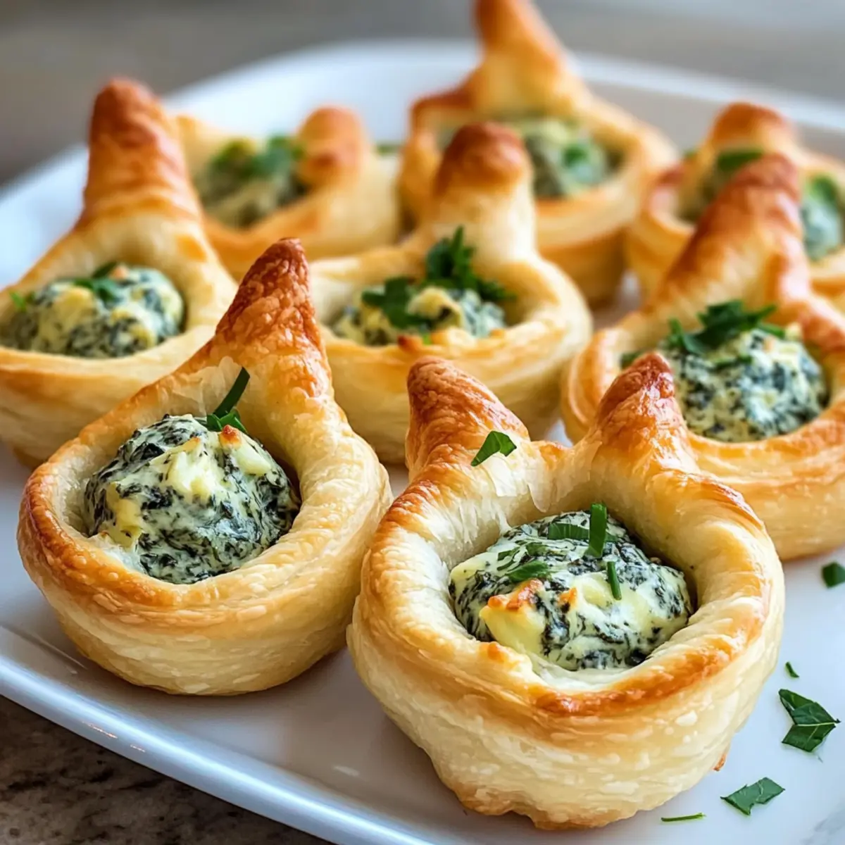 Die Sonne scheint, und ich erinnere mich an die Freude, die der Frühling mit sich bringt. In dieser fröhlichen Jahreszeit sind die Osterhasen-Croissant-Bissen genau das Richtige, um Ihre Gäste zu begeistern. Diese niedlichen Häppchen überzeugen nicht nur durch ihr spielerisches Design mit den liebenswürdigen Kaninchenohren, sondern auch durch die cremige Füllung aus Spinat und Artischocken. Schnell und einfach zubereitet in weniger als 30 Minuten, sind sie der perfekte vegetarische Snack für Ihre Osterfeier oder jedes Frühlingsfest. Die Kombination aus knusprigem Teig und einer herzhaften Füllung wird sowohl bei Kindern als auch bei Erwachsenen für Begeisterung sorgen. Neugierig darauf, wie Sie diese köstlichen Bissen in Ihre nächsten Feierlichkeiten integrieren können? Warum sind Osterhasen-Croissant-Bissen so beliebt? Einfachheit in Perfektion: Diese Bissen sind nicht nur schnell und einfach zuzubereiten, sie benötigen auch keine speziellen Kochkünste. Köstlicher Geschmack: Die Kombination aus cremiger Spinat-Artischocken-Füllung und knusprigem Croissant-Teig verspricht ein Fest für die Sinne. Flexibilität: Passen Sie die Füllung nach Ihrem Geschmack an und genießen Sie unterschiedliche Variationen, von Hummus bis zu veganen Alternativen. Ideal für jedes Fest: Ob zu Ostern oder einem gemütlichen Frühlingsbrunch, diese Bissen bringen Freude auf jeden Tisch. Schau dir auch unsere anderen vegetarischen Snacks an, die deine Gäste begeistern werden! Osterhasen-Croissant-Bissen Zutaten • Entdecken Sie die köstlichen Ingredienzen für Ihre Osterhasen-Croissant-Bissen! Für den Teig Crescent-Teig – Bietet die perfekte, buttrige Kruste für Ihre Füllung; halten Sie den Teig kühl für sauberere Schnitte. Für die Füllung Gefrorener Spinat – Verleiht Farbe und klassischen Geschmack; achten Sie darauf, die überschüssige Feuchtigkeit abzutropfen, um matschige Bissen zu vermeiden. Artischockenherzen – Fügen Sie einen würzigen, herzhaften Geschmack hinzu; gut abtropfen und klein schneiden für die beste Konsistenz. Frischkäse – Kreiert eine reichhaltige, cremige Basis; verwenden Sie vegane Frischkäse-Alternativen für eine milchfreie Version. Sauerrahm – Steigert die Cremigkeit und fügt einen leicht säuerlichen Geschmack hinzu. Parmesan – Verleiht die salzige, nussige Note, die die Füllung aufwertet. Frische Kräuter (Petersilie oder Schnittlauch) – Bringen Sie Farbe und frischen Geschmack; anpassbar je nach Vorliebe. Zwiebel – Fein gewürfelt für Tiefe und herzhaften Geschmack. Knoblauch – Unverzichtbar für die Geschmacksteigerung; frischen Knoblauch verwenden. Salz – Bringt alle Aromen im Gericht zur Geltung. Genießen Sie die Zubereitung dieser köstlichen Osterhasen-Croissant-Bissen und begeistern Sie Ihre Gäste mit etwas ganz Besonderem! Schritt-für-Schritt-Anleitung für Osterhasen-Croissant-Bissen Step 1: Ofen vorheizen Heizen Sie den Ofen auf 180 °C vor und bereiten Sie eine Mini-Muffinform mit einer Antihaft-Sprühbeschichtung vor. Legen Sie ein Backblech mit Backpapier aus, um die frisch gebackenen Osterhasen-Croissant-Bissen zu platzieren und ein Ankleben zu vermeiden. Step 2: Teig vorbereiten Öffnen Sie die Packung des Crescent-Teigs und rollen Sie den Teig aus. Drücken Sie die Nähte zusammen, um flache Rechtecke zu bilden. Schneiden Sie mit einem runden Ausstecher (ca. 5–7 cm Durchmesser) Kreise aus, um sie in die Muffinform zu legen und eine grundierte Form zu schaffen. Step 3: Teig in Muffinform drücken Legen Sie die Teigkreise vorsichtig in die vorbereiteten Muffinförmchen. Verwenden Sie eine Gabel, um kleine Löcher in den Boden zu stechen, sodass beim Backen Dampf entweichen kann und die Teigschalen schön knusprig werden. Step 4: Hasenohren formen Schneiden Sie den restlichen Teig in Paare von Hasenohren (ca. 2–4 cm hoch). Formen Sie die Ohren, indem Sie sie leicht und liebevoll kneten. Arrangieren Sie sie anschließend auf dem vorbereiteten Backblech, damit sie gleichmäßig backen können. Step 5: Backen der Ohren und Tassen Backen Sie die Hasenohren für 3–5 Minuten und die Croissant-Tassen für 8–10 Minuten, bis sie goldbraun sind. Achten Sie während des Backens darauf, dass die Teigstücke nicht verbrennen, sondern eine ansprechende Farbe annehmen. Step 6: Füllung zubereiten Bereiten Sie die Spinat-Artischocken-Füllung vor, indem Sie alle Füllzutaten in einer großen Schüssel gründlich vermischen. Achten Sie darauf, den gefrorenen Spinat vorher gut abzutropfen, damit die Füllung die richtige Konsistenz erhält. Reserve die Mischung für die nächsten Schritte. Step 7: Tassen füllen Nach dem Backen der Croissant-Tassen drücken Sie die Mitte jeden Teigs leicht nach unten, um Platz für die Füllung zu schaffen. Füllen Sie jede Tasse großzügig mit der vorbereiteten Spinat-Artischocken-Dip-Mischung, um die Geschmäcker zu intensivieren. Step 8: Ohren anbringen Nehmen Sie die goldbraunen Hasenohren aus dem Ofen und stecken Sie sie in die Füllung der Croissant-Tassen. Die Ohren sollten gut im Dip halten und den niedlichen Charme der Osterhasen-Croissant-Bissen unterstreichen. Step 9: Garnieren und servieren Garnieren Sie die fertigen Bissen mit frischen Kräutern wie Petersilie oder Schnittlauch, um einen zusätzlichen Farbtupfer zu bieten. Servieren Sie die Osterhasen-Croissant-Bissen sofort für ein festliches Erlebnis, das Ihre Gäste erfreuen wird. Vorbereitung der Osterhasen-Croissant-Bissen für stressfreie Feierlichkeiten Die Osterhasen-Croissant-Bissen sind ideal für vielbeschäftigte Köche, da Sie Teile des Rezepts bis zu 24 Stunden im Voraus vorbereiten können. Beginnen Sie, indem Sie die Spinat-Artischocken-Füllung zubereiten und diese in einem luftdichten Behälter im Kühlschrank aufbewahren; dies erhält die Frische und verhindert, dass die Aromen verblassen. Am Tag des Servierens backen Sie die Croissant-Tassen und die Hasenohren wie im Rezept beschrieben, und füllen Sie s
