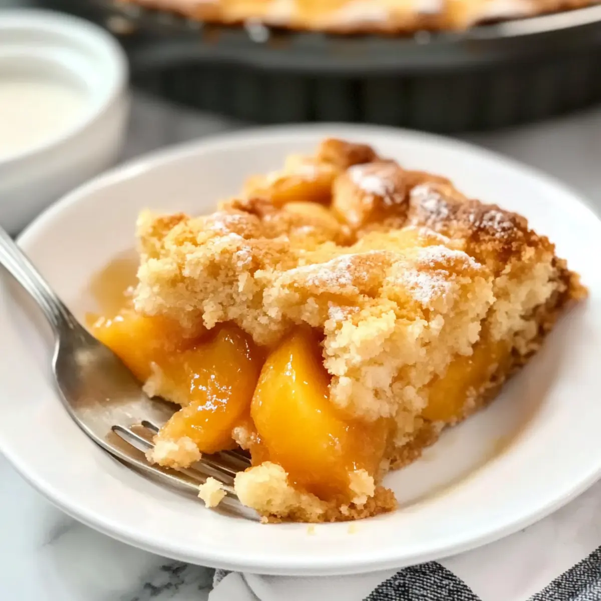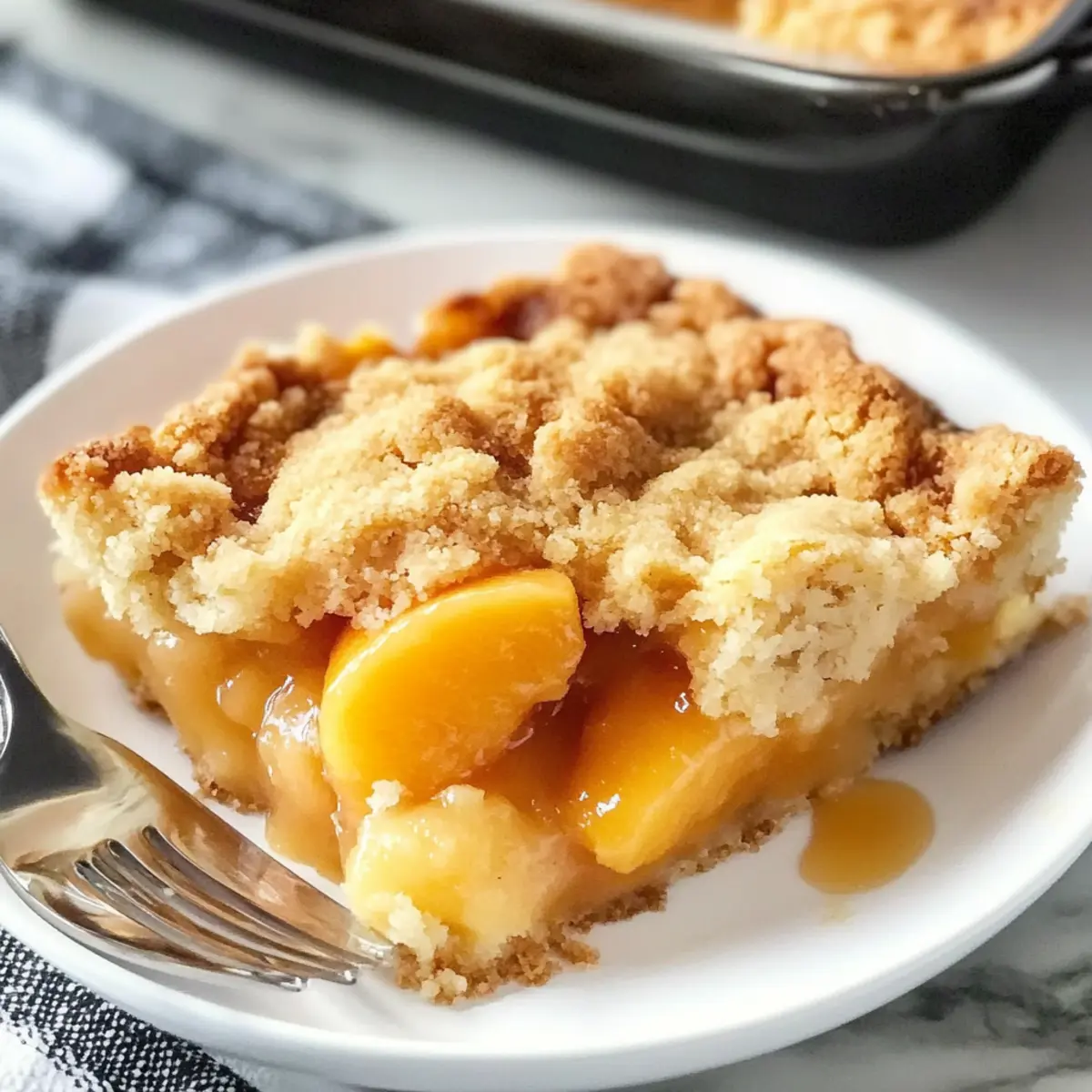 Ein einfacher Pfirsich-Dump-Kuchen, der mit nur vier Zutaten zubereitet wird und die perfekte Kombination aus warmen Pfirsichen und knusprigem Teig bietet.