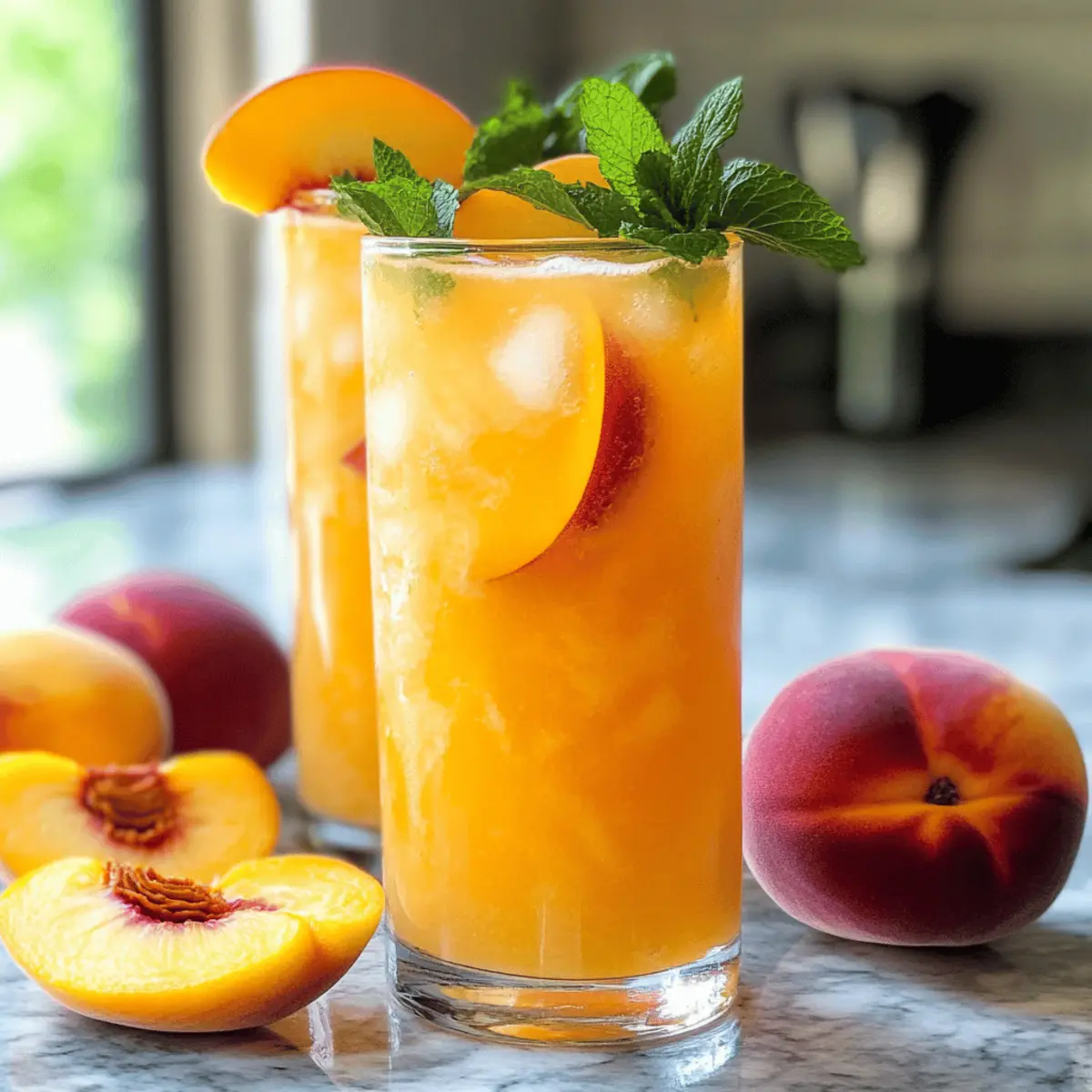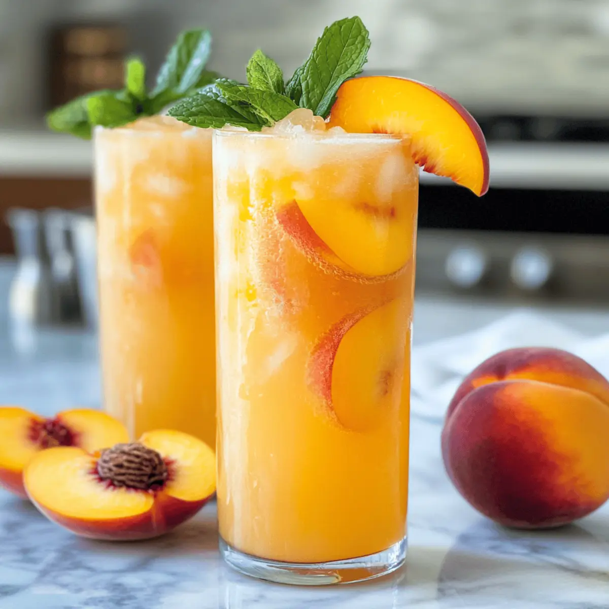 Die Sonne brennt, die Luft ist warm und ich entdecke die köstlichen Aromen, die der Sommer zu bieten hat. Inmitten all dieser herrlichen Fruchtvielfalt, erinnere ich mich an die perfekte Erfrischung: meine hausgemachte Pfirsich-Limonade. Diese Erfrischung kombiniert die süße Sanftheit reifer Pfirsiche mit der spritzigen Säure frischer Zitronen und sorgt für ein Geschmackserlebnis, das jedem Sommerfest das gewisse Etwas verleiht. Was ich an dieser Rezeptur besonders schätze? Sie ist schnell zubereitet und lässt sich einfach anpassen, wodurch sie zum idealen Durstlöscher für Grillpartys und Picknicks wird. Wer kann schon einem Glas dieser köstlichen Pfirsich-Limonade widerstehen? Neugierig, wie ihr selbst dieses erfrischende Getränk zaubern könnt? Warum wird diese Pflirsich-Limonade Ihre Sommerliebe? Einfachheit: Die Zubereitung ist kinderleicht! Mit nur wenigen Zutaten und einer kurzen Anleitung ist dieser Durstlöscher im Handumdrehen bereit. Fruchtige Frische: Der süße Geschmack reifer Pfirsiche harmoniert perfekt mit der spritzigen Zitrone und bringt die Aromen des Sommers direkt in Ihr Glas. Vielseitig: Passen Sie das Rezept nach Ihrem Geschmack an! Fügen Sie frische Minze oder Basilikum hinzu, oder probieren Sie die sprudelnde Variante für einen prickelnden Genuss. Perfekt für Partys: Egal, ob für eine Grillparty oder ein Picknick, diese Pfirsich-Limonade wird bei Ihren Gästen garantiert für Begeisterung sorgen! Schauen Sie auch bei unseren Ideen für variierte Limonade vorbei, um Ihren Sommer zu bereichern. Erfrischend und gesund: Sie enthält frische Zutaten und kann ganz nach Wunsch gesüßt werden – ideal für eine gesunde Erfrischung an heißen Tagen. Pfirsich-Limonade Zutaten • Um die perfekte Pfirsich-Limonade zu kreieren, benötigen Sie folgende frische Zutaten: Für die Limonade Frische Pfirsiche – verleihen der Limonade eine natürliche Süße und das unverwechselbare Pfirsicharoma; verwenden Sie reife Pfirsiche für den besten Geschmack. Frischer Zitronensaft – sorgt für die spritzige Säure, die die Süße der Pfirsiche exquisit ausbalanciert; frisch gepresst ist für das Aroma entscheidend. Wasser – verdünnt die Mischung zu einer trinkbaren Konsistenz; verwenden Sie gefiltertes Wasser für optimalen Geschmack. Zucker – süßt die Limonade nach Ihrem Geschmack; Alternativen wie Honig oder Agavendicksaft sind ebenfalls möglich. Frische Minze – bringt zusätzliches Aroma und Frische; ideal für die Garnitur und als geschmackliche Bereicherung. Schritt-für-Schritt-Anleitung für Pfirsich-Limonade Step 1: Limonade Zubereiten Bereiten Sie eine erfrischende Limonade zu, indem Sie frisch gepressten Zitronensaft, Wasser und Zucker nach Geschmack in einem Krug vermischen. Rühren Sie gut um, bis sich der Zucker vollständig aufgelöst hat. Dies dauert etwa 2-3 Minuten. Stellen Sie den Krug in den Kühlschrank, während Sie die Pfirsiche vorbereiten, um die Limonade kühl und frisch zu halten. Step 2: Pfirsiche Mischen Waschen Sie 3-4 reife Pfirsiche gründlich und schneiden Sie sie in kleine Stücke. Reservieren Sie ein Viertel für die Garnitur. Geben Sie die restlichen Pfirsichstücke mit einer Tasse der gekühlten Limonade und einem Esslöffel frischer Minze in einen Standmixer. Mixen Sie alles für etwa 30-40 Sekunden, bis die Mischung schön cremig und glatt ist, und bereiten Sie sich auf die nächste Phase vor. Step 3: Zutaten Kombinieren Gießen Sie die pürierte Pfirsich-Mischung in den bereitgestellten Krug mit der restlichen Limonade. Rühren Sie alles gut um, sodass sich die fruchtigen Aromen der Pfirsiche gleichmäßig verteilen. Achten Sie darauf, dass die Mischung gut vermengt ist, damit jede Portion die perfekte Balance zwischen Süße und Säure bietet. Step 4: Servieren Fügen Sie einige frische Pfirsich- und Zitronenscheiben in den Krug hinzu, um das Getränk ansprechend zu gestalten. Servieren Sie die erfrischende Pfirsich-Limonade in hohen Gläsern über Eiswürfeln. Garnieren Sie jedes Glas mit einem Minzblatt, um zusätzlichen Duft und Frische zu verleihen. Voilà, Ihre köstliche Pfirsich-Limonade ist endlich bereit zum Genießen! Tipps für die beste Pfirsich-Limonade Reife Früchte: Verwenden Sie wirklich reife Pfirsiche, da sie den intensivsten Geschmack bieten. Unreife Früchte können die Süße beeinträchtigen. Frischer Zitronensaft: Nutzen Sie frisch gepressten Zitronensaft anstelle von Flaschenvarianten. Dies sorgt für ein frischeres Aroma in Ihrer Pfirsich-Limonade. Zucker anpassen: Beginnen Sie mit weniger Zucker und fügen Sie nach Geschmack hinzu. So vermeiden Sie eine übermäßig süße Limonade. Mischungsverhältnis: Experimentieren Sie mit dem Wasseranteil, um die ideale Balance zwischen der Süße der Pfirsiche und der Säure der Zitrone zu finden. Dekoration: Garnieren Sie Ihre Limonade mit frischen Minzblättern oder Basilikum, um das Getränk optisch aufzuwerten und den Geschmack zu intensivieren. Was passt gut zu Pfirsich-Limonade? Die perfekte Begleitung zu einem erfrischenden Glas Pfirsich-Limonade kann Ihr Sommeressen vollenden und jedem Moment eine besondere Note verleihen. Gegrilltes Hähnchen: Die milden Gewürze harmonieren wunderbar mit der Süße der Limonade und schaffen eine Ausgewogenheit, die Ihre Geschmacksnerven anregt. Der rauchige Geschmack des Hähnchens ergänzt die fruchtigen Aromen der Limonade perfekt. Frischer Salat: Ein leichter, knackiger Salat mit Ziegenkäse und Walnüssen sorgt für eine erfrischende Textur und bringt eine herzhafte Note ins Spiel. Die Frische des Salats verstärkt die fruchtigen Komponenten der Pfirsich-Limonade. Pikante Nachos: Knusprige Nachos mit einer würzigen Guacamole bieten eine tolle Kontrasttextur. Die knackigen Chips und die cremige Guacamole schaffen eine perfekte Harmonie zu Ihrer süßen Limonade. Obstplatte: Eine bunte Auswahl an saisonalem Obst wie Melonen, Ananas und Erdbeeren ist nicht nur lecker, sondern auch ein visueller Genuss. Die