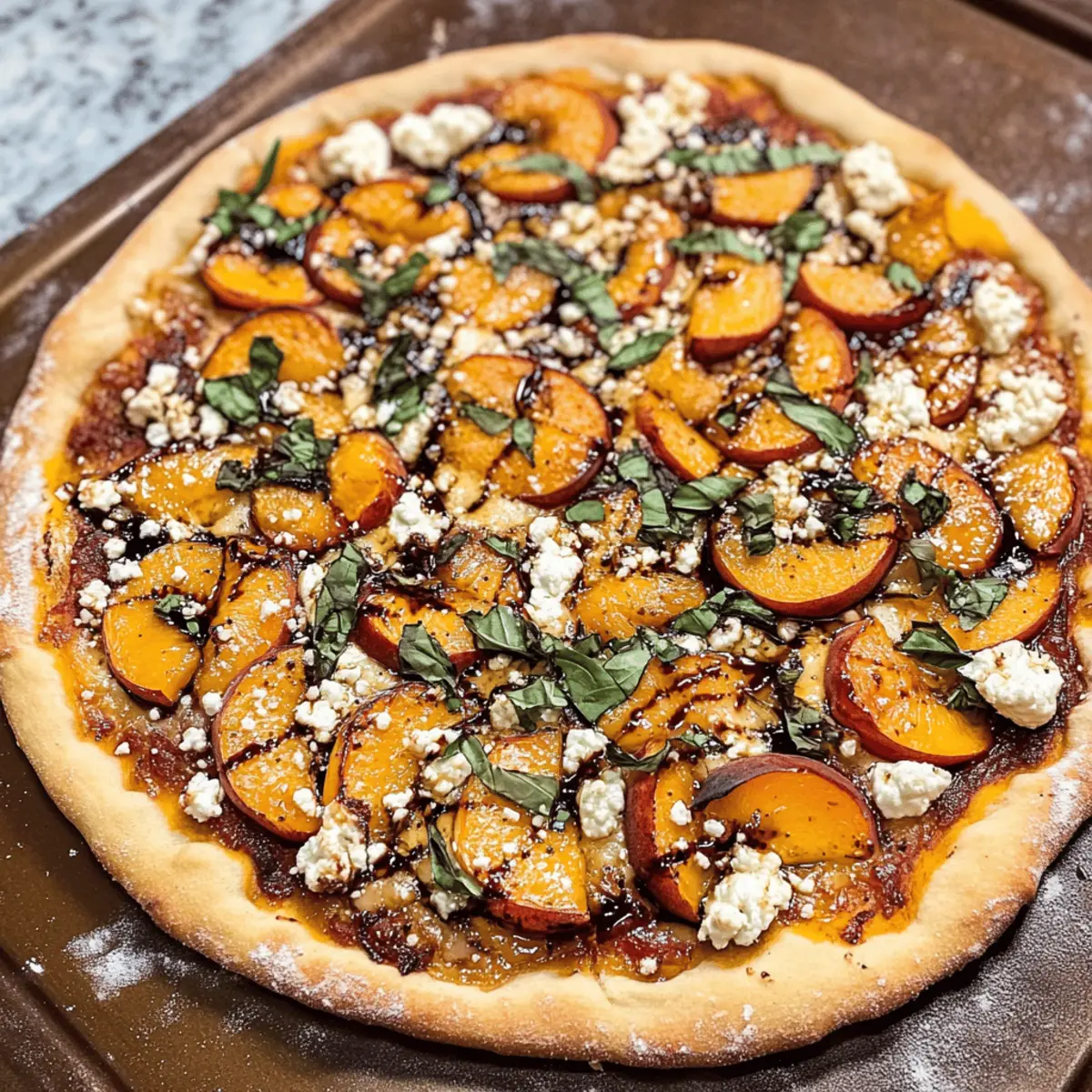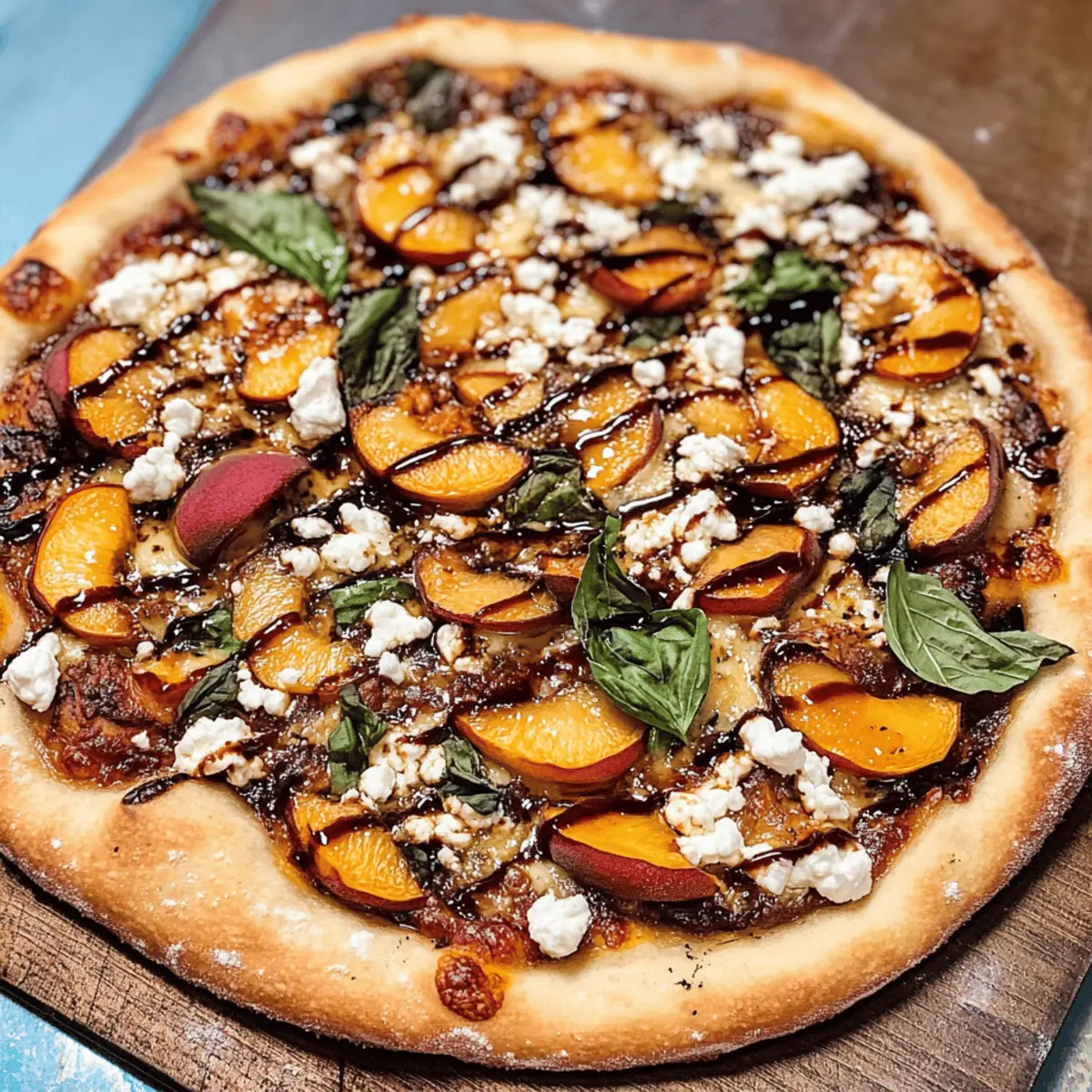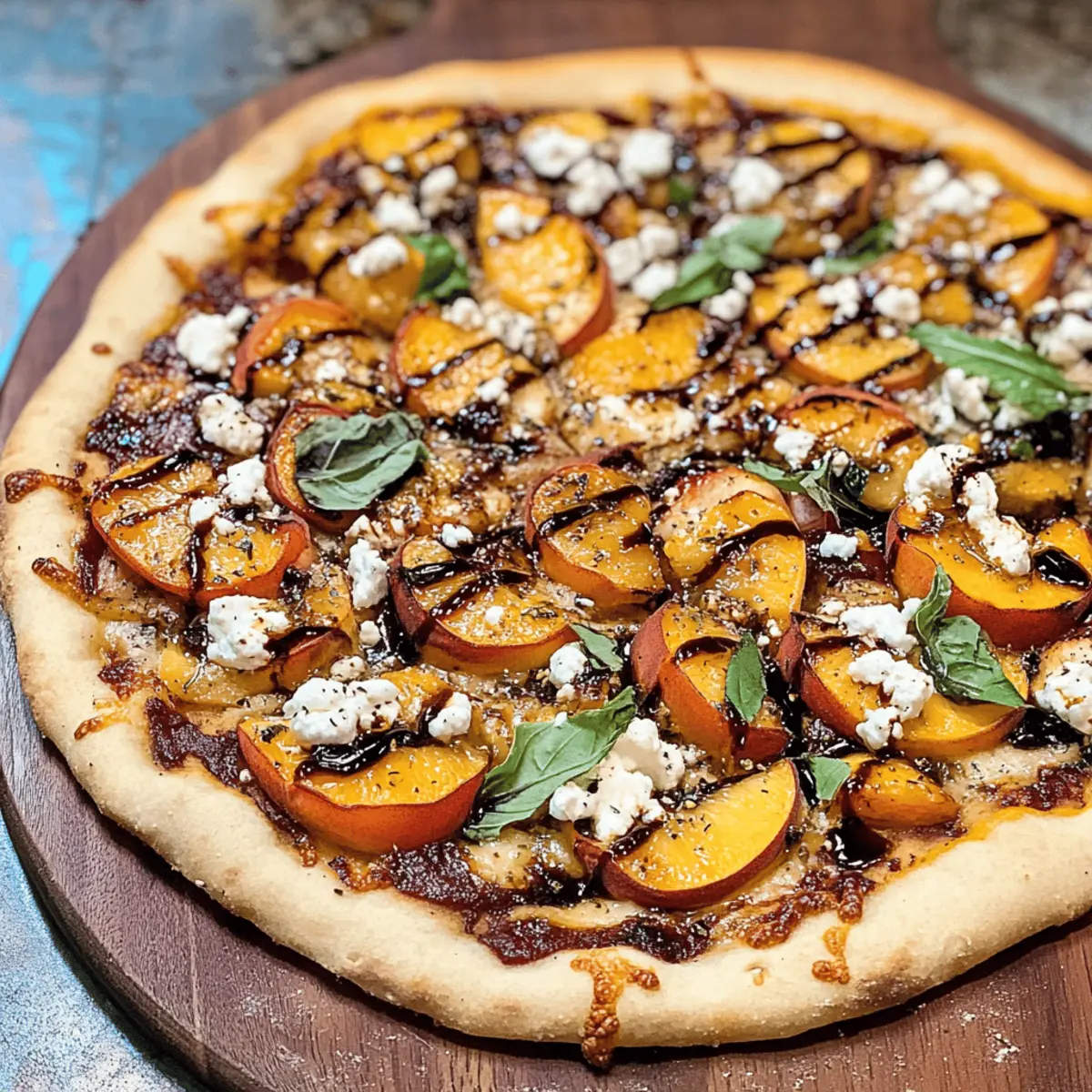 Es war ein warmer Sommerabend, als der Gedanke an eine kreative Pizza in meinen Kopf schoss. Ich stellte mir vor, wie frische, saftige Pfirsiche sich mit geschmolzenem Ziegenkäse und dem kräftigen Geschmack von Gorgonzola verbinden, während ein Hauch von Balsamico-Reduktion alles abrundet. Diese Pfirsichpizza mit Ziegenkäse, Basilikum, Gorgonzola und Balsamico-Reduktion bringt die Aromen des Sommers auf den Tisch und ist in der Zubereitung zudem kinderleicht. Sie ist nicht nur ein echter Hingucker, sondern auch eine hervorragende Möglichkeit, frische, saisonale Zutaten zu genießen. Perfekt für gesellige Abende mit Freunden oder als schnelles, raffiniertes Abendessen. Neugierig, wie du diesen Sommer-Genuss selbst zubereiten kannst? Lass uns gemeinsam eintauchen! Warum ist diese Pfirsichpizza besonders? Einzigartig im Geschmack: Die Kombination aus frischen Pfirsichen und herzhaftem Ziegenkäse schafft eine wunderbare Balance aus Süße und Cremigkeit, perfekt für den Sommer. Vielfältig anpassbar: Du kannst die Zutaten nach Belieben variieren – probiere doch mal Feigen statt Pfirsichen oder wechsle die Käsesorten. Einfache Zubereitung: Mit nur wenigen Schritten und einfachen Zutaten ist diese Pizza auch für kulinarische Neulinge schnell gemacht. Gesellige Momente: Ideal für einen gemütlichen Abend mit Freunden oder als besonderes Highlight beim Grillen. Gesund und frisch: Diese Pfirsichpizza ist nicht nur eine Augenweide, sondern auch eine tolle Möglichkeit, saisonale Lebensmittel zu genießen. Wenn dir auch andere kreative Rezepte für den Sommer gefallen, schau dir unser Pizza Bagels Rezept an! Pfirsichpizza Zutaten • Entdecke die frischen und köstlichen Zutaten für deine Pfirsichpizza mit Ziegenkäse, Basilikum, Gorgonzola und Balsamico-Reduktion. Für den Pizzaboden Pizza-Teig – Du kannst einen fertigen Teig oder einen selbstgemachten, SCD-tauglichen oder Paleo-freundlichen verwenden; ein dünner Boden eignet sich besonders gut. Olivenöl – Sorgt für Geschmeidigkeit und Geschmack; verwende hochwertiges Olivenöl für den besten Genuss. Knoblauch (1 Zehe, gehackt) – Verleiht der Pizza zusätzliche Würze; passt hervorragend zu den Käsesorten und der Süße der Pfirsiche. Koscheres Salz – Wichtig für die Würze; achte darauf, nicht zu viel zu verwenden, um andere Aromen nicht zu überdecken. Für die Beläge Ziegenkäse (1 Tasse) – Bringt Cremigkeit und einen köstlichen Geschmack; du kannst ihn auch durch Feta oder Ricotta ersetzen, wenn gewünscht. Gorgonzola-Käse (1 Tasse) – Fügt einen kräftigen Geschmack hinzu; kann durch Blauschimmelkäse ersetzt oder für eine mildere Variante ganz weggelassen werden. Pfirsiche (3, dünn geschnitten) – Hauptbestandteil für diese Pfirsichpizza; verwende frische, reife Pfirsiche für das beste Aroma. Basilikum (1/2 Tasse, dünn geschnitten) – Bringt Frische und Duft; zur Abwechslung kannst du auch Rucola verwenden, um eine pikante Note hinzuzufügen. Alter Balsamico-Essig (2 Esslöffel, getrennt) – Verstärkt die Aromen; ein hochwertiger Essig sorgt für besseres Ergebnis. Optional: Du kannst normalen Balsamico reduzieren, um ihn einzudicken und zu süßen. Step-by-Step Instructions für Pfirsichpizza mit Ziegenkäse, Basilikum, Gorgonzola und Balsamico-Reduktion Step 1: Pfirsiche vorbereiten Schneide die frischen Pfirsiche dünn und gib 1 Esslöffel Balsamico-Essig darüber. Mische alles gut durch und lege die Pfirsiche auf ein mit Backpapier ausgelegtes Backblech. Brote die Pfirsiche 8-10 Minuten unter dem Grill, bis sie leicht karamellisiert sind. Lass sie danach abkühlen, während du mit den nächsten Schritten fortfährst. Step 2: Ofen und Teig vorbereiten Heize den Ofen auf 220 °C (oder entsprechend den Anweisungen für deinen Pizzateig) vor. Bereite den Pizzateig vor, indem du 1 Esslöffel Olivenöl und die gehackte Knoblauchzehe gleichmäßig darauf verteilst. Streue ein wenig koscheres Salz über den Teig, um ihm zusätzlichen Geschmack zu verleihen. Step 3: Zutaten kombinieren In einer Schüssel vermischt du die gebratenen Pfirsiche mit dem frisch geschnittenen Basilikum. Verteile den zerbröckelten Ziegenkäse gleichmäßig auf dem vorbereiteten Pizzateig. Darauf kommt die Mischung aus Pfirsichen und Basilikum, gefolgt von dem Gorgonzola-Käse, um ein intensives Aroma zu erzielen. Step 4: Backen Schiebe die Pfirsichpizza in den vorgeheizten Ofen und backe sie 15-20 Minuten, bis der Rand goldbraun und knusprig ist. Halte ein Auge darauf, sodass der Käse nicht verbrennt, sondern schön schmilzt. Wenn die Zeit um ist, nimm die Pizza aus dem Ofen und lasse sie 5 Minuten ruhen, bevor du sie anschneidest. Bereite deine Pfirsichpizza mit Ziegenkäse im Voraus vor! Diese Pfirsichpizza mit Ziegenkäse, Basilikum, Gorgonzola und Balsamico-Reduktion ist ideal für die Vorbereitung im Voraus! Du kannst die Pfirsiche bis zu 24 Stunden im Voraus broilen und mit Balsamico-Essig marinieren, um ihre Süße zu intensivieren. Die Mischung aus Pfirsichen und Basilikum kannst du ebenfalls vorbereiten und im Kühlschrank aufbewahren. Der Pizzateig lässt sich sogar bis zu 3 Tage vorher zubereiten oder in den Kühlschrank stellen. Wenn es Zeit ist, die Pizza zu backen, verteil einfach den Ziegenkäse und die Pfirsichmischung auf dem Teig, backe sie 15-20 Minuten lang und genieße die köstliche, frisch gebackene Pfirsichpizza, die trotzdem so lecker wie frisch zubereitet ist! Aufbewahrungstipps für Pfirsichpizza Zimmertemperatur: Die Pfirsichpizza sollte idealerweise frisch serviert werden. Wenn Reste übrig bleiben, kannst du sie auch kurz bei Zimmertemperatur aufbewahren, aber achte darauf, dass sie nicht länger als 2 Stunden stehen bleibt. Kühlschrank: Im Kühlschrank bleibt die Pfirsichpizza 1-2 Tage frisch. Wickele sie gut in Frischhaltefolie oder lege sie in einen luftdichten Behälter, um Austrocknen und Geruchsübertragung zu vermeiden. Gefrierreif: Wenn du die Pizza länger aufbewahren möchtest, kannst