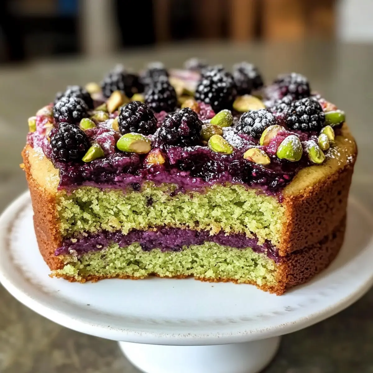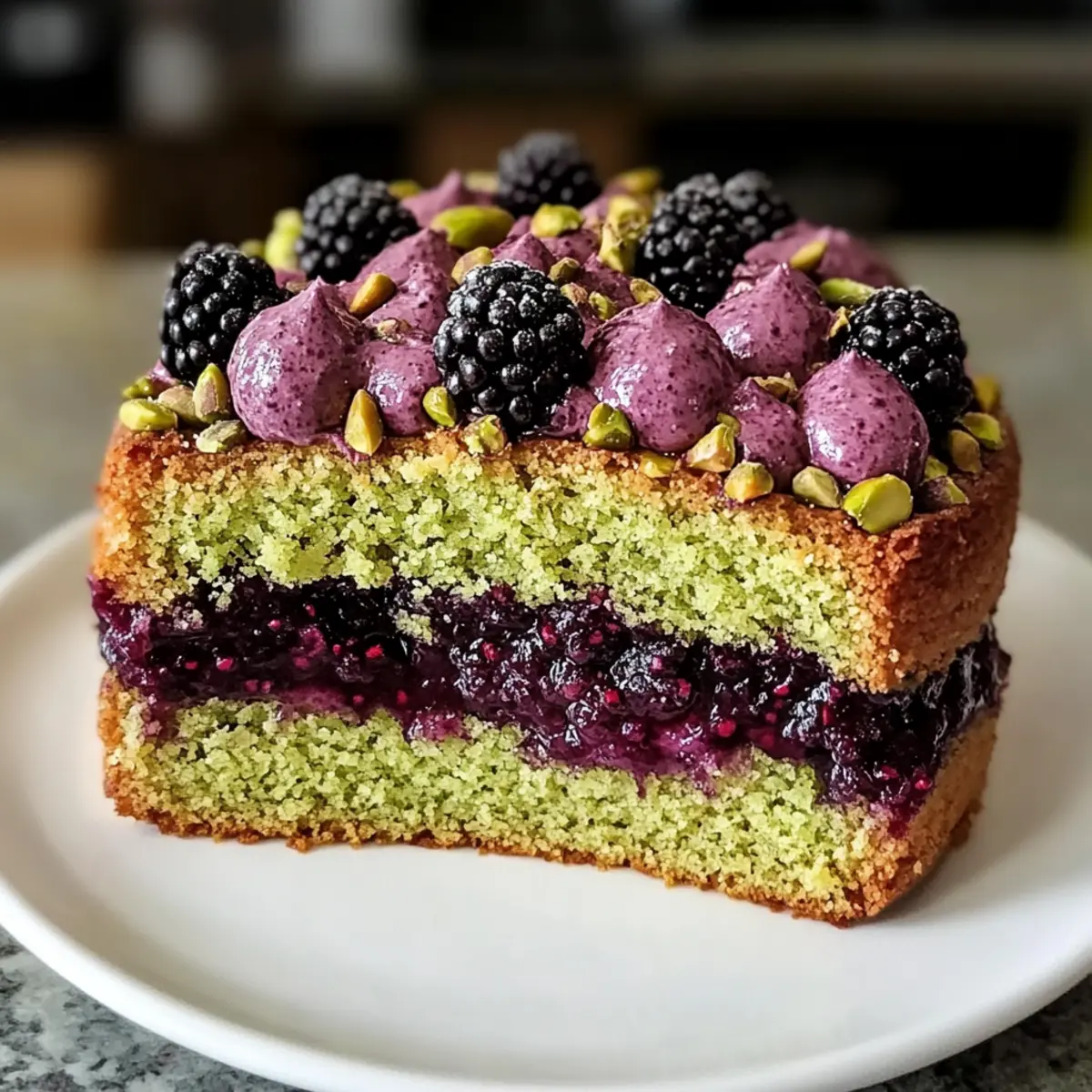 Als ich neulich im Frühling durch den Markt schlenderte, konnte ich die süß-säuerlichen Aromen der frischen Brombeeren förmlich riechen. Dieses sensorische Erlebnis inspirierte mich zu meinem heutigen Rezept: dem Pistazien- und Brombeer-Olivenölkuchen. Diese erstaunliche Kombination vereint die nussige Reichhaltigkeit von gemahlenen Pistazien mit der fruchtigen Tiefe von hochwertigem Olivenöl, was zu einem außergewöhnlich saftigen Kuchen führt, der selbst die wählerischsten Gaumen begeistert. Mit einem einzigartigen, fruchtigen Buttercreme-Frosting und einer angenehmen Frische ist dieser Kuchen der ideale Begleiter für fröhliche Anlässe oder einfach nur als Genuss für zwischendurch. Wer kann da schon widerstehen? Lass uns gemeinsam entdecken, wie dieser köstliche, vegetarische Kuchen zubereitet wird! Warum ist dieser Kuchen unwiderstehlich? Saftig und Zart: Der Pistazien- und Brombeer-Olivenölkuchen überzeugt durch seine feuchte Konsistenz und den zarten Biss, der selbst Feinschmecker begeistert. Nussige Tiefe: Mit gemahlenen Pistazien, die reichhaltigen Geschmack hinzufügen, ist dieser Kuchen ein Hochgenuss für Nussliebhaber! Fruchtige Frische: Dank der süß-säuerlichen Brombeeren in der Füllung, kombiniert mit einem fruchtigen Buttercreme-Frosting, ist jeder Bissen eine geschmackliche Offenbarung. Einfach zuzubereiten: Die Zutaten sind leicht erhältlich und die Zubereitung ist unkompliziert, perfekt für jeden, der mit Backen experimentieren möchte. Vielseitig anpassbar: Ob mit Himbeeren oder Zitrusfrüchten, dieser Kuchen lässt sich nach Belieben abwandeln – so wird er nie langweilig! Wenn du nach weiteren köstlichen Optionen suchst, schaue dir auch die Kartoffel-Und-Käse-Frühstückstacos an oder wie wäre es mit einer cremigen Zucchinisuppe Schnell Und als Beilage? Pistazien- und Brombeer-Olivenölkuchen Zutaten Hinweis: Die Kombination aus Pistazien und Brombeeren macht diesen Kuchen zu einem exquisite vegetarischen Genuss! Für den Teig: Gemahlene Pistazien – sorgen für einen nussigen Geschmack; du kannst sie durch gemahlene Mandeln ersetzen, falls gewünscht. Zucker – süßt den Kuchen; verwende Kokosnusszucker oder braunen Zucker für eine tiefere Geschmacksnote. Allzweckmehl – bildet die Struktur des Kuchens; eine glutenfreie Mischung kann diesen Kuchen glutenfrei machen. Backpulver & Salz – sind wichtig für das Aufgehen; achte darauf, dass das Backpulver frisch ist. Milch (oder pflanzlich) – sorgt für Feuchtigkeit und zarte Textur; verwende für eine milchfreie Version Mandel- oder Hafermilch. Apfelessig (oder Zitronensaft) – dient als Buttermilch-Ersatz für zusätzliche Feuchtigkeit. Olivenöl – bringt Feuchtigkeit und eine fruchtige Tiefe; extra natives Olivenöl hat den besten Geschmack. Vanille- & Mandelessenz – verstärken den Geschmack; die Mandelessenz kann weggelassen werden, wenn du Nüsse vermeidest. Brombeermarmelade – fügt Süße und Fruchtigkeit hinzu; kann bei Bedarf durch Himbeermarmelade ersetzt werden. Für die Buttercreme: Ungesalzene Butter – wird in der Buttercreme verwendet; ersetze sie durch pflanzliche Butter für eine vegane Option. Puderzucker – süßt und verdickt die Buttercreme; Alternativen sind Erythrit für eine zuckerfreie Version. Getrockneter Thymian – fügt eine besondere Kräuternote zur Glasur hinzu; kann durch Rosmarin oder Lavendel ersetzt werden. Lass uns nun gemeinsam in die Schritte der Zubereitung eintauchen! Schritt-für-Schritt-Anleitung für den Pistazien- und Brombeer-Olivenölkuchen Step 1: Ofen vorheizen und Backformen vorbereiten Heize den Ofen auf 175 °C vor und bereite zwei 15- oder 18-cm Kuchenformen vor, indem du sie mit Butter einfettst und mit Mehl ausstäubst. Diese Vorbereitungen helfen, dass der Pistazien- und Brombeer-Olivenölkuchen später gleichmäßig backt und sich leicht aus der Form lösen lässt. Step 2: Buttermilch-Ersatz herstellen Mische in einer Schüssel die Milch und den Apfelessig oder Zitronensaft und lasse die Mischung etwa 5 Minuten stehen. Diese Mischung dient als Buttermilch-Ersatz und verleiht dem Kuchen eine wunderbare Feuchtigkeit und Zartheit, die bei jedem Bissen spürbar ist. Step 3: Pistazien und Zucker mahlen Gib die gemahlenen Pistazien und den Zucker in einen Mixer und püriere sie, bis sie fein gemahlen sind. Achte darauf, nicht zu lange zu mixen, damit die Mischung nicht ölig wird. Diese nussige Süße wird das Herzstück für den Pistazien- und Brombeer-Olivenölkuchen sein. Step 4: Trockene Zutaten vermengen In einer mittleren Schüssel die gemahlene Pistazien-Zucker-Mischung mit dem Mehl, Backpulver und Salz gut vermengen. Vergewissere dich, dass alle trockenen Zutaten gleichmäßig verteilt sind, um ein optimales Aufgehen des Kuchens zu gewährleisten. Step 5: Nasse Zutaten kombinieren In einer großen Schüssel die Buttermilch, das Olivenöl, sowie die Vanille- und Mandelessenz gut verrühren. Diese feuchten Zutaten verleihen dem Pistazien- und Brombeer-Olivenölkuchen seine saftige Konsistenz und ein aromatisches Aroma. Step 6: Trockene Zutaten unterheben Gib die Mischung der trockenen Zutaten in die Schüssel mit den nassen Zutaten und falte sie vorsichtig. Die Mischung sollte gerade so vermengt werden, dass keine Mehlnester mehr sichtbar sind, um den Kuchen luftig und locker zu halten. Step 7: Teig in die Formen füllen Teile den Teig gleichmäßig zwischen den vorbereiteten Kuchenformen auf. Klopfe die Formen vorsichtig auf die Arbeitsfläche, um Luftblasen zu entfernen. Dies hilft, dass der Pistazien- und Brombeer-Olivenölkuchen gleichmäßig aufgeht und eine schöne Form erhält. Step 8: Kuchen backen Backe die Kuchen im vorgeheizten Ofen für etwa 25-30 Minuten. Der Kuchen ist fertig, wenn ein Zahnstocher, der in die Mitte gesteckt wird, sauber herauskommt. Achte darauf, die Kuchen nicht zu lange im Ofen zu lassen, um ein Austrocknen zu vermeiden. Step 9: Kuchen abkühlen lassen Lasse die Kuchen in den Formen etwa