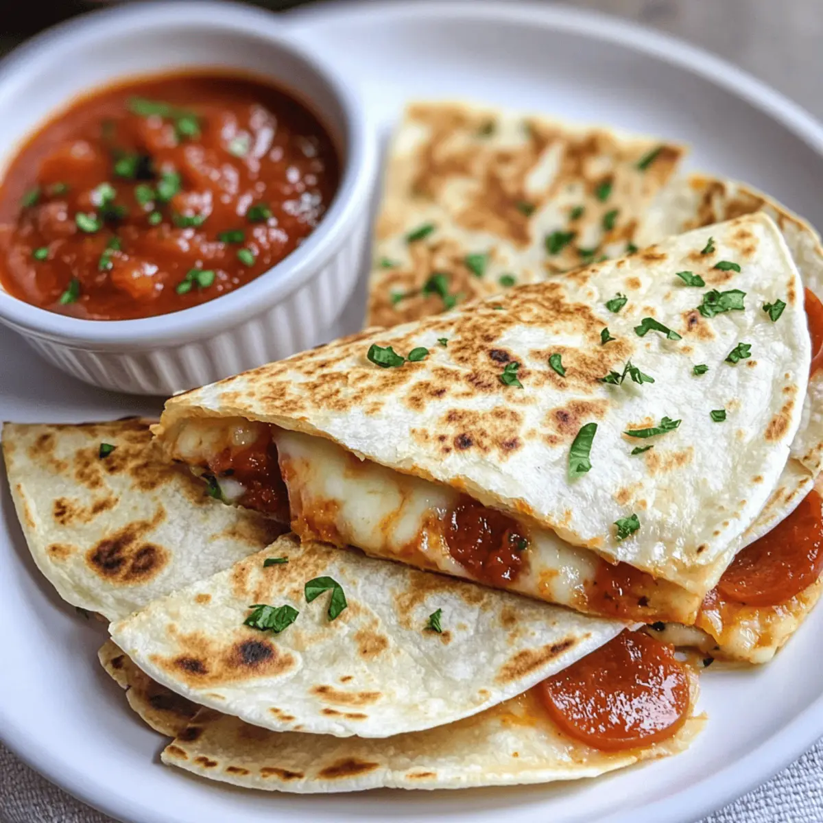 Vielfältige Anpassungsmöglichkeiten: Du kannst deine Pizzadillas nach Belieben füllen und verschiedene Toppings hinzufügen – egal, ob Gemüse, verschiedene Käsesorten oder andere Fleischsorten. Rascher Genuss: Diese Quesadillas sind schnell zubereitet und damit perfekt für einen einfachen Mittagssnack geeignet. Kinderfreundlich: Die Kombination aus Käse und würzigem Pepperoni spricht sowohl Kinder als auch Erwachsene an. Wunderbare Texterfahrung: Knusprige Tortillas mit einer warmen, schmelzenden Füllung sorgen für ein unverwechselbares Geschmackserlebnis. Diese Quesadillas bleiben auch als Ideale Snack-Option für Feste oder gesellige Abende geeignet – einfach zuschlagen und genießen!