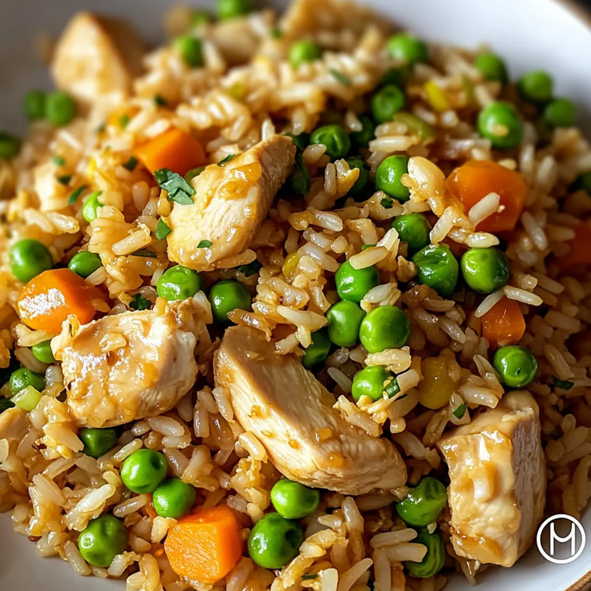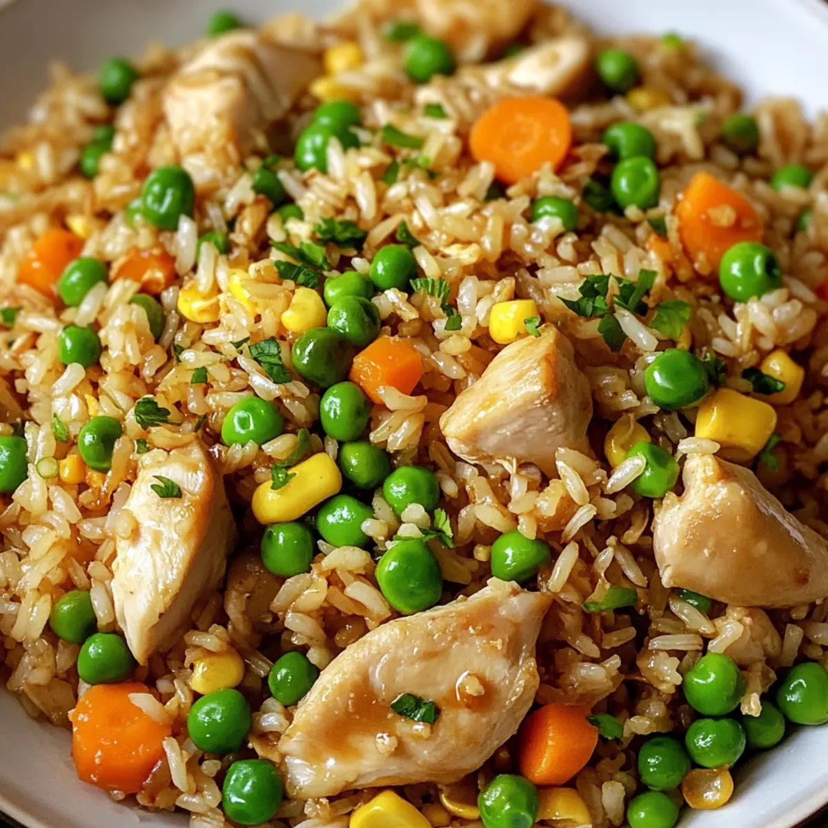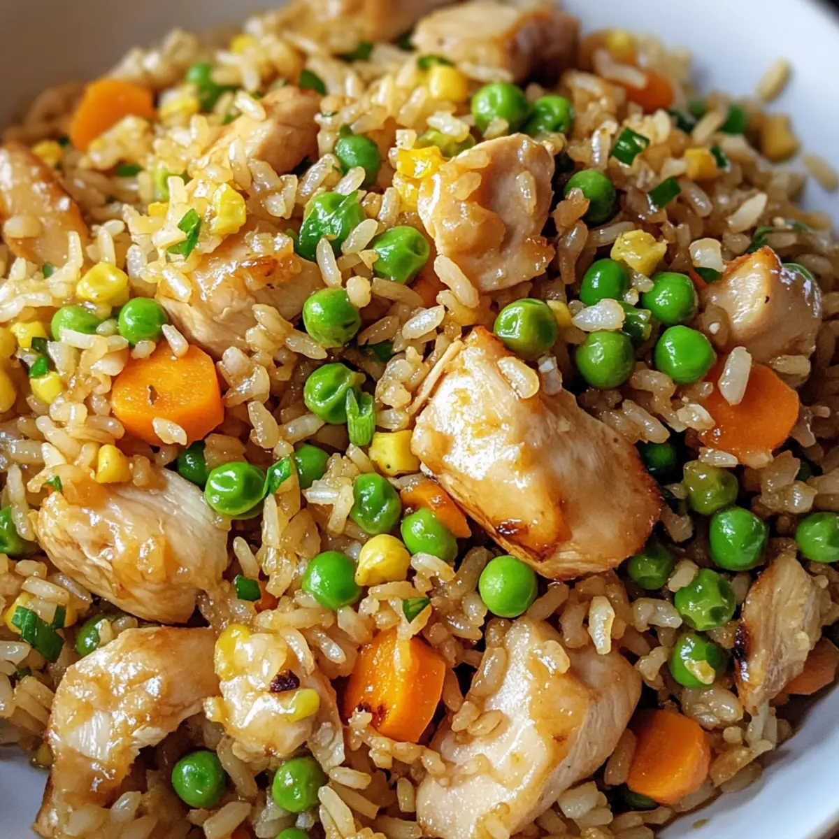 Als ich neulich in meiner Küche stand, um ein schnelles Abendessen zuzubereiten, überkam mich der unwiderstehliche Duft von frisch gebratenem Reis. Der Proteinreiche gebratene Reis mit Hühnchen ist mein geheimes Rezept für stressige Wochentage, wenn ich etwas Schnelles, aber zugleich nährstoffreiches brauche. Diese köstliche Mischung aus zartem Hühnchen, nussigem Vollkornreis und buntem Gemüse wird nicht nur in Windeseile zubereitet, sondern ist auch äußerst sättigend. Egal, ob Sie ein Küchenneuling sind oder schon viele Gerichte ausprobiert haben, dieses Rezept wird Ihnen helfen, den Sprung zu schnellem und gesundem Essen zu meistern. Möchten Sie erfahren, wie Sie in weniger als 30 Minuten ein echtes Geschmackserlebnis auf den Tisch bringen können? Lassen Sie uns gemeinsam diese leckere Reise antreten! Warum ist dieses Rezept ein Hit? Einfachheit: Die Zubereitung des proteinreichen gebratenen Reises mit Hühnchen ist kinderleicht und erfordert keine speziellen Kochkünste. Vielseitigkeit: Sie können Zutaten ganz nach Ihrem Geschmack anpassen, sei es durch den Austausch von Hühnchen gegen Tofu oder der Wahl von frischem Gemüse. Schnell und Nahrhaft: In weniger als 30 Minuten erhalten Sie eine nahrhafte Mahlzeit, die auch perfekt für hektische Abende geeignet ist. Köstlicher Geschmack: Die harmonische Verbindung von Aromen und Texturen sorgt für ein unvergleichliches Geschmackserlebnis – ganz wie beim Lieblingsasiaten um die Ecke. Ideal für die Familie: Dieses Rezept erfüllt die Bedürfnisse von großen und kleinen Essensliebhabern und sorgt für einen echten Genussmoment am Tisch. Entdecken Sie auch andere köstliche Optionen wie Salsa Verde Haehnchen oder Honig Feta Huehnchen, um Ihre Essensauswahl zu erweitern! Proteinreicher gebratener Reis mit Hühnchen Zutaten Hinweis: Bereiten Sie sich auf ein köstliches und nahrhaftes Gericht vor, das Ihnen in weniger als 30 Minuten ein unvergleichliches Geschmackserlebnis bietet! Für das Pfannen-Gericht • Pflanzenöl – Ein ideales Medium zum Braten, das ein Ankleben der Zutaten verhindert; auch Olivenöl kann verwendet werden. • Hühnchenbrustfilets (ohne Haut und Knochen) – Eine magere Proteinquelle, die dem Gericht Substanz verleiht; ersetzen Sie es durch Garnelen oder Tofu für eine Variation. • Salz und Pfeffer – Verbessert den Geschmack und hebt den Geschmack des Hühnchens hervor. • Gekochter Vollkornreis (vorzugsweise kühl) – Fügt eine zähe Textur und Nährwert hinzu; auch weißer Reis kann verwendet werden, solange er gekocht und abgekühlt ist. • Große Eier, geschlagen – Sorgt für zusätzliches Protein und eine seidige Konsistenz; für eine vegane Version einfach weglassen oder durch Rührei aus Tofu ersetzen. • Gefrorene Erbsen und Karotten – Praktisches und bunten Gemüse, das Süße bietet; frisches Gemüse kann ebenfalls verwendet werden. • Gehackter Knoblauch – Aromatische Geschmacksverstärkung; frischer Knoblauch ist besser als Pulver für einen intensiveren Geschmack. • Würfelige Zwiebel – Bringt Süße und Knusprigkeit; bis sie glasig ist, braten. Schalotten sind eine gute Alternative. • Sojasauce (reduziert im Salzgehalt) – Liefert umami Geschmack mit reduziertem Salzgehalt; kann durch Tamari für eine glutenfreie Option ersetzt werden. • Austernsauce – Fügt Tiefe und Süße hinzu; eine Mischung aus Sojasauce und Zucker kann sie ersetzen, wenn nicht vorhanden. • Sesamöl – Der letzte Schliff für ein nussiges Aroma; sparsam verwenden. • In Scheiben geschnittene Frühlingszwiebeln – Frische Garnitur für Knusprigkeit und milden Geschmack. • Sesamkörner (optional) – Sorgt für visuelle Attraktivität und zusätzlichen Crunch. Jetzt sind Sie bereit, diesen köstlichen proteinreichen gebratenen Reis mit Hühnchen zuzubereiten! Schritt-für-Schritt-Anleitung für Proteinreicher gebratener Reis mit Hühnchen Step 1: Öl erhitzen Erhitzen Sie 1 Esslöffel Pflanzenöl in einer großen Pfanne oder einem Wok bei mittelhoher Hitze. Achten Sie darauf, dass das Öl heiß genug ist, um sofort zu wirken, aber nicht raucht. Dies dauert etwa 1–2 Minuten. Ein kräftiges Zischen beim Hineingeben der Zutaten deutet darauf hin, dass es bereit ist. Step 2: Hühnchen anbraten Würzen Sie die gewürfelten Hühnchenbrustfilets mit Salz und Pfeffer. Geben Sie das Hühnchen in die heiße Pfanne und braten Sie es 5–6 Minuten lang, bis es goldbraun ist und eine innere Temperatur von 75°C erreicht hat. Nehmen Sie das Hühnchen aus der Pfanne und stellen Sie es beiseite. Step 3: Zwiebel und Knoblauch anbraten Geben Sie das restliche Öl in die gleiche Pfanne und fügen Sie die gewürfelte Zwiebel und den gehackten Knoblauch hinzu. Sautieren Sie beides für 2–3 Minuten, bis die Zwiebel glasig ist. Achten Sie darauf, dass nichts anbrennt, während es schön aromatisch wird. Step 4: Eier scramble Schieben Sie die Zwiebel und den Knoblauch zur Seite und geben Sie die geschlagenen Eier in den leeren Bereich der Pfanne. Rühren Sie die Eier um, bis sie vollständig durchgegart und fluffig sind, was etwa 1–2 Minuten dauert. Mischen Sie alles zusammen, sobald die Eier fertig sind. Step 5: Reis hinzufügen Fügen Sie den gekochten und abgekühlten Vollkornreis in die Pfanne hinzu. Verwenden Sie einen Spatel, um eventuelle Klumpen aufzubrechen, und braten Sie den Reis 3 Minuten lang, damit er gut durchwärmt wird und die Aromen aufnimmt. Achten Sie darauf, dass der Reis leicht knusprig wird. Step 6: Gemüse und Gewürze mischen Geben Sie die gefrorenen Erbsen und Karotten, das gebratene Hühnchen, die Sojasauce, die Austernsauce und das Sesamöl hinzu. Rühren Sie alle Zutaten gut um und kochen Sie alles für weitere 2–3 Minuten, bis das Gemüse durchgehend erhitzt ist. Die Farben sollten lebendig und einladend aussehen. Step 7: Finalisieren und servieren Nehmen Sie die Pfanne vom Herd und fügen Sie die in Scheiben geschnittenen Frühlingszwiebeln hinzu. Rühren Sie vorsi