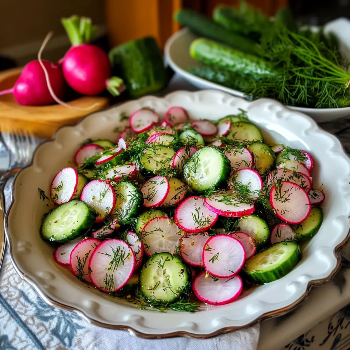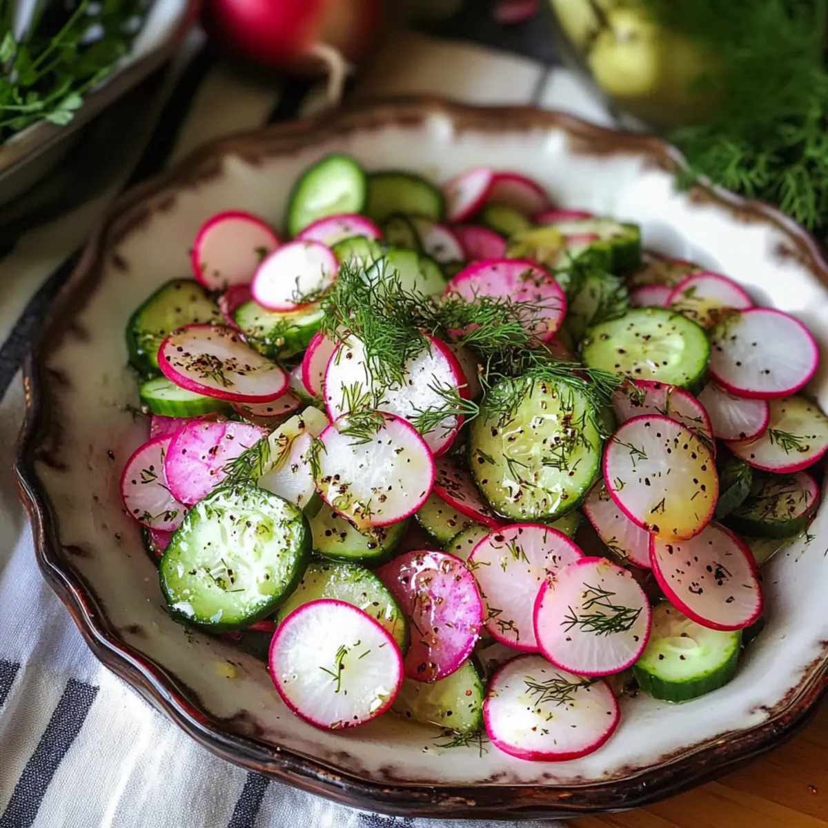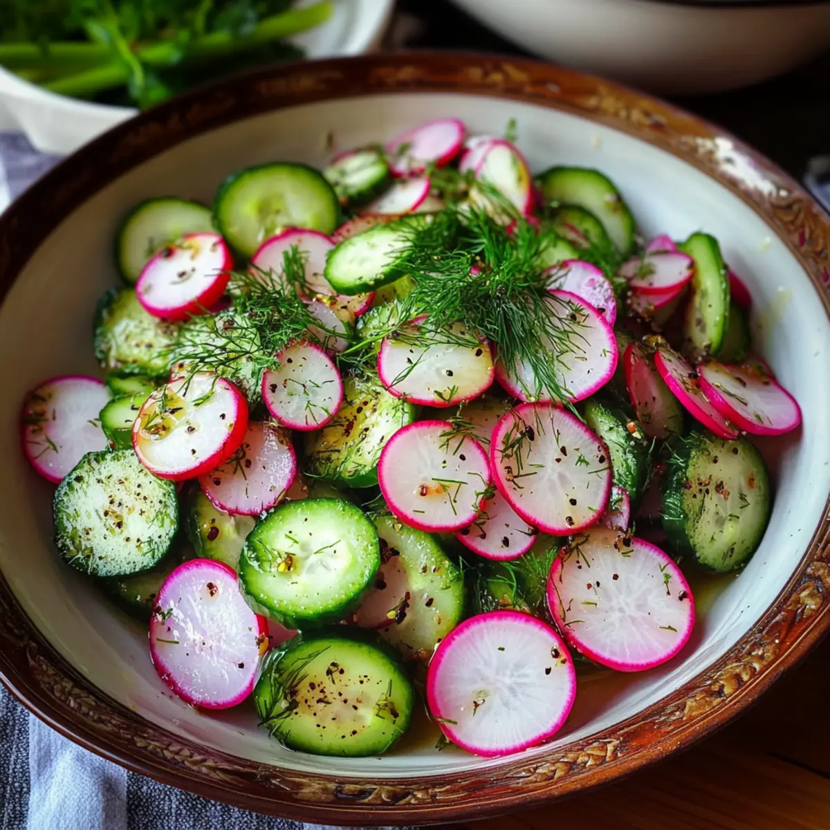 Eines sonnigen Nachmittags saß ich mit einem kühlen Getränk auf meiner Terrasse und schaute auf meinen Garten, als ich den perfekten Gedanken für ein frisches Gericht hatte. Der Radieschen- und Gurkensalat ist genau das, was wir für die warmen Tage brauchen! Diese leichte und spritzige Kombination aus knackigen Radieschen und erfrischenden Gurken trifft genau den richtigen Nerv und bringt nicht nur Farbe auf den Tisch, sondern auch eine gesunde Portion Vitamine. Mit dem peppigen Geschmack von frischem Dill und einer honig-senfigen Vinaigrette ist dieser Salat nicht nur kinderleicht vorzubereiten, sondern auch ideal für Gartenpartys oder als köstliche Beilage, die man im Voraus zubereiten kann. Neugierig, wie einfach es ist, das ganze Geschmackserlebnis auf den Teller zu bringen? Warum ist dieser Salat perfekt für den Frühling? Frische Zutaten: Der Radieschen- und Gurkensalat bringt das Beste aus dem Garten auf den Tisch. Knackige Texturen: Die Kombination aus radikalen Radieschen und kühlen Gurken sorgt für einen erfrischenden Biss. Einfach zuzubereiten: Mit nur wenigen Schritten ist dieser Salat im Handumdrehen fertig. Vielseitige Beilage: Er passt hervorragend zu gegrilltem Fleisch oder als leichter Snack für Picknicks. Gesund und nährstoffreich: Vollgepackt mit Vitaminen, ist dieser Salat nicht nur lecker, sondern auch gut für die Gesundheit. Entdecken Sie mehr über klassische Frühlingsgerichte wie den Erbsensalat und bereiten Sie sich auf eine köstliche Saison vor! Radieschen- und Gurkensalat Zutaten • Ein erfrischendes Erlebnis: Hier ist alles, was Sie für den köstlichen Radieschen- und Gurkensalat benötigen! Für die Salatzutaten • Gurken – sorgen für einen erfrischenden Crunch; Persian-Gurken sind ideal für ihre Süße und Größe. • Radieschen – bieten eine würzige Knackigkeit; rote Sorten wie Cherry Belle bringen Farbe in den Salat. • Frischer Dill – verleiht dem Salat ein lebhaftes Aroma; die Menge kann nach Geschmack angepasst werden. • Frische Schnittlauch – fügt milde Zwiebelnoten hinzu; sehr gut zu verwenden, wenn sie im eigenen Garten frisch geerntet werden. Für das Dressing • Grobkörniger Senf – bietet einen erdigen, leicht würzigen Geschmack. • Honig – harmonisiert die scharfen und bitteren Noten des Dressings; für eine veganere Version kann Agavendicksaft verwendet werden. Schritt-für-Schritt-Anleitung für den Radieschen- und Gurkensalat Step 1: Zutaten vorbereiten Waschen Sie die Gurken und Radieschen gründlich und schneiden Sie die Gurken in dünne Scheiben. Die Radieschen sollten ebenfalls in feine Scheiben geschnitten werden, um ihre knackige Textur zu betonen. Hacken Sie den frischen Dill und den Schnittlauch fein. Diese Schritte sorgen dafür, dass die Aromen im Radieschen- und Gurkensalat optimal zur Geltung kommen. Step 2: Salat mischen In einer großen Schüssel kombinieren Sie die vorbereiteten Gurkenscheiben, Radieschenscheiben, den gehackten Dill und den Schnittlauch. Verwenden Sie eine große Gabel oder zwei Löffel, um die Zutaten vorsichtig zu vermengen, damit die frischen Grüns gleichmäßig verteilt sind. Der Salat sollte farbenfroh und einladend aussehen, was ihn zu einer perfekten Beilage macht. Step 3: Vinaigrette zubereiten In einer separaten kleinen Schüssel whisken Sie den grobkörnigen Senf mit dem Honig, bis eine glatte und homogene Konsistenz erreicht ist. Dieser Schritt sollte etwa 1–2 Minuten in Anspruch nehmen. Achten Sie darauf, dass sich der Senf und der Honig gut vermengen, um die Aromen im Dressing perfekt abzustimmen. Step 4: Salat kombinieren Gießen Sie die Vinaigrette über den gemischten Radieschen- und Gurkensalat. Verwenden Sie eine große Gabel, um die Vinaigrette gleichmäßig auf den Salatzutaten zu verteilen. Achten Sie darauf, dass jede Scheibe Gurke und Radieschen leicht mit dem Dressing überzogen ist. Dies sorgt für den besten Geschmack und eine harmonische Verbindung der Zutaten. Step 5: Kühlen Decken Sie die Schüssel mit Frischhaltefolie ab und stellen Sie den Salat für mindestens 30 Minuten in den Kühlschrank. Dies gibt den Aromen Zeit, sich zu entfalten und macht den Radieschen- und Gurkensalat noch erfrischender. Nach dieser Ruhezeit sind alle Geschmäcker optimal kombiniert und der Salat ist bereit für den Genuss. Step 6: Servieren Nach dem Kühlen nehmen Sie den Salat aus dem Kühlschrank und überprüfen Sie, ob die Aromen gut durchgezogen sind. Servieren Sie den Radieschen- und Gurkensalat in einer schönen Schüssel, um die Farben und Texturen zu zeigen. Der Salat eignet sich hervorragend als Beilage zu grilliertem Fleisch oder als frisches Hauptgericht an warmen Tagen. Bereiten Sie den Radieschen- und Gurkensalat im Voraus vor! Der Radieschen- und Gurkensalat ist ideal für die Meal Prep, da viele Komponenten im Voraus zubereitet werden können. Schneiden Sie die Gurken und Radieschen bis zu 24 Stunden vorher und bewahren Sie sie in einem luftdichten Behälter im Kühlschrank auf, um ihre Frische zu erhalten. Das Hacken der Kräuter, wie Dill und Schnittlauch, kann ebenfalls vorbereitet werden und bleibt bis zu 3 Tagen lang aromatisch. Mischen Sie das Dressing (Senf und Honig) im Voraus – so können sich die Aromen besser verbinden. Kombinieren Sie die Zutaten und das Dressing erst kurz vor dem Servieren, um die Knackigkeit der grünen Zutaten zu bewahren. So genießen Sie in kürzester Zeit einen erfrischenden, köstlichen Radieschen- und Gurkensalat! Expertentipps für den Radieschen- und Gurkensalat Frische Zutaten wählen: Verwenden Sie die frischesten Radieschen und Gurken, um den vollen Geschmack in Ihrem Radieschen- und Gurkensalat zu gewährleisten. Saisonale Produkte sind besonders aromatisch. Dressing richtig vorbereiten: Achten Sie darauf, den Senf und den Honig gründlich zu vermengen, um ein gleichmäßiges Dressing zu erhalten. Uneinheitliche Verteilung kann den Salat geschmacklich beeinträchtigen. Kühlzeit einhalten: Lassen Sie