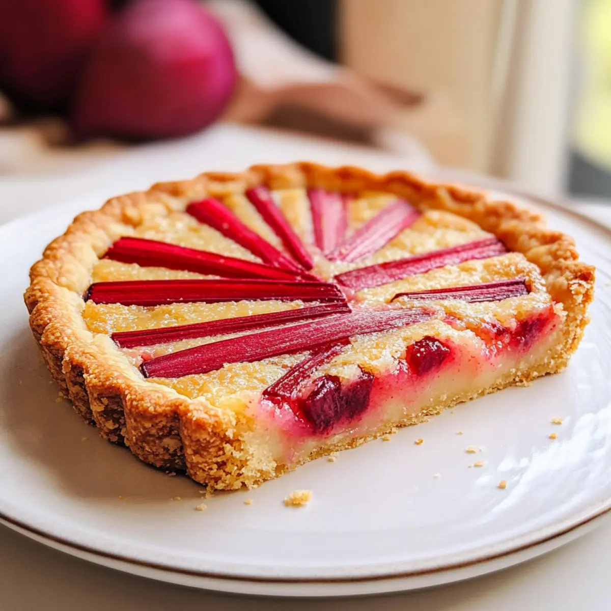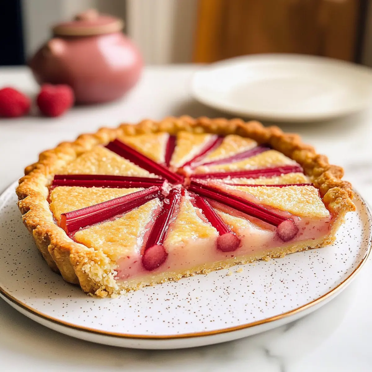Ein köstlicher Rhabarberkuchen mit Frangipane, der perfekt für gesellige Runden ist.