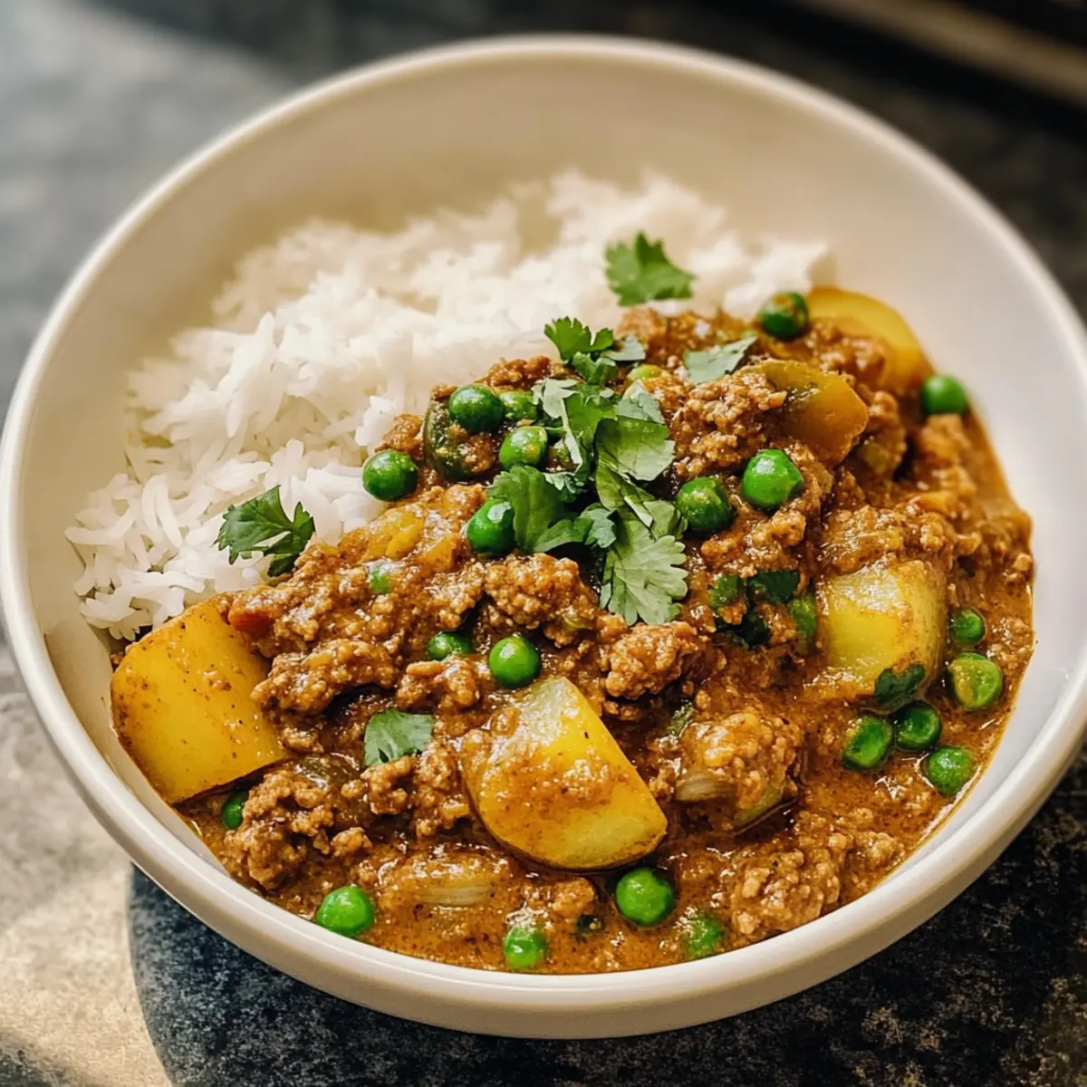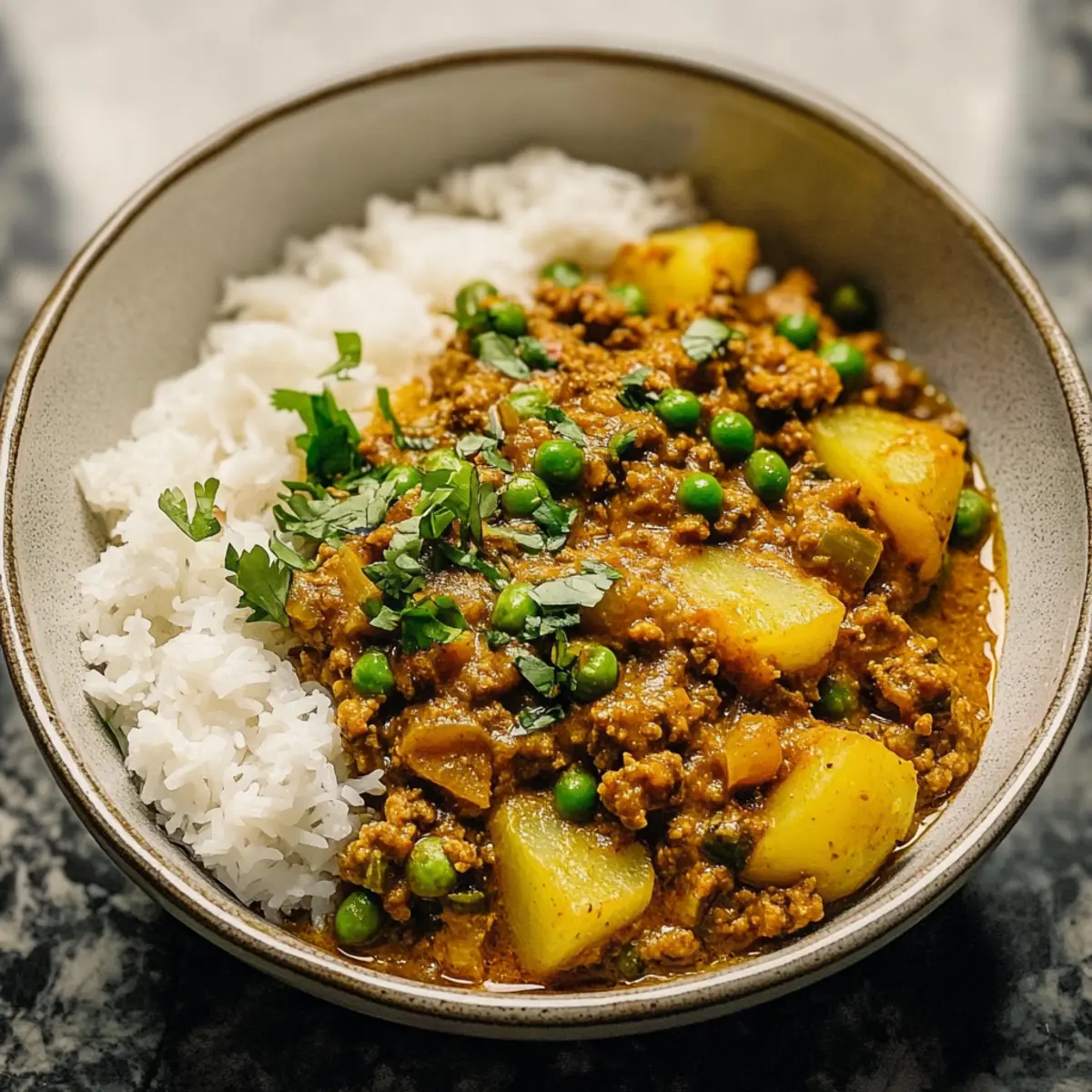 Während ich in meiner Küche stand und die Aromen von Gewürzen in der Luft lagen, fiel mir auf, dass nichts die Stimmung so schnell heben kann wie ein köstliches Gericht wie Rinderhackfleisch-Curry. Dieses einfache Keema-Curry vereint zartes Rinderhackfleisch in einer cremigen Kokosmilchsoße mit einer Vielzahl von aromatischen Gewürzen, sodass es nicht nur ein Fest der Geschmäcker ist, sondern auch kinderfreundlich bleibt. In nur 40 Minuten zubereitet, eignet es sich perfekt für eine stressfreie Woche und verwandelt jeden Abend in ein gemütliches Restaurant-Erlebnis zu Hause. Bereit, meine Geheimtipps zu entdecken und die Familie mit diesem herzlichen Comfort Food zu begeistern? Warum ist dieses Rinderhackfleisch-Curry besonders? Einfachheit: Die Zubereitung ist kinderleicht und benötigt nur grundlegende Kochfähigkeiten, perfekt für eine schnelle Woche! Aromatische Vielfalt: Eine harmonische Mischung aus Gewürzen wie Garam Masala und Kurkuma bringt ein reichhaltiges und einladendes Aroma in Ihr Zuhause. Vielseitigkeit: Ob mit Reis, Naan oder sogar Blumenkohlreis, Sie können es nach Belieben servieren und anpassen. Familienfreundlich: Mild genug für Kinder, aber trotzdem geschmackvoll genug, um auch Erwachsene zu begeistern. Es ist das ideale Gericht für die ganze Familie! Zeitersparnis: In nur 40 Minuten auf dem Tisch, eine ideale Lösung für geschäftige Wochenabende. Schauen Sie sich auch unsere Tipps zur Variationsideen an, um noch mehr Optionen für jeden Geschmack zu bieten! Rinderhackfleisch-Curry Zutaten • Hier sind die Zutaten, die Ihr Rinderhackfleisch-Curry zum Leben erwecken! Für die Sauce Olivenöl – Ideal zum Anbraten und Verleihen von Geschmack. Ghee kann auch verwendet werden, um eine reichhaltigere Note zu erzielen. Gelbe Zwiebel – Sorgt für eine süße und aromatische Basis in der Sauce. Shallots könnten eine mildere Alternative bieten. Frischer Ingwer – Bringt eine würzige Note. Bei Bedarf kann auch gemahlener Ingwer (1 Teelöffel) verwendet werden. Knoblauch – Fügt Tiefe und herzhaften Geschmack hinzu. Wenn frisch nicht verfügbar ist, funktioniert auch Knoblauchpulver (1/2 Teelöffel). Kümmel – Ein wichtiger Gewürz, der die Geschmacksbasis unterstützt. Sie können auch Kreuzkümmel verwenden, wenn gewünscht. Curry-Pulver – Gibt dem Gericht die charakteristische Curry-Note. Garam Masala kann als komplexe Alternative verwendet werden. Garam Masala – Sorgt für einen besonderen, warmen Geschmack und ist essenziell für ein authentisches Rinderhackfleisch-Curry. Kurkuma – Verleiht nicht nur die schöne Farbe, sondern auch die Erdigkeit, die man in indischen Currys liebt. Tomatenmark – Bereichert die Sauce mit Umami. Das Weglassen kann den Geschmack verändern, es ist jedoch möglich, wenn Sie Tomaten vermeiden möchten. Feuergeröstete gehackte Tomaten – Bringen eine angenehme Säure und etwas Rauchnote. Normale gehackte Tomaten können ebenfalls verwendet werden, erzeugen jedoch möglicherweise einen anderen Geschmacksgrad. Kokosmilch (Vollfett, ungesüßt) – Macht das Curry cremig und balanciert die Gewürze aus. Schwerer Rahm oder Mandelmilch sind leichtere Alternativen. Für das Rezept Rinderhackfleisch – Der Hauptbestandteil, der Geschmack und Herzhaftigkeit liefert. Sie können auch Lamm- oder Truthahn-Hackfleisch als Alternativen wählen. Yukon Gold Kartoffeln – Fügt Cremigkeit und Substanz hinzu. Für einen süßeren Geschmack können Sie auch Süßkartoffeln verwenden. Tiefgekühlte Erbsen – Bieten Süße und Farbe. Frische Erbsen oder grüne Bohnen sind ebenfalls möglich, die Garzeit sollte jedoch angepasst werden. Frischer Koriander – Verleiht Frische und dient als Garnitur. Petersilie kann eine unkomplizierte Alternative darstellen. Limettensaft – Bringt einen frischen, hellen Geschmack ins Spiel. Alternativ kann Zitronensaft verwendet werden, es kann jedoch den Geschmack leicht verändern. Zum Servieren Gekochter Reis oder Naan – Perfekte Begleiter, um die köstlichen Currysaugen aufzunehmen und den Abend abzurunden. Mit diesen Zutaten zaubern Sie ein köstliches Rinderhackfleisch-Curry, das das Herz Ihrer Familie erobern wird! Schritt-für-Schritt-Anleitung für Rinderhackfleisch-Curry Step 1: Kartoffeln Rösten Heizen Sie den Ofen auf 220 °C vor. Würfeln Sie die Yukon Gold Kartoffeln in 1,5 cm große Stücke und vermengen Sie diese in einer Schüssel mit Olivenöl. Verteilen Sie die gewürzten Kartoffeln gleichmäßig auf einem mit Backpapier ausgelegten Blech und rösten Sie sie 25–30 Minuten, bis sie goldbraun und knusprig sind. Step 2: Rinderhackfleisch und Zwiebeln Anbraten Erhitzen Sie einen großen gusseisernen Topf oder einen Schmortopf bei mittlerer bis hoher Hitze. Fügen Sie das Rinderhackfleisch und die gewürfelte Zwiebel hinzu und braten Sie beides 6–7 Minuten lang an, bis das Fleisch durchgegart und die Zwiebeln weich und durchscheinend sind. Rühren Sie dabei gelegentlich um, um eine gleichmäßige Garung zu gewährleisten. Step 3: Aromatische Zutaten Hinzufügen Sobald das Rinderhackfleisch und die Zwiebeln gar sind, geben Sie den frisch geriebenen Ingwer und den gehackten Knoblauch hinzu. Sautieren Sie alles zusammen für etwa 1–2 Minuten, bis die Aromen freigesetzt werden und das Gericht herrlich duftet. Rühren Sie gut um, damit sich alles gut vermischt. Step 4: Gewürze Einrühren Fügen Sie jetzt Salz, Pfeffer, Curry-Pulver, Garam Masala, Kurkuma und Tomatenmark in die Mischung. Rühren Sie alles gründlich um und kochen Sie es weiterhin 2 Minuten lang, bis die Gewürze richtig aromatisch sind und ihre Aromen entfalten. Dies ist der Moment, in dem das Rinderhackfleisch-Curry seinen speziellen Charakter annimmt. Step 5: Flüssigkeiten Hinzufügen Gießen Sie die feuergerösteten gehackten Tomaten und die Kokosmilch in den Topf. Bringen Sie die Mischung zum Kochen, reduzieren Sie dann die Hitze und lassen Sie alles 10 Minuten lang köcheln, bis die Sauce leicht eingedi