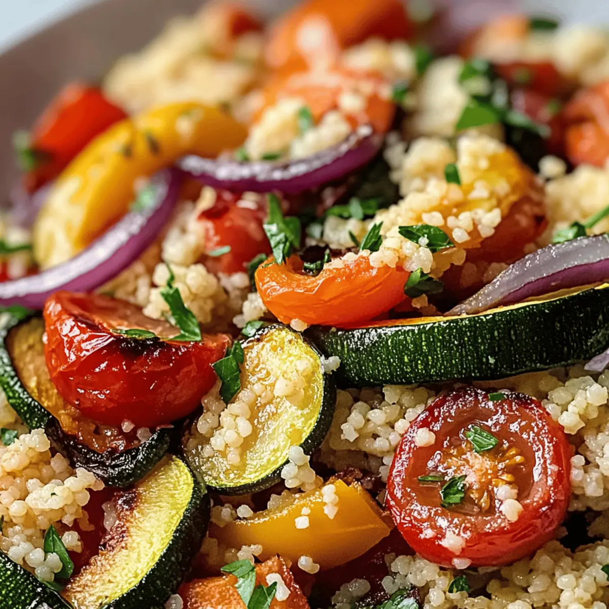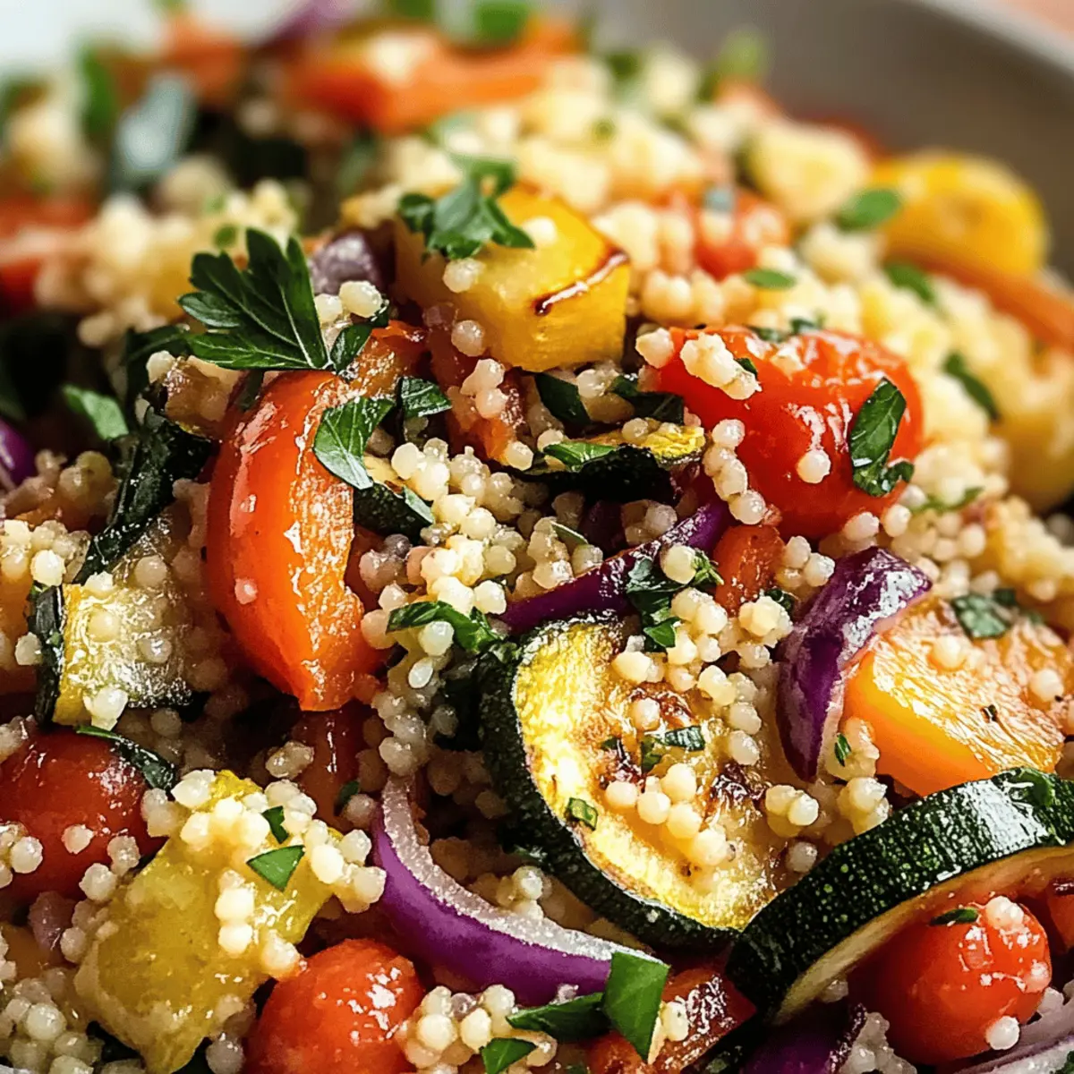 Der Duft von geröstetem Gemüse erfüllt die Küche und weckt den Appetit auf eine köstliche Mahlzeit. Heute möchte ich euch mit meinem Rezept für Rösti Gemüse Couscous verwöhnen, das nicht nur leicht zuzubereiten ist, sondern auch voller bunten Farben und Aromen steckt. Dieses Gericht ist perfekt für einen gemütlichen Abend mit Freunden oder als nährende Beilage zu einem festlichen Dinner. Es lässt sich ganz nach euren Vorlieben anpassen, sei es durch saisonale Gemüsesorten oder glutenfreie Alternativen. Ich liebe es, dass man mit diesem Rezept immer wieder neue Geschmackserlebnisse kreieren kann! Neugierig, wie einfach die Zubereitung ist und welche Variationen darauf warten, entdeckt zu werden? Lasst uns gleich loslegen! Warum wirst du dieses Rezept lieben? Einfachheit: Die Zubereitung ist schnell und unkompliziert, perfekt für Kochanfänger oder vielbeschäftigte Genießer. Vielseitigkeit: Du kannst das Gemüse nach Saison und Geschmack anpassen und sogar glutenfreie Alternativen wie Quinoa verwenden. Bunte Aromen: Die Kombination aus geröstetem Gemüse und würzigem Couscous sorgt für ein Geschmackserlebnis, das in Erinnerung bleibt. Geselligkeit: Ideal als Beilage oder Hauptgericht, perfekt für entspannte Abende mit Freunden oder die Familie. Zeitersparnis: Während das Gemüse im Ofen röstet, bereitest du den Couscous ganz entspannt zu. Lass dich inspirieren und probiere auch Variationen wie Nüsse oder getrocknete Früchte für zusätzlichen Biss! Rösti Gemüse Couscous Zutaten Hinweis: Dieses Rezept für Rösti Gemüse Couscous ist äußerst anpassbar und eignet sich perfekt für eine gesunde und köstliche Mahlzeit. Für den Couscous: Couscous – Die Basis, die Struktur gibt; verwende für glutenfreie Optionen Quinoa oder Reis. Für das Gemüse: Zucchini – Bringt Feuchtigkeit und milden Geschmack; kann durch Auberginen oder Kürbis ersetzt werden. Paprika – Sorgt für Süße und Farbe; jede Farbe ist willkommen, gern auch Karotten oder Zuckerschoten. Rote Zwiebel – Gibt einen scharfen Geschmack, der beim Rösten milder wird; Schalotten sind eine gute Alternative. Kirschtomaten – Fügen Säure und Geschmack hinzu; ersetzbar durch normale Tomaten, in Stücke geschnitten. Knoblauch – Bringt Tiefe ins Gericht; bei Bedarf kann auch Knoblauchpulver verwendet werden. Für die Würze: Olivenöl – Verbessert das Rösten und fügt Reichhaltigkeit hinzu; kann bei Bedarf durch Pflanzenöl ersetzt werden. Salz & Pfeffer – Grundgewürze, die alle anderen Aromen verstärken; nach Geschmack anpassen. Für das Garnieren: Gehackte Petersilie – Frische Kräuter für Helligkeit; verwende auch Basilikum oder Koriander. Zitronensaft – Bringt Säure zur Balance des Gerichts; Limettensaft ist ebenfalls eine gute Alternative. Schritt-für-Schritt-Anleitung für Rösti Gemüse Couscous Step 1: Ofen vorheizen Heize den Ofen auf 220°C vor und lege ein Backblech mit Backpapier aus. Diese Schritte sind wichtig, damit das Gemüse gleichmäßig und schön geröstet wird. Während der Ofen aufheizt, hast du genügend Zeit, um die anderen Zutaten vorzubereiten. Step 2: Gemüse vorbereiten Schneide das Gemüse, einschließlich der Zucchini, Paprika, roten Zwiebel und Kirschtomaten, in gleichmäßige Stücke. Gib sie in eine große Schüssel, füge den gehackten Knoblauch und das Olivenöl hinzu, und würze alles großzügig mit Salz und Pfeffer. Diese Mischung sorgt für ein köstliches Aroma beim Rösten. Step 3: Gemüse rösten Verteile das vorbereitete Gemüse gleichmäßig auf dem Backblech und röste es für 20-25 Minuten im vorgeheizten Ofen. Achte darauf, dass die Gemüsestücke am Ende schön karamelisiert und goldbraun sind, was zu einem intensiven Geschmack führt. Rühre das Gemüse einmal während des Röstens um, damit es gleichmäßig gart. Step 4: Couscous vorbereiten Bring in einem Topf Gemüsebrühe zum Kochen und füge dann den Couscous hinzu. Rühre gut um und nimm den Topf vom Herd. Decke ihn mit einem Deckel ab und lasse den Couscous für etwa 5 Minuten quellen. So wird er schön fluffig und nimmt die Aromen gut auf. Step 5: Vermischen Sobald das Gemüse fertig geröstet ist, nimm es aus dem Ofen und lasse es kurz abkühlen. Fluffe den Couscous mit einer Gabel auf und mische das geröstete Gemüse vorsichtig unter. Füge die gehackte Petersilie und den Zitronensaft hinzu, um dem Rösti Gemüse Couscous eine frische Note zu verleihen. Step 6: Servieren Serviere den Rösti Gemüse Couscous warm oder bei Zimmertemperatur. Er ist köstlich als eigenständiges Gericht oder herzhaft als Beilage. Genieße das bunte und aromatische Ergebnis, das dir und deinen Gästen Freude bringen wird! Expertentipps für Rösti Gemüse Couscous Zeitmanagement: Beginne mit dem Rösten der Gemüse, während das Wasser für den Couscous kocht, um alles gleichzeitig fertig zu haben. Gemüsevariationen: Nutze saisonale Zutaten oder deine Lieblingsgemüse, um den Rösti Gemüse Couscous individuell anzupassen und neue Aromen zu entdecken. Fluffiger Couscous: Achte darauf, den Couscous nach dem Quellen mit einer Gabel aufzulockern, damit er schön leicht und luftig bleibt. Aufbewahrung: Bewahre Reste in einem luftdichten Behälter im Kühlschrank auf und genieße sie innerhalb von drei Tagen; zum Aufwärmen eignet sich die Mikrowelle hervorragend. Kombinierbar: Dieser Couscous macht sich hervorragend als Beilage zu gegrilltem Fleisch oder Fisch, kann aber auch alleine serviert werden, um seinen vollen Geschmack zu entfalten. Was passt gut zu Rösti Gemüse Couscous? Der Rösti Gemüse Couscous ist ein wahres Fest für die Sinne. Kombiniere ihn mit köstlichen Beilagen und Getränken, um eine unvergessliche Mahlzeit zu kreieren. Frische Blattsalate: Ein einfacher gemischter Salat mit Vinaigrette sorgt für eine knackige Textur und frische Aromen. Gegrilltes Hähnchen: Saftiges, gewürztes Hähnchen harmoniert hervorragend mit den kräftigen Gemüse- und Couscous-Aromen und sorgt für