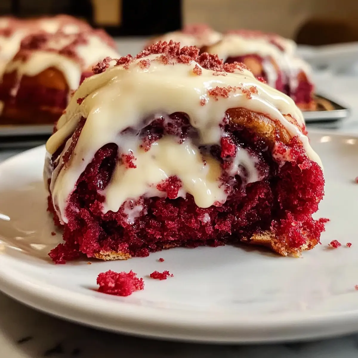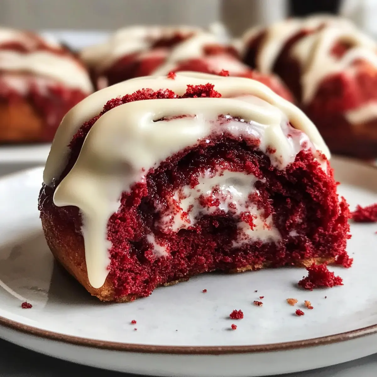 Wenn der Duft von frisch gebackenen Rote Samt Zimtschnecken durch die Küche zieht, kann ich meine Vorfreude kaum zügeln! Diese himmlisch weichen und feuchten Zimtschnecken bestehen aus einem reichhaltigen Kakaoteig, der in einer perfekt gewürzten Zimtfüllung gehüllt ist. Mit einem üppigen Cream Cheese Icing obendrauf sind diese Rollen nicht nur ein wahrer Leckerbissen zum Frühstück, sondern auch das perfekte Dessert, um Familie und Freunde zu begeistern. Zudem sind sie schnell zubereitet und machen sich wunderbar mit verschiedenen Füllungen und Glasuren, sodass du deiner Kreativität freien Lauf lassen kannst. Bist du bereit, diesen süßen Traum zu verwirklichen und jeden am Tisch zu verzaubern? Warum wirst du diese Zimtschnecken lieben? Einzigartiger Genuss: Diese Roten Samt Zimtschnecken kombinieren den klassischen Zimtschnecken-Geschmack mit dem eleganten Flair von rotem Samt – ein perfektes Highlight zu jedem Brunch! Einfache Zubereitung: Dank klarer Schritte gelingt dir dieses Rezept leicht, auch wenn du wenig Backerfahrung hast. Vielseitigkeit: Experimentiere mit verschiedenen Füllungen oder verwandle die Glasur in eine spannende Schokoladenvariante – deiner Kreativität sind keine Grenzen gesetzt! Perfekte Textur: Die weichen, fluffigen Schnecken mit einem saftigen Kern und dem cremigen Topping sind ein wahrer Gaumenschmaus, der jeden umhauen wird. Schnell servierbereit: Die Zubereitungsdauer ist kürzer als bei herkömmlichen Rezepten, sodass du in kürzester Zeit köstliche Backwaren genießen kannst. Familienfreundlich: Diese Zimtschnecken sind ideal, um Familie und Freunde zu beeindrucken – jeder wird nach mehr verlangen! Zutaten für Rote Samt Zimtschnecken • Für das perfekte Ergebnis, verwende frische Zutaten! Für den Teig Milch – aktiviert die Hefe; warm auf etwa 43°C bringen; nicht aufkochen. Aktive Trockenhefe – sorgt dafür, dass der Teig aufgeht; Frische für beste Ergebnisse überprüfen. Große Eier – Zimmertemperatur sorgt für eine glattere Teigkonsistenz. Rote Gel-Farbe – sorgt für die lebendige Farbe, ohne den Geschmack zu beeinflussen. Weizenmehl – gibt Struktur; genau abmessen (Löffel/ebnen oder wiegen). Ungesüßtes Kakaopulver – verleiht dem Teig Geschmack und Fülle. Salz – balanciert die Süße und verstärkt das Geschmacksprofil. Weißer Zucker – süßt den Teig und verbessert die Textur. Ungesalzene Butter – sorgt für einen zarten Teig; bei Zimmertemperatur verwenden. Für die Zimtfüllung Brauner Zucker – für die Zimtfüllung; fest zusammendrücken für karamellisierten Geschmack. Gemahlener Zimt – verleiht der Füllung Wärme; nach Geschmack anpassen. Schlagsahne – sorgt dafür, dass die Zentren feucht bleiben, wenn sie vor dem Backen um die Rollen gegossen wird. Für das Frosting Frischkäse – Basis für die Glasur; muss weich sein für einfaches Vermengen. Puderzucker – gesiebt für eine glatte Glasurtextur. Echter Vanilleextrakt – verstärkt den Aromaduft des Frostings. Milch (für die Glasur) – Konsistenz anpassen, um klumpige Glasur zu vermeiden. Mit diesen Zutaten bereitest du die köstlichsten Roten Samt Zimtschnecken zu und zauberst ein Genuss-Erlebnis, das jeden begeistert! Schritt-für-Schritt-Anleitungen für Rote Samt Zimtschnecken Step 1: Milch erwärmen Erhitze die Milch in einem kleinen Topf auf etwa 43°C (110°F), bis sie warm, aber nicht kochend ist. Nimm den Topf vom Herd und rühre die aktive Trockenhefe ein. Lass die Mischung etwa 10 Minuten stehen, bis sie schaumig wird und die Hefe aktiviert ist. Step 2: Teig vorbereiten In einer großen Schüssel vermische das Weizenmehl, ungesüßtes Kakaopulver, weißen Zucker und Salz. Füge die in kleine Stücke geschnittene, ungesalzene Butter hinzu und mische alles mit einer Gabel oder den Fingern, bis die Mischung krümelig ist wie Erbsen. Step 3: Zutaten kombinieren Gib die Hefe-Milch-Mischung, die Zimmertemperatur-Eier und die rote Gel-Farbe in die Schüssel mit den trockenen Zutaten. Verwende einen Standmixer oder eine Küchenmaschine, um alles gut zu vermischen und den Teig zu kneten, bis er glatt und elastisch ist, was etwa 5-7 Minuten dauert. Step 4: Teig gehen lassen Forme den Teig zu einer Kugel und lege ihn in eine leicht gefettete Schüssel. Decke die Schüssel mit einem sauberen Küchentuch ab und lasse den Teig an einem warmen Ort etwa 1 Stunde gehen, bis er sich in der Größe verdoppelt hat und schön aufgegangen ist. Step 5: Füllung vorbereiten In einer separaten Schüssel vermische die weichgeglichene Butter, den braunen Zucker und den gemahlenen Zimt, bis eine homogene Paste entsteht. Stelle sicher, dass die Füllung gut vermischt ist, damit sie beim Auftragen auf den Teig gleichmäßig verteilt werden kann. Step 6: Teig ausrollen Wenn der Teig aufgegangen ist, bestäube eine Arbeitsfläche mit etwas Mehl und rolle den Teig vorsichtig auf eine Dicke von etwa 0,6 cm (¼-Zoll) aus. Achte darauf, die Ecken gleichmäßig zu formen, damit der Teig gleichmäßig gefüllt und gerollt werden kann. Step 7: Füllung auftragen und rollen Verteile die Zimtfüllung gleichmäßig auf den ausgerollten Teig, bis die Ränder bedeckt sind. Rolle den Teig von einer langen Seite her fest auf, so dass ein enges Rohr entsteht. Achte darauf, dass die Füllung nicht herausquillt, während du rollst. Step 8: Schneiden und gehen lassen Schneide den gerollten Teig mit ungesüßtem Zahnseide in 12 gleich große Stücke. Lege die Röllchen in eine gefettete Backform und lasse sie 20 Minuten ruhen, damit sie erneut aufgehen und etwas an Größe zulegen können. Step 9: Backen Gieße die Schlagsahne vorsichtig um die Zimtschnecken in der Backform, um die innenliegenden Röllchen feucht zu halten. Backe die Zimtrollen im vorgeheizten Ofen bei 190°C (375°F) für 25-27 Minuten, bis sie goldbraun sind und eine Innentemperatur von etwa 71°C (160°F) erreicht haben. Step 10: Frosting zubereiten Während die Rote Samt Zimtschnecken backen, bereite da