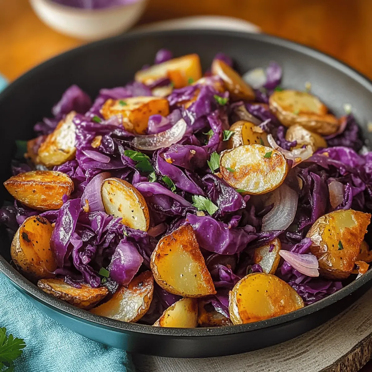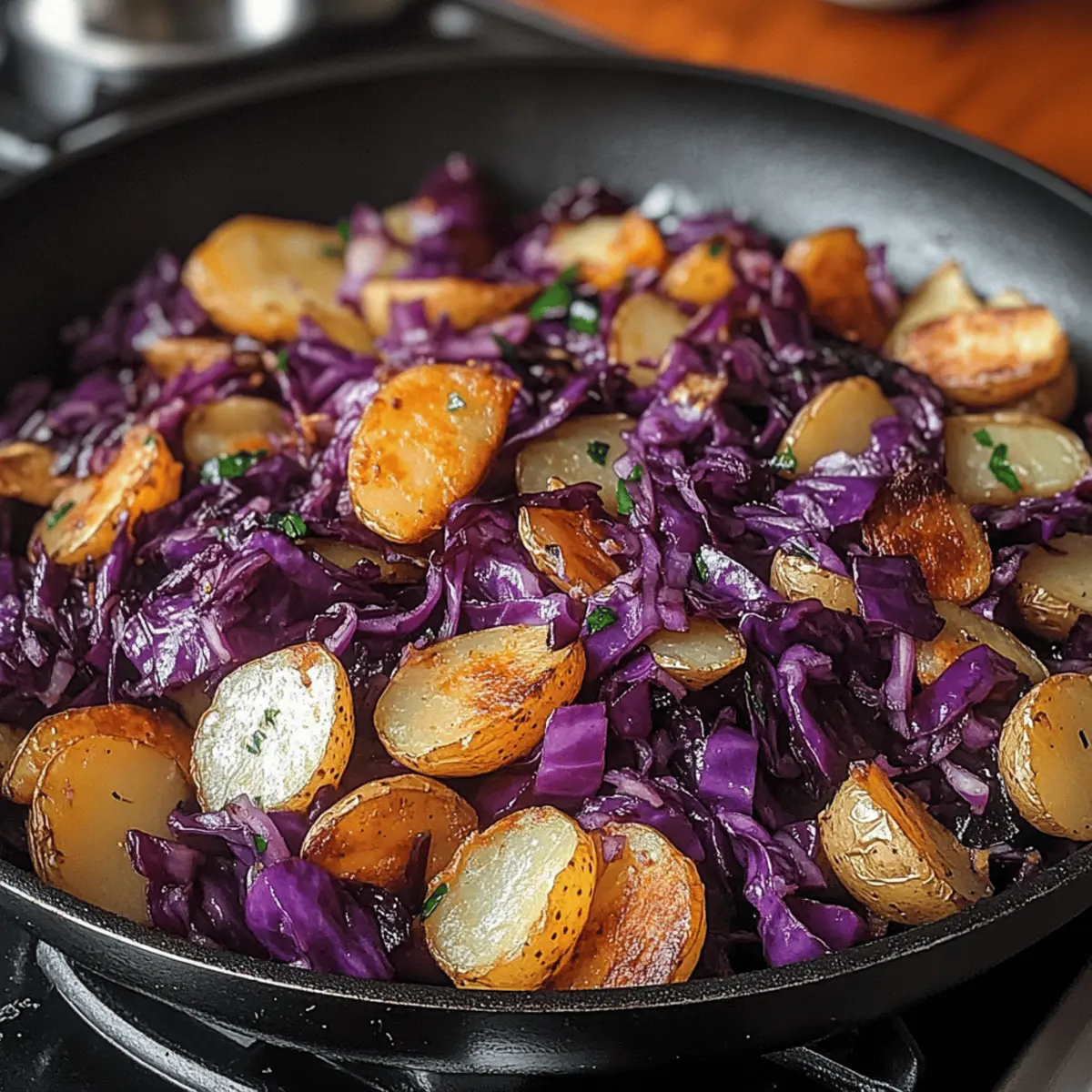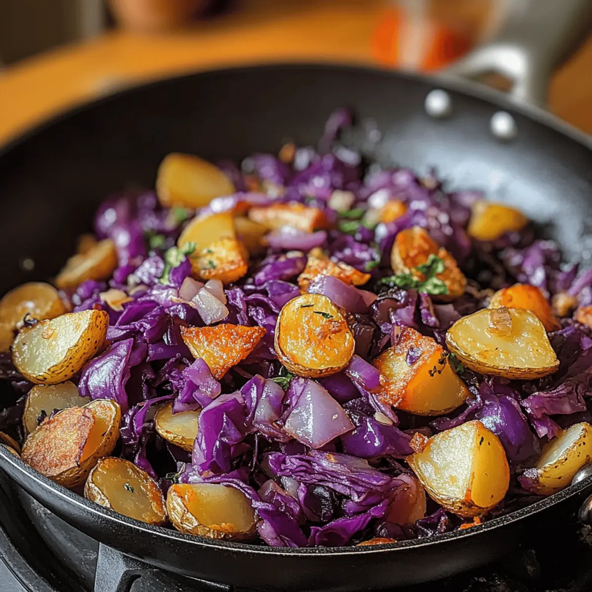 Es gibt Momente in der Küche, die einfach magisch sind – und das Zubereiten von Rotkohl Pfanne mit Kartoffeln gehört definitiv dazu. Während die satte, violette Farbe des Rotkohls und das Rattern der knusprigen Kartoffeln im Pfannen erhitzt werden, wird mir klar, dass dieses Rezept nicht nur leicht zuzubereiten ist, sondern auch vollgepackt mit Nährstoffen. Es kombiniert gesunde Zutaten mit einem köstlichen süß-sauren Profil, das durch einen Spritzer Apfelessig verstärkt wird. Ob als gemütliches Abendessen oder beim Meal Prep für die kommenden Tage – diese vegetarische Delikatesse eignet sich perfekt für jede Jahreszeit. Neugierig, wie Sie mit ein paar einfachen Variationen noch mehr aus diesem Gericht herausholen können? Warum ist Rotkohl Pfanne so besonders? Zusammenkommen von Aromen: Die Kombination aus zartem Rotkohl und knusprigen Kartoffeln schafft eine harmonische Geschmacksbalance, die einfach begeistert. Gesund und nahrhaft: Verfasst mit frischen Zutaten, ist dieses Gericht reich an Vitaminen und ideal für eine gesunde Ernährung. Schnell zubereitet: In nur wenigen Schritten zaubern Sie ein köstliches Abendessen, perfekt für hektische Tage. Vielseitig: Ob mit Speck oder rauchigem Tofu, Sie können die Proteine nach Belieben variieren. Perfekt für Meal Prep: Kochen Sie eine größere Menge und genießen Sie die Reste über die Woche verteilt – lecker und zeitsparend! Herzliche Erinnerungen: Ein echtes Komfortessen, das die Gemütlichkeit eines Zuhause-Essens widerspiegelt, und eine wunderbare Möglichkeit, die kühle Jahreszeit zu feiern. Rotkohl Pfanne Zutaten • Für das Gemüse Rotkohl – Bringt Süße und Farbe ins Gericht; kann auch durch grünen Kohl ersetzt werden. Kartoffeln – Sorgen für eine herzhafte Basis; nutze Wachs- oder festkochende Kartoffeln für besten Geschmack. Für den Geschmack Apfelessig – Verstärkt die süß-säuerliche Note; eine Ersetzung könnte Zitronensaft für eine andere Geschmacksrichtung sein. Kreuzkümmel – Fügt Wärme und Tiefe hinzu; verwende auch geräuchertes Paprikapulver für eine würzigere Variante. Olivenöl – Zum Sautieren verwendet, sorgt für knusprige Kartoffeln; alternativ kannst du auch Pflanzen- oder Rapsöl verwenden. Salz und Pfeffer – Unverzichtbar zum Abschmecken; je nach Geschmack anpassen. Optionales Speck oder rauchiger Tofu – Zusätzliche Proteinquelle; erfasst den herzhaften Geschmack des Gerichts. Blumenkohl oder Kürbis – Für eine leichtere Variante; erhöhen die Nährstoffvielfalt und bringen Abwechslung. Dieses Rezept für Rotkohl Pfanne mit Kartoffeln ist nicht nur nährstoffreich, sondern auch unglaublich vielseitig! Schritt-für-Schritt-Anleitung für Rotkohl Pfanne mit Kartoffeln Step 1: Gemüse vorbereiten Zuerst den Rotkohl in feine Streifen schneiden und die Kartoffeln schälen sowie in kleine Würfel schneiden. Achte darauf, dass die Kartoffelstücke gleichmäßig sind, damit sie gleichmäßig garen. Diese Vorbereitung sollte etwa 5–10 Minuten in Anspruch nehmen. Step 2: Kartoffeln anbraten In einer großen Pfanne das Olivenöl bei mittelhoher Hitze erhitzen. Füge die gewürfelten Kartoffeln hinzu und brate sie für etwa 10–15 Minuten an, bis sie goldbraun und knusprig sind. Rühre gelegentlich um, damit sie gleichmäßig bräunen. Step 3: Rotkohl hinzufügen Sobald die Kartoffeln schön knusprig sind, gib den geschnittenen Rotkohl in die Pfanne. Rühre alles gut um und koche es für weitere 5–7 Minuten, bis der Kohl weich ist und eine leuchtende Farbe annimmt. Step 4: Würzen Jetzt ist es Zeit zu würzen. Streue Kreuzkümmel, Salz und Pfeffer über das Gemüse. Gieße dann den Apfelessig hinzu und vermische alles gründlich. Lass die Mischung weitere 2–3 Minuten leicht köcheln, bis die Aromen gut verteilt sind. Step 5: Servieren Die Rotkohl Pfanne mit Kartoffeln kann sofort serviert werden, warm oder bei Zimmertemperatur. Alternativ kannst du sie für die Meal Prep nutzen und in einem luftdichten Behälter im Kühlschrank aufbewahren. Sie bleibt bis zu drei Tage frisch. Rotkohl Pfanne mit Kartoffeln: Variationen Lassen Sie Ihrer Kreativität freien Lauf und passen Sie dieses köstliche Gericht nach Ihrem Geschmack an! Würzig: Fügen Sie Chili-Flocken oder gewürfelte Paprika hinzu für eine pikante Note. Diese Variationen verleihen dem Gericht sofort mehr Charakter. Kräuter-Boost: Integrieren Sie frische Kräuter wie Thymian oder Rosmarin, um einen aromatischen Akzent zu setzen. Ein Hauch frischer Kräuter bringt ein ganz neues Geschmacksniveau. Nussige Textur: Streuen Sie geröstete Nüsse oder Kerne über das fertige Gericht, um zusätzlichen Crunch und nährstoffreiche Fette zu erhalten. Dies hebt die Textur und das Aroma auf eine neue Ebene. Proteinreich: Experimentieren Sie mit Speck oder rauchigem Tofu als Proteinquelle. Beide Optionen fügen ein herzhaftes Element hinzu, das perfekt harmoniert. Leichte Variante: Ersetzen Sie einen Teil des Rotkohls durch Blumenkohl oder Kürbis für eine leichtere und saisonale Abwandlung. Das bringt Abwechslung in den Geschmack und die Nährstoffe. Fruchtiges Element: Fügen Sie Apfelstücke oder getrocknete Cranberries hinzu, um eine süße, fruchtige Komponente zu integrieren, die wunderbar mit der Säure des Apfelessigs harmoniert. Tropische Note: Experimentieren Sie mit einer Prise Kokosmilch, um einen Hauch tropischen Geschmacks hinzuzufügen. Dies schafft eine interessante und unerwartete Wendung. Für noch mehr Inspiration in der Küche könnten Sie auch einmal mein Rezept für Ofenfisch mit Kartoffeln ausprobieren oder die köstlichen Cremigen Gnocchi mit Spinat und Parmesan zaubern. Expert Tips für Rotkohl Pfanne Gleichmäßige Stücke: Stelle sicher, dass die Kartoffeln gleichmäßig geschnitten sind, um ein gleichmäßiges Garen zu gewährleisten. Dies verhindert sowohl zu weiche als auch zu harte Stücke. Überfüllung vermeiden: Überlade die Pfanne nicht mit Zutaten, um eine perfekte Knusprigkeit der