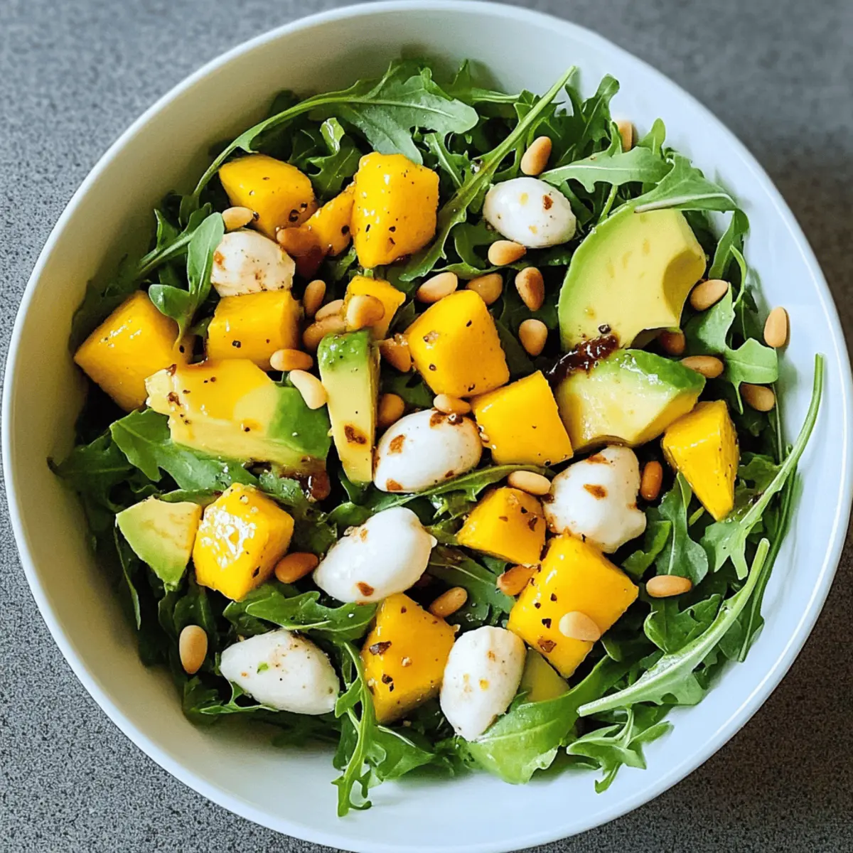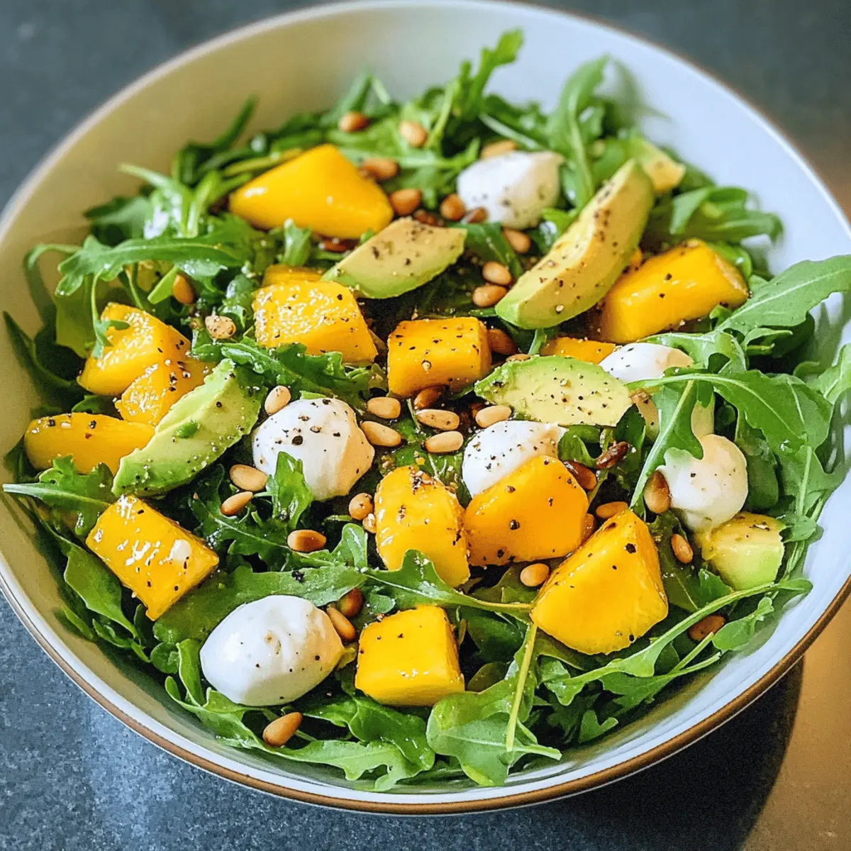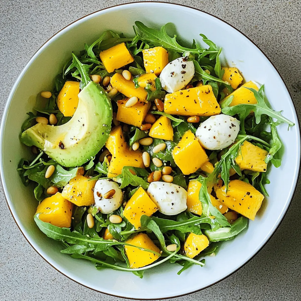 Die warmen Sonnenstrahlen kitzeln auf der Haut und der Duft von frischem Obst schwebt in der Luft – so fühlte ich mich, als ich zum ersten Mal diesen köstlichen Rucola Mango Salat mit Pinienkernen zubereitete. Diese lebendige Kombination aus dem pfeffrigen Rucola und der süßen Reifemango ist ein Fest für die Sinne und lässt den Sommer auf dem Teller tanzen. In nur 15 Minuten entfaltet sich dieses belebende Gericht, das nicht nur eine schnelle Mahlzeit für hektische Tage ist, sondern auch als perfekter Begleiter für Grillpartys dient. Und das Beste daran? Du kannst nach Belieben variieren und mit deinen Lieblingszutaten experimentieren! Welche kreativen Variationen wirst du ausprobieren? Warum wirst du diesen Salat lieben? Erfrischend und leicht: Der Rucola Mango Salat mit Pinienkernen ist die perfekte Sommererfrischung – knackige Aromen, die den Gaumen kitzeln. Schnelle Zubereitung: In nur 15 Minuten kannst du dieses leckere Gericht zaubern, ideal für stressige Tage oder spontane Einladungen. Vielseitig anpassbar: Du kannst Zutaten nach deinem Geschmack austauschen und variieren. Nährstoffreich: Reich an Vitaminen und gesunden Fetten aus Avocado, ist dieser Salat eine tolle Wahl für eine ausgewogene Ernährung. Perfekte Ergänzung: Egal, ob als leichtes Hauptgericht oder Beilage zu Grillgerichten, er passt einfach immer!✨ Rucola Mango Salat mit Pinienkernen Zutaten Für den Salat Rucola – Der pfeffrige Geschmack bringt Frische in jede Biss. Alternativ kannst du auch Babyspinat oder Feldsalat verwenden. Reife Mango – Sorgt für Süße und ein tropisches Aroma. Falls keine Mango verfügbar ist, sind reife Pfirsiche oder Nektarinen eine tolle Alternative. Avocado – Verleiht eine cremige Textur und gesunde Fette. Achte darauf, eine reife Avocado zu wählen für das beste Geschmackserlebnis. Mini-Mozzarella-Kugeln – Fügen eine cremige Komponente hinzu. Für eine vegane Variante kannst du sie weglassen oder durch geräucherten Tofu ersetzen. Pinienkerne – Geben einen nussigen Geschmack und einen schönen Crunch. Sie können auch durch Walnüsse oder geröstete Kürbiskerne ersetzt werden; röste sie vorher für ein intensiveres Aroma. Für das Dressing Orange (Saft) – Ein unverzichtbarer Bestandteil für die Frische des Dressings. Verwende frischen Saft für das beste Ergebnis. Olivenöl – Gibt dem Dressing Fülle und hilft, alles gut zu vermischen. Balsamico Bianco – Bringt eine angenehme Säure. Alternativ kannst du auch normalen Balsamico verwenden. Ahornsirup oder Honig – Für die süßliche Note im Dressing, je nach Vorliebe anpassen. Salz und Pfeffer – Würzt den Salat und hebt die Aromen hervor. Genieße diese charmante Mischung mit deinem Rucola Mango Salat mit Pinienkernen und erlebe, wie einfach es ist, leckere und gesunde Mahlzeiten zuzubereiten! Schritt-für-Schritt-Anleitung für Rucola Mango Salat mit Pinienkernen Step 1: Rucola vorbereiten Wasche den Rucola gründlich unter fließendem Wasser und lass ihn in einem Sieb abtropfen. Es ist wichtig, dass der Salat vollständig trocken ist, um die Frische zu bewahren. Du kannst dafür einen Salatschleuder verwenden, um das Wasser effektiv zu entfernen. Step 2: Mango schneiden Schäle die reife Mango und schneide sie in kleine Stücke. Die Mango sollte weich und süß sein, um den perfekten Geschmack in deinem Rucola Mango Salat mit Pinienkernen zu gewährleisten. Achte darauf, das Fruchtfleisch gleichmäßig zu schneiden, sodass es schön verteilt im Salat liegt. Step 3: Avocado vorbereiten Halbiere die reife Avocado, entferne den Kern und schöpfe das Fruchtfleisch mit einem Löffel heraus. Würfle die Avocado in kleine Stücke und sei vorsichtig, damit sie nicht zerdrückt wird. Die cremige Textur der Avocado ergänzt ideal die anderen Zutaten im Salat. Step 4: Mozzarella abtropfen Lass die Mini-Mozzarella-Kugeln in einem Sieb abtropfen, während du den Salat fertigstellst. Dadurch entfernst du überschüssige Flüssigkeit und sorgst dafür, dass sie die Aromen des Rucola Mango Salats mit Pinienkernen besser aufnehmen können. Step 5: Pinienkerne rösten Erhitze eine trockene Pfanne bei mittlerer Hitze und gib die Pinienkerne hinein. Röste sie unter ständigem Rühren, bis sie goldbraun und aromatisch sind (ca. 3–5 Minuten). Achte darauf, dass sie nicht anbrennen, da sie schnell verlesen. Diese knackigen Nüsse verleihen dem Salat einen wunderbaren Geschmack. Step 6: Dressing anrühren Presse den Saft einer halben Orange in eine Schüssel und vermische ihn mit Olivenöl, Balsamico Bianco, Ahornsirup, Salz und Pfeffer. Verwende einen Schneebesen, um das Dressing gut zu emulgieren. Das Dressing sollte frisch und fruchtig schmecken, um den Rucola Mango Salat mit Pinienkernen zu umrunden. Step 7: Salat kombinieren In einer großen Salatschüssel gibst du den abgetropften Rucola, die Mango, die Avocado, die Mozzarella-Kugeln und die gerösteten Pinienkerne hinzu. Mische die Zutaten vorsichtig, damit die Avocado nicht zerdrückt wird. Diese Kombination sorgt für eine aufregende Mischung aus Texturen und Geschmäckern. Step 8: Anrichten und servieren Vor dem Servieren träufelst du das Dressing über den Salat und vermengst alles sanft, um die Aromen gut zu verteilen. Serviere den Salat sofort, um die Frische der Zutaten zu bewahren. Der Rucola Mango Salat mit Pinienkernen ist das perfekte Gericht für heiße Sommertage! Lagerungstipps für Rucola Mango Salat mit Pinienkernen Zimmertemperatur: Der fertig zubereitete Salat sollte nicht länger als 2 Stunden bei Zimmertemperatur stehen, um die Frische zu bewahren. Kühlschrank: Salatzutaten können separat im Kühlschrank bis zu 1 Tag gelagert werden. Das Dressing sollte in einem luftdichten Behälter bis zu 3 Tage haltbar sein, um die Aromen zu erhalten. Einzelne Zutaten lagern: Halte Rucola, Mango, Avocado und Pinienkerne vor der Zubereitung getrennt, um die Frische zu maximieren und ein matschiges Ergebnis zu vermeiden. Wiederv Erwärmen: Wenn du
